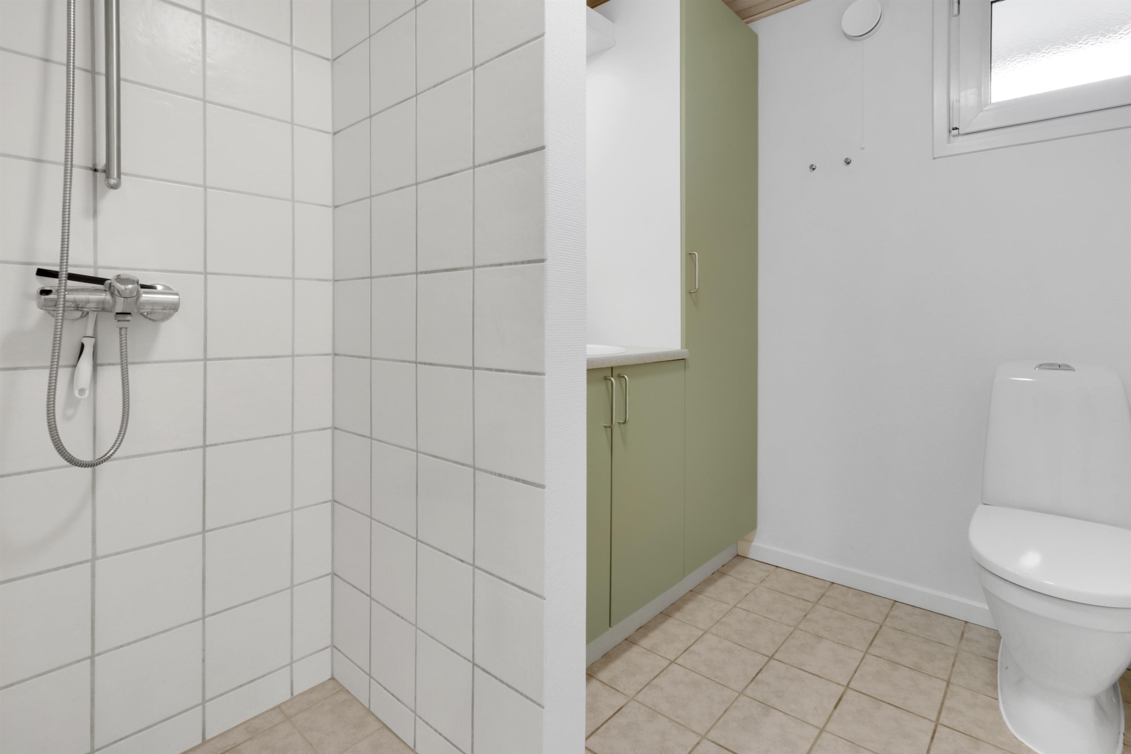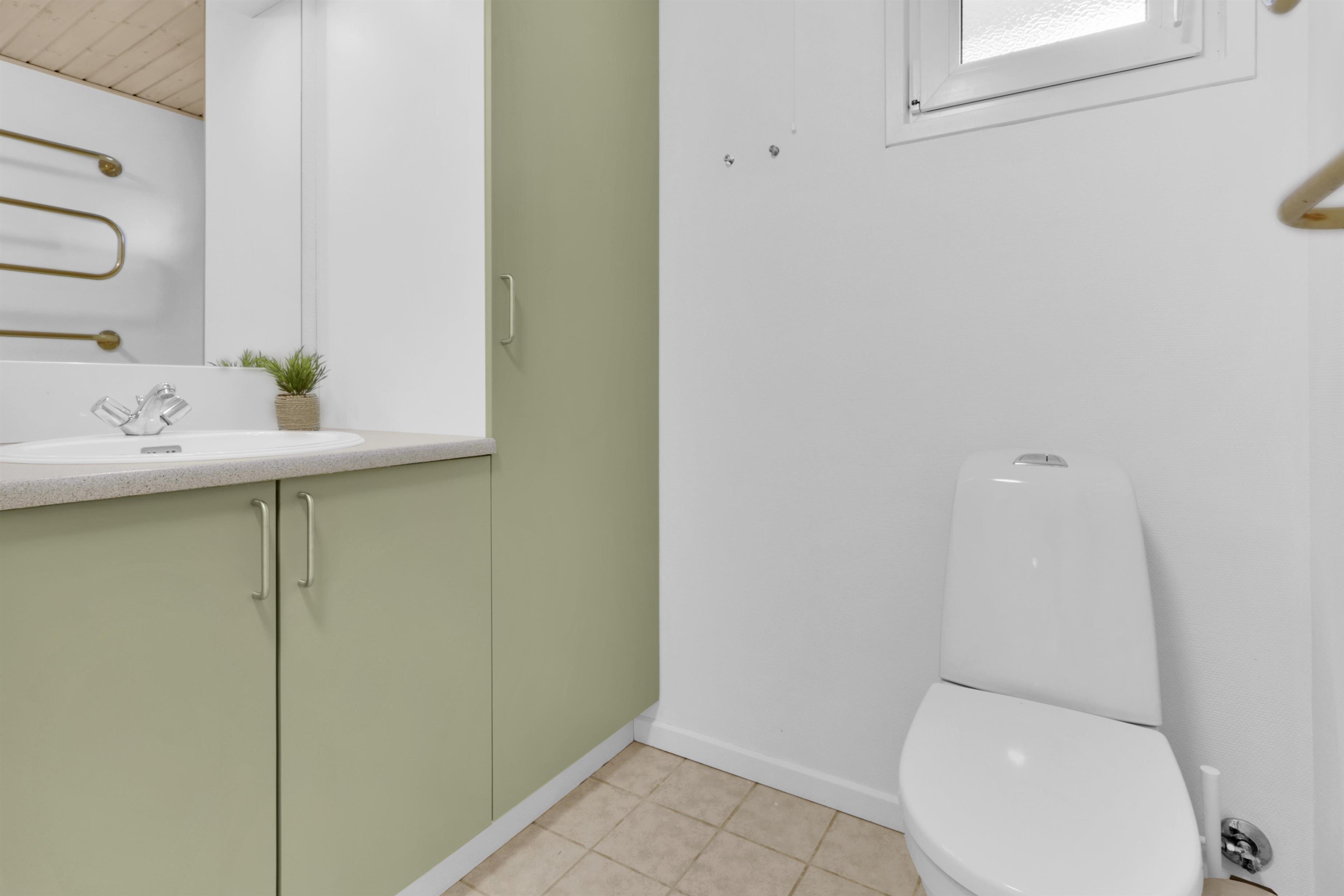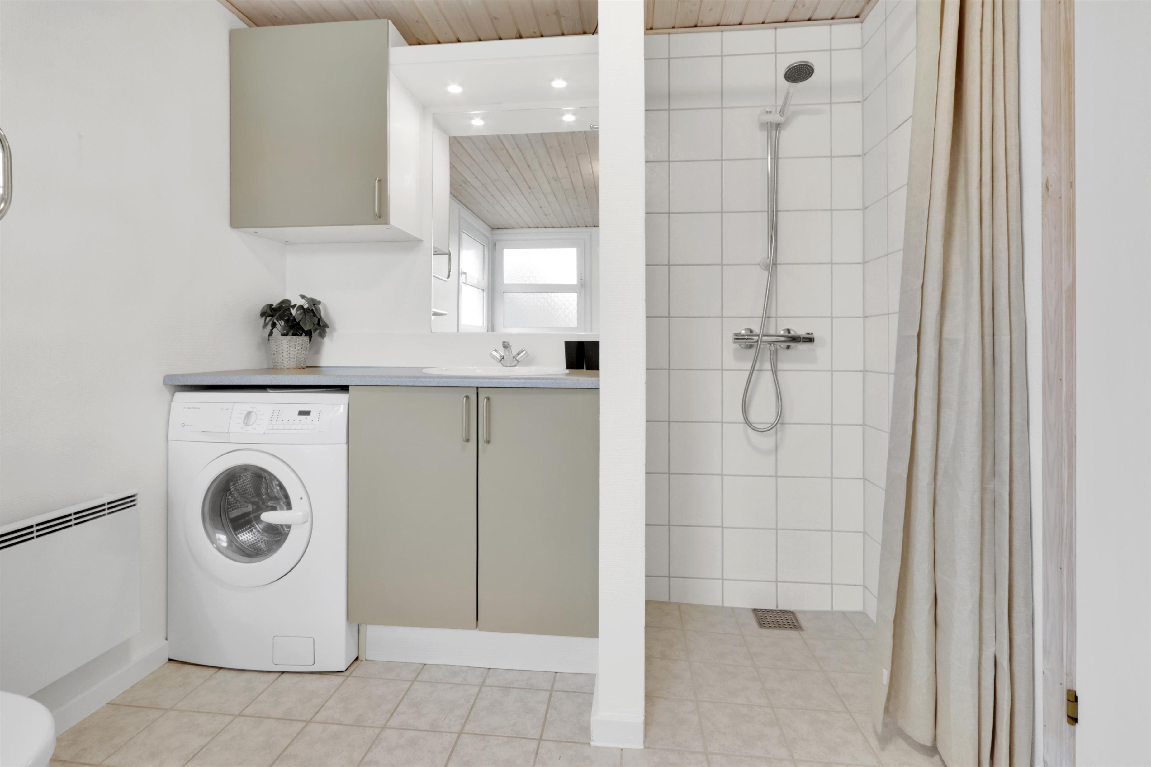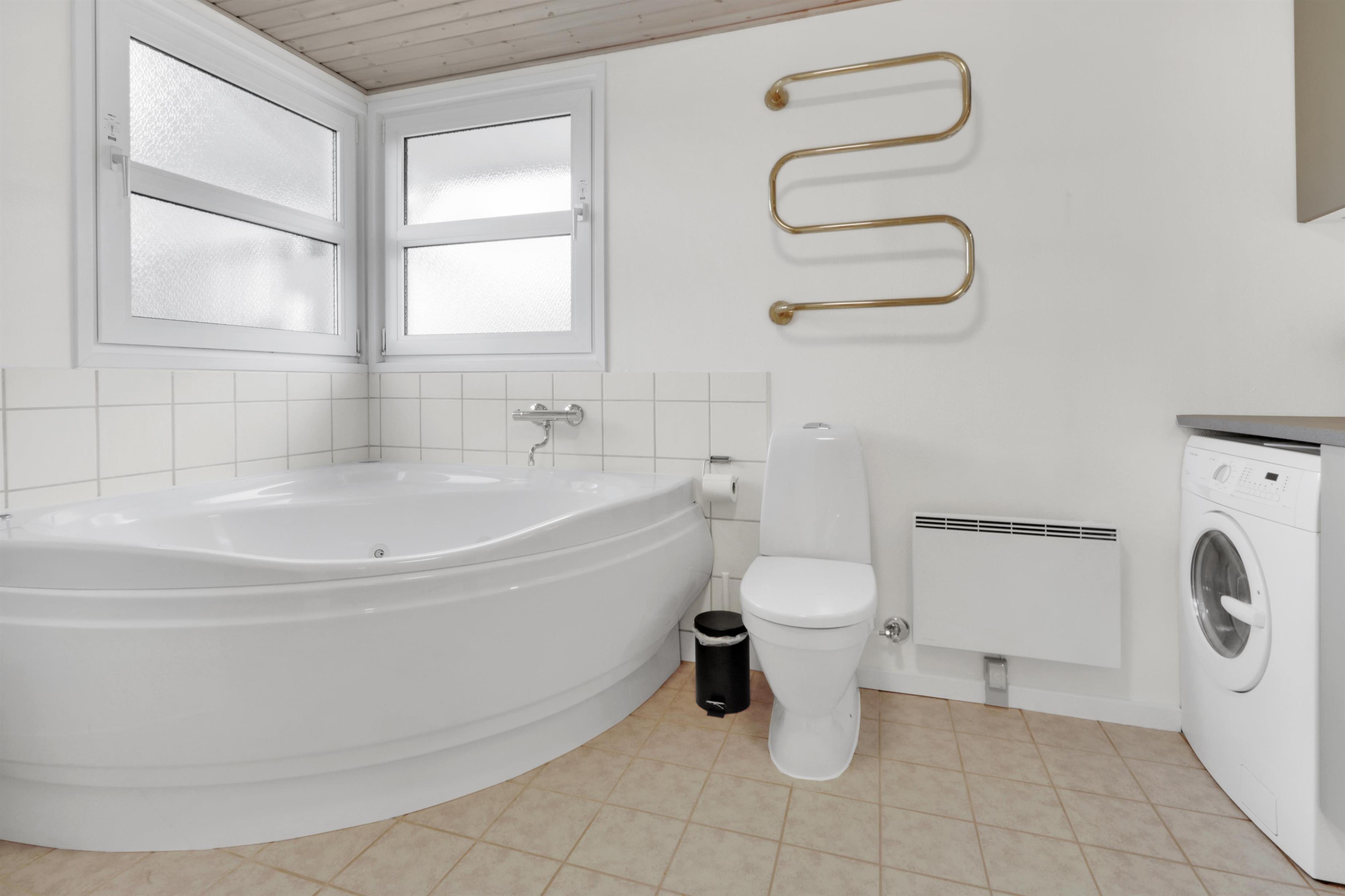 Huset har to moderne badeværelser, begge med toilet, håndvask, bruser og gulvvarme. Det store badeværelse byder desuden på et afslappende spabad, sauna samt en praktisk kombineret vaskemaskine/tørretumbler. Overalt i huset er der rengøringsvenlige gulve.