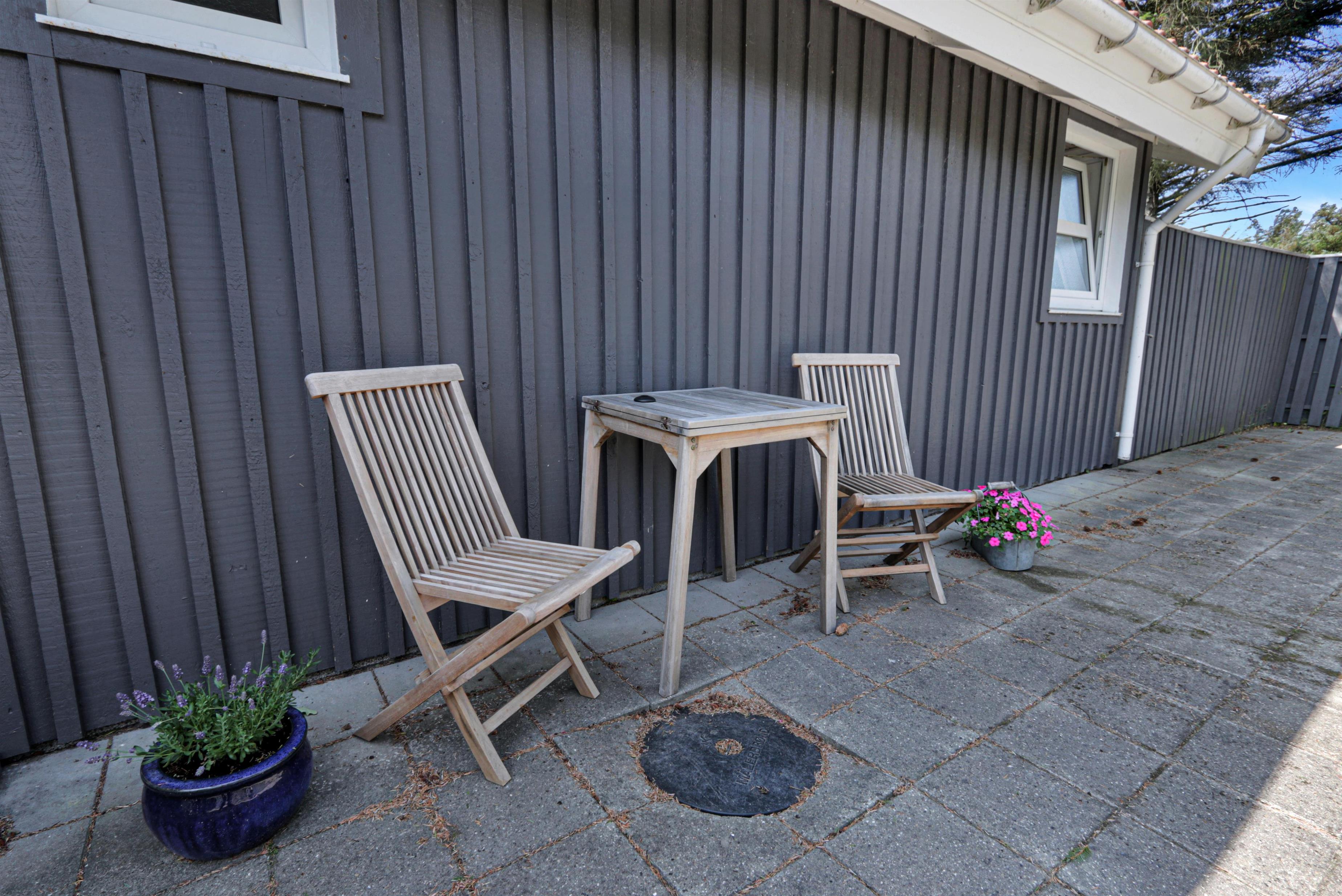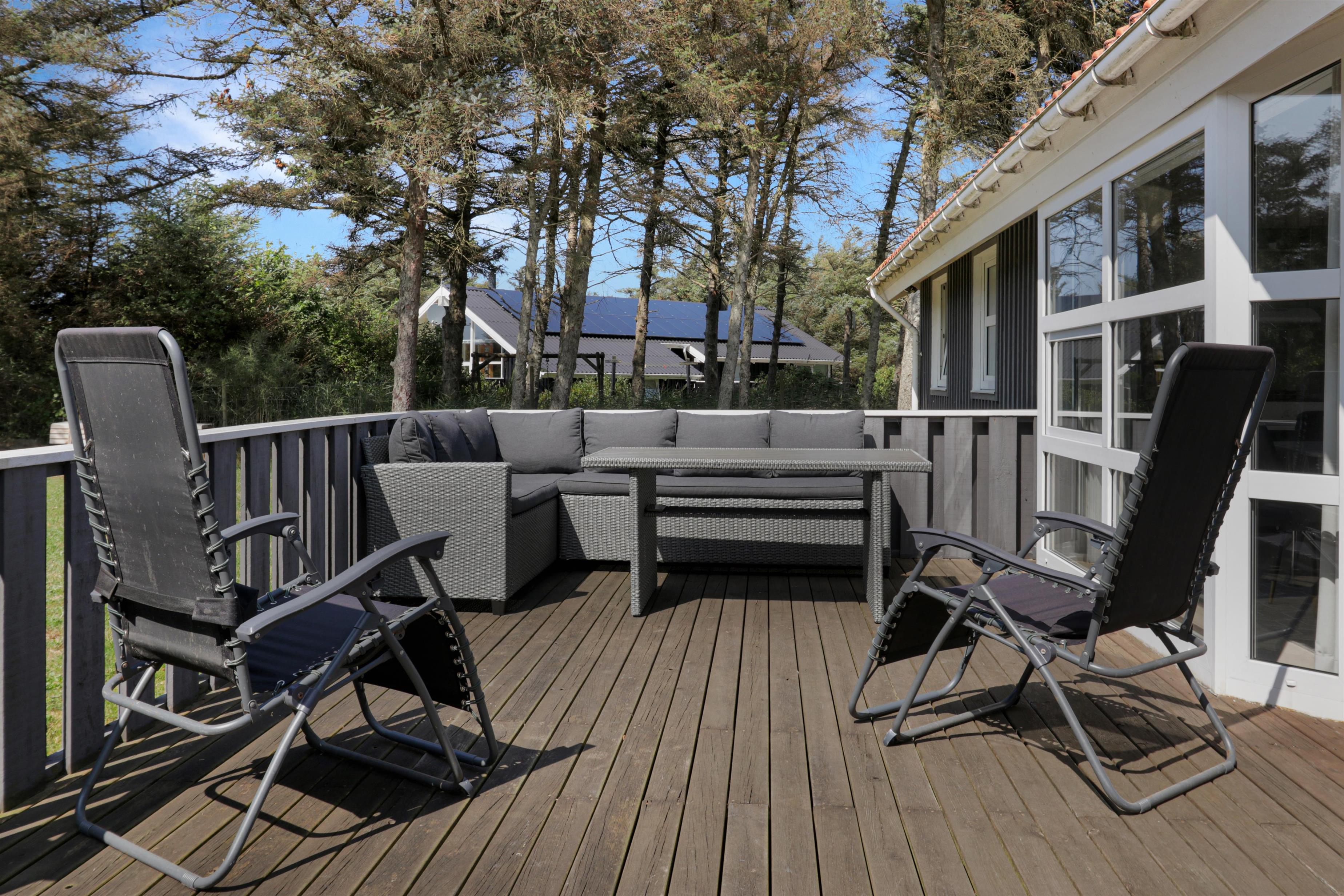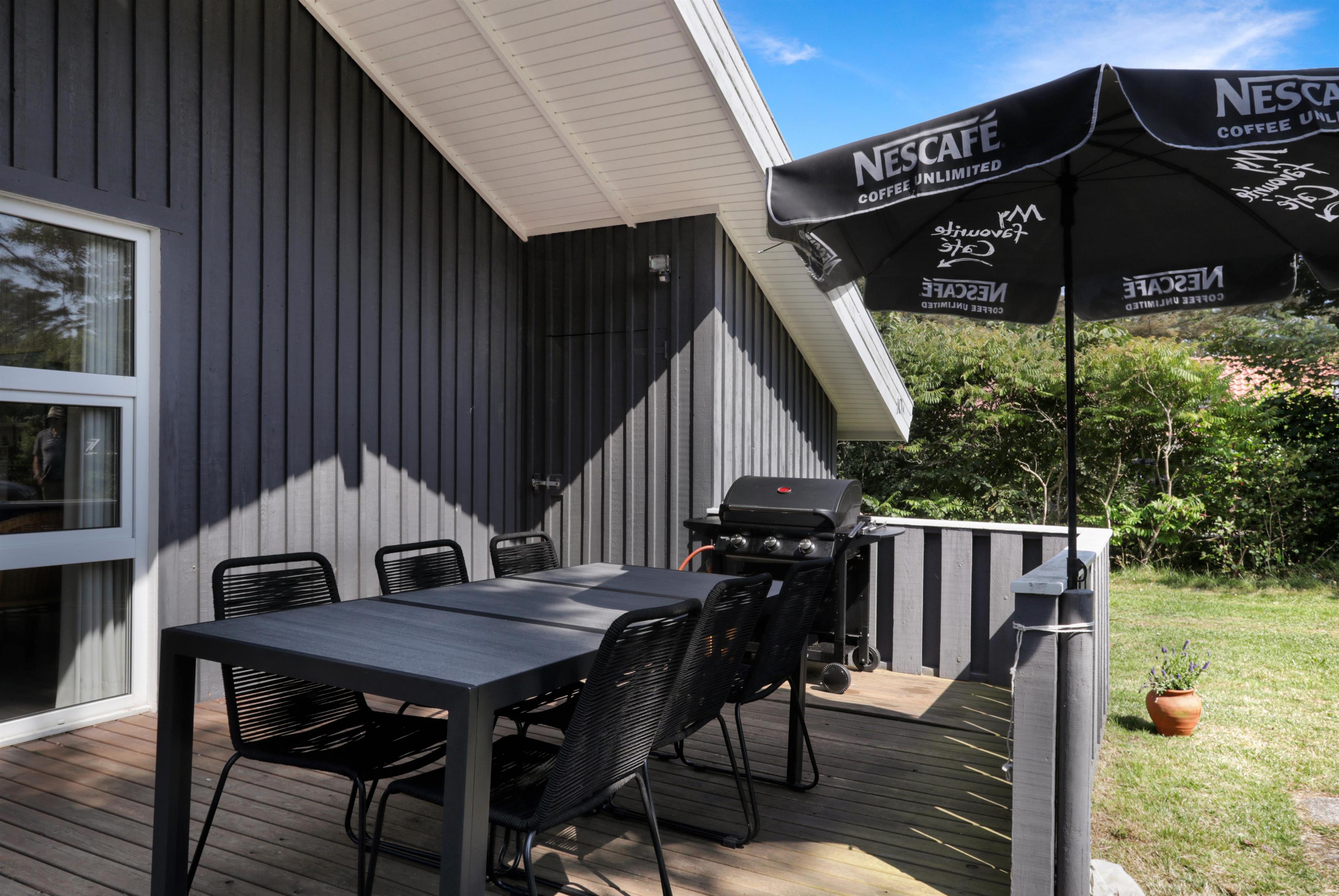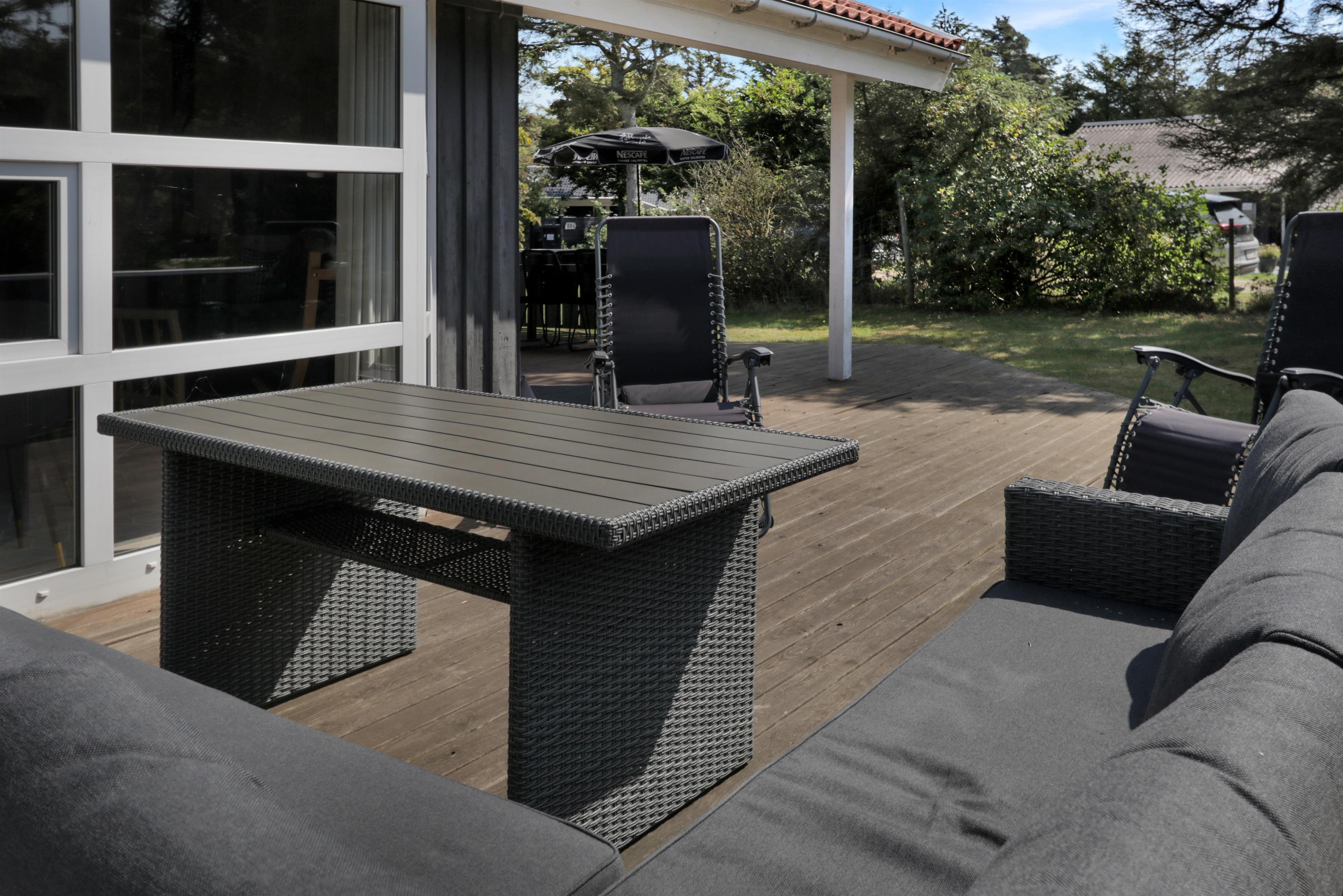 Den dejlige terrasse, både åben og overdækket, giver mulighed for at nyde solen hele dagen. Med havemøbler og gasgrill er det oplagt at spise ude og nyde den friske havluft.