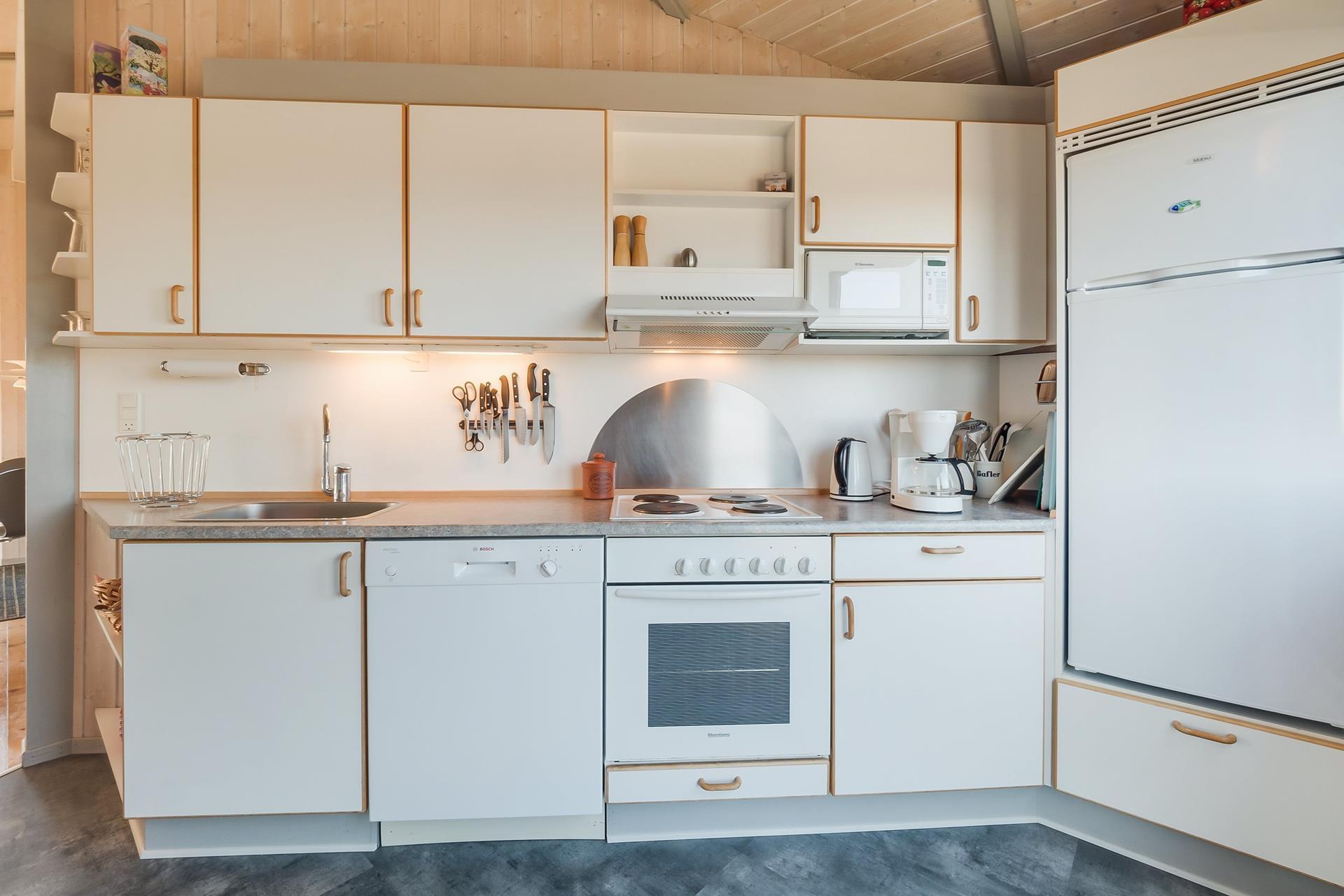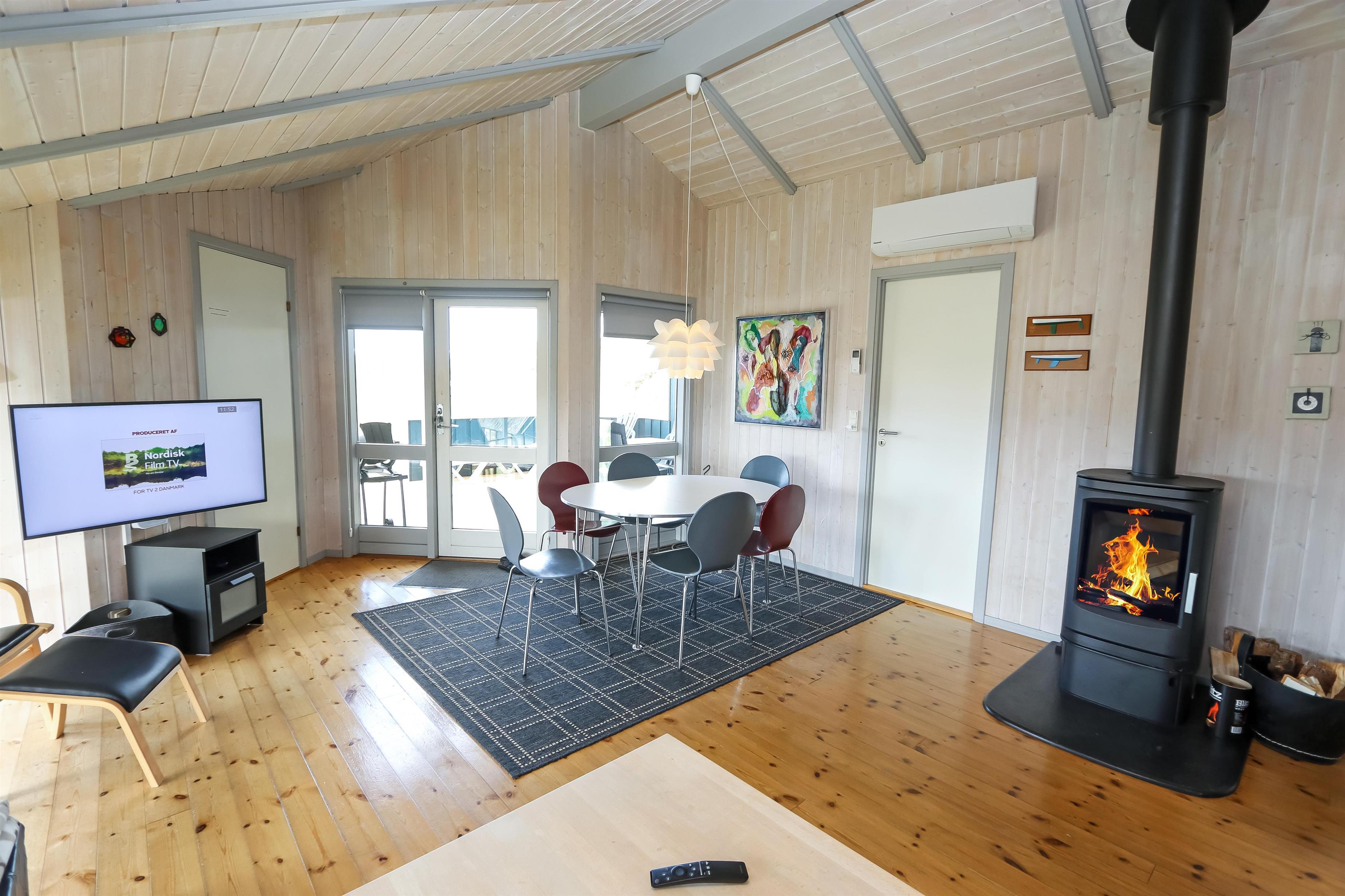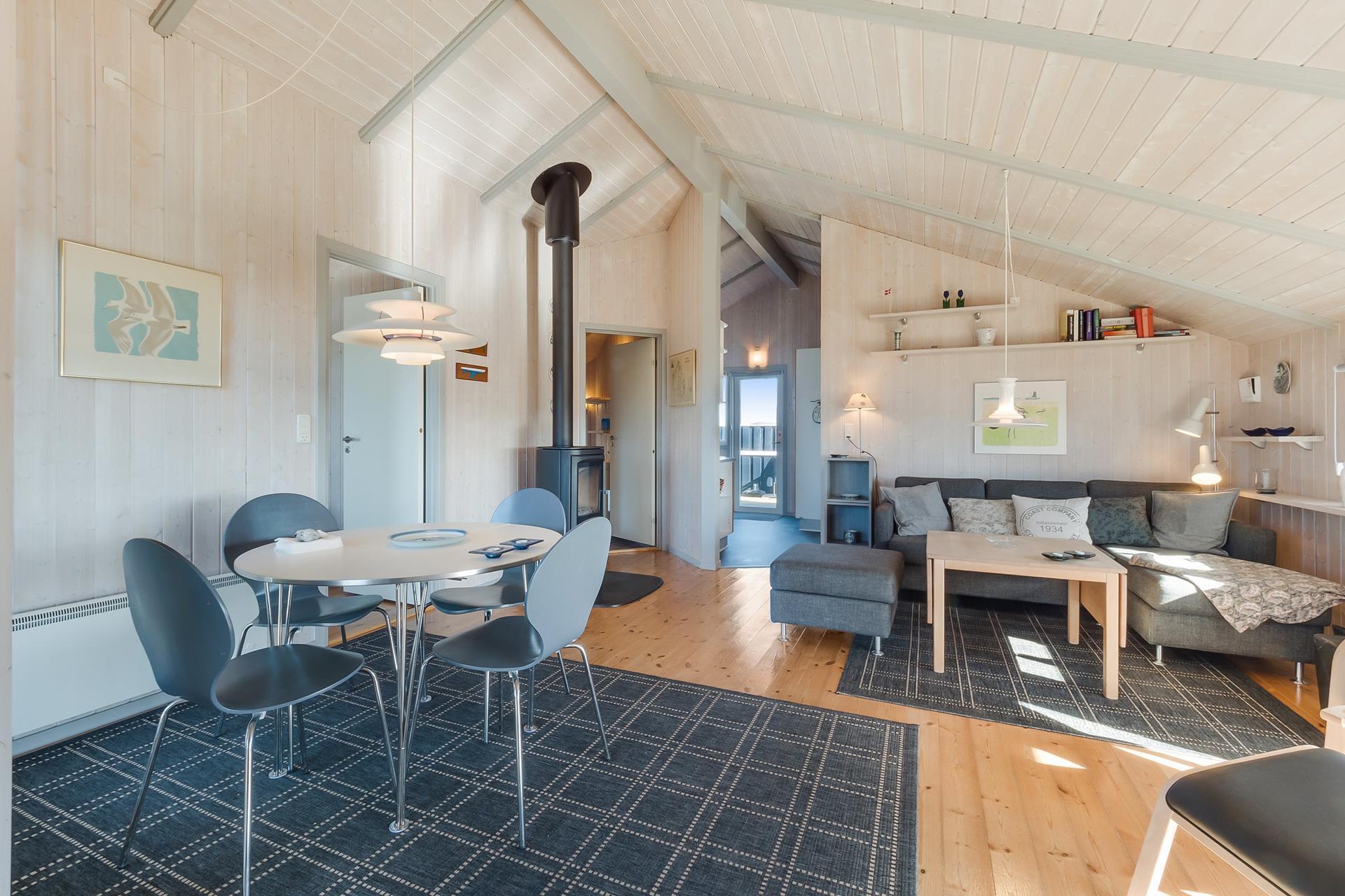 Huset er lyst og venligt grundet sine store vinduespartier og karnapper. Stuen er husets samlingspunkt og den er udstyret med trægulve og løse tæpper. Her er spisebord, lækker sofagruppe og fladskærm med dansk tv og TV2. Ydermere er der også mulighed for at se tysk tv via parabol. Nyd lyset i stuen og tænd op i brændeovnen som prikken over i'et. Energibesparende varmepumpe i huset. Så er grundlaget for en hyggelig stund til stede. Køkkenet har emhætte, elektrisk komfur, køle-fryseskab med separat fryser på 30 liter, mikrobølgeovn og opvaskemaskine. Der er 2 soveværelser i huset med obbeltseng. Hertil er der et stort badeværelse med håndvask, toilet, bruser, spa og sauna.