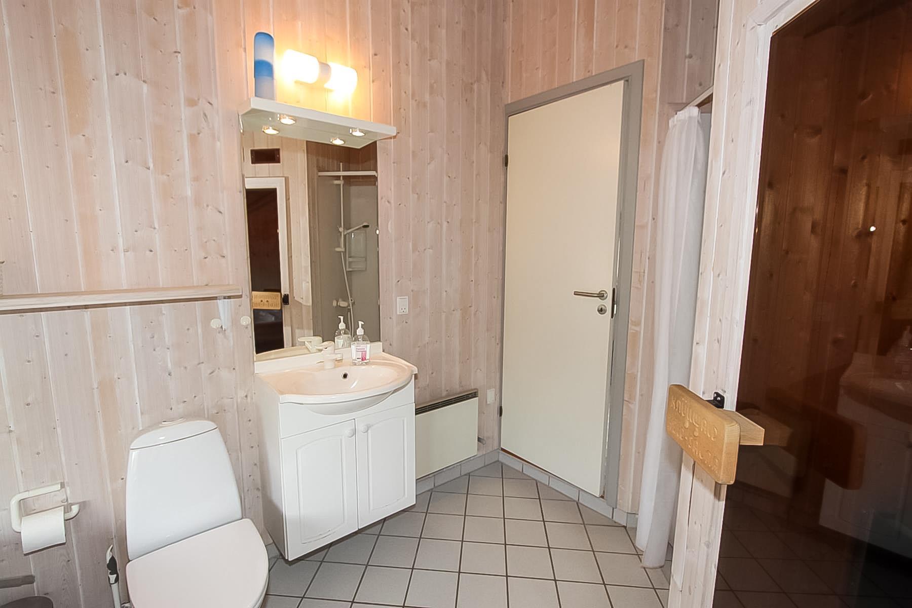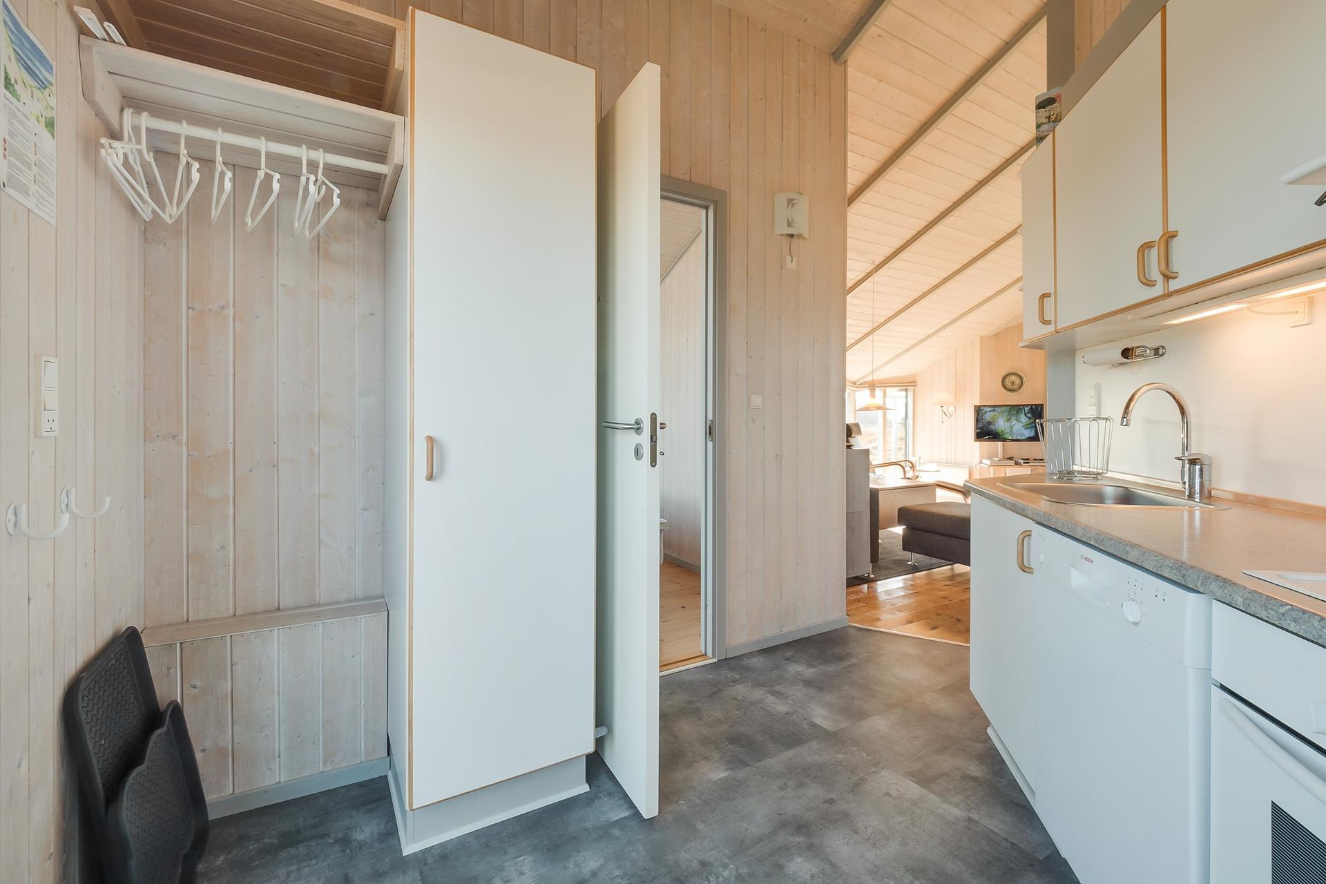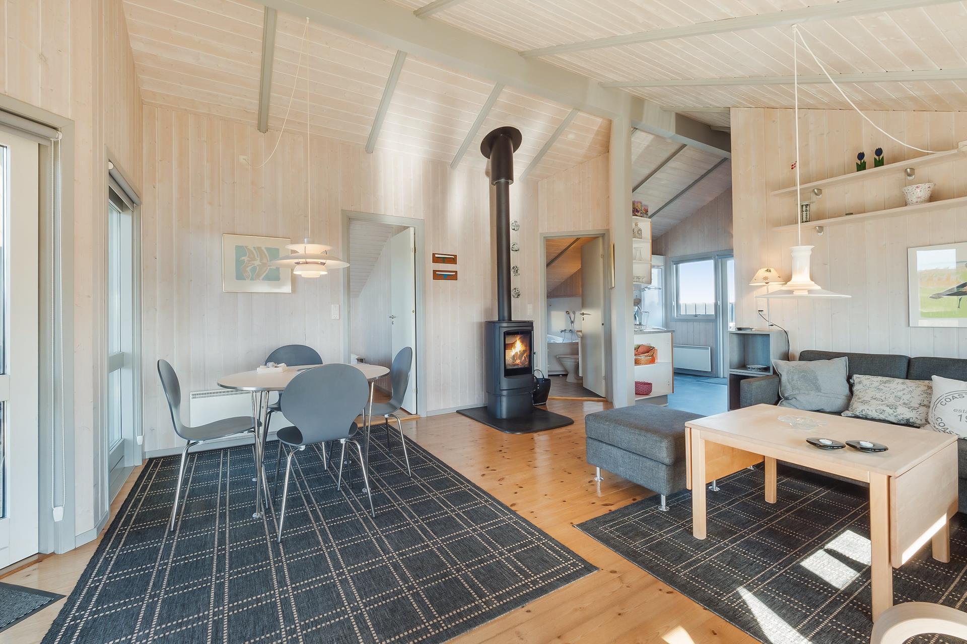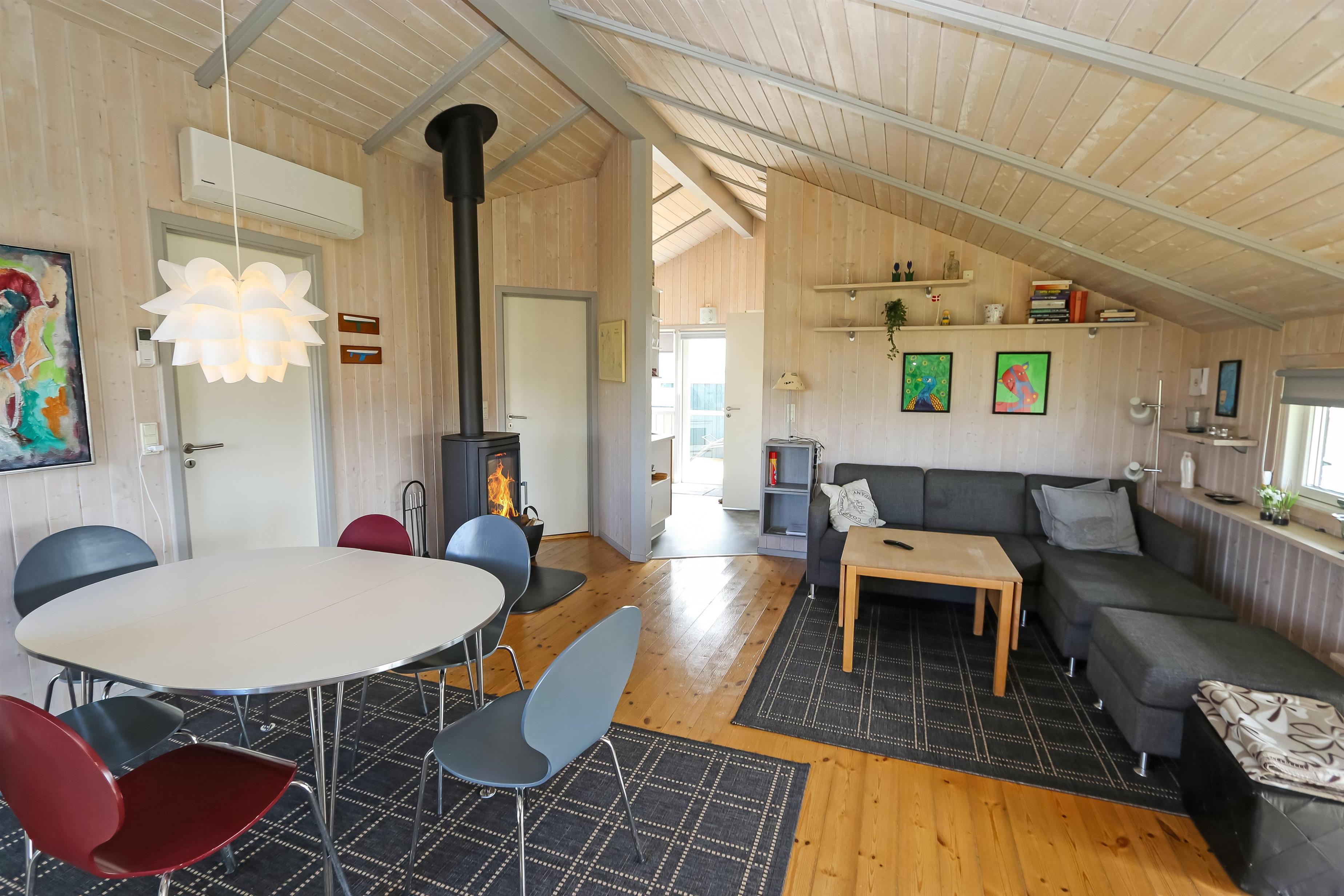 Huset er lyst og venligt grundet sine store vinduespartier og karnapper. Stuen er husets samlingspunkt og den er udstyret med trægulve og løse tæpper. Her er spisebord, lækker sofagruppe og fladskærm med dansk tv og TV2. Ydermere er der også mulighed for at se tysk tv via parabol. Nyd lyset i stuen og tænd op i brændeovnen som prikken over i'et. Energibesparende varmepumpe i huset. Så er grundlaget for en hyggelig stund til stede. Køkkenet har emhætte, elektrisk komfur, køle-fryseskab med separat fryser på 30 liter, mikrobølgeovn og opvaskemaskine. Der er 2 soveværelser i huset med obbeltseng. Hertil er der et stort badeværelse med håndvask, toilet, bruser, spa og sauna.