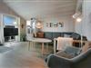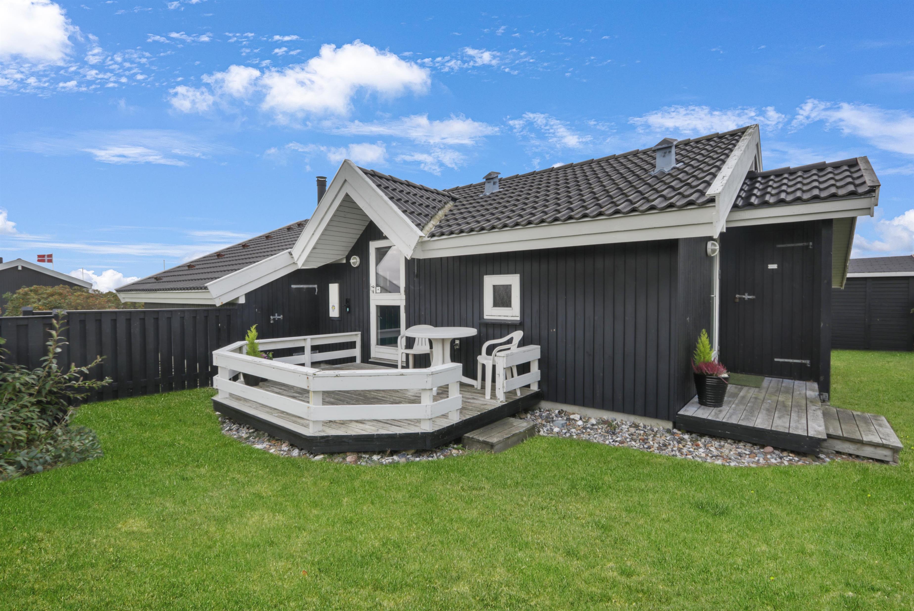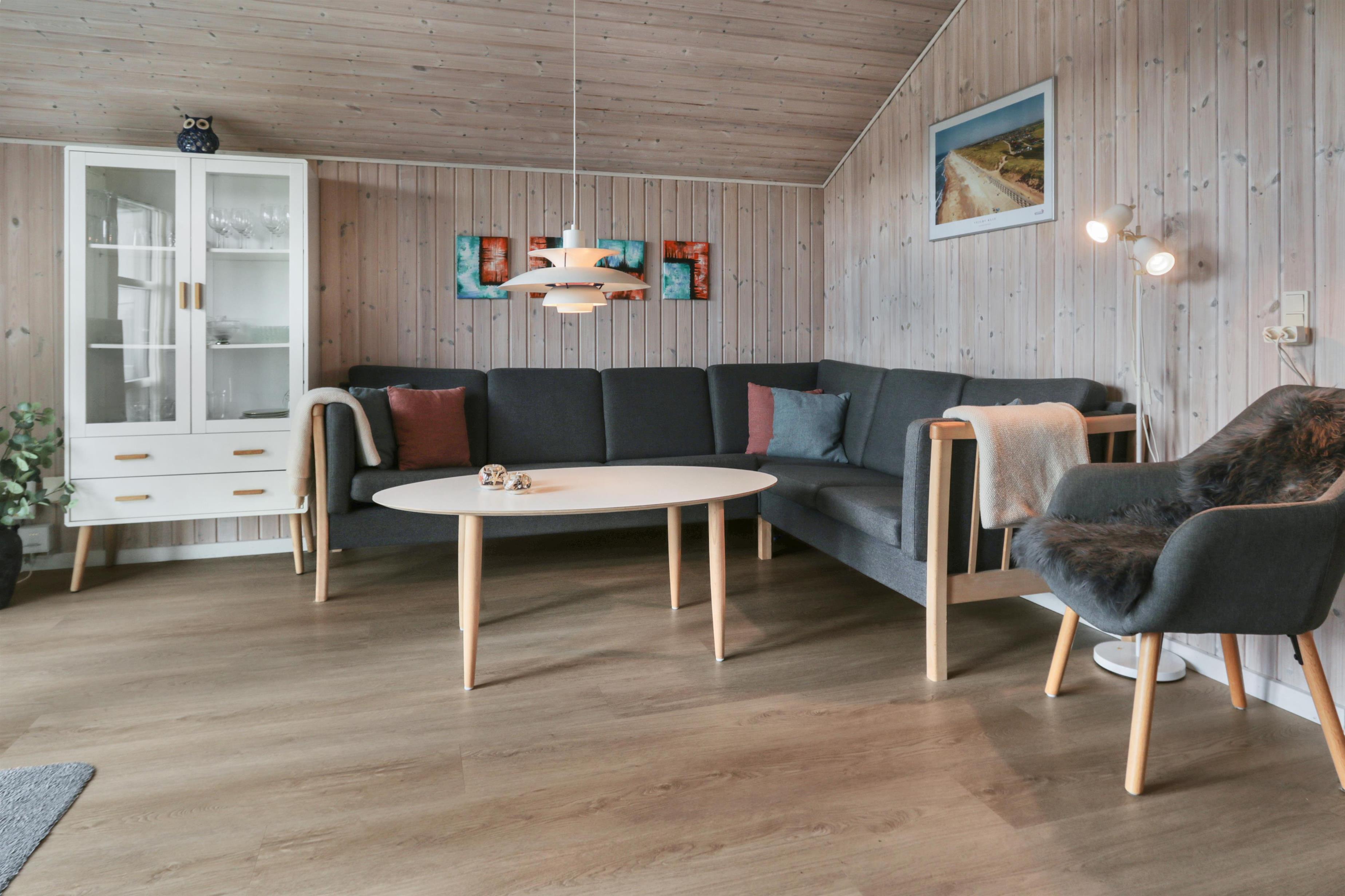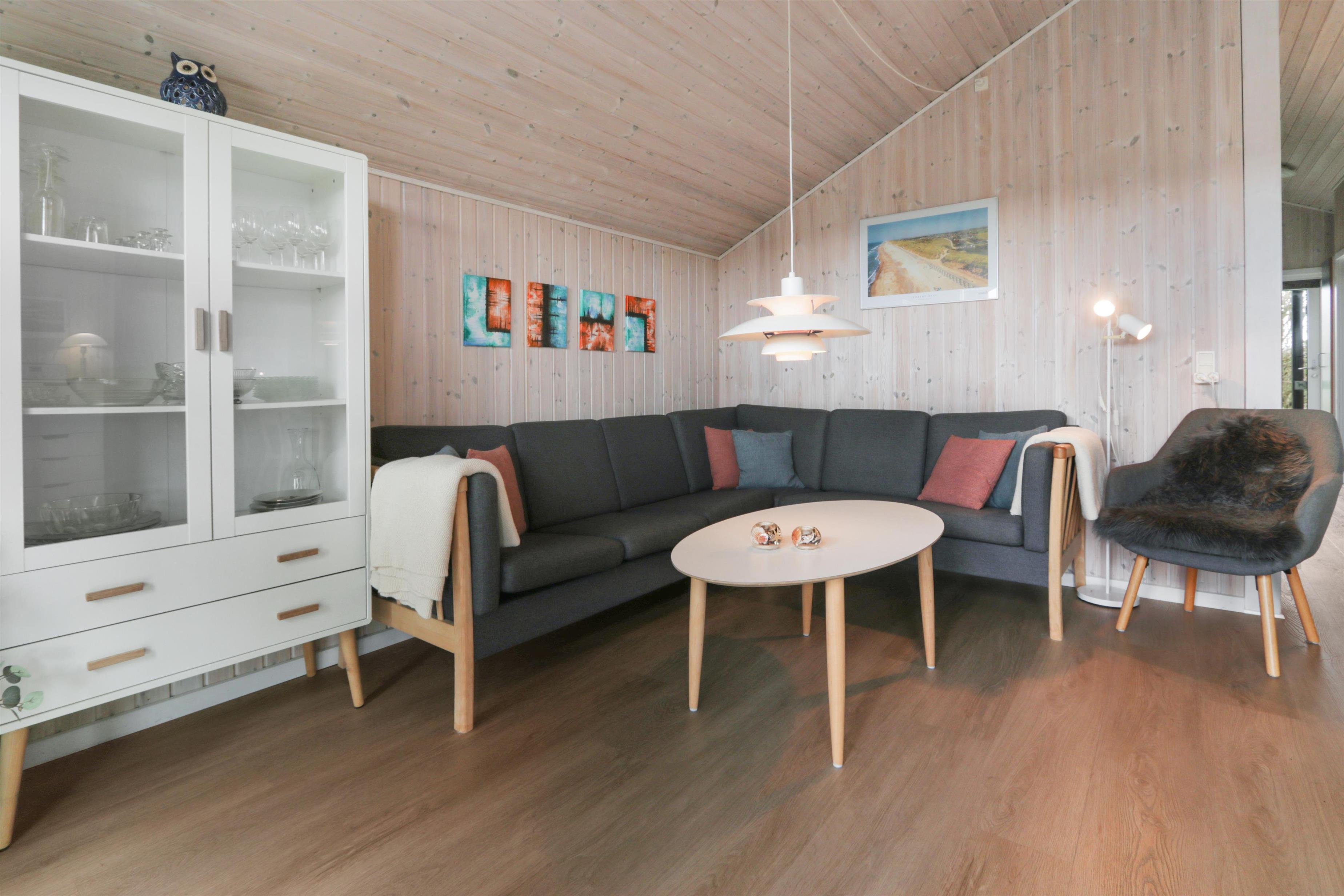 Feriehuset er på 65 m² og har plads til seks personer. Indretningen er lys og indbydende med en hyggelig kombineret stue og køkken. Det pæne og moderne køkken er veludstyret med komfur med glaskeramiske kogeplade, emhætte, opvaskemaskine, mikroovn samt køle-/fryseskab, så du nemt kan tilberede dagens måltider. Spisepladsen ligger i forlængelse af køkkenet og danner rammen om hyggelige måltider med familien.