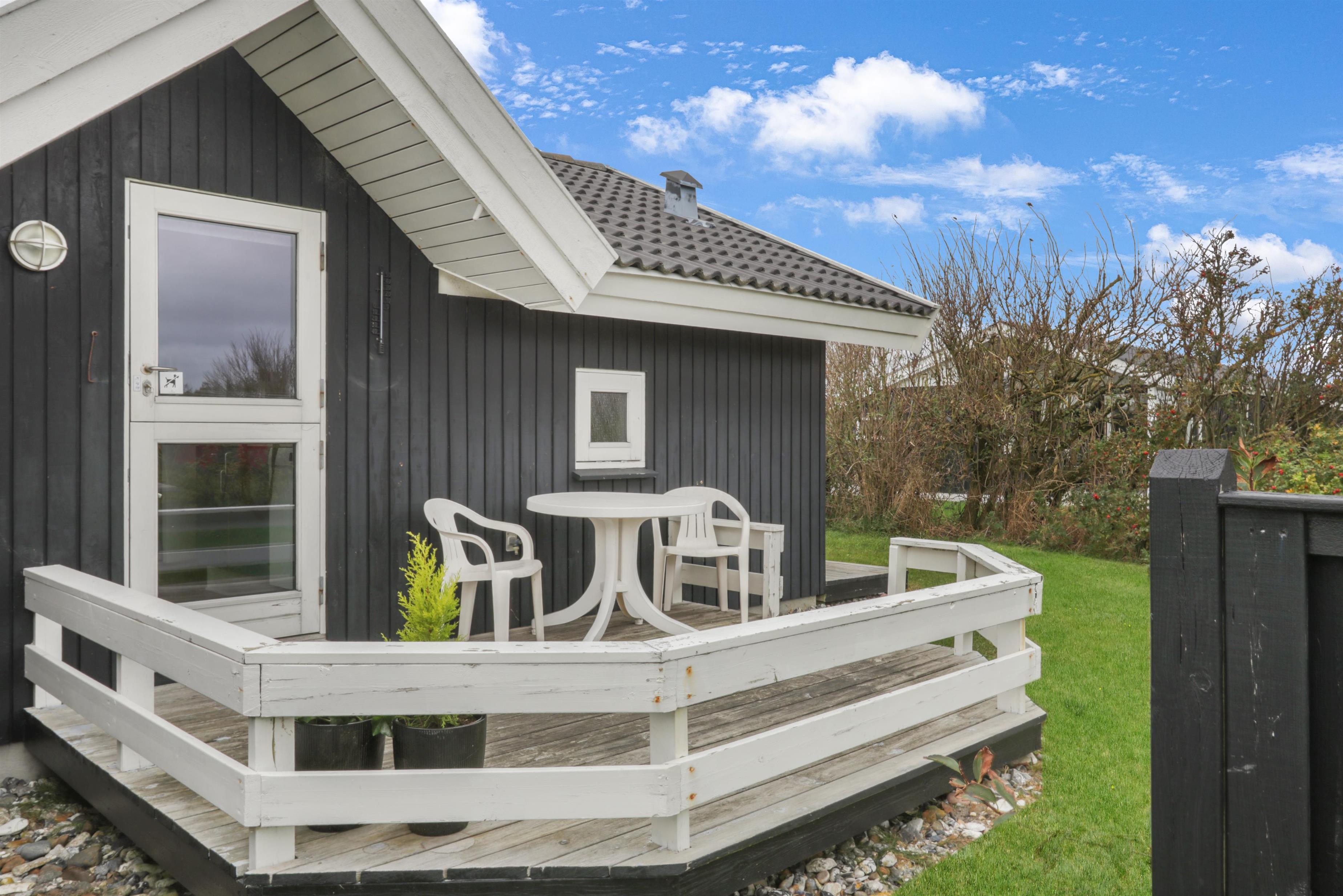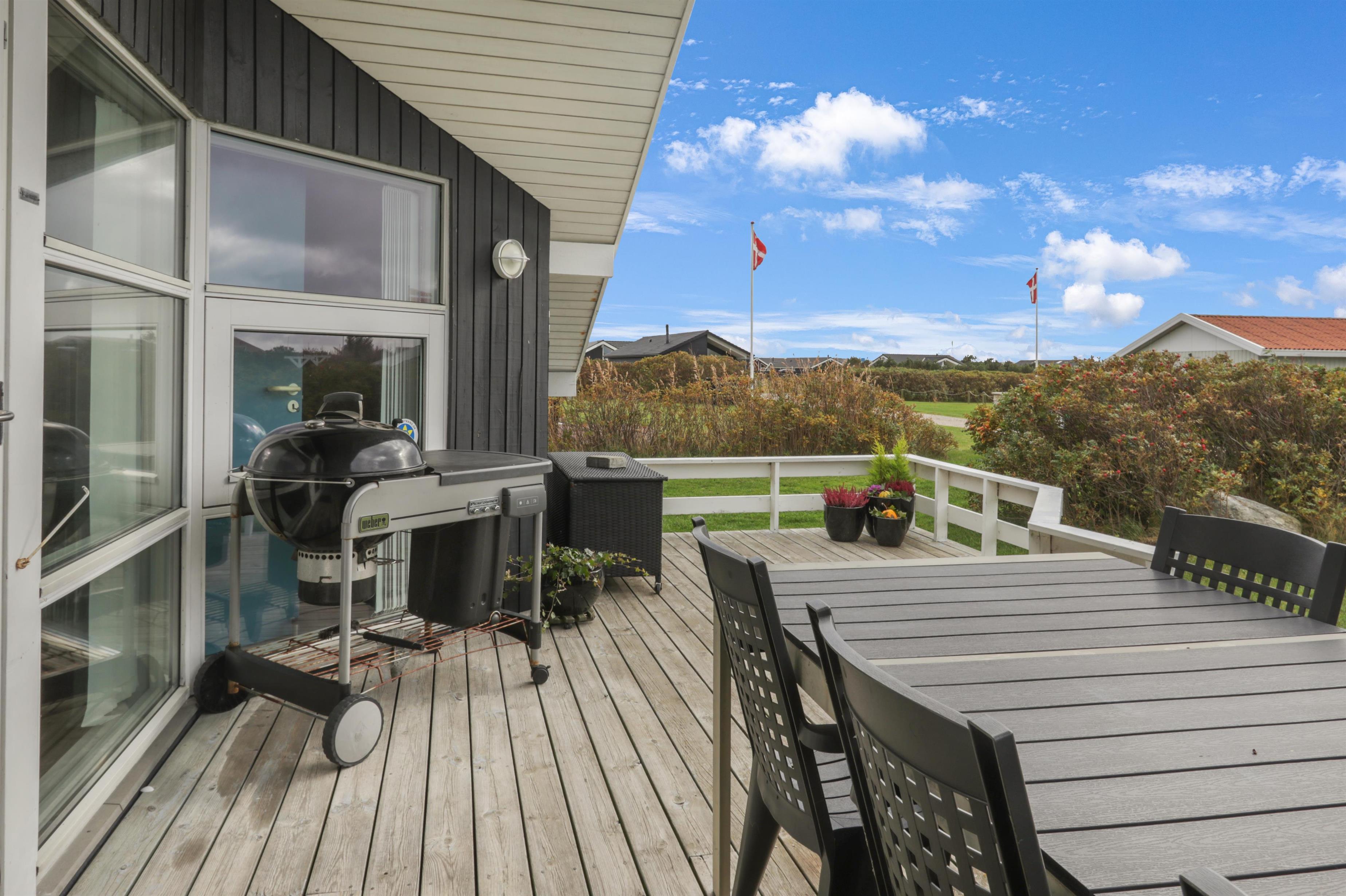 Huset ligger på en skøn naturgrund på 820 m² med masser af luft og privatliv. Den delvist overdækkede terrasse er udstyret med havemøbler, solvogne og grill – det perfekte sted at nyde en stille morgenkaffe eller en hyggelig grillaften. Fra køkkenet er der direkte udgang til en dejlig morgenterrasse.