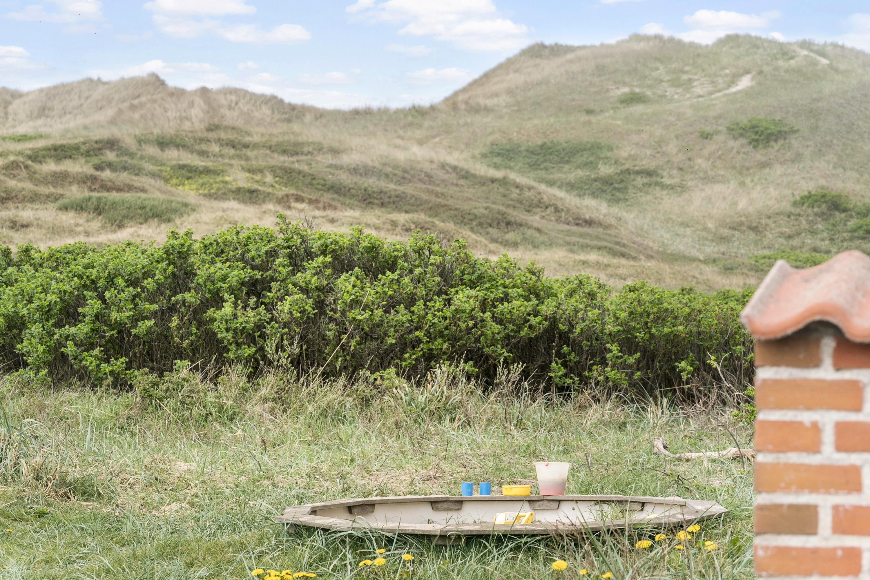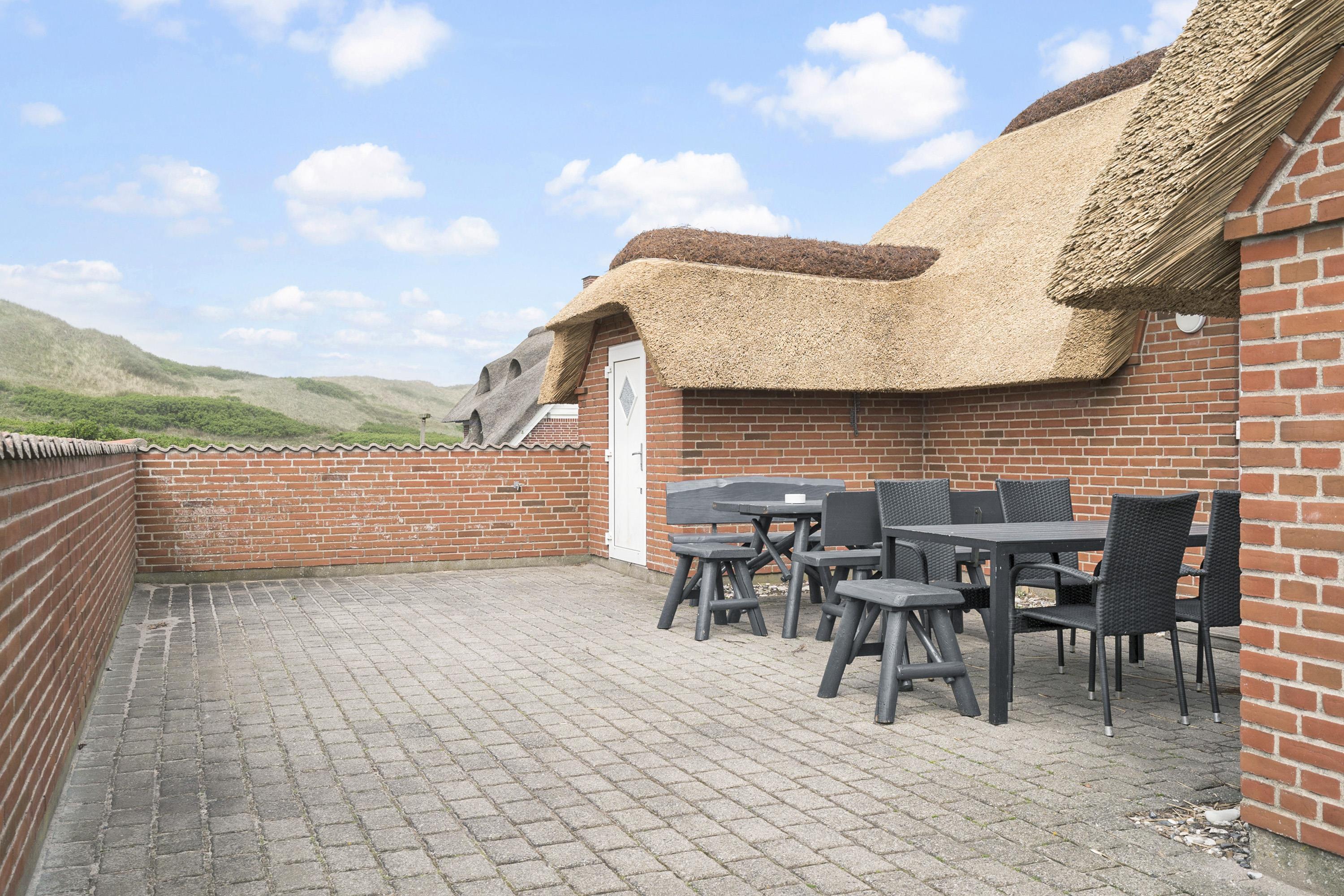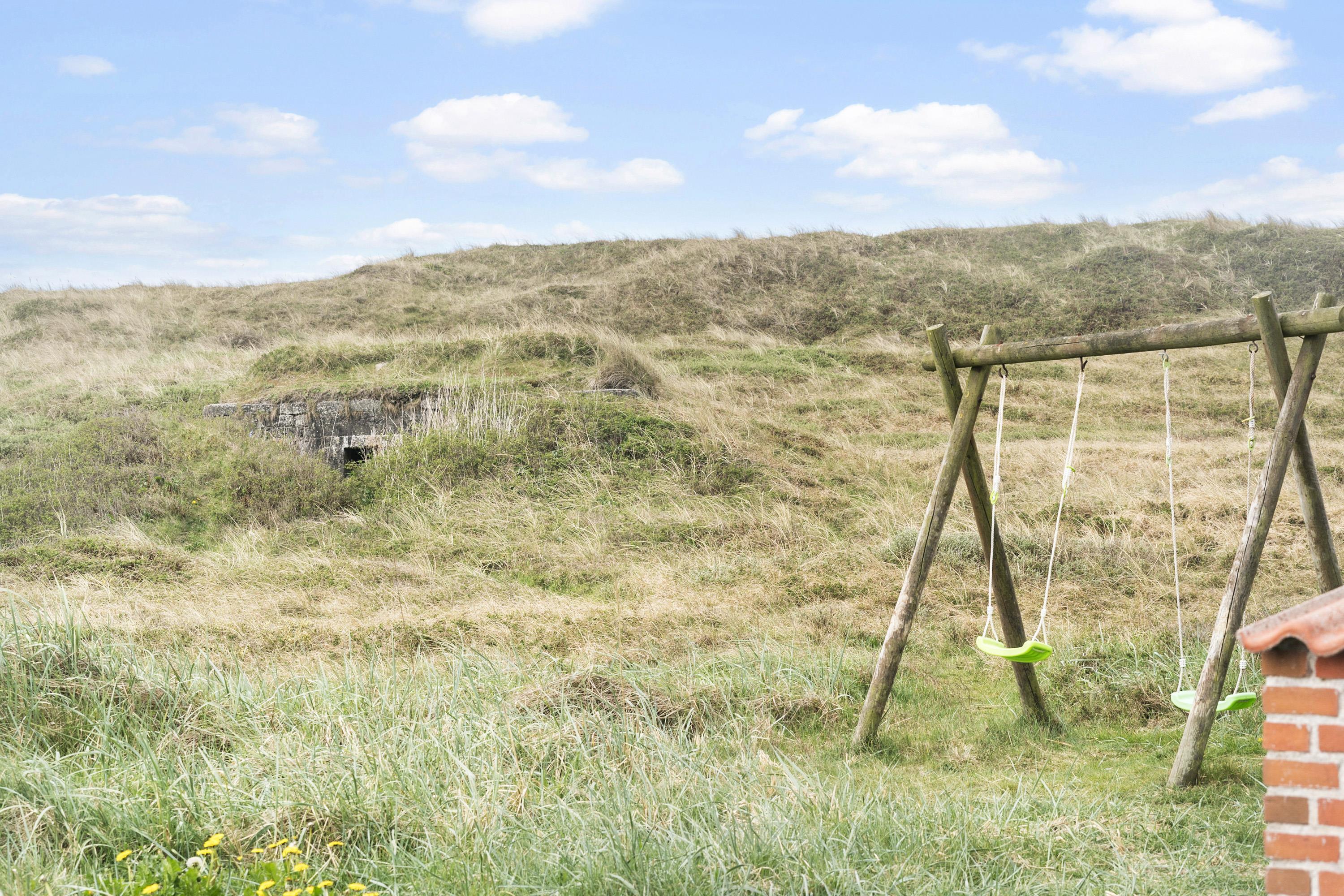 Fra huset er der udgang til en dejlig stor, lukket og solrig terrasse med gode havemøbler og solsenge. Der hører selvfølgelig også en grill til huset, så man kan nyde at lave maden udendørs på de varme aftener. Fra både huset og terrassen er der en god udsigt over landskabet og klitterne. Til børnene er der sandkasse og gynger. Huset ligger blot 130 m fra Vesterhavet og indkøb og restaurant ligger kun 400 m fra huset.