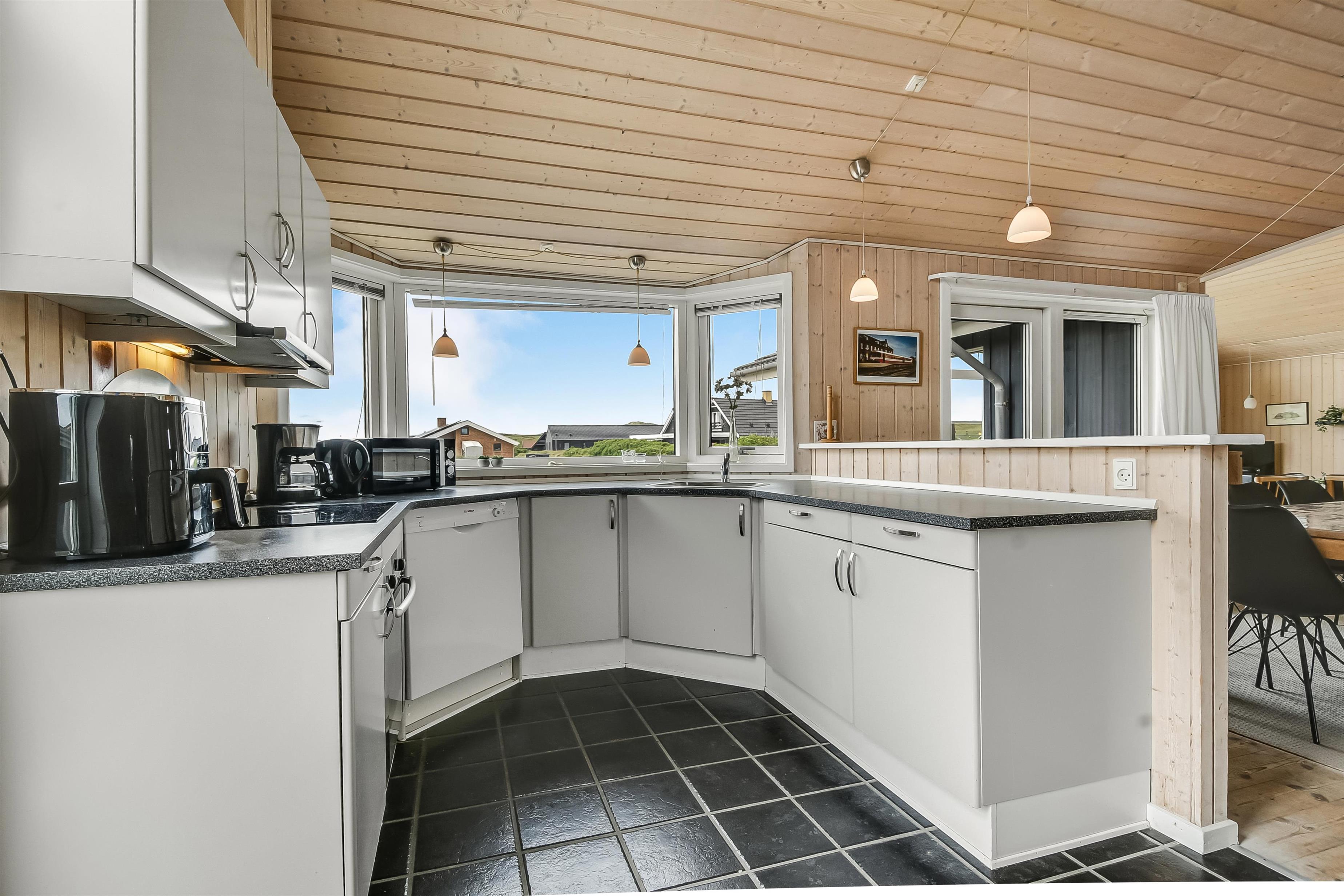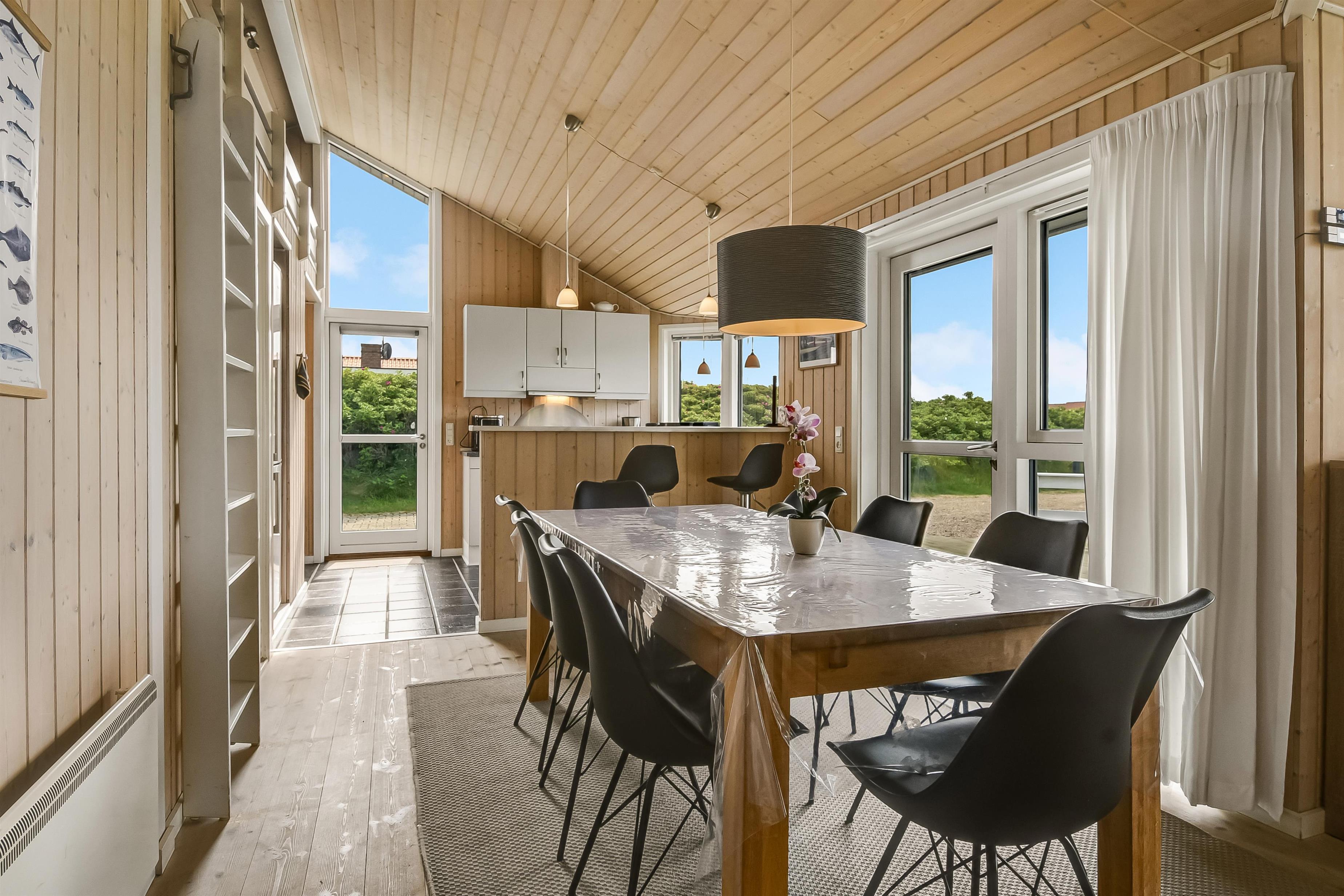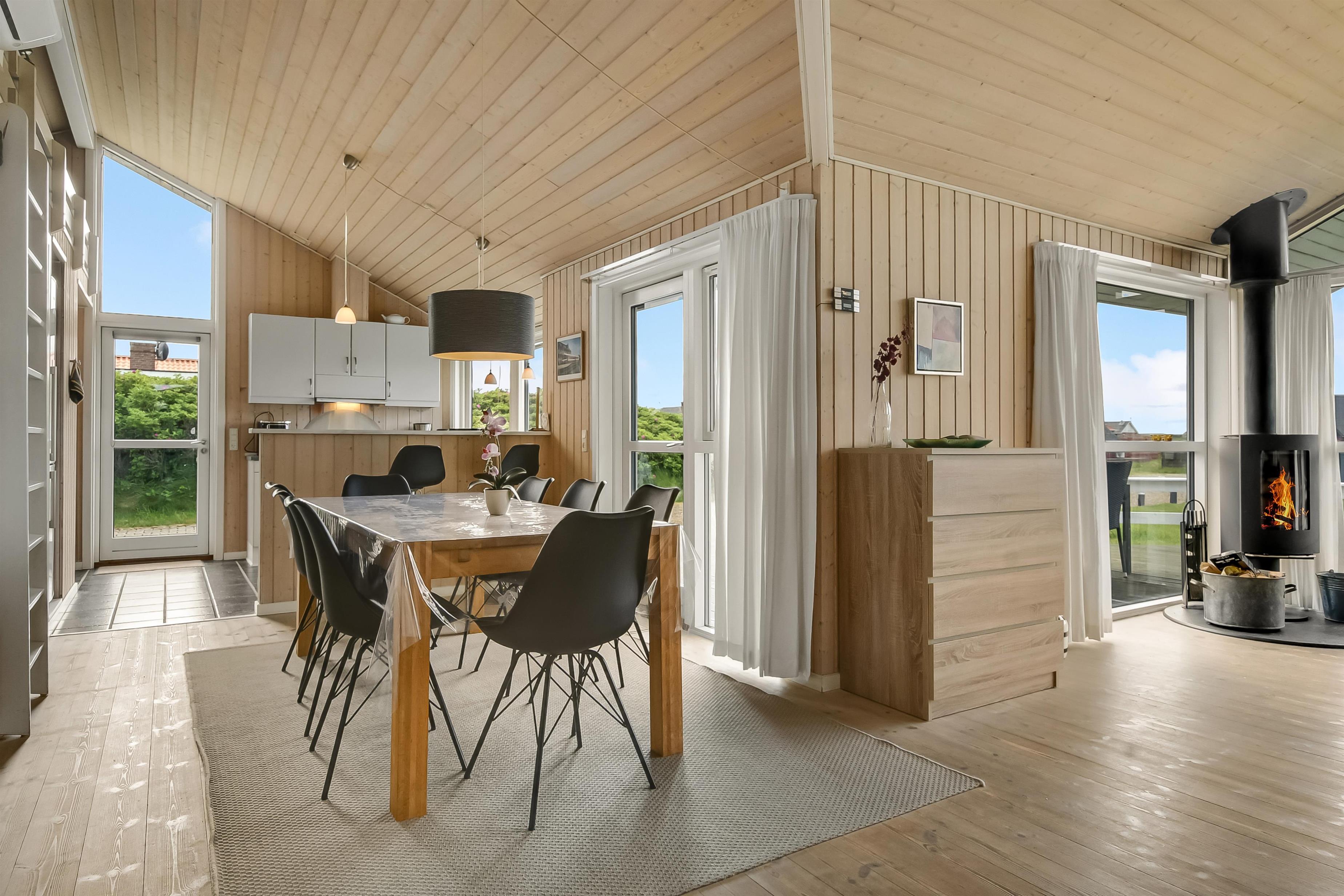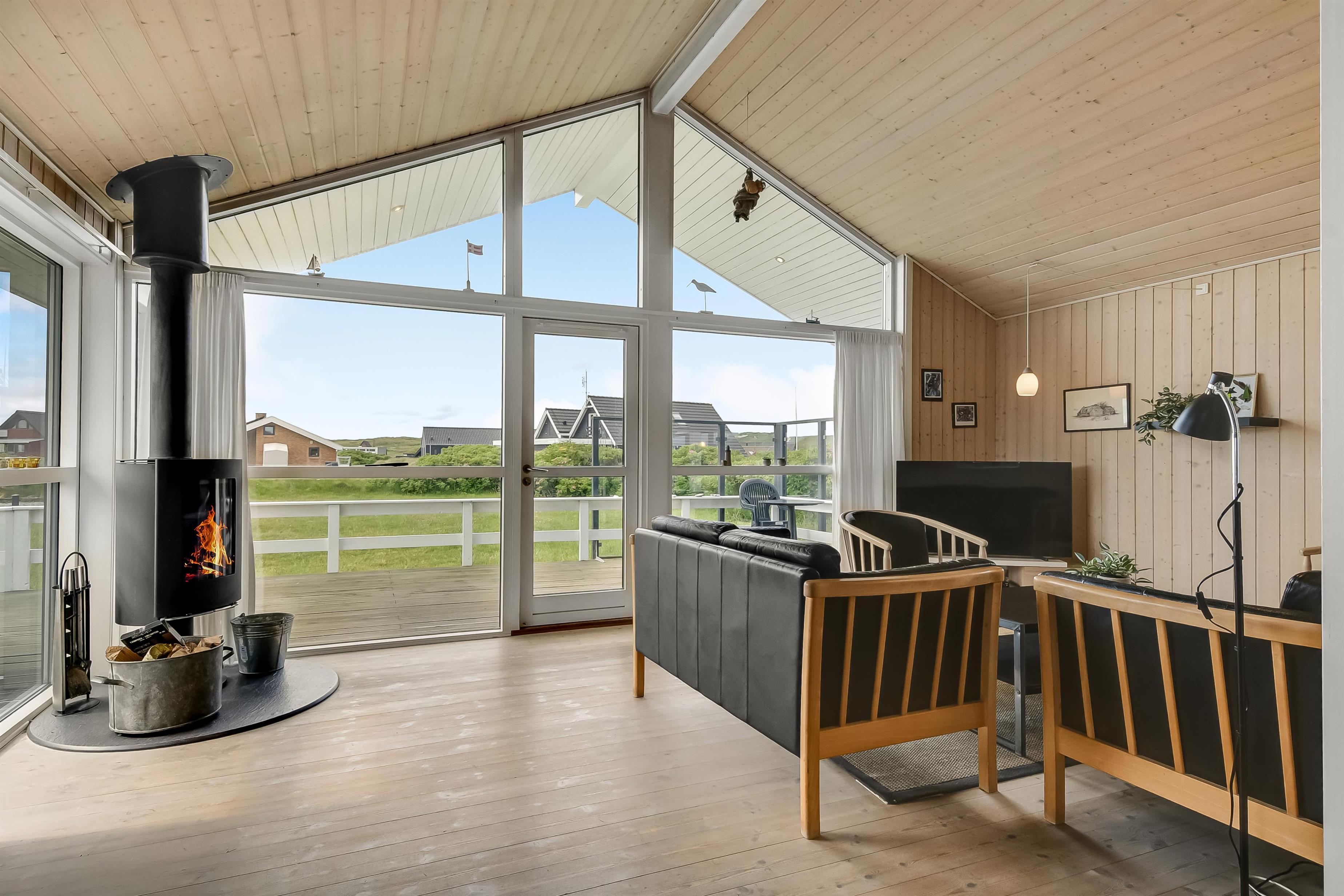 Huset er indrettet med kombineret stue og køkken. Køkkenet er flot og veludstyret med keramisk komfur, opvaskemaskine, køle/ fryseskab og mikrobølgeovn. Stuen er indrettet med komfortable lædermøbler. Der er TV med danske programmer, parabol med tyske programmer og DVD. Desuden stereoanlæg med cd-afspiller og gratis trådløst internet. Til en kølig sommeraften eller en efterårsdag med regn og rusk er der brændeovn til at varme og skabe en hyggelig stemning. Huset er indrettet med tre gode og lyse soveværelser. To værelser er indrettet med dobbeltseng og et med to enkeltsenge. Der er desuden to enkelte sovepladser på husets store hems. Til de yngste gæster er der en højstol i huset. Husets rummelige badeværelse indeholder spabad, bruseniche, toilet, bordarrangement med håndvask og vaskemaskine . Der er behagelig gulvvarme på badeværelset. Fra badeværelset er der direkte adgang til husets sauna, hvor I kan blive gennem varmet efter en lang travetur, ved det brusende Vesterhav og områdets flotte natur. Der er ekstra badeværelse med bruseniche, toilet og bordarrangement med håndvask. Der er installeret varmepumpe i huset og det betyder, at du som gæst kan spare en del på din elvarmeregning