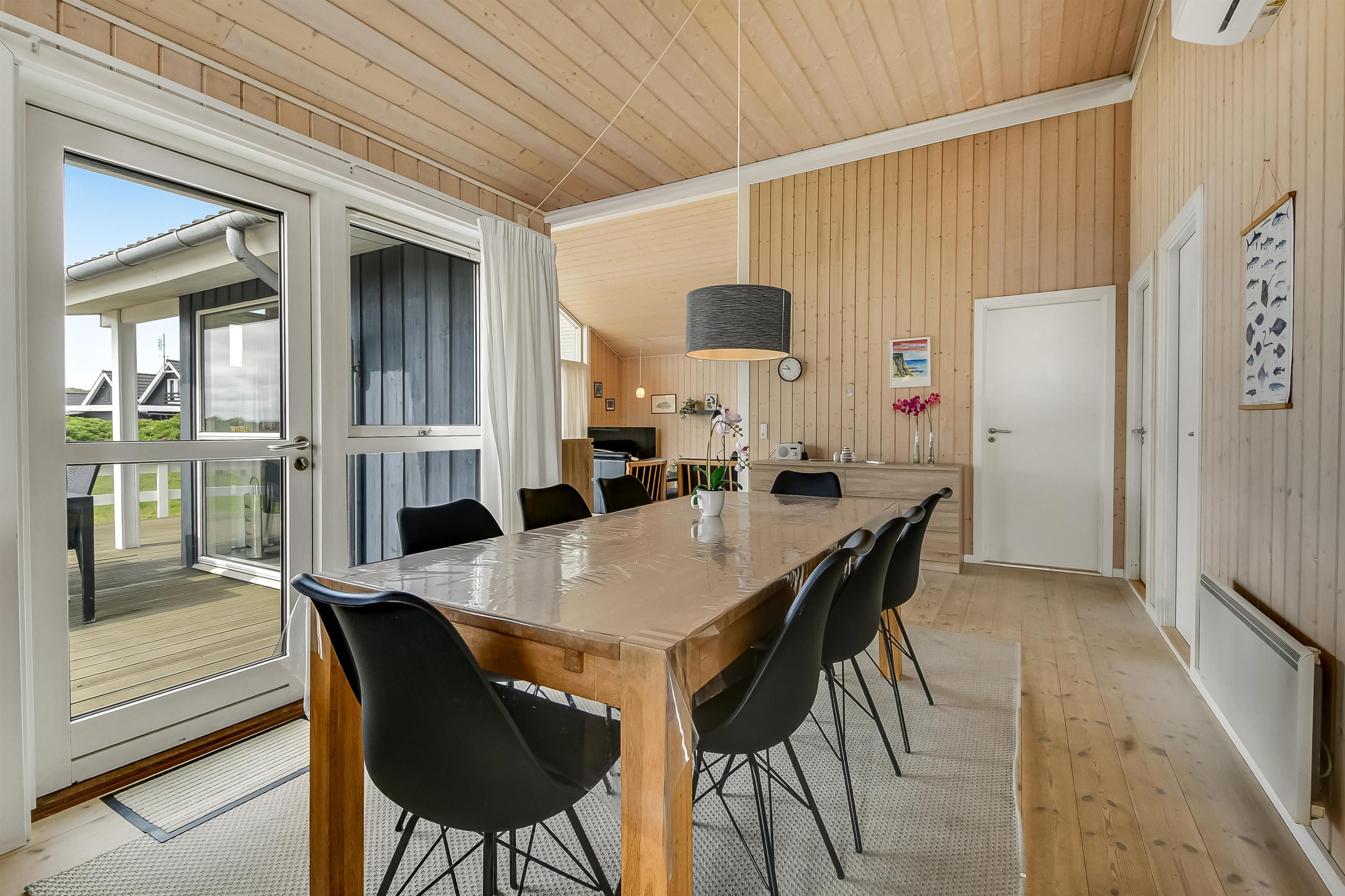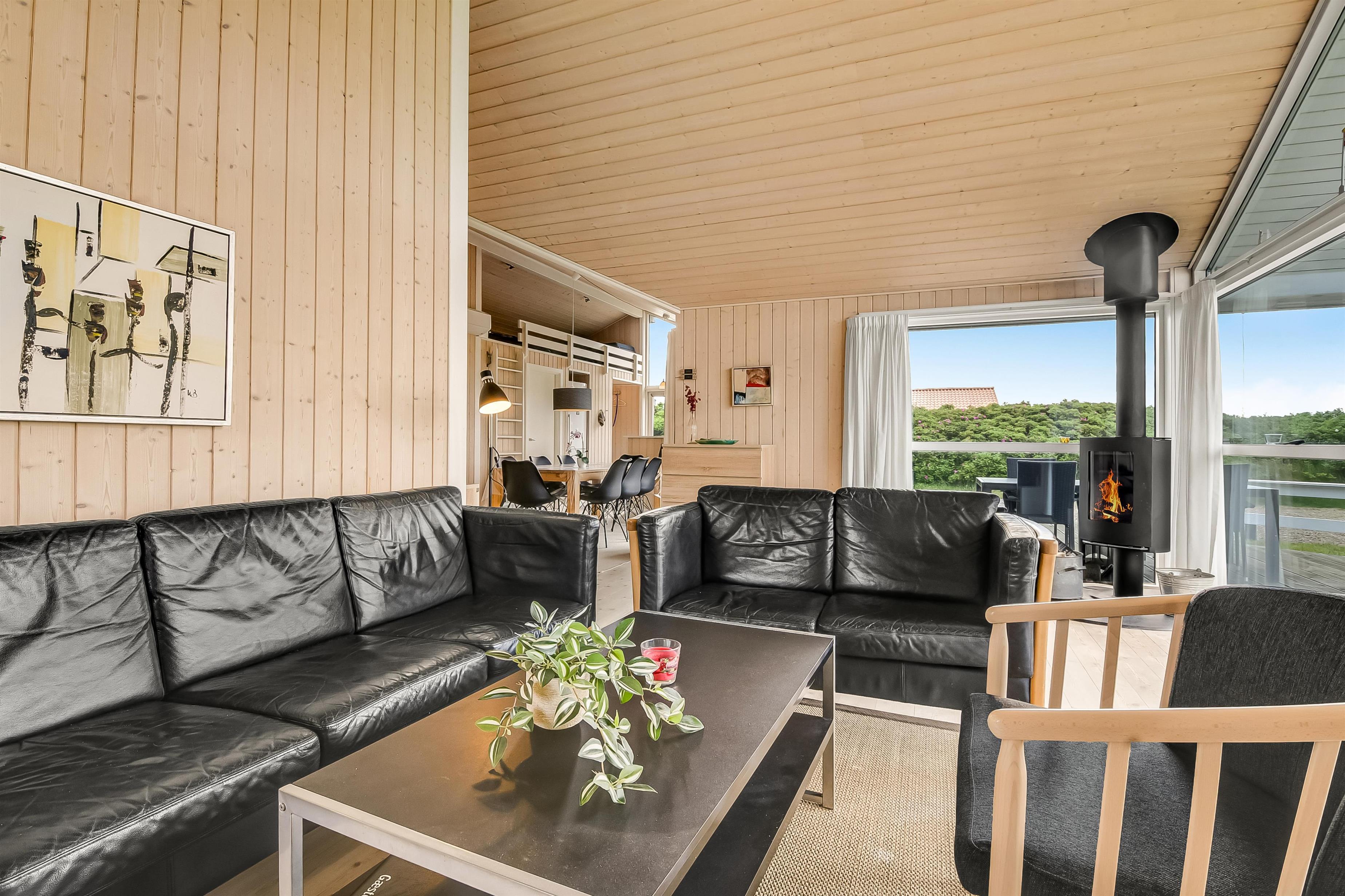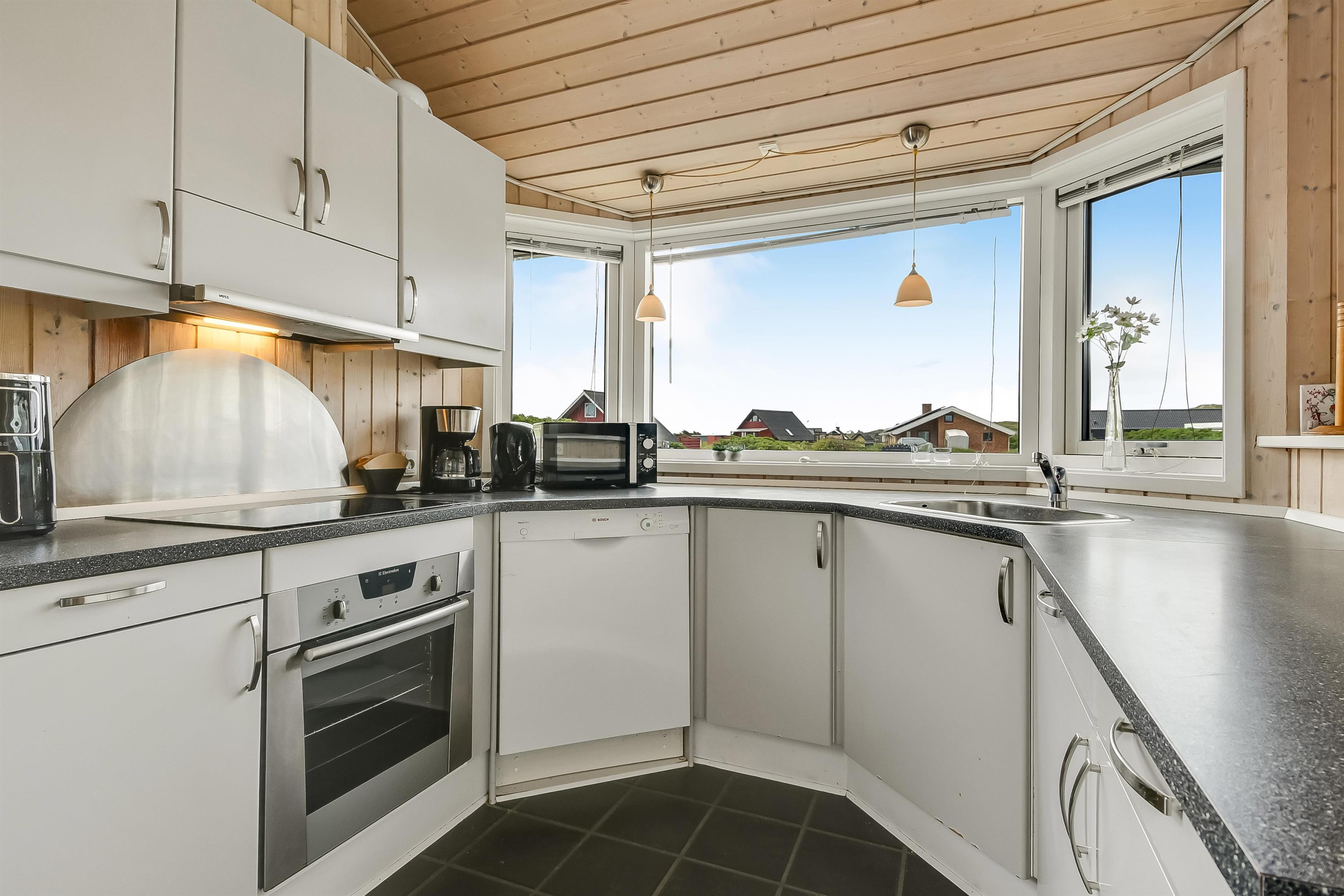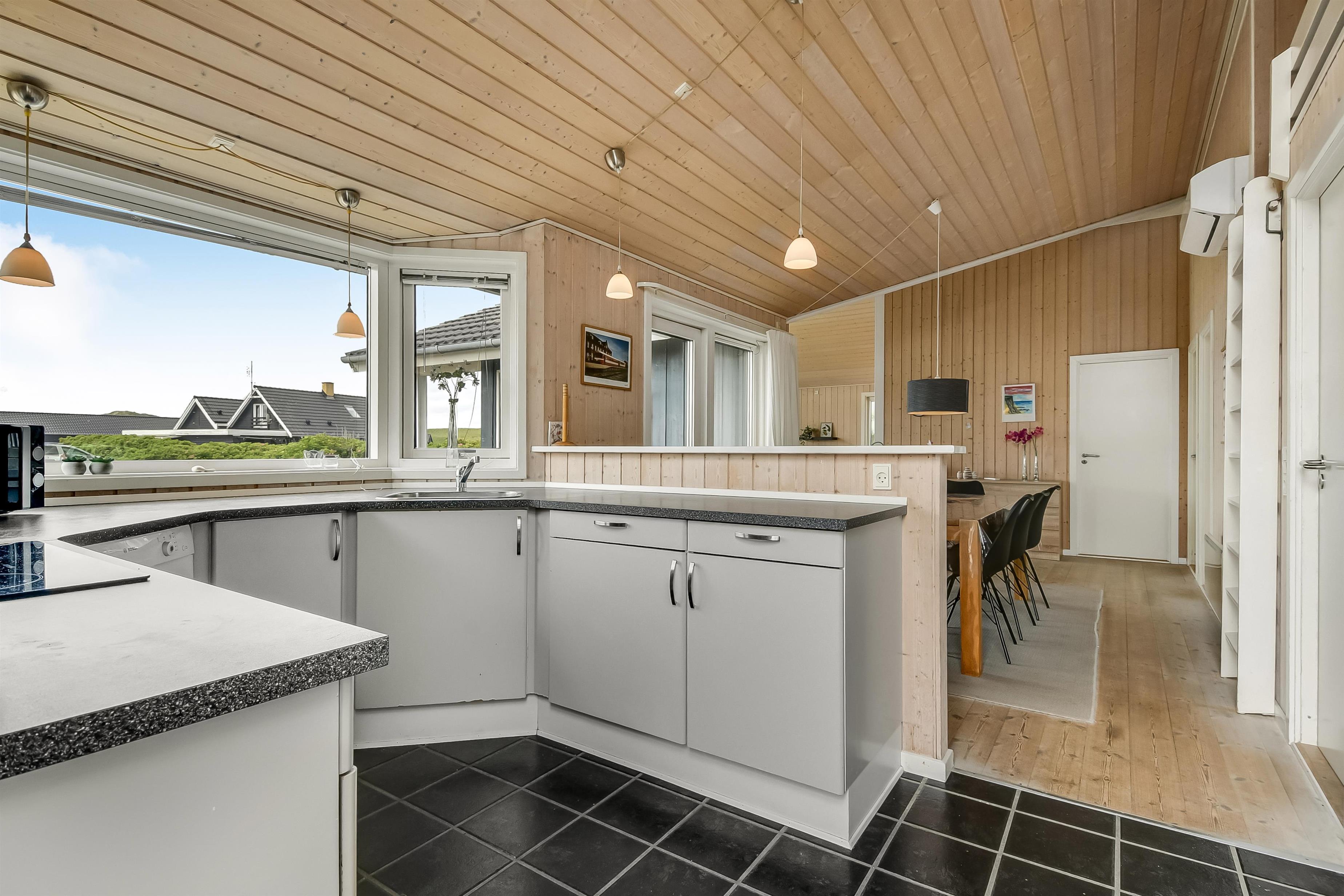 Huset er indrettet med kombineret stue og køkken. Køkkenet er flot og veludstyret med keramisk komfur, opvaskemaskine, køle/ fryseskab og mikrobølgeovn. Stuen er indrettet med komfortable lædermøbler. Der er TV med danske programmer, parabol med tyske programmer og DVD. Desuden stereoanlæg med cd-afspiller og gratis trådløst internet. Til en kølig sommeraften eller en efterårsdag med regn og rusk er der brændeovn til at varme og skabe en hyggelig stemning. Huset er indrettet med tre gode og lyse soveværelser. To værelser er indrettet med dobbeltseng og et med to enkeltsenge. Der er desuden to enkelte sovepladser på husets store hems. Til de yngste gæster er der en højstol i huset. Husets rummelige badeværelse indeholder spabad, bruseniche, toilet, bordarrangement med håndvask og vaskemaskine . Der er behagelig gulvvarme på badeværelset. Fra badeværelset er der direkte adgang til husets sauna, hvor I kan blive gennem varmet efter en lang travetur, ved det brusende Vesterhav og områdets flotte natur. Der er ekstra badeværelse med bruseniche, toilet og bordarrangement med håndvask. Der er installeret varmepumpe i huset og det betyder, at du som gæst kan spare en del på din elvarmeregning