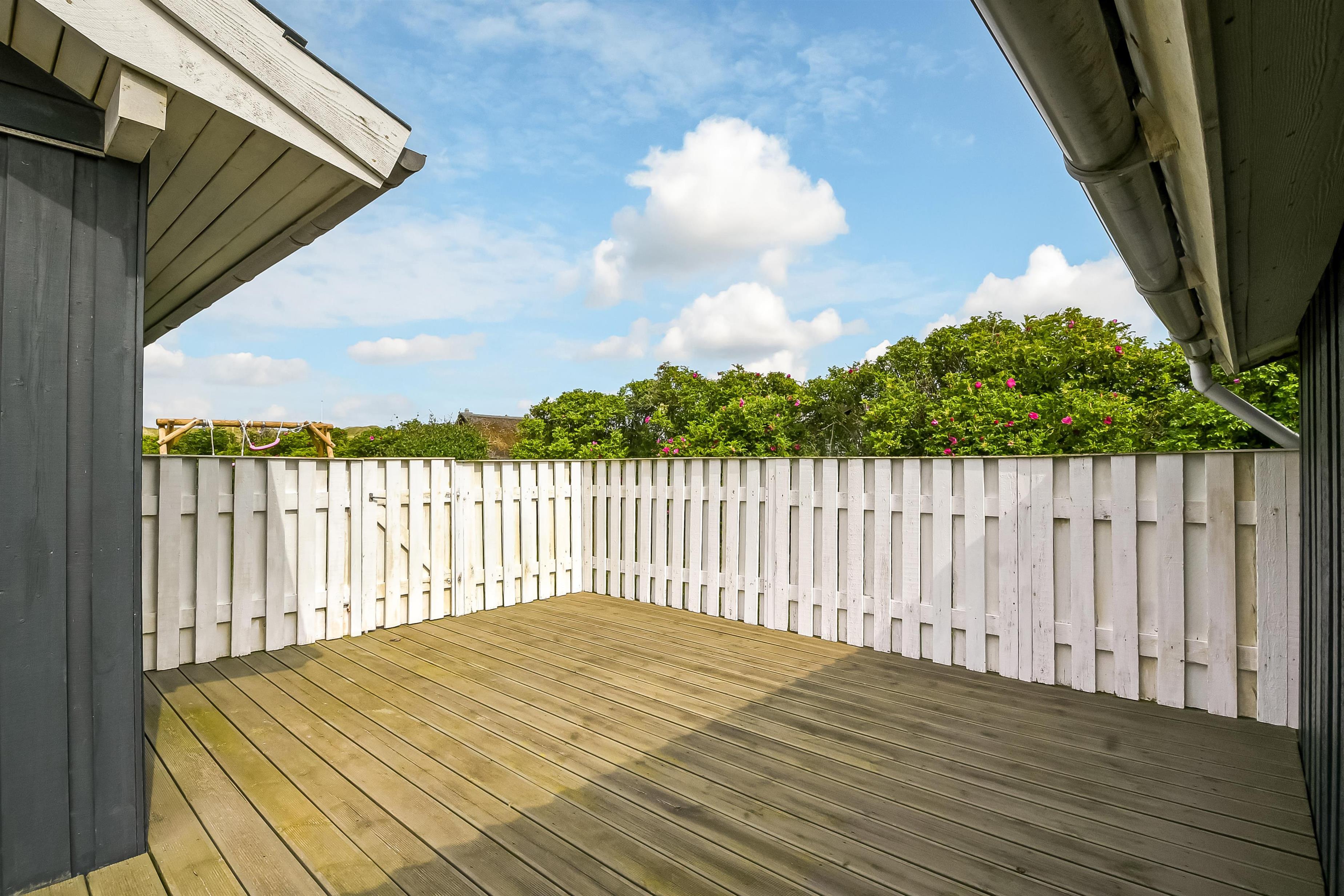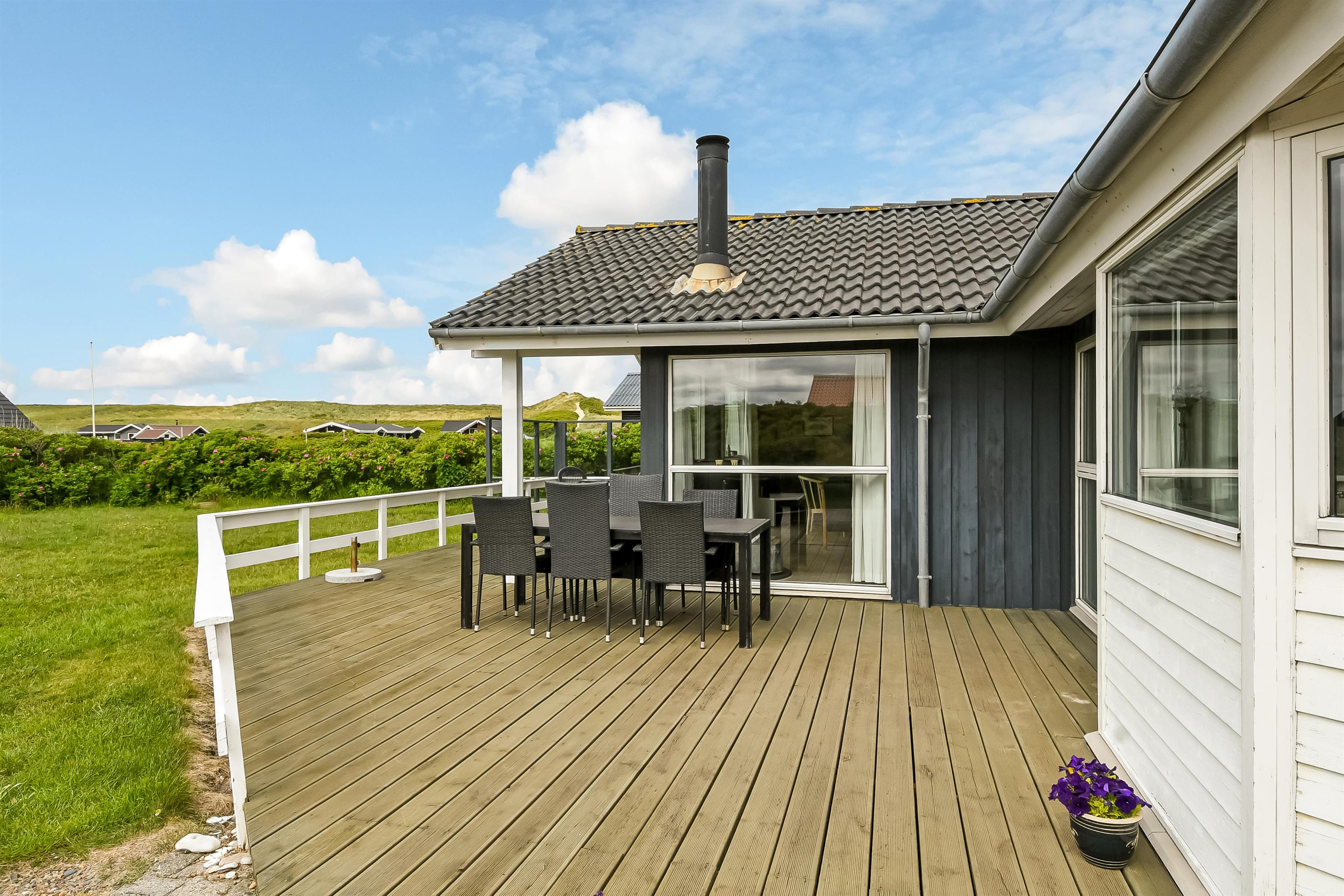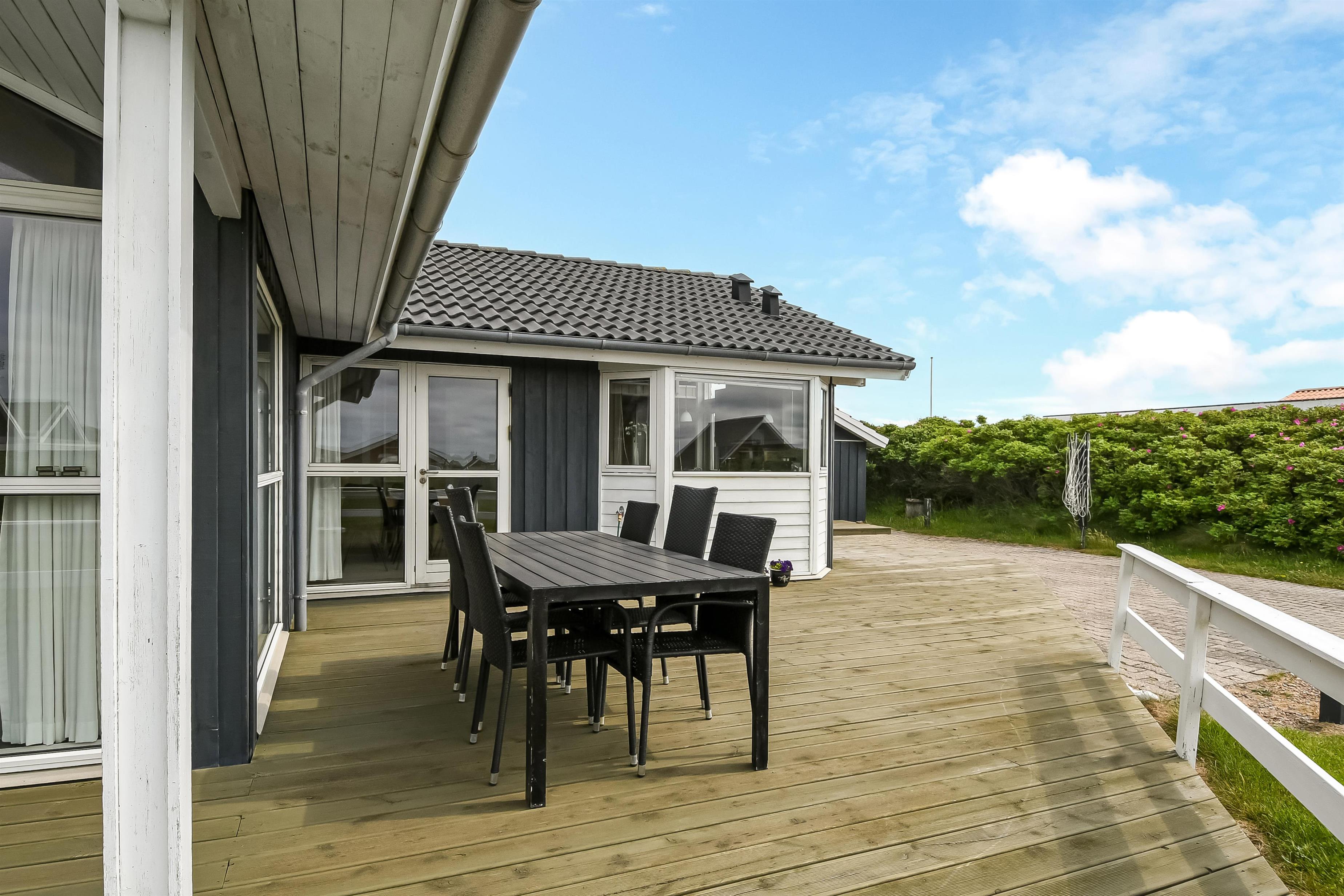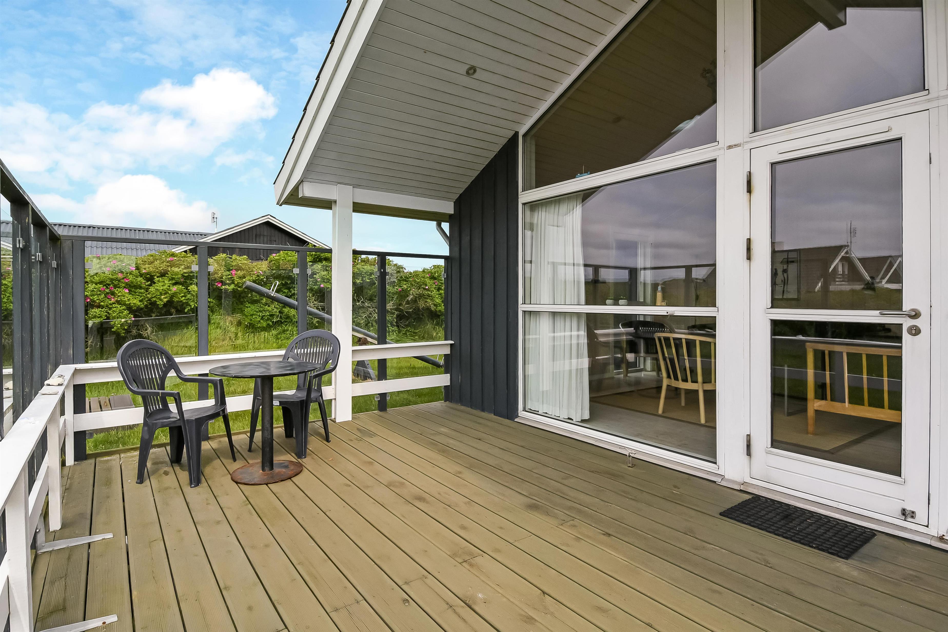 Der er terrasser næsten hele vej rundt om huset, hvoraf en del er overdækket, så det er næsten altid muligt at finde godt med læ. Der er havemøbler til begge terrasser. Aftensmaden kan tilberedes på husets grill, og nydes de lyse sommeraftner på terrassen. Til de yngste gæster er der sandkasse ved huset. Området byder på mange udflugtsmuligheder. Prøv at stå tidligt op i ferien, og tage på fiskeauktion i Thyborøn. Det er en oplevelse at se de mange kasser fisk skifter ejer på få minutter. Thyborøn byder på et spændende havnemiljø og Jyllandsakvariet med mange spændende fisk og aktiviteter for børn. Kystcentret i samme område er også et besøg værd. Fra Thyborøn er der en lille færge til Agger, hvor i kan besøge Danmarks første Nationalpark Thy. Lemvig er en hyggelig by ved Limfjorden, kun 15 min fra sommerhuset. Der finder i en hyggelig gågade samt et stort udvalg i dagligvarer forretninger og specialbutikker.