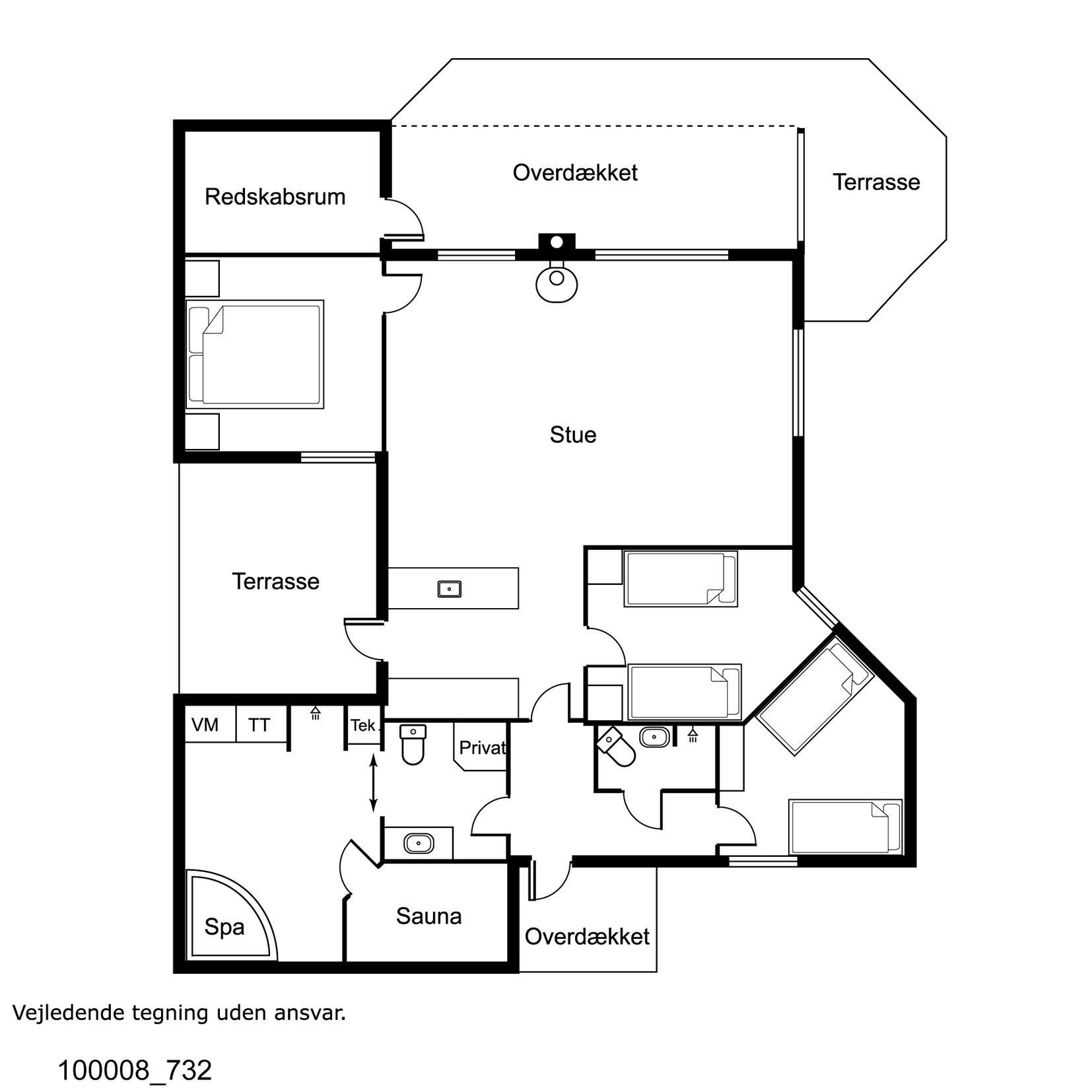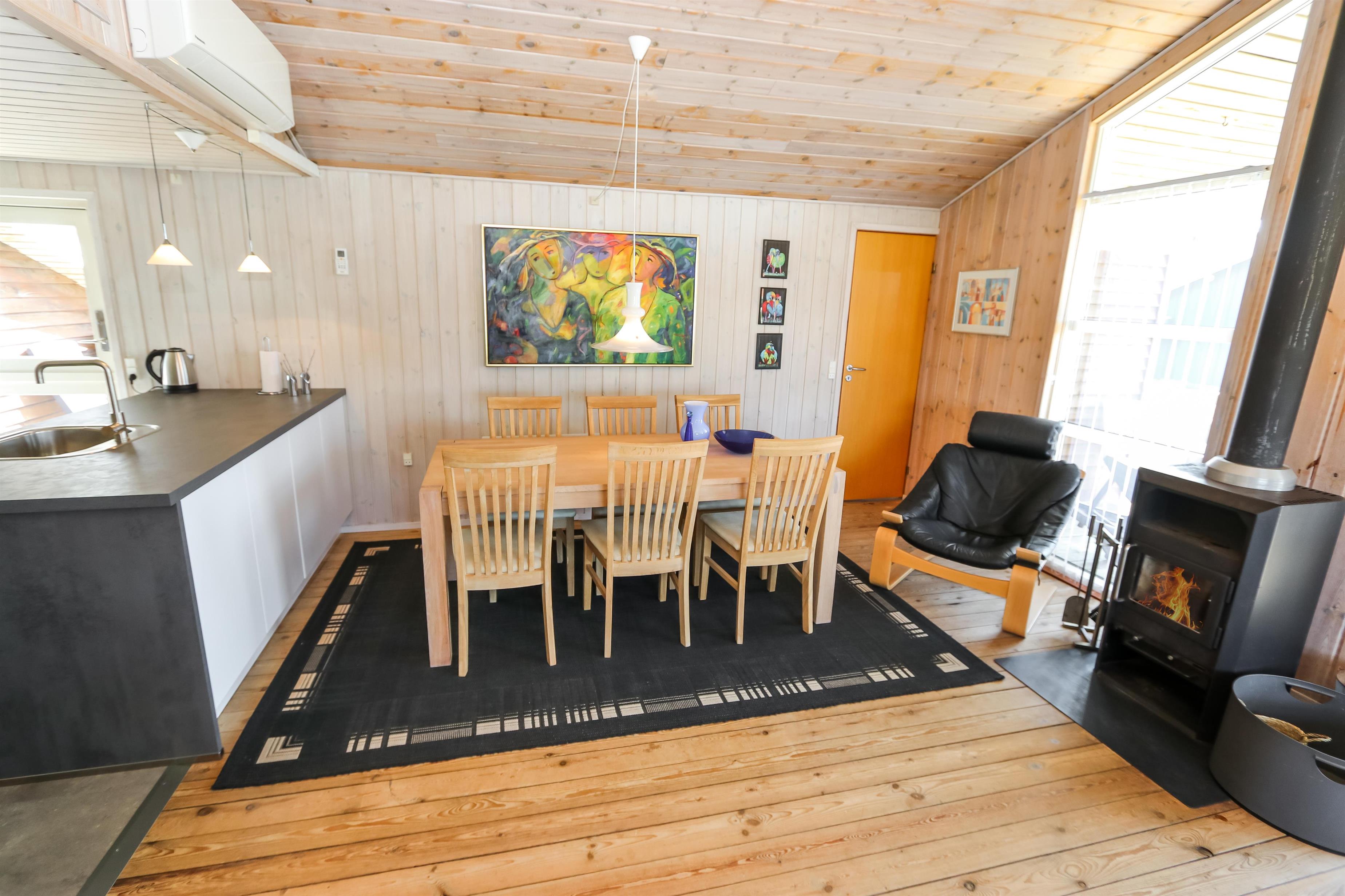 Stuen som er kombineret med køkkenet indeholder brændeovn og en varmepumpe som begge sørger for en behagelig varme og desuden bevirker en lavere forbrugsafregning, DVD, stereoanlæg med cd og farve tv med danske programmer og parabolantenne (dog kun tyske kanaler). Her er der trådløs internetadgang, hvilket er gratis. Der findes 2 badeværelser, begge med bruser , toilet og håndvask. Det ene badeværelse har også gulvvarme, spabad og direkte adgang til saunaen. Huset har 3 soverum: 1 med dobbeltseng + 2 med hver 2 enkeltsenge og 2 liggemuligheder på hems. Huset er til max 7 personer. Køkkenet er veludstyret og er med glaskeramisk komfur, køle-/fryseskab, opvaskemaskine og mikroovn. Af andet udstyr kan nævnes vaskemaskine, tørretumbler og barnestol. I alt et dejligt hus beliggende kun 700 meter fra supermarked, som har åbent i sæsonen fra påske til efterårsferien, og kun 250 meter fra stranden. Max 1 husdyr er tilladt. Ikke ryger hus.