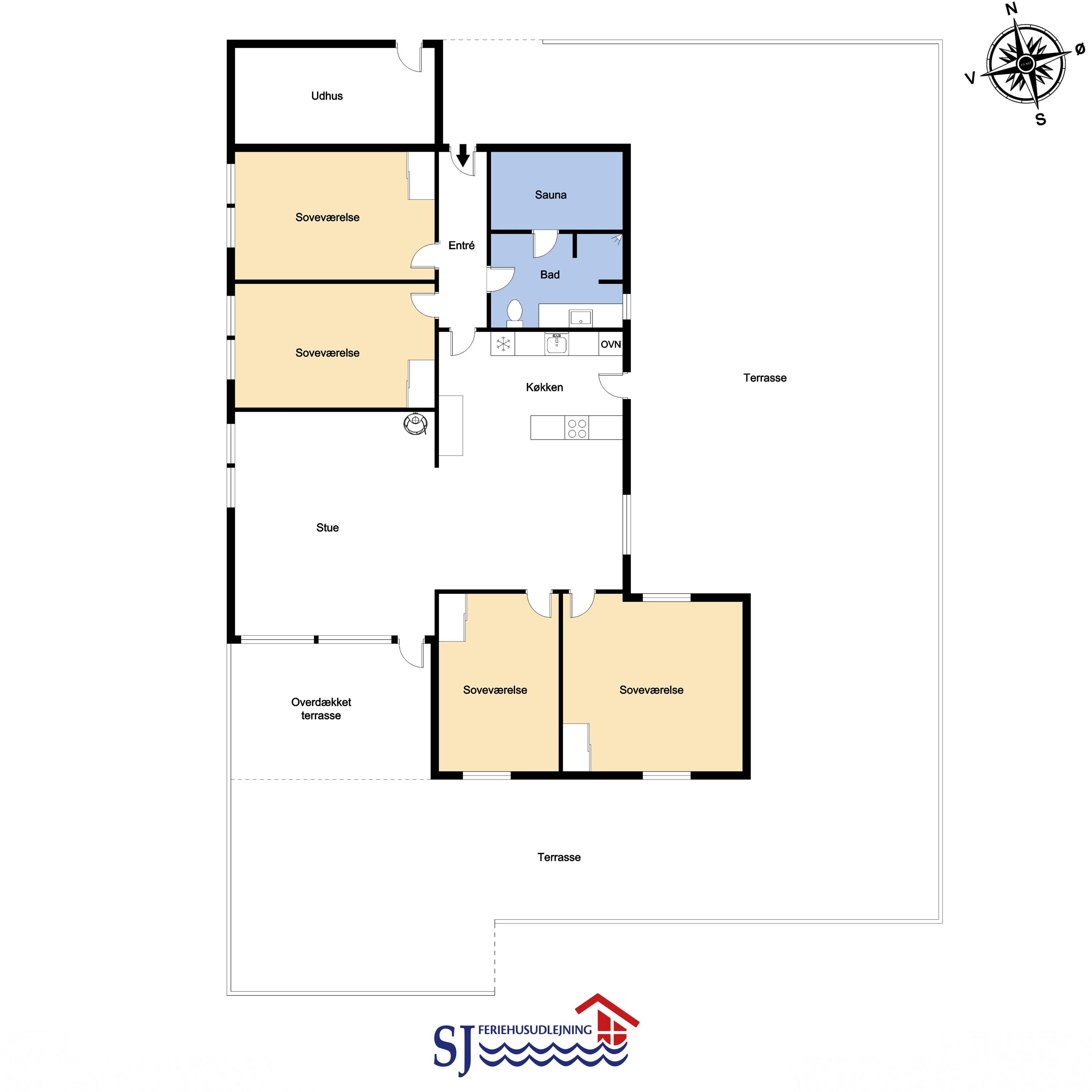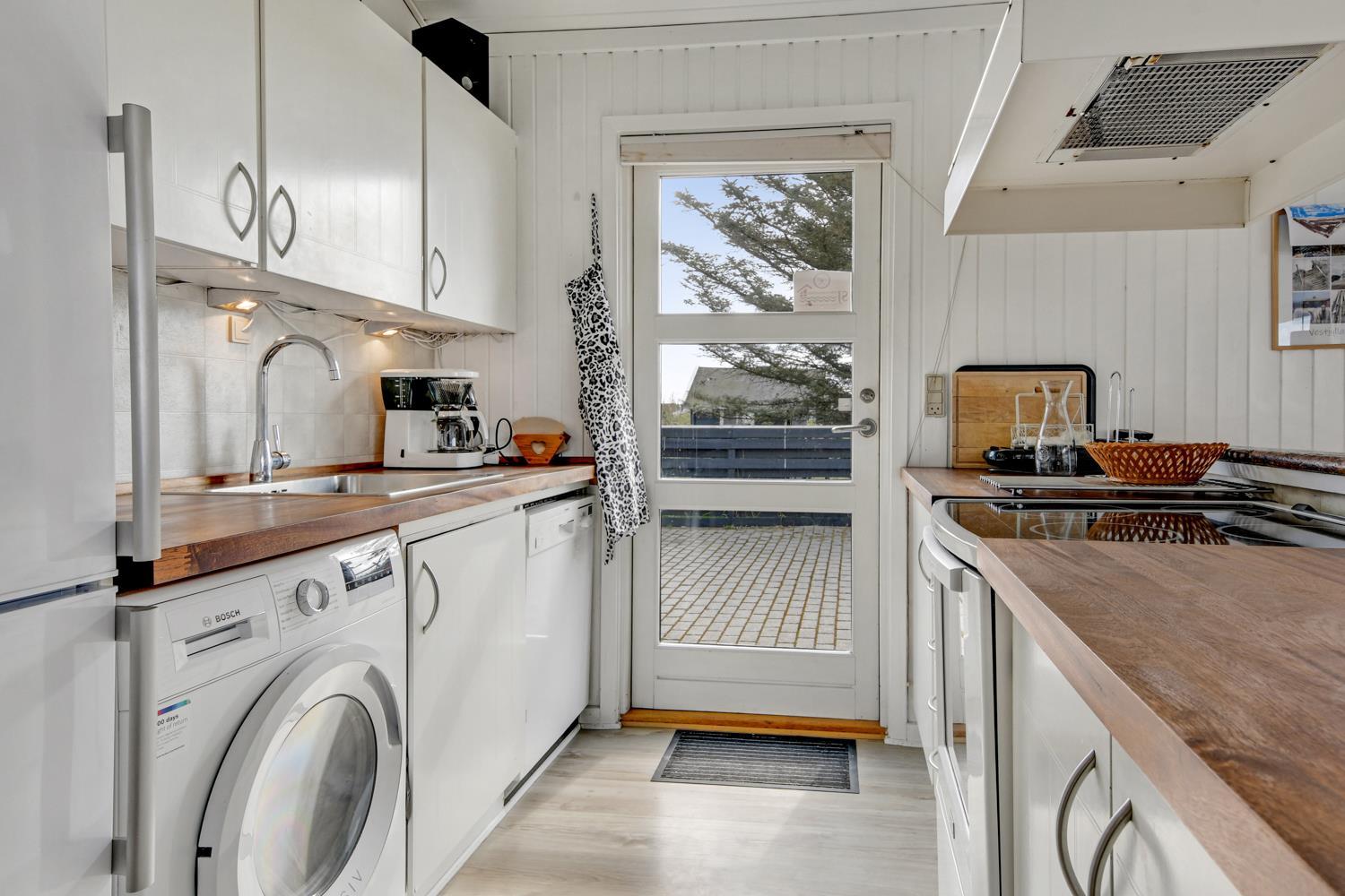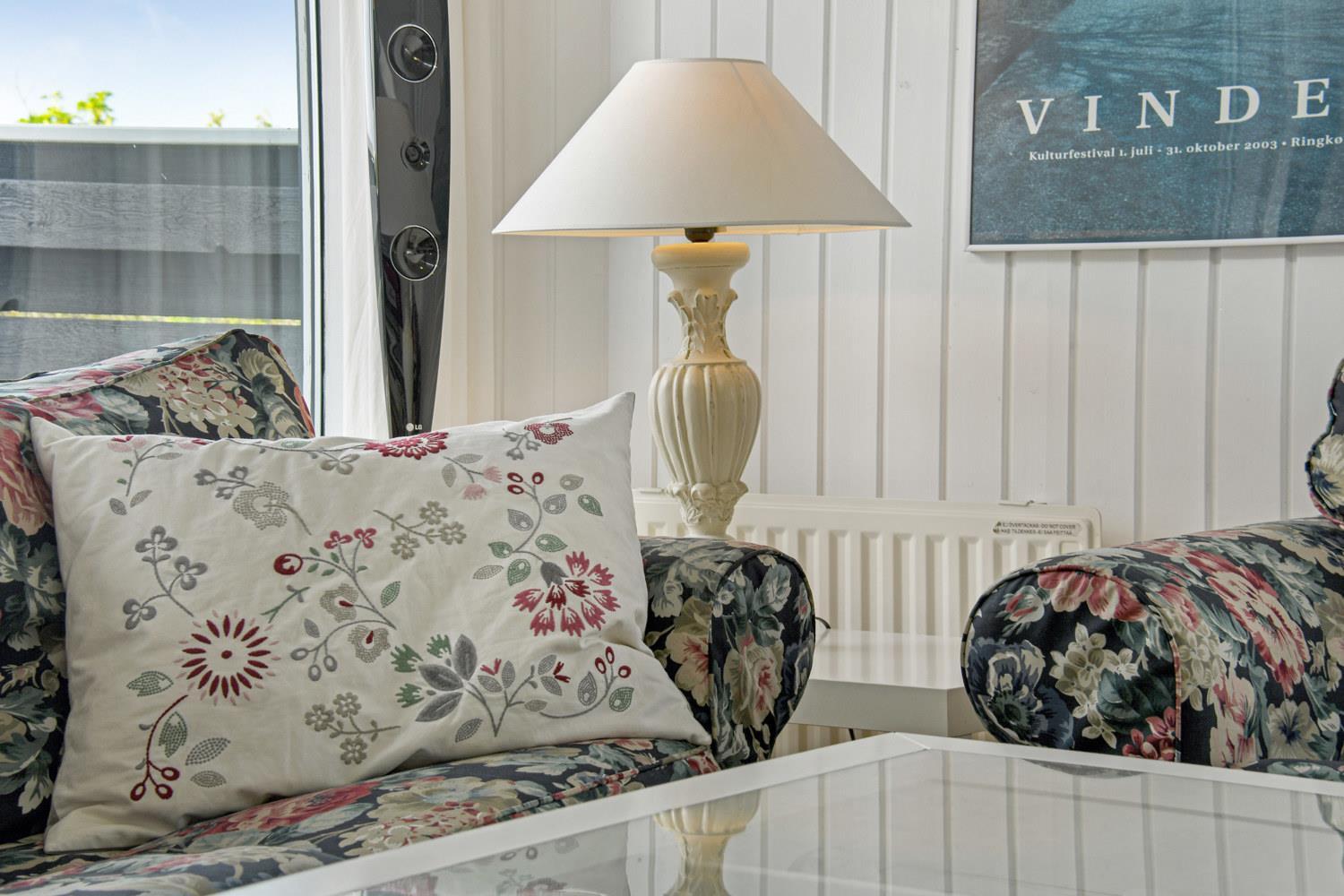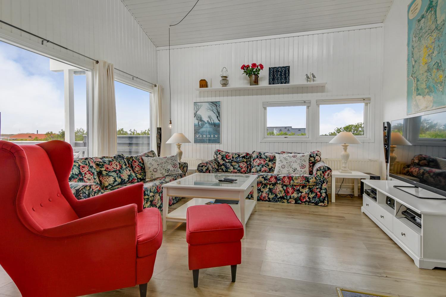 Dette flotte arkitekttegnede feriehus ligger på en naturgrund kun 300 m fra Vesterhavet og 200 m fra cafeteria (åben i sæsonen). Afstanden til Ferring Sø er kun 600 m. Huset er renoveret i 2009 og fremstår lyst og venligt med store vinduer og terrassepartier. Stuen er indrettet med moderne og komfortable møbler, CD, DVD, radio, TV med danske og tyske kanaler. 4 rummelige soveværelser: 1DS + 1DS + 1DS + 1DS. Badeværelse: Toilet, håndvask og bruser, sauna og gulvvarme. Godt indrettet køkken som ligger i forbindelse med stuen. Køkkenet indeholder Glaskeramisk komfur, køleskab, og opvaskemaskine. i udhuset står der en 120 l fryser. Til de små er der højstol. Vaskemaskine. Husdyr er ikke tilladt. Ikke rygerhus.
