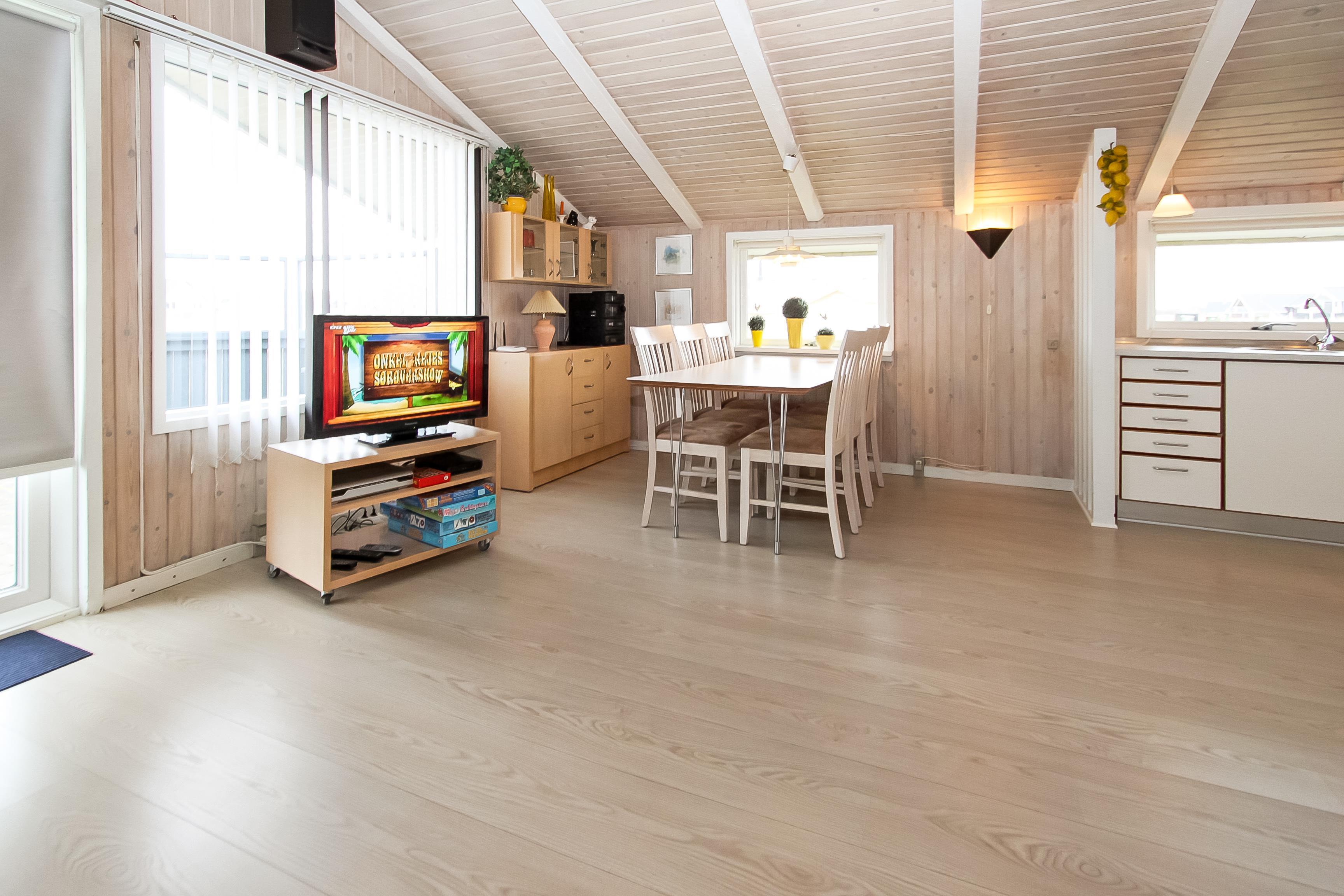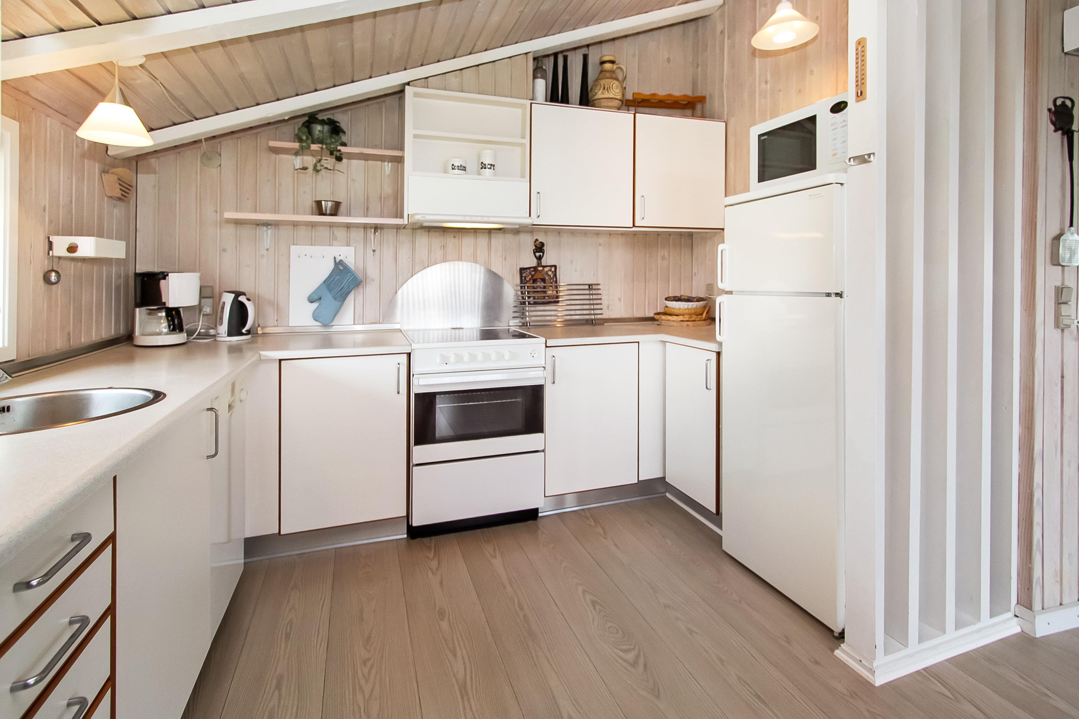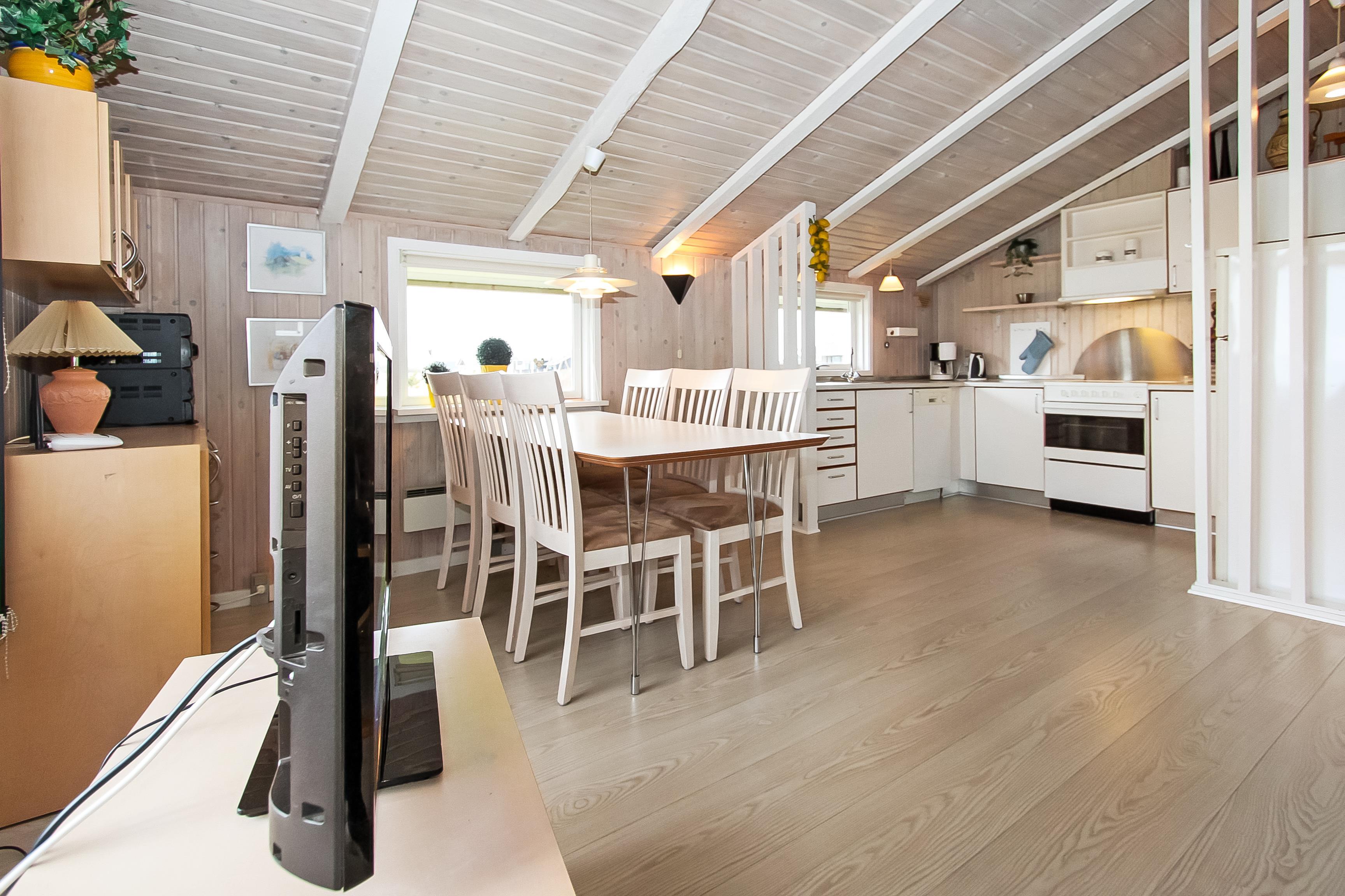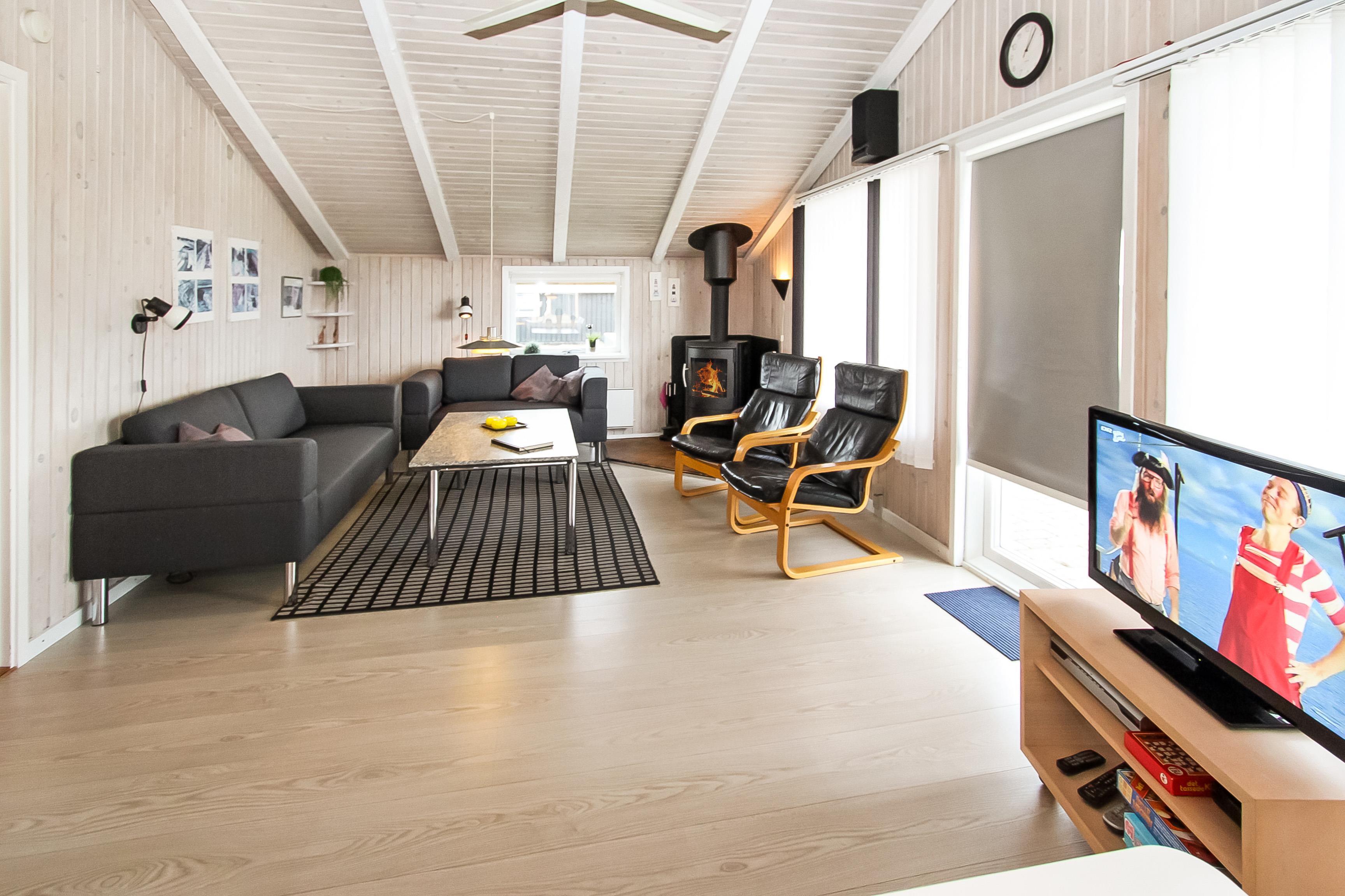 Huset er lyst og indbydende med trægulv i det kombinerede køkken og stue. Køkkenet har glaskeramisk komfur, mikrobølgeovn, køle-fryseskab med en separat fryser på 30 liter samt opvaskemaskine. Stuen har sofagruppe med sofabord samt spisebord. Hyggen og varmen kan sikres med brændeovnen og underholdningen kan klares med fladskærmen hvor man kan se DR1, tyske tv-kanaler eller bruge DVD-afspilleren. Der er desuden også et stereoanlæg med CD hvis man har brug for baggrundsmusik, mens man sidder og hygger eller spiser.