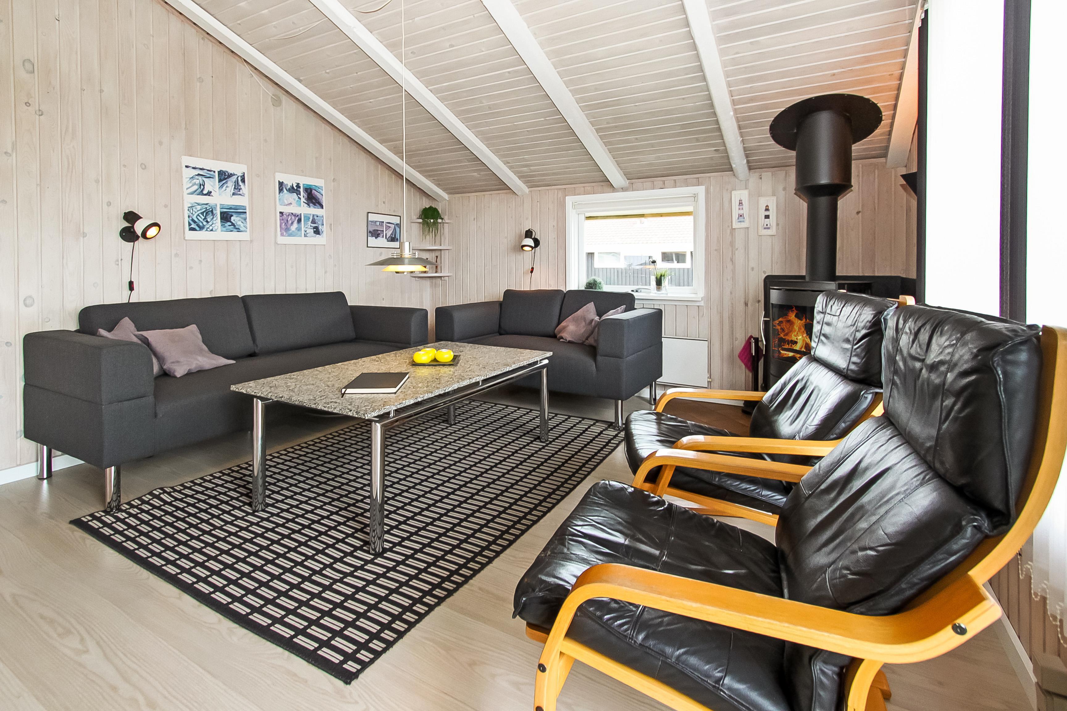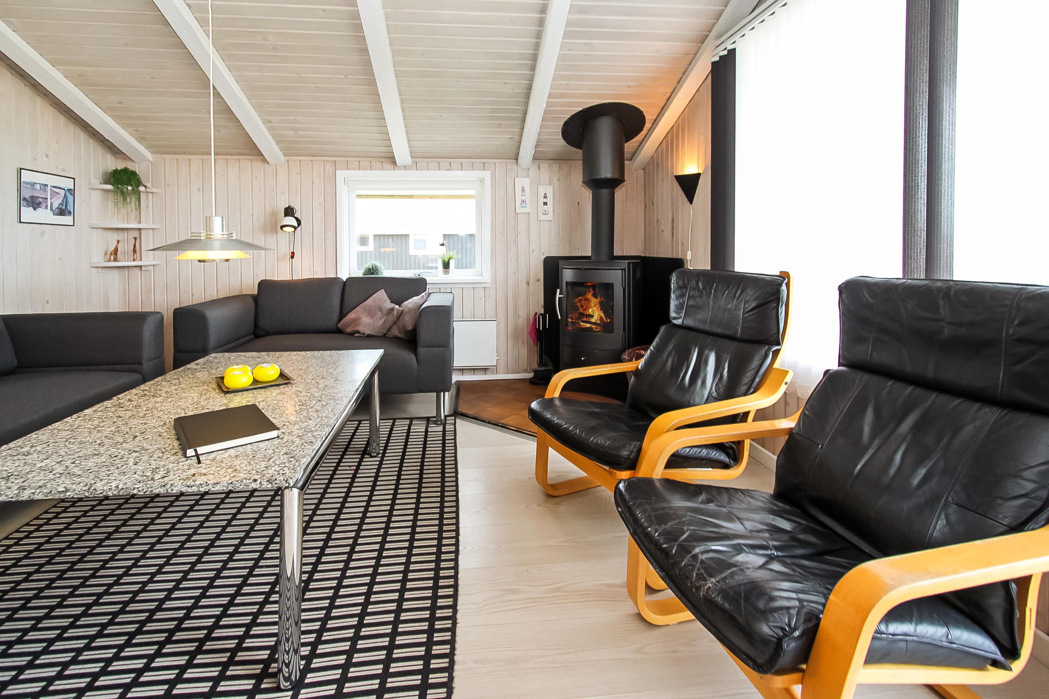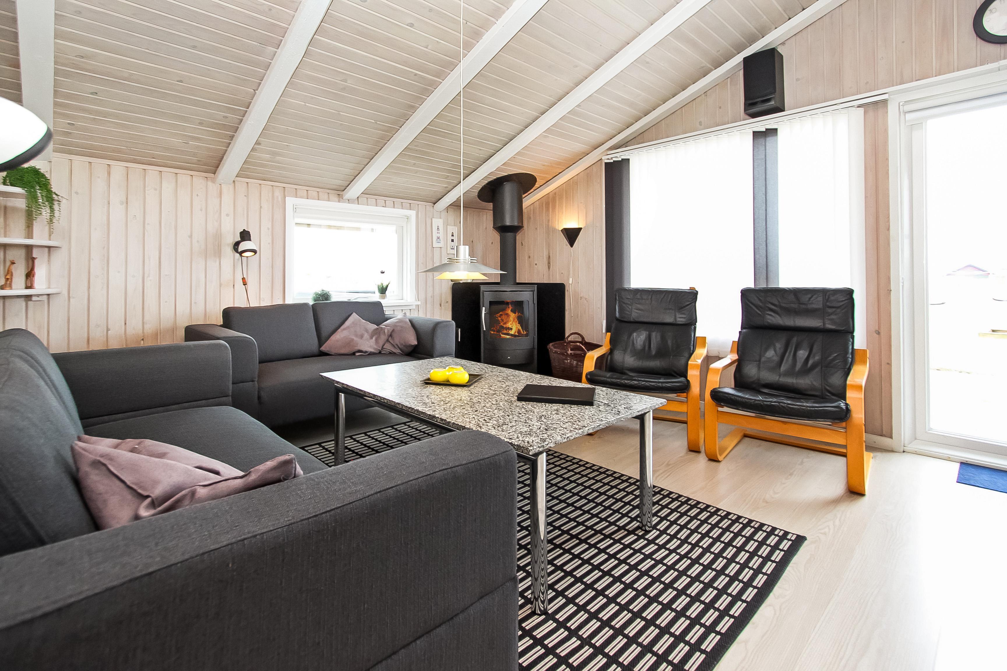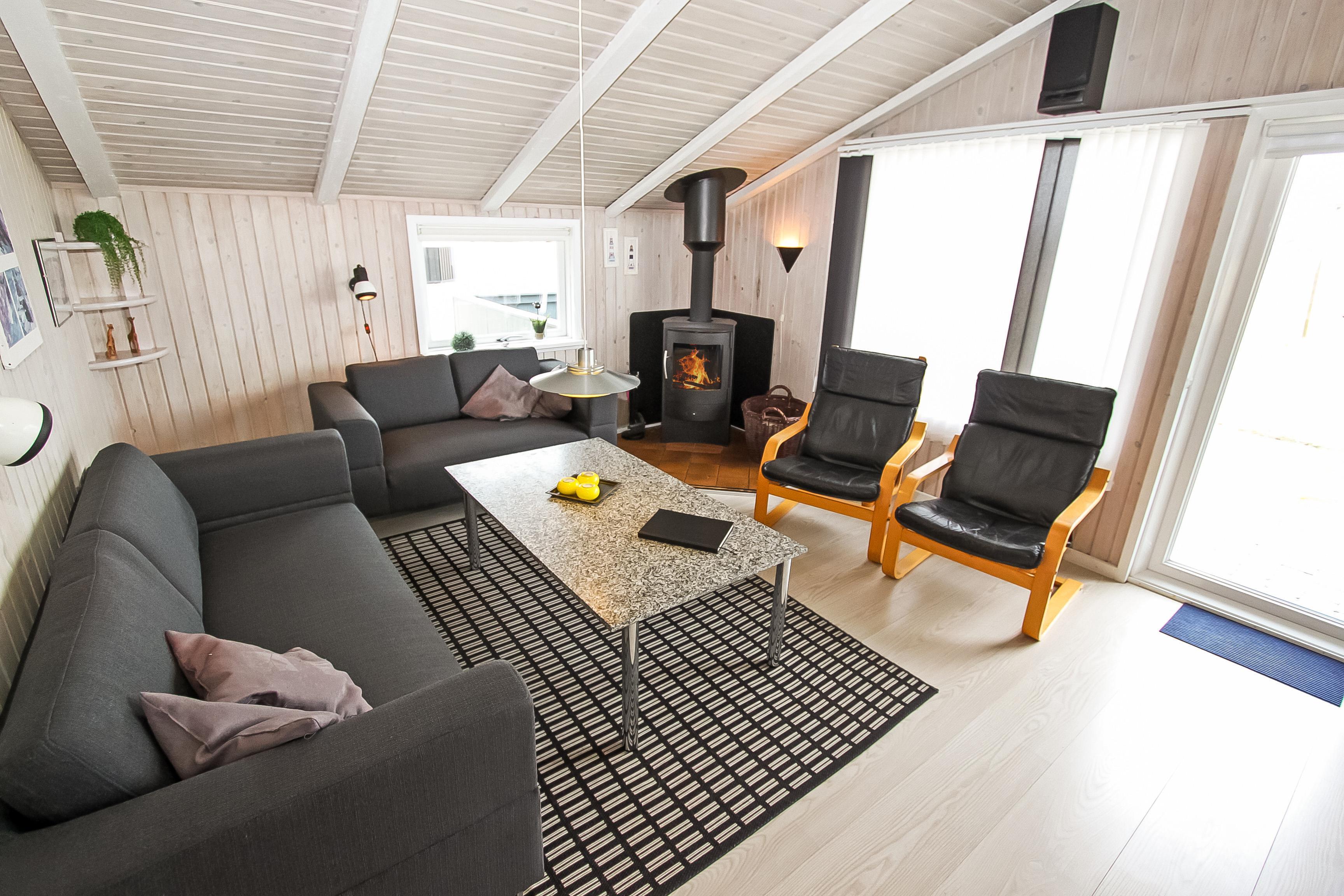 Huset er lyst og indbydende med trægulv i det kombinerede køkken og stue. Køkkenet har glaskeramisk komfur, mikrobølgeovn, køle-fryseskab med en separat fryser på 30 liter samt opvaskemaskine. Stuen har sofagruppe med sofabord samt spisebord. Hyggen og varmen kan sikres med brændeovnen og underholdningen kan klares med fladskærmen hvor man kan se DR1, tyske tv-kanaler eller bruge DVD-afspilleren. Der er desuden også et stereoanlæg med CD hvis man har brug for baggrundsmusik, mens man sidder og hygger eller spiser.