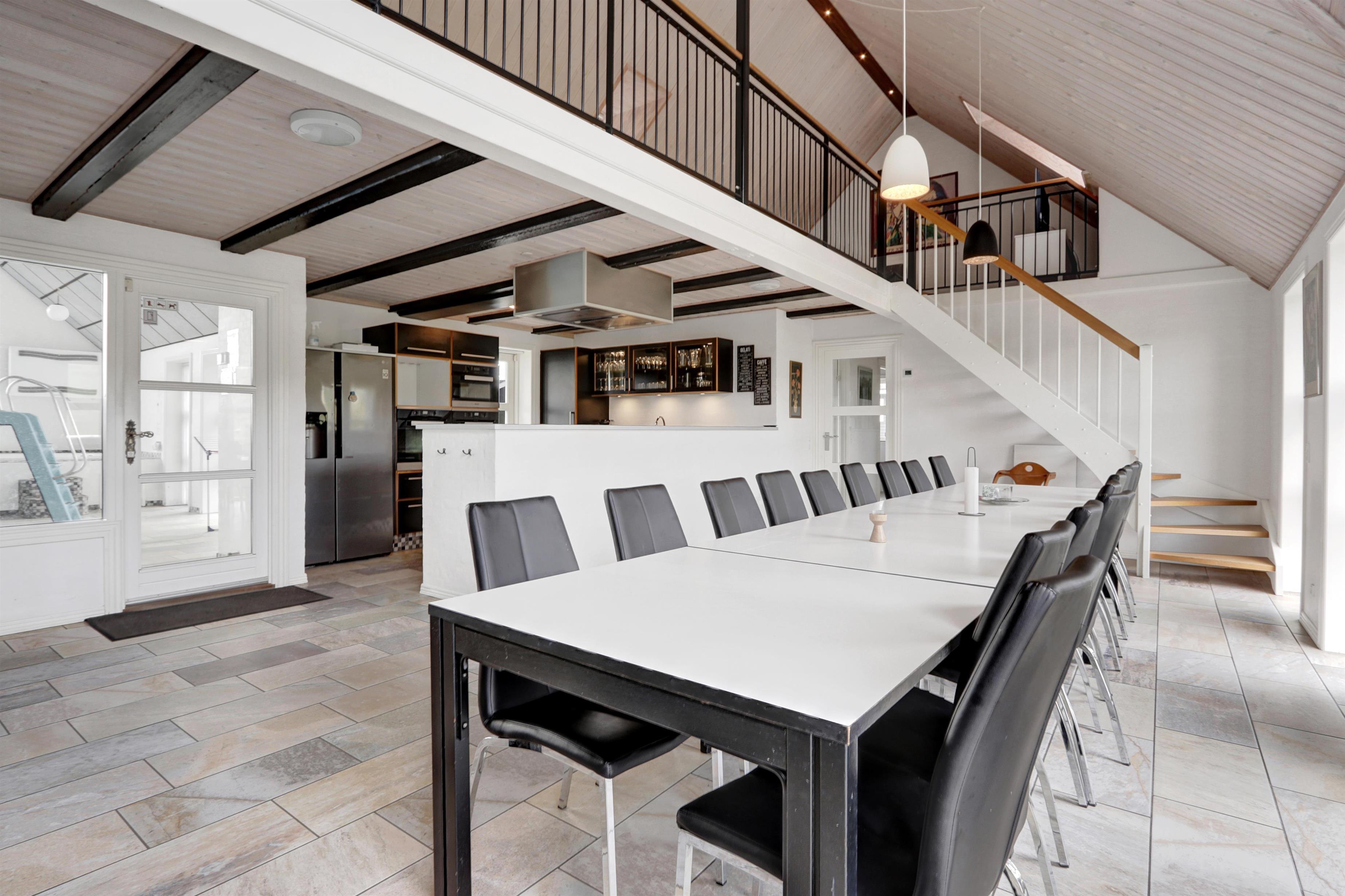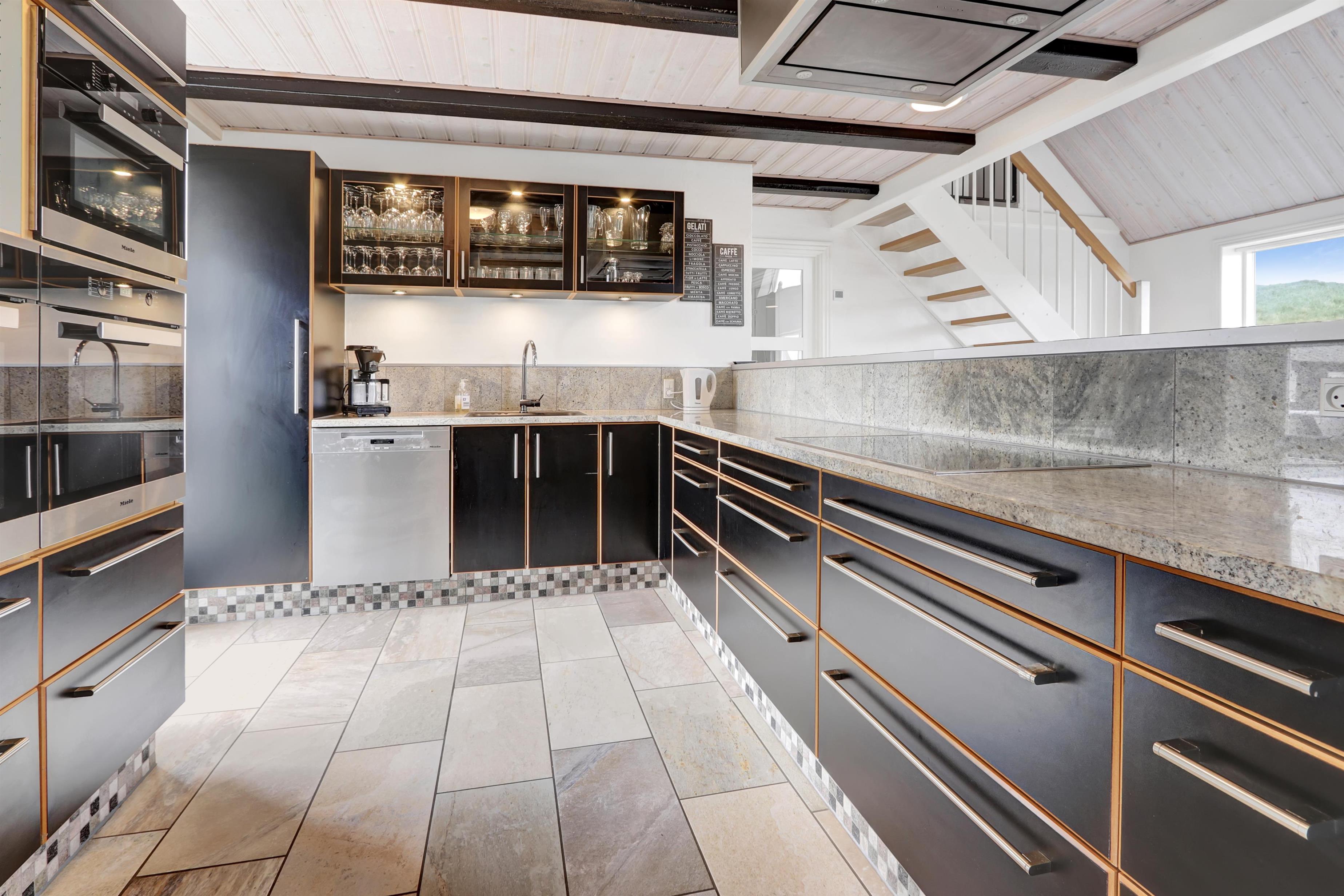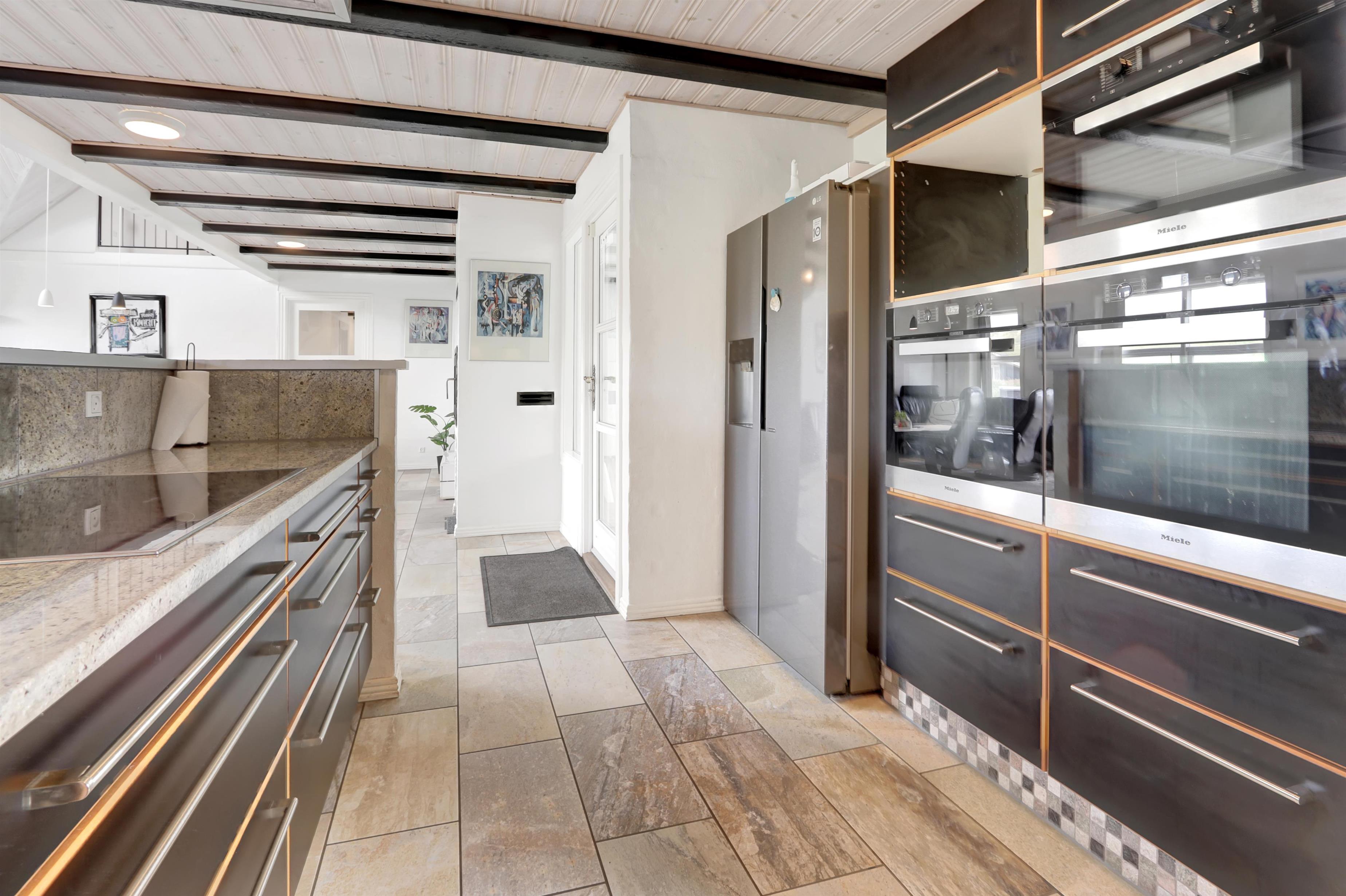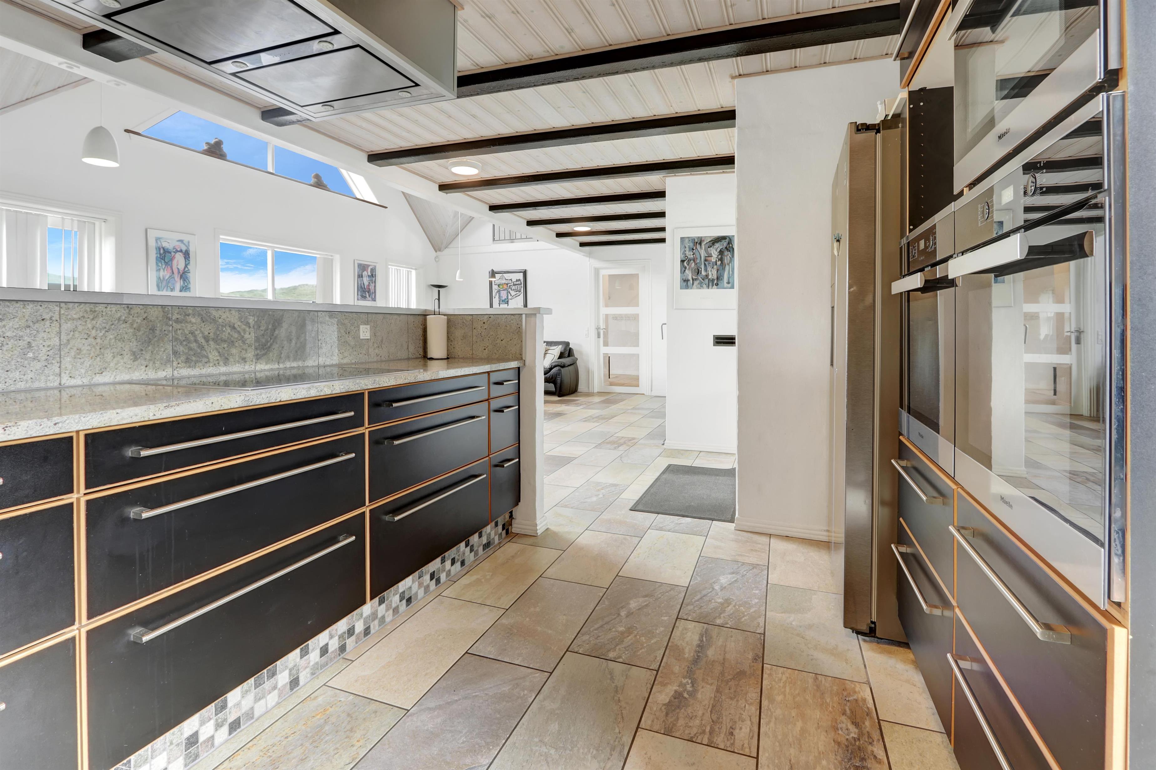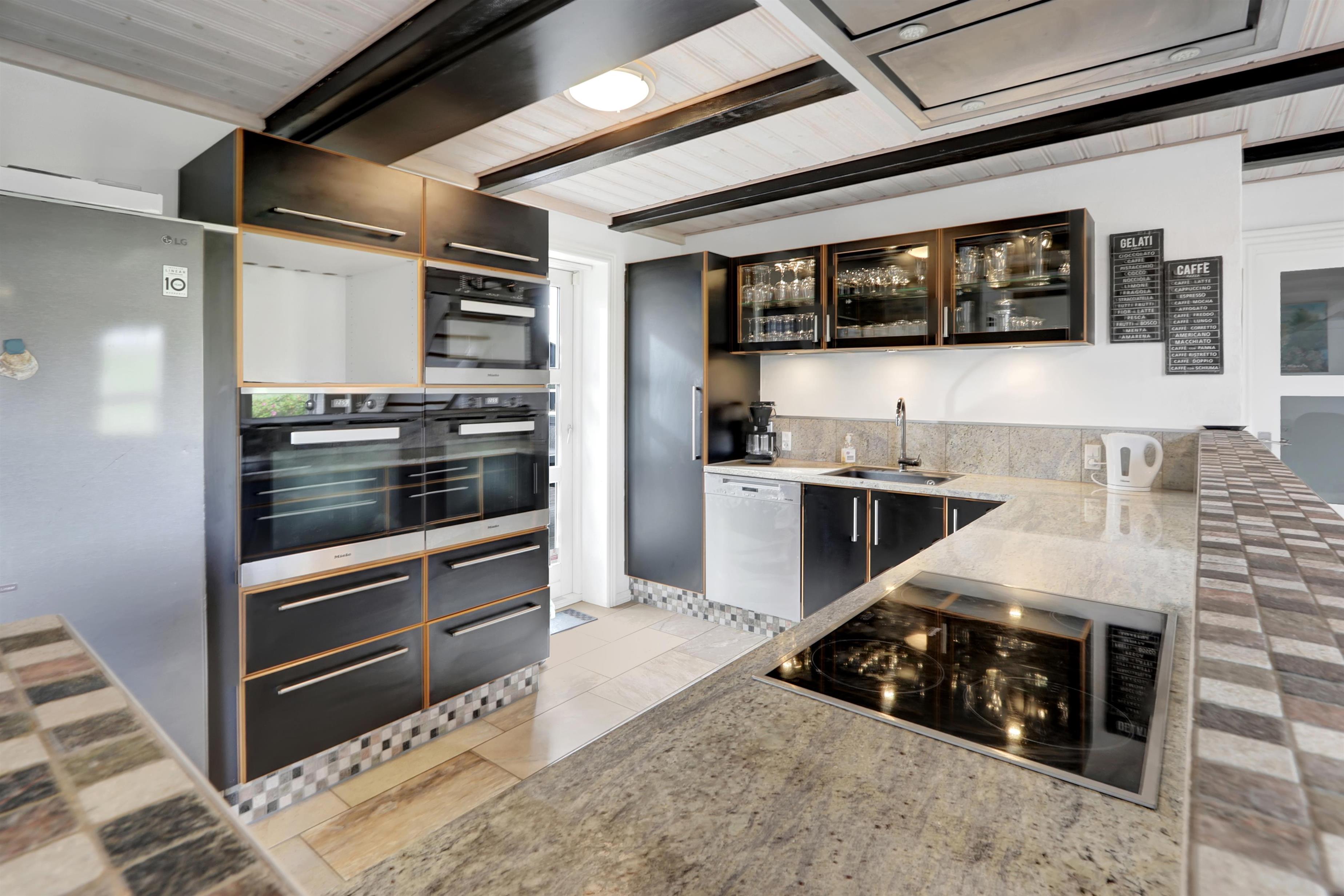 Husets hjerte er det imponerende og lyse køkken-alrum, indrettet med alt hvad hjertet kan begære: hele tre indbyggede ovne, fem kogefelter, stor emhætte, mikroovn, opvaskemaskine samt et stort amerikansk køle-/fryseskab med isterningemaskine. Her er rigeligt med service, plads og komfort til fælles madlavning og hyggelige middage omkring langbordet.