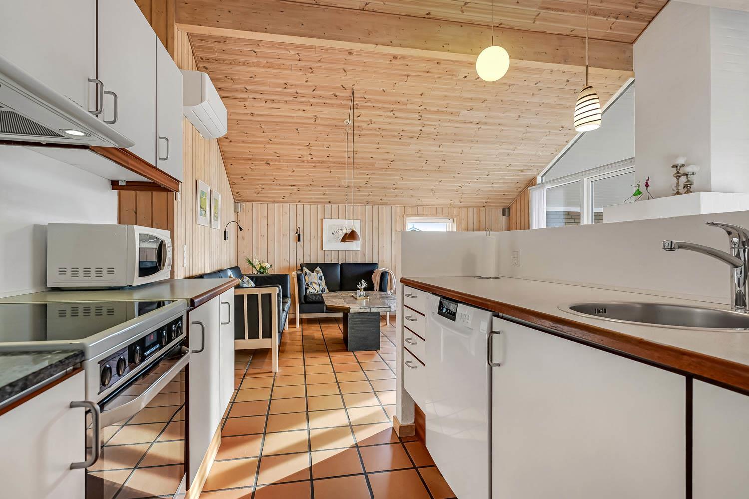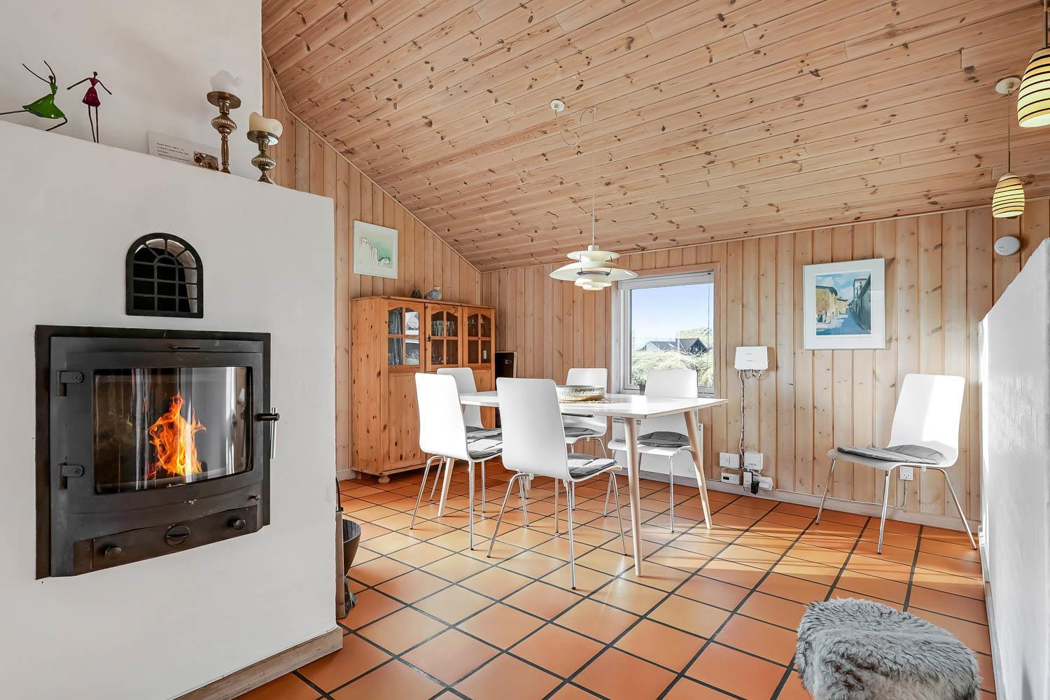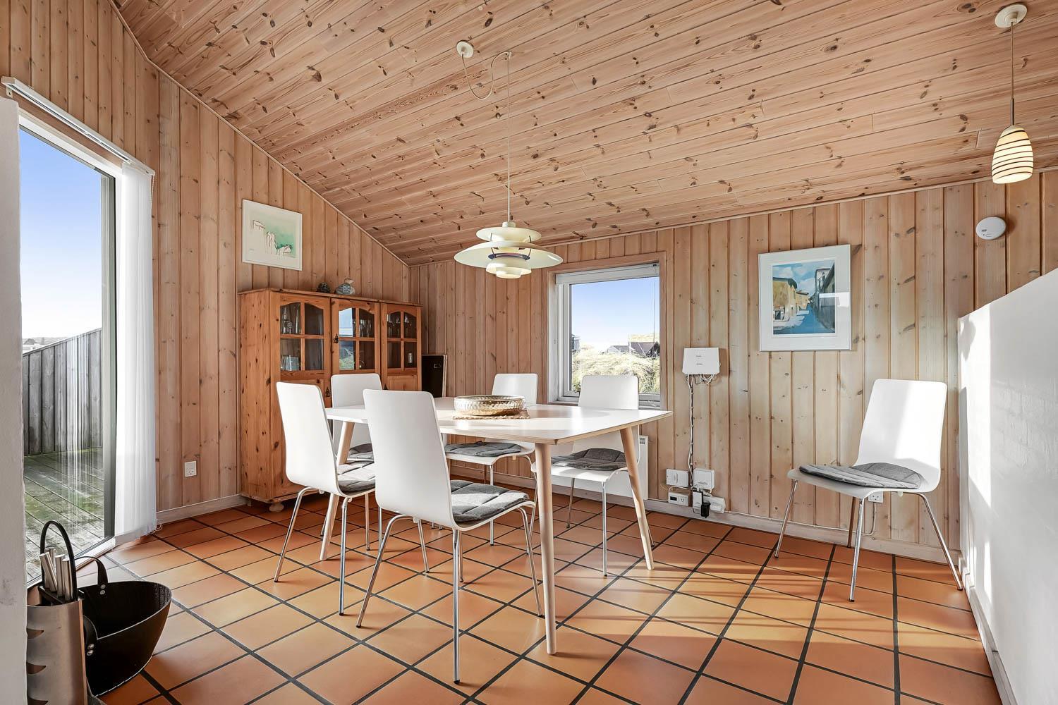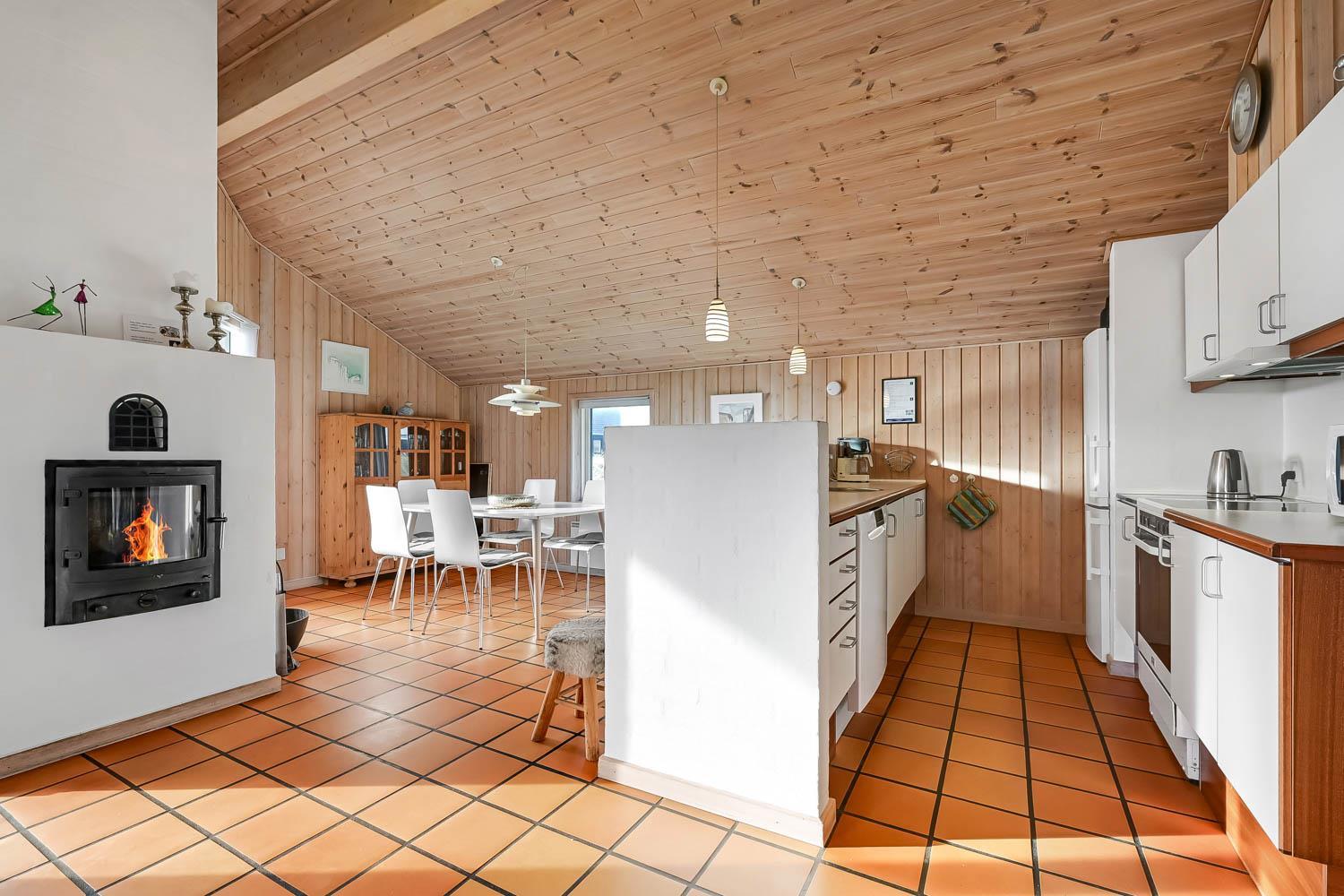 Dejlig indgangsparti hvor der er god plads til at hænge overtøjet, her er vaskemaskinen også placeret. Fra gangen kommer man ind i selve huset hvor der er en kombineret stue og køkke, hvor loftet er åbent op til kip og de store vinduespartier ud mod terrassen giver en dejlig lysindfald i rummet. Køkkenet er indrettet glaskeramisk komfur, emhætte, køle-fryseskab, opvaskemaskine og klinkegulv med gulvvarme. Stuen er indrettet med gode lædermøbler, TV med kabeltv samt en chromecast som gør det muligt at streame egne programmer som man har abonnement til. Der er også klinkegulv i stuen med gulvvarme. I den side af stuen hvor køkkenet grænser op til er spisebordet placeret. Der er en skøn brændeovn som sammen med varmepumpen giver en behagelig varme uanset årstid og er medvirkende til en lavere forbrugsafregning. Huset er indrettet med 3 soverum: 2S + 1DS + 1DS og fra gangen er der en stige op til en hems med 2 liggemuligheder. Soverummene er indrettet med trægulve. Huset råder over 2 badeværelser. Det store badeværelse er med toilet, håndvask, bruser, sauna og spabad og gulvvarme. Det andet badeværelse er med toilet, håndvask, bruser samt klinkegulv med gulvvarme. Som noget extra har huset et lille grovkøkkent med vaskemaskine og håndvask. Ikke rygerhus. 2 hunde er tilladt. Ved leje af dette hus har man gratis adgang til Harboøre Centeret: Harboøre-Centeret.