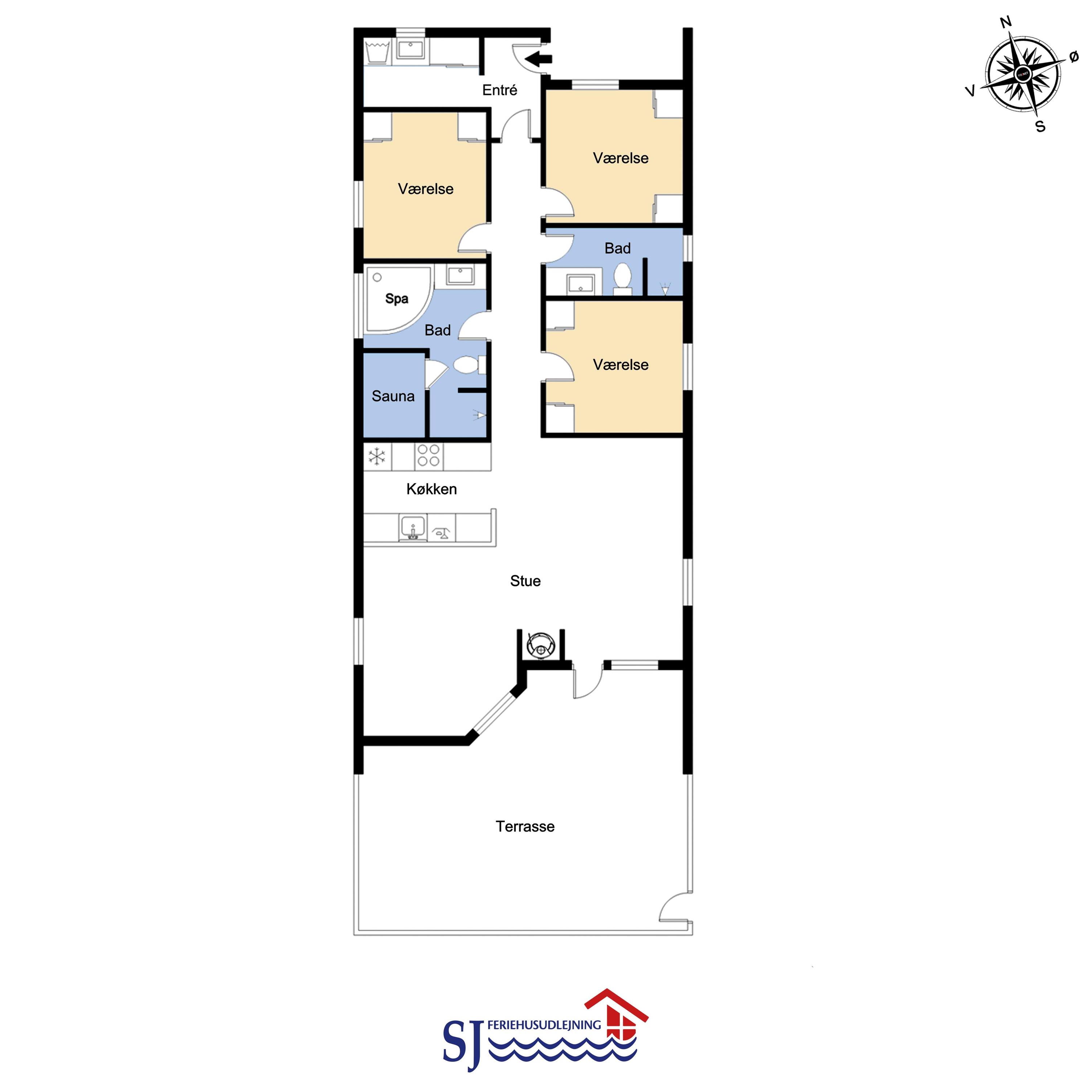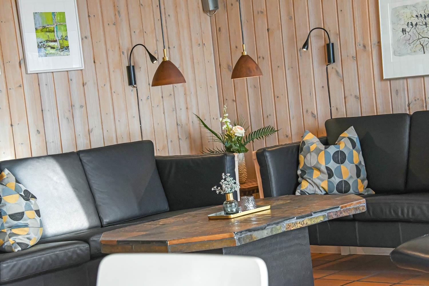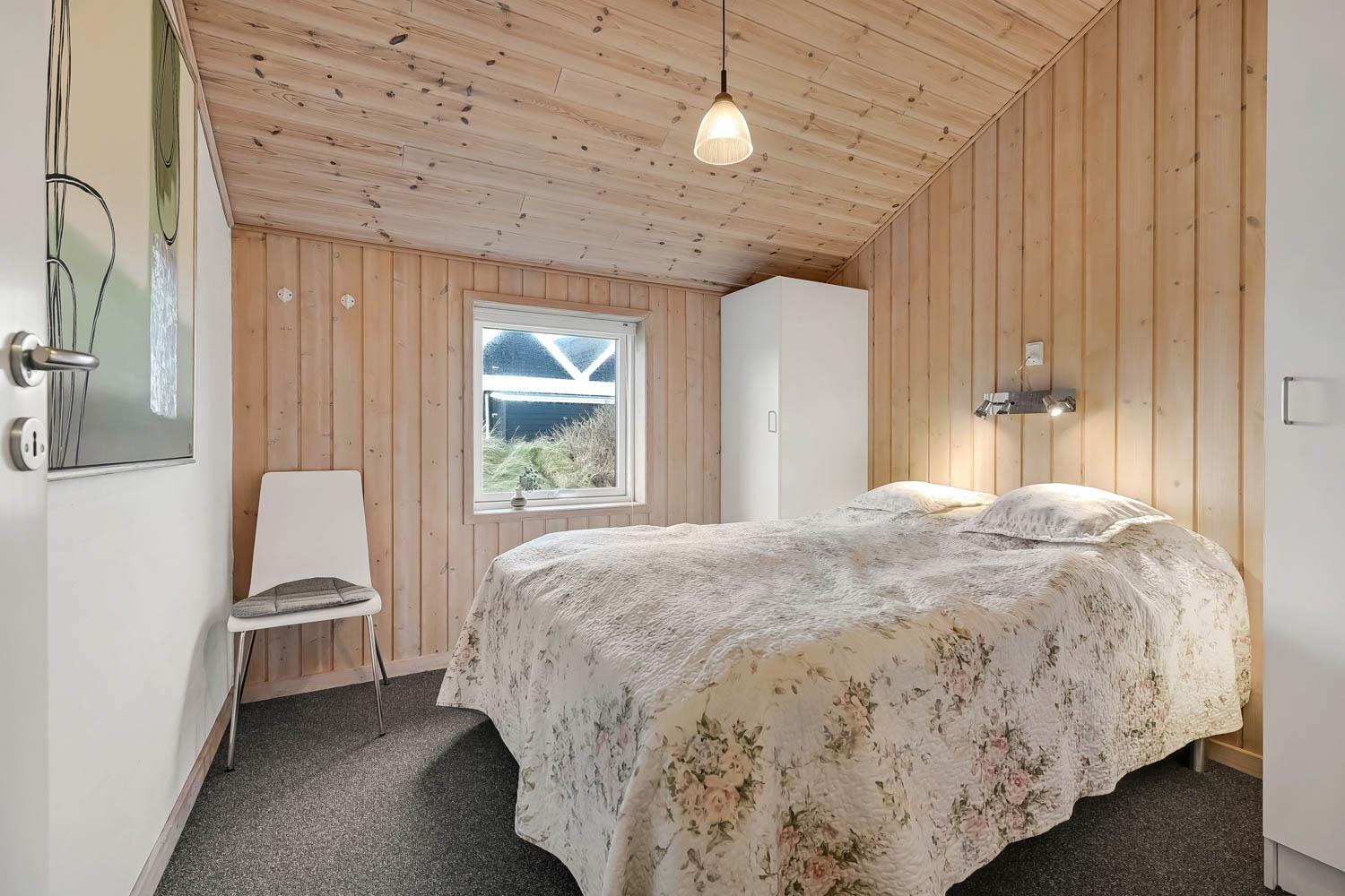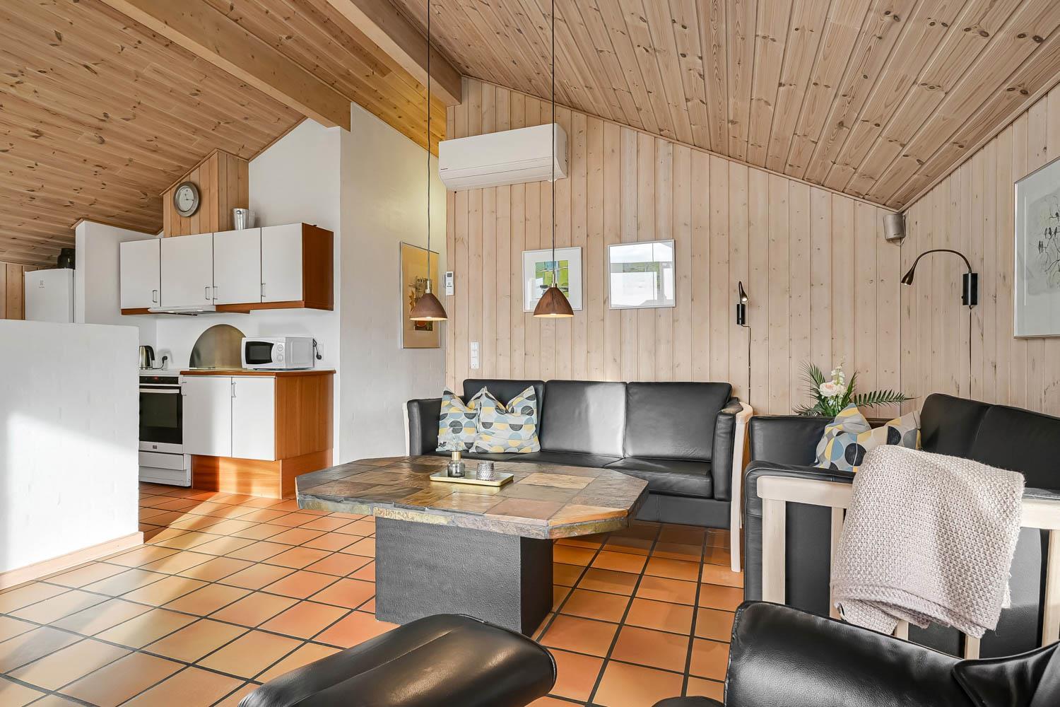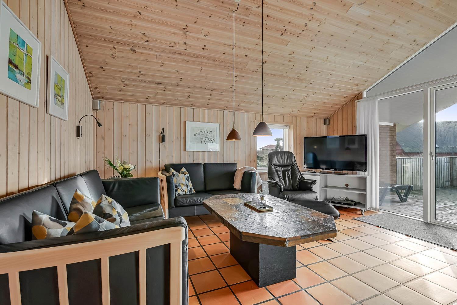 Dejlig indgangsparti hvor der er god plads til at hænge overtøjet, her er vaskemaskinen også placeret. Fra gangen kommer man ind i selve huset hvor der er en kombineret stue og køkke, hvor loftet er åbent op til kip og de store vinduespartier ud mod terrassen giver en dejlig lysindfald i rummet. Køkkenet er indrettet glaskeramisk komfur, emhætte, køle-fryseskab, opvaskemaskine og klinkegulv med gulvvarme. Stuen er indrettet med gode lædermøbler, TV med kabeltv samt en chromecast som gør det muligt at streame egne programmer som man har abonnement til. Der er også klinkegulv i stuen med gulvvarme. I den side af stuen hvor køkkenet grænser op til er spisebordet placeret. Der er en skøn brændeovn som sammen med varmepumpen giver en behagelig varme uanset årstid og er medvirkende til en lavere forbrugsafregning. Huset er indrettet med 3 soverum: 2S + 1DS + 1DS og fra gangen er der en stige op til en hems med 2 liggemuligheder. Soverummene er indrettet med trægulve. Huset råder over 2 badeværelser. Det store badeværelse er med toilet, håndvask, bruser, sauna og spabad og gulvvarme. Det andet badeværelse er med toilet, håndvask, bruser samt klinkegulv med gulvvarme. Som noget extra har huset et lille grovkøkkent med vaskemaskine og håndvask. Ikke rygerhus. 2 hunde er tilladt. Ved leje af dette hus har man gratis adgang til Harboøre Centeret: Harboøre-Centeret.