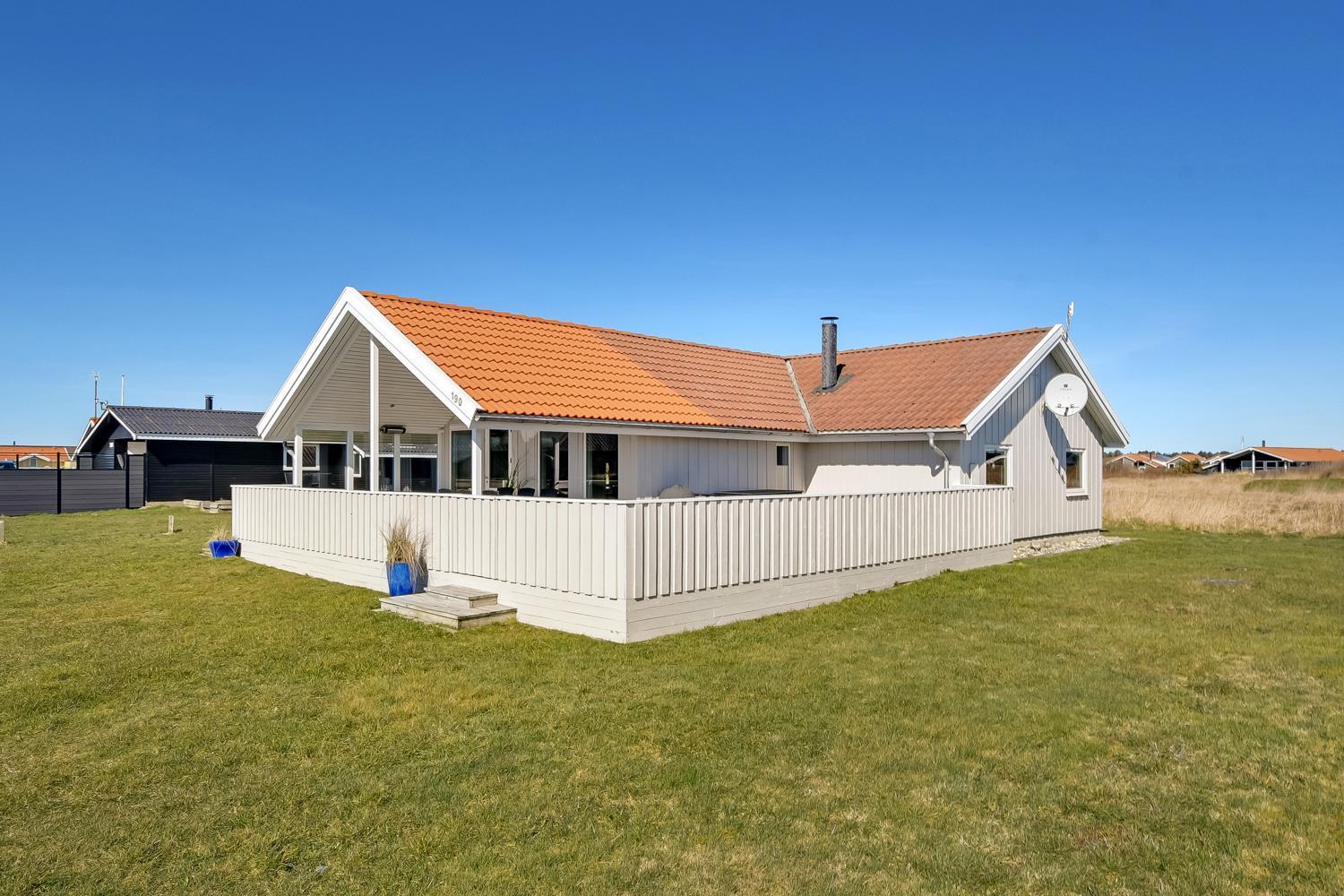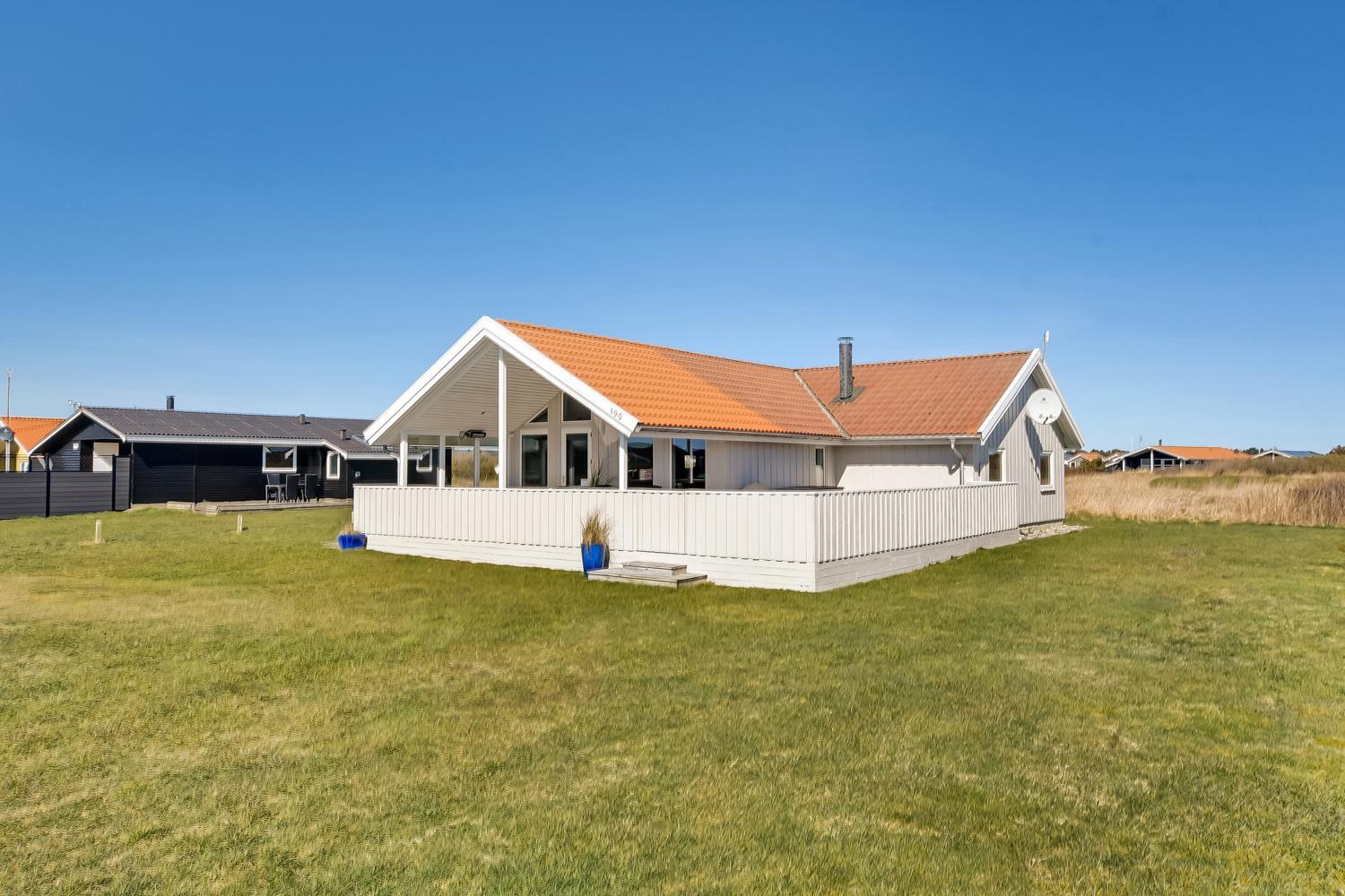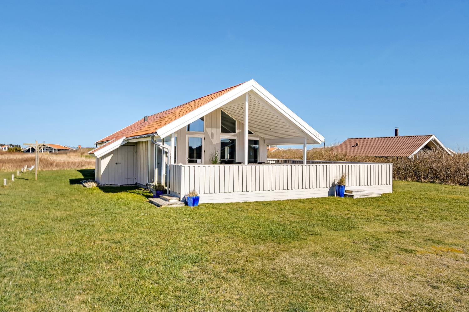 Flot og nyrenoveret og veludstyret feriehus i træ beliggende i et roligt feriehusområde tæt på Vesterhavet og Ferring Sø. Gratis internetadgang.