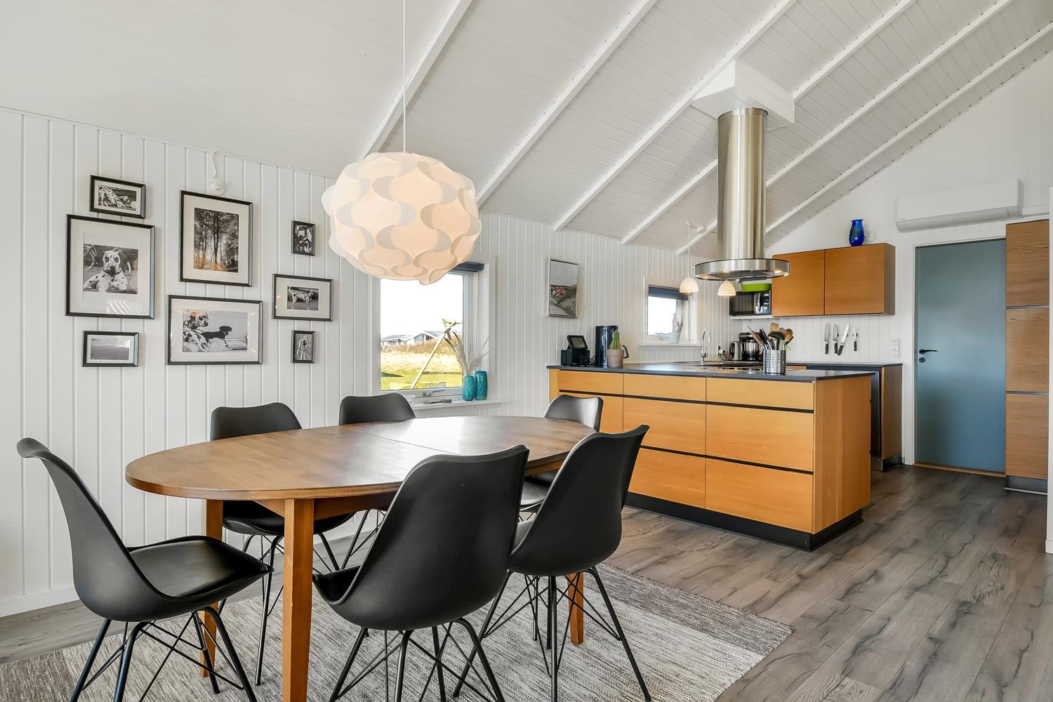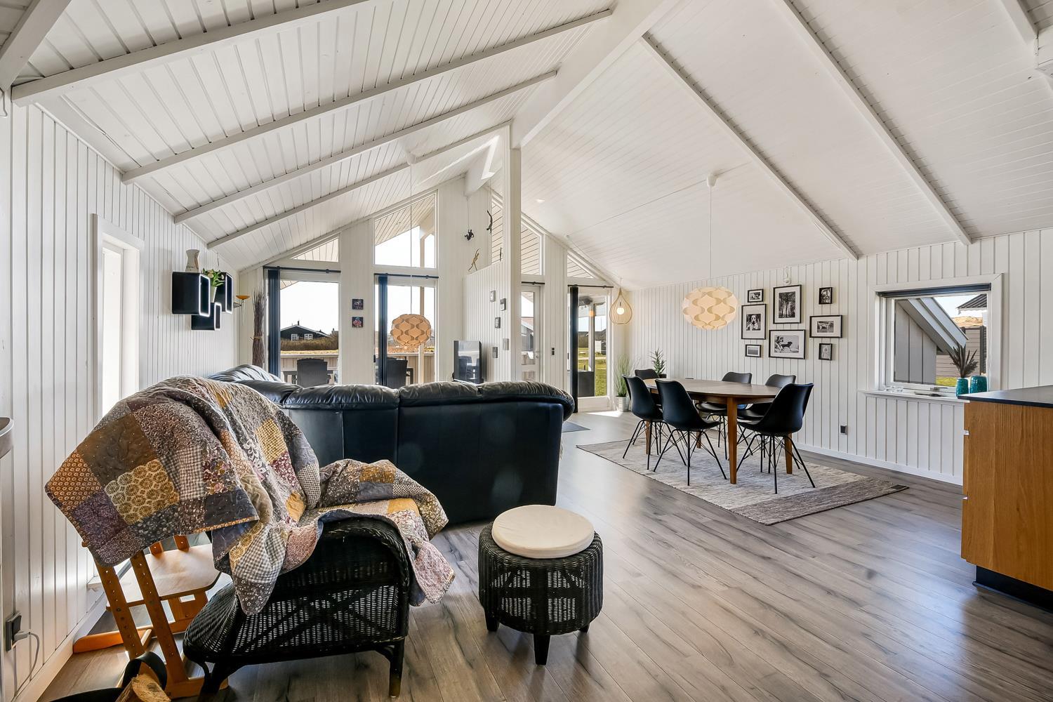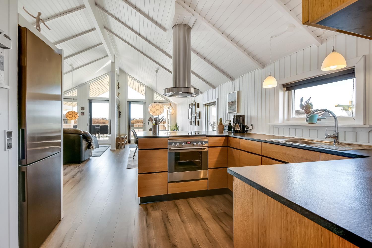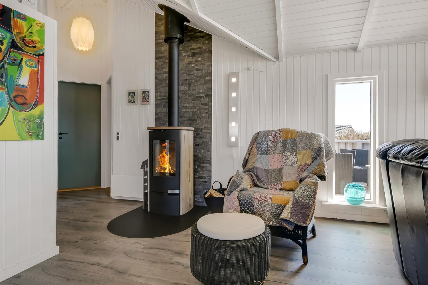 Meget flot, nyrenoveret og velholdt feriehus i træ med kombineret køkken og stue hvor der er åben til kip. Huset er holdt i lyse farver og det store vinduesparti sørger for et godt lysindfald. Stuen er indrettet med gode lædermøbler og spisebord, her er der F-TV med DR-kanaler og tyske kanaler via parabol, radio. Desuden er der en dejlig ny brændeovn og en varmepumpe som begge sørger for en behagelig varme uanset årstid, og er medvirkende til en billigere forbrugsregning. Åbent køkken med elkomfur med keramiske kogeplader, emhætte, køleskab med frostboks, opvaskemaskine. I stue og køkken er der linoleumsgulv. Stort og nyrenoveret badeværelse med toilet, håndvask, bruser og infrarød saunakabine. 3 flotte soverum: 1DS + 1DS + 1DS. Til de mindste gæster er der en barnestol. Der er selvfølgelig også en vaskemaskine og tørretumbler i huset. 2 husdyr er tilladt. Ikke rygerhus.