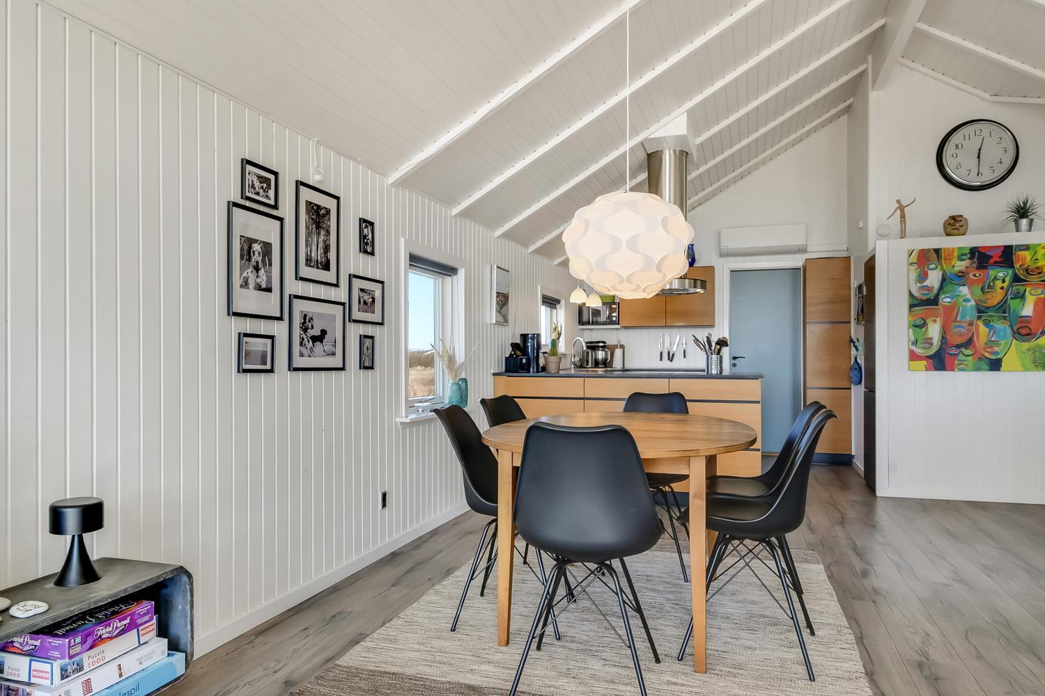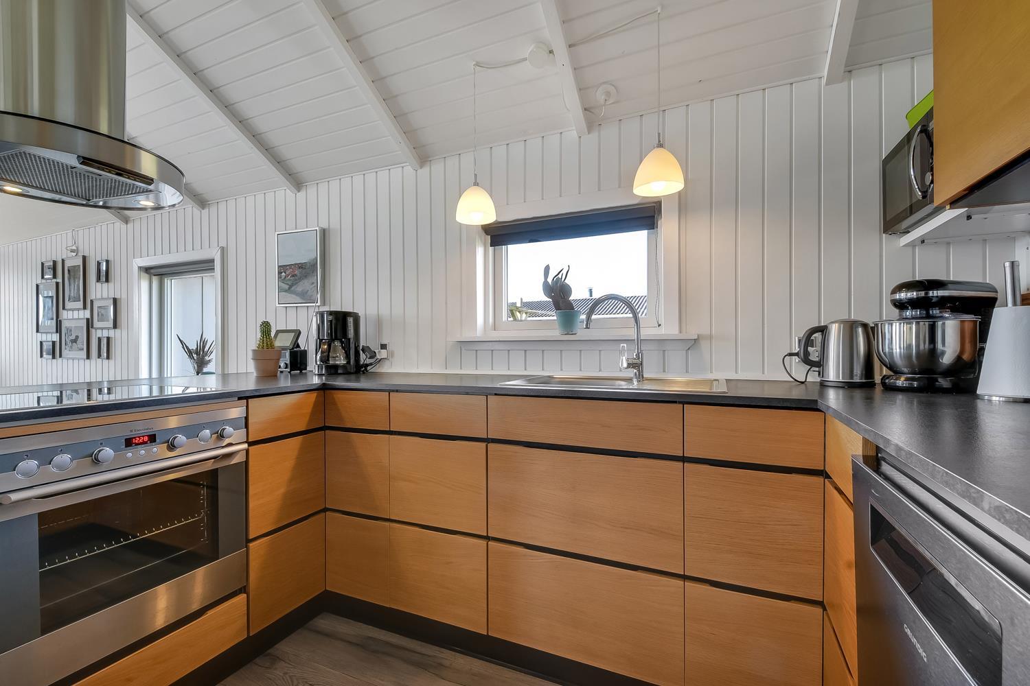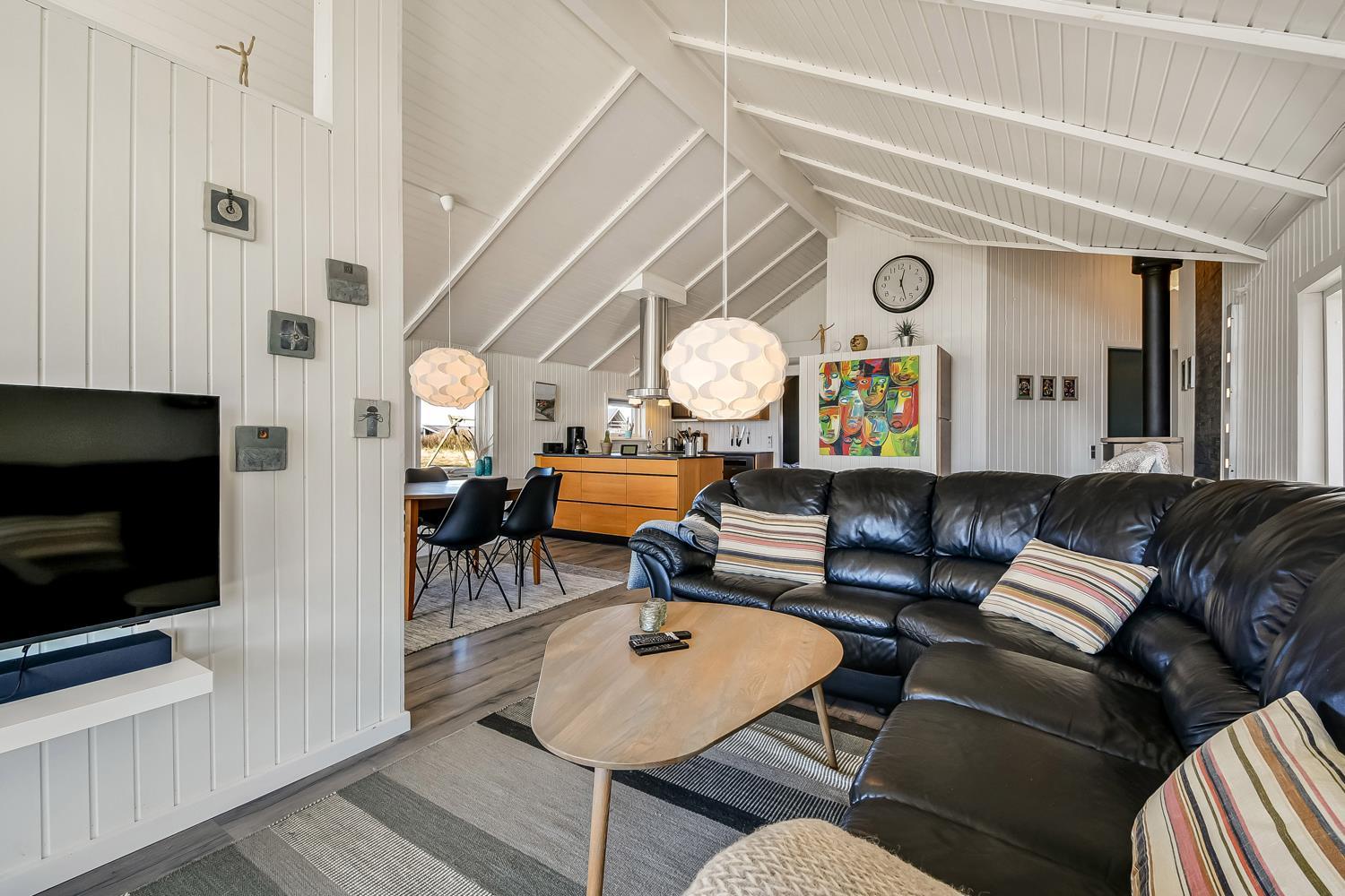 Meget flot, nyrenoveret og velholdt feriehus i træ med kombineret køkken og stue hvor der er åben til kip. Huset er holdt i lyse farver og det store vinduesparti sørger for et godt lysindfald. Stuen er indrettet med gode lædermøbler og spisebord, her er der F-TV med DR-kanaler og tyske kanaler via parabol, radio. Desuden er der en dejlig ny brændeovn og en varmepumpe som begge sørger for en behagelig varme uanset årstid, og er medvirkende til en billigere forbrugsregning. Åbent køkken med elkomfur med keramiske kogeplader, emhætte, køleskab med frostboks, opvaskemaskine. I stue og køkken er der linoleumsgulv. Stort og nyrenoveret badeværelse med toilet, håndvask, bruser og infrarød saunakabine. 3 flotte soverum: 1DS + 1DS + 1DS. Til de mindste gæster er der en barnestol. Der er selvfølgelig også en vaskemaskine og tørretumbler i huset. 2 husdyr er tilladt. Ikke rygerhus.