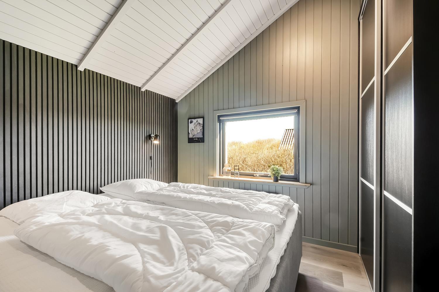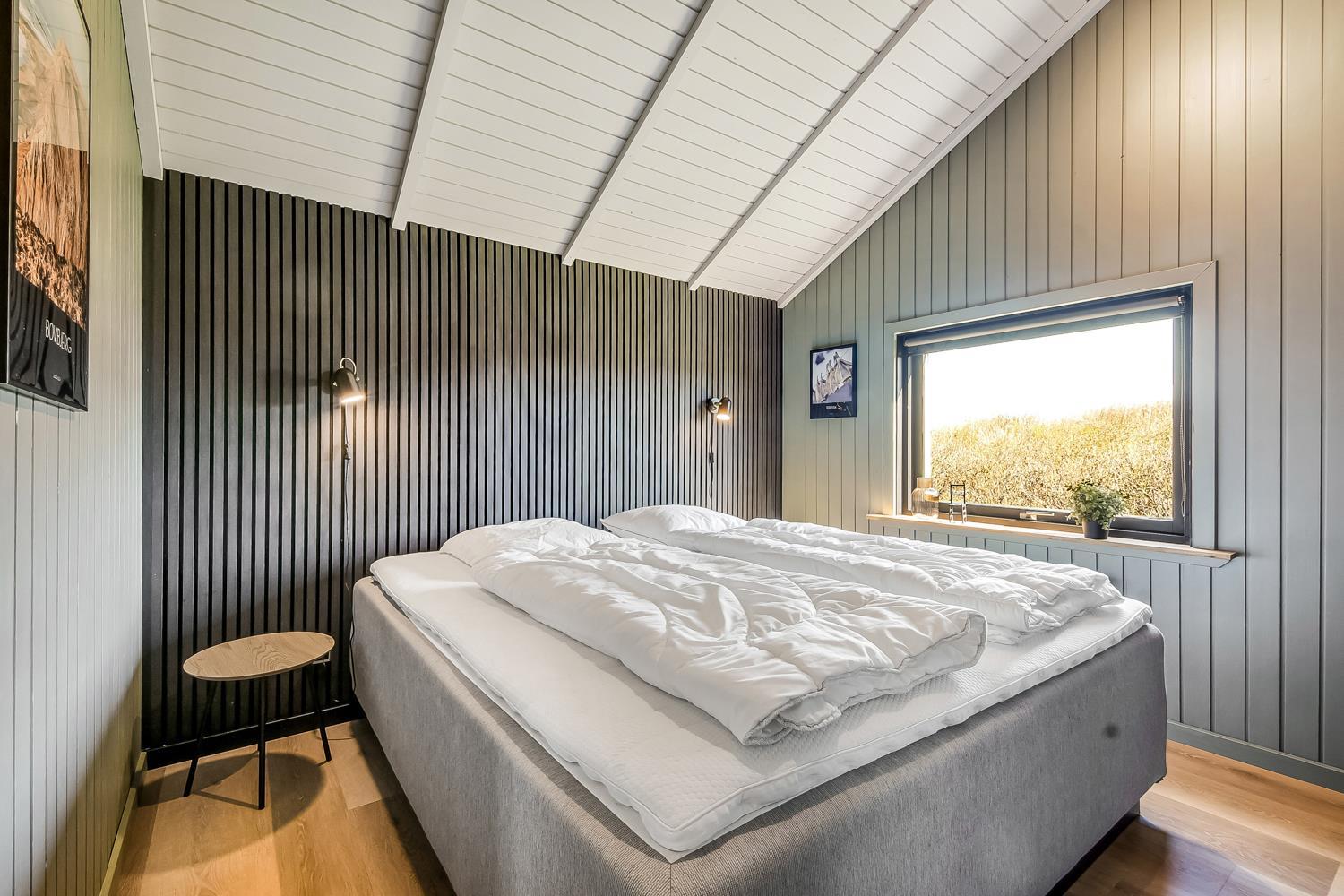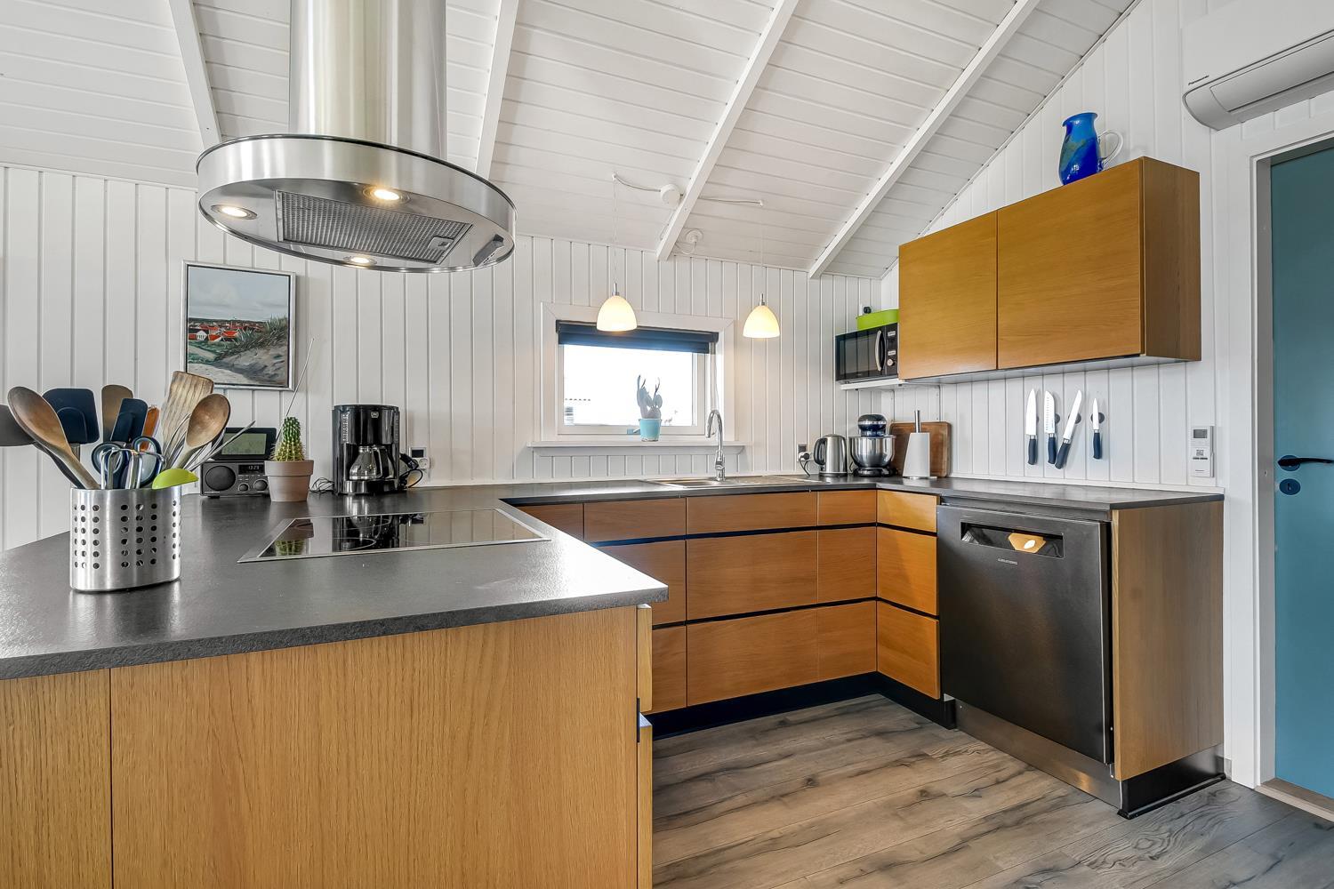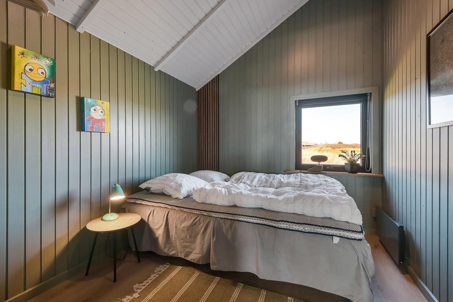 Meget flot, nyrenoveret og velholdt feriehus i træ med kombineret køkken og stue hvor der er åben til kip. Huset er holdt i lyse farver og det store vinduesparti sørger for et godt lysindfald. Stuen er indrettet med gode lædermøbler og spisebord, her er der F-TV med DR-kanaler og tyske kanaler via parabol, radio. Desuden er der en dejlig ny brændeovn og en varmepumpe som begge sørger for en behagelig varme uanset årstid, og er medvirkende til en billigere forbrugsregning. Åbent køkken med elkomfur med keramiske kogeplader, emhætte, køleskab med frostboks, opvaskemaskine. I stue og køkken er der linoleumsgulv. Stort og nyrenoveret badeværelse med toilet, håndvask, bruser og infrarød saunakabine. 3 flotte soverum: 1DS + 1DS + 1DS. Til de mindste gæster er der en barnestol. Der er selvfølgelig også en vaskemaskine og tørretumbler i huset. 2 husdyr er tilladt. Ikke rygerhus.