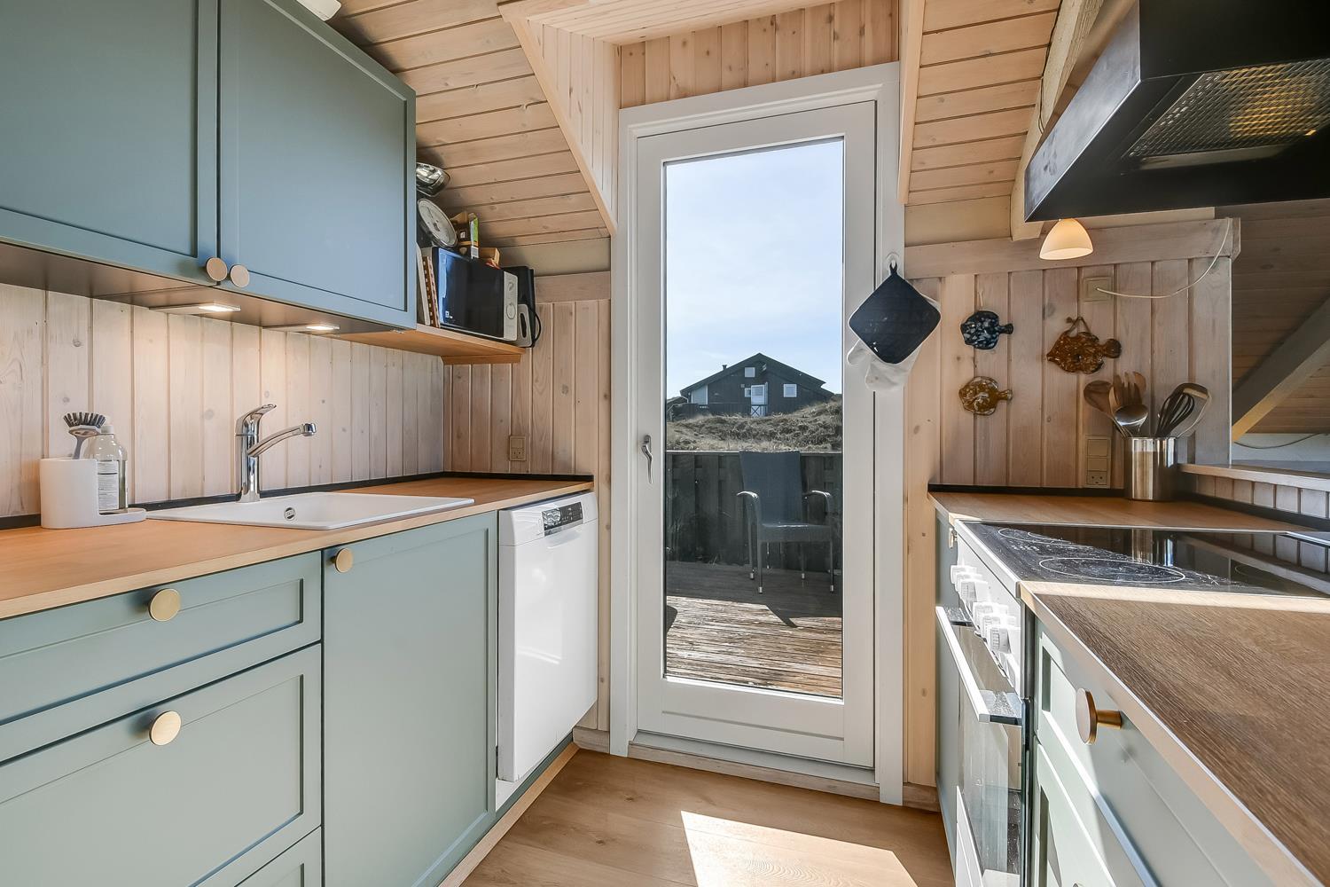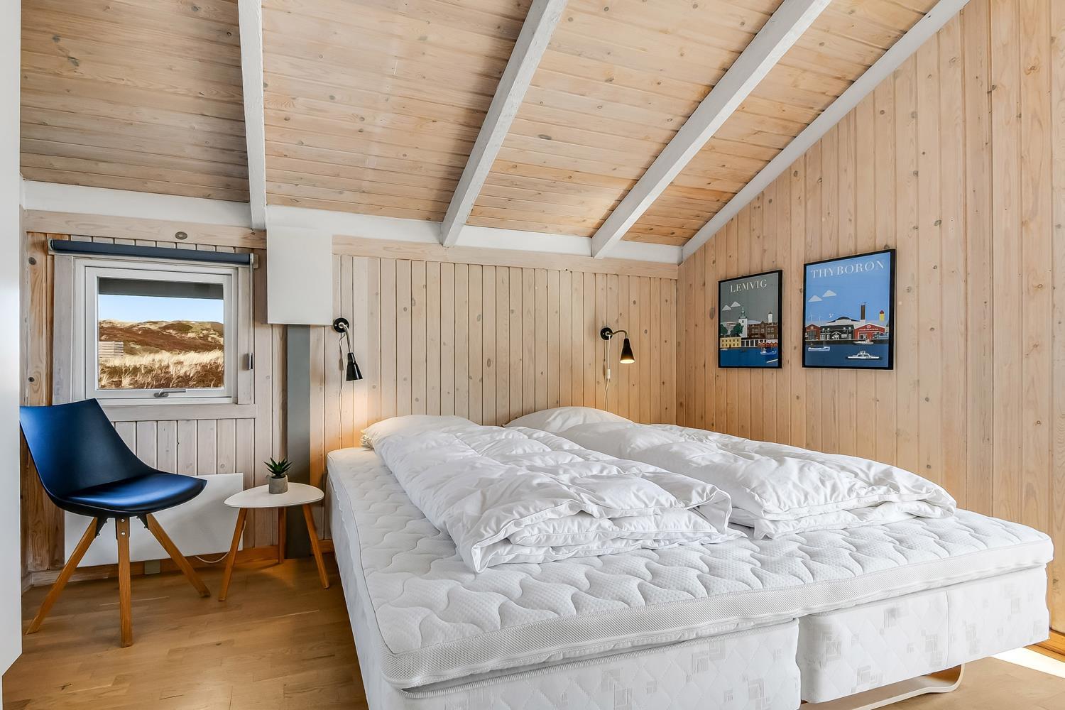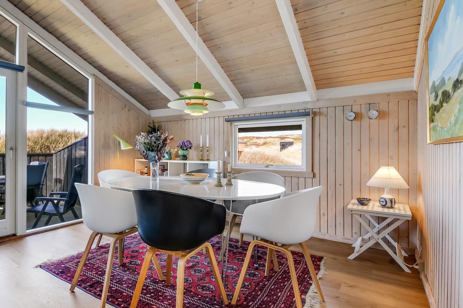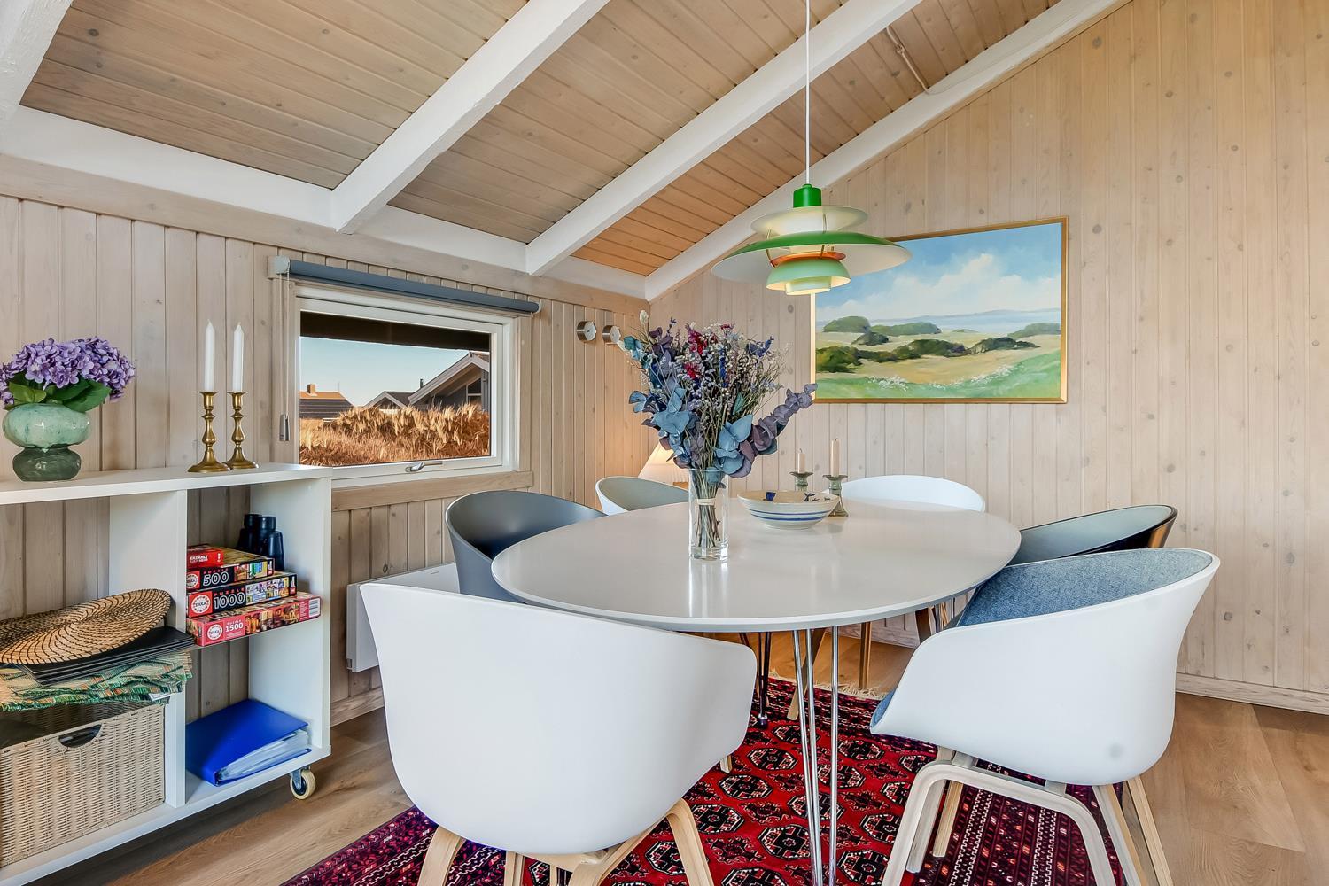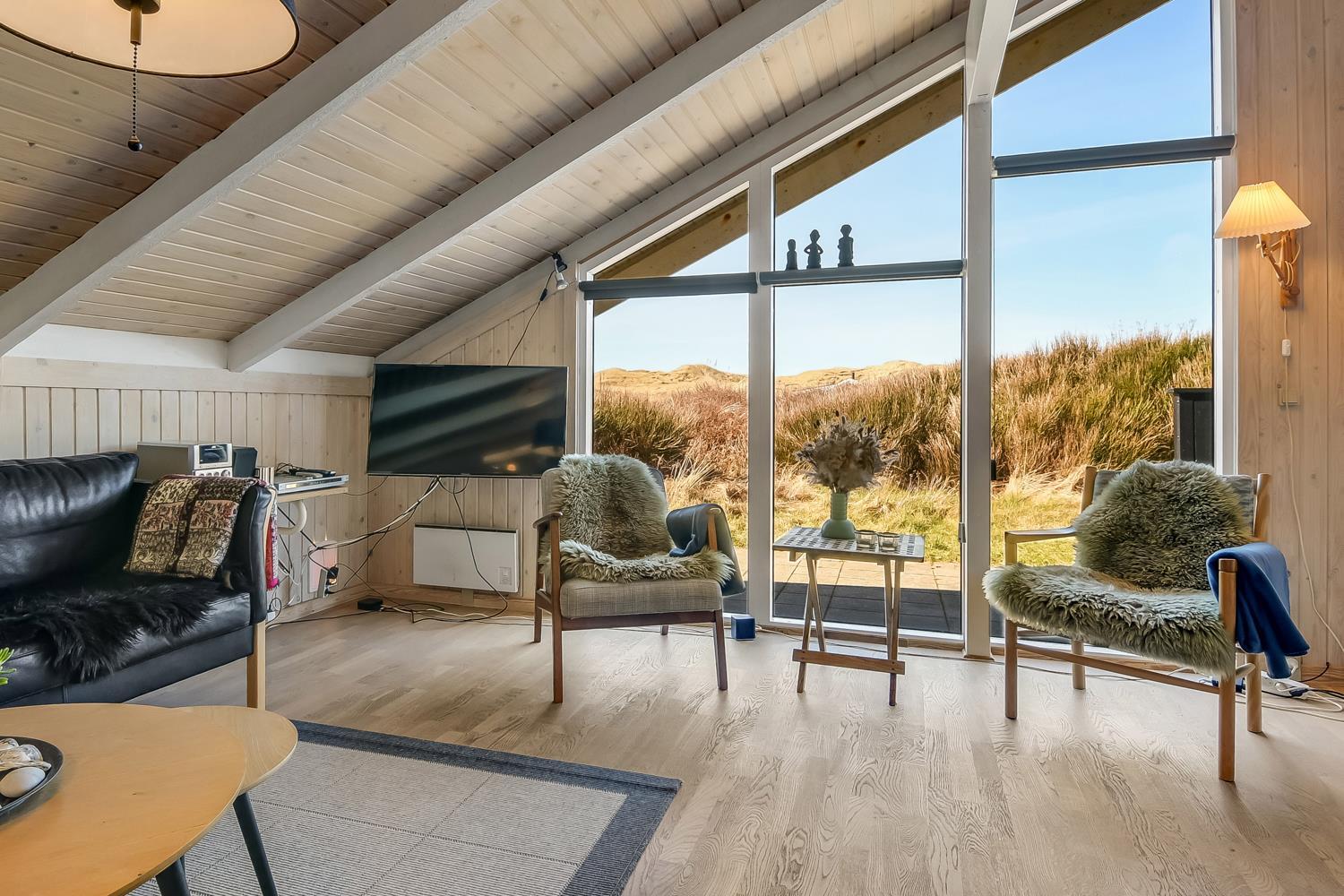 Parker lige ved huset og en flot fordelegang byder jer velkommen. Feriehuset er på ca. 84 m2 og har 3 nyrenoverede (2018) værelser (1DS, 1DS, 2ES). Fra forældre soveværelset er der pragtfuld udsigt til landskabet samt udgang til terrasse. Huset er praktisk indrettet i lyse og venlige farver og med pæne møbler. Et funktionelt og veludstyret køkkenhjørne med bla. opvaskemaskine, mikroovn og komfur med glaskeramiske kogeplader kombineret med spisestue og forsænket pejsestue med fladskærms-TV - med Apple tv, DR, TV2 og tyske programmer, DVD og CD afspiller, radio. Hyggelig brændeovn samt en energibesparende varmepumpe sørger for at alle kan holde varmen selv på de charmerende efterårsdage. Tag plads i en af husets behagelige stole og oplev, at blive betaget af den unikke udsigt til det høje klitlandskab. Dejligt badeværelse med vaskemaskine, bruseniche, toilet, og håndvask. Der er trægulve i alle sove- og opholdsrum og huset er meget rengøringsvenligt. Barnestol til de små. Ikke ryger hus. 1 husdyr tilladt. Har man el-bil eller en Plug-In hybrid, så er der Ladeboks ved huset til Type 2 ladestik, der kan lade op til 11 kWh.