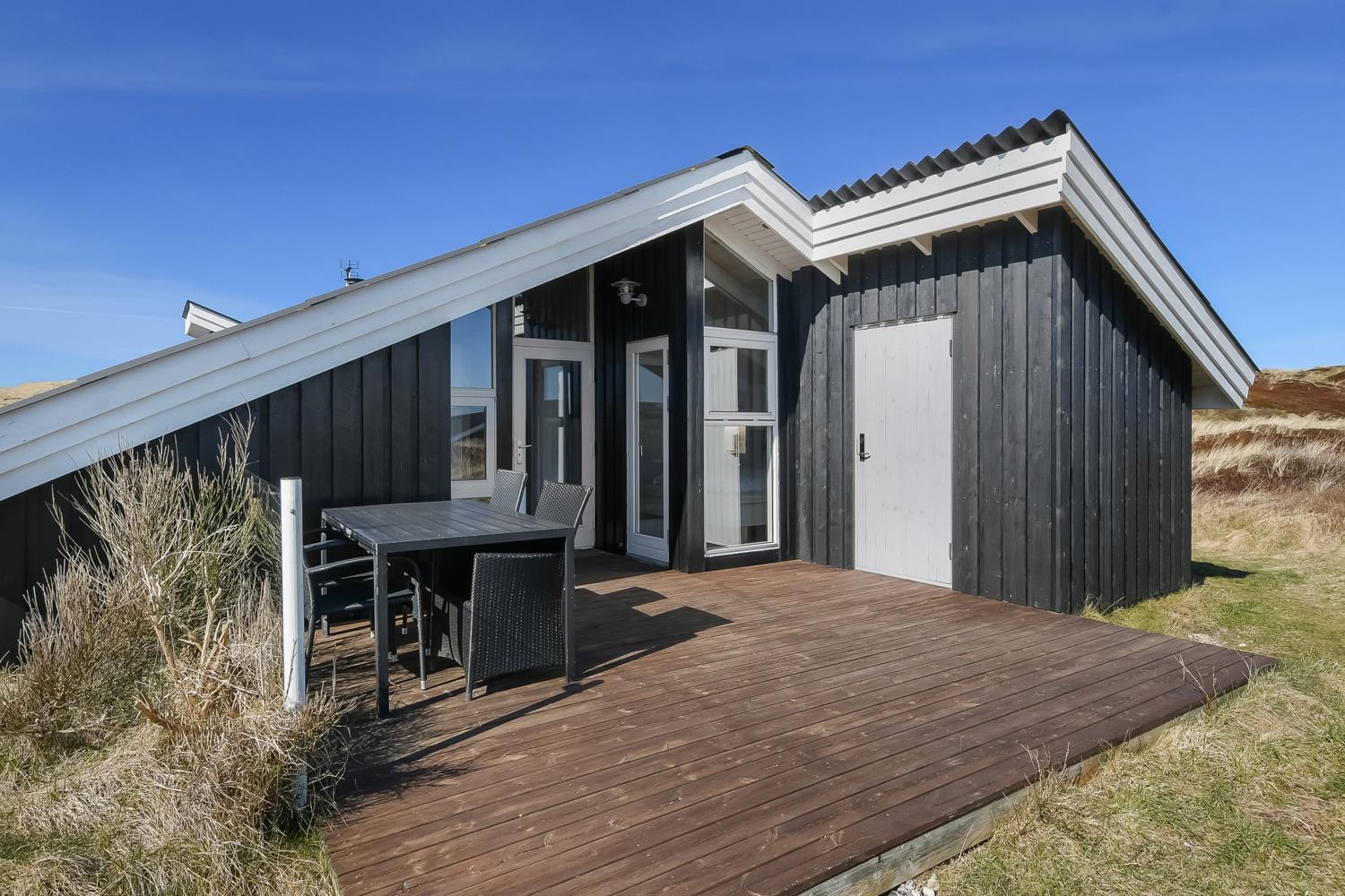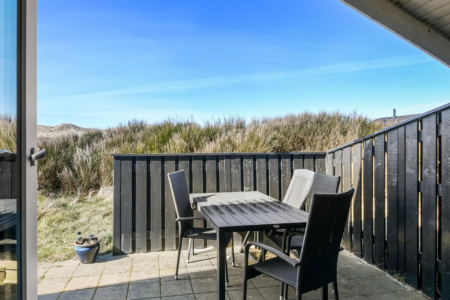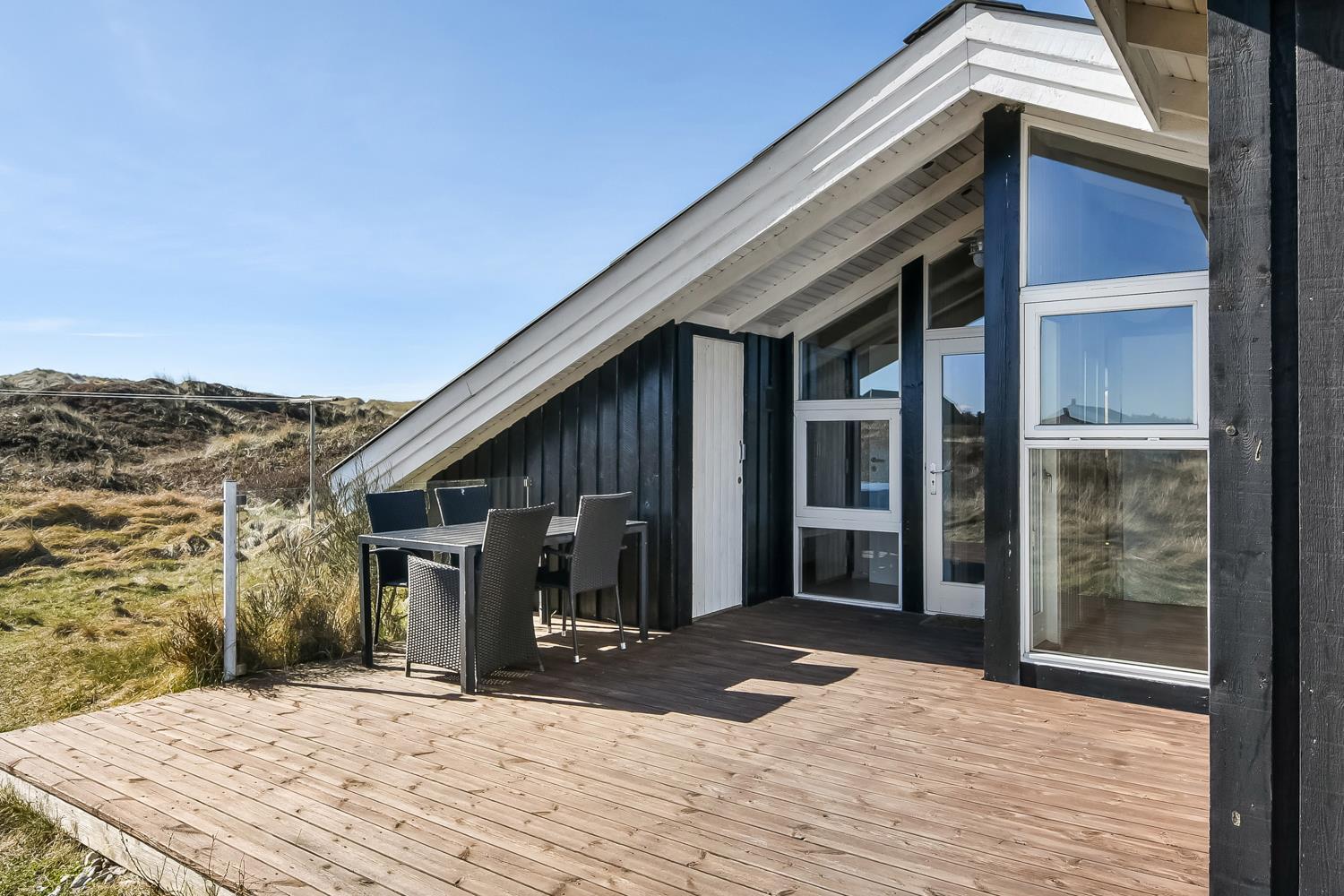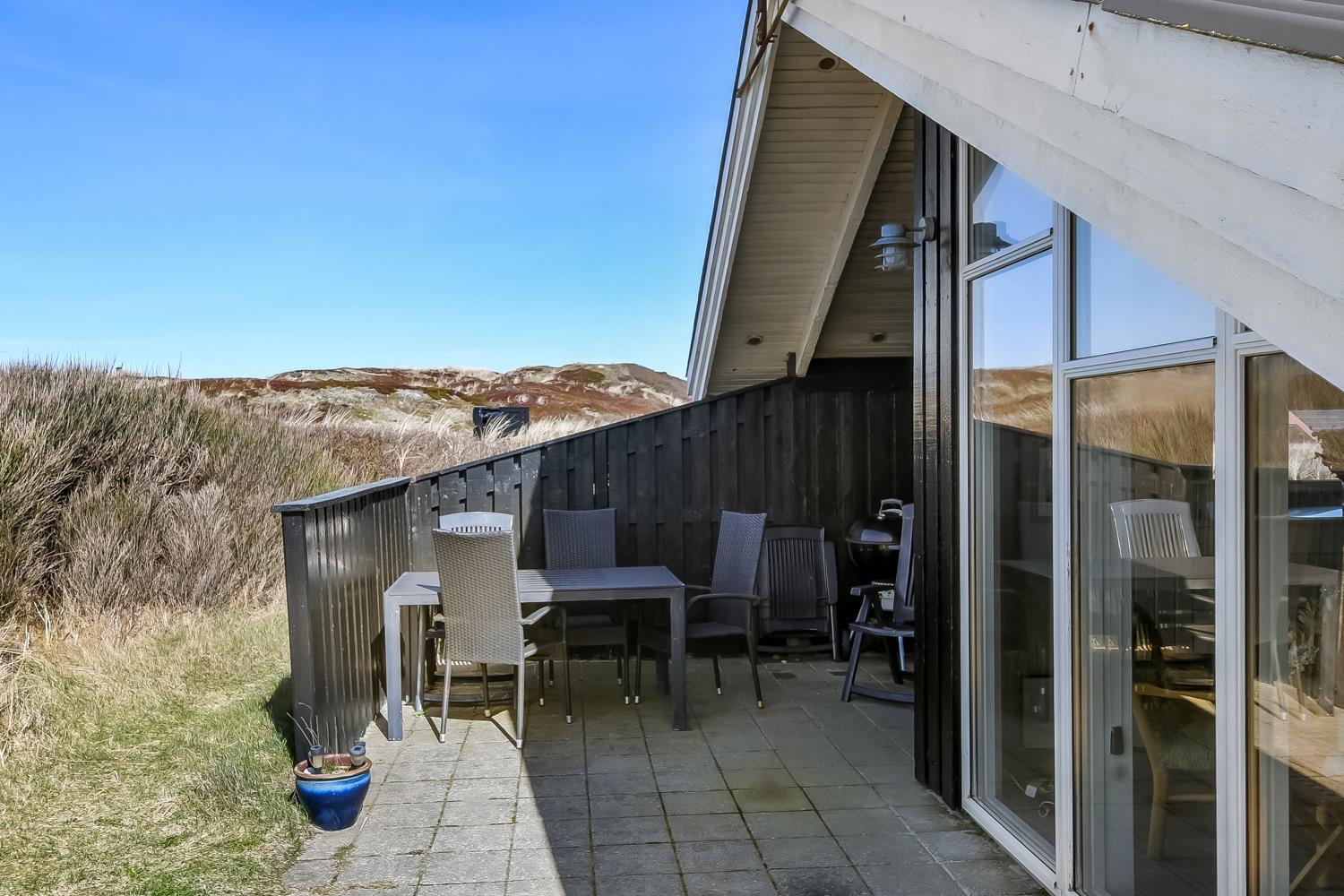 Huset er beliggende i en dejlig klitområde tæt ved Vesterhavet og har 3 terrasser, hvoraf en er delvis overdækket. Der forefindes mange havemøbler, liggestole og grill. Nyd at der altid er mulighed for at finde en plads i solen, et læsted eller en grillaften til lyden af bølgernes brusen som høres i baggrunden. Der er et shelter. Den dejligt beliggende feriebolig med klitudsigt, vil danne rammerne om jeres helt unikke ferie tæt ved Vesterhavet. Nyd at Vesterhavet hver dag fortæller en ny historie, som i kan opleve på tætteste hold.