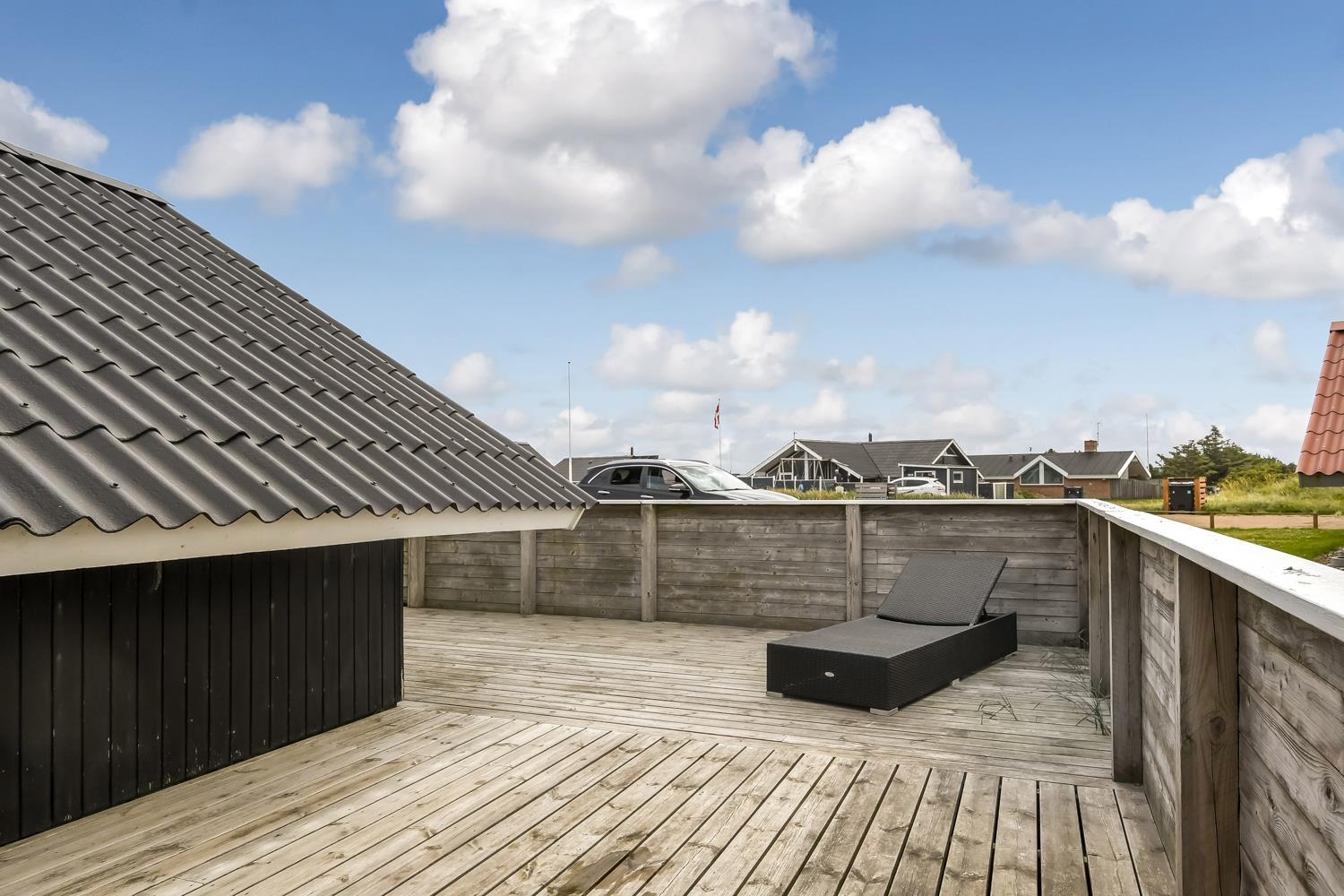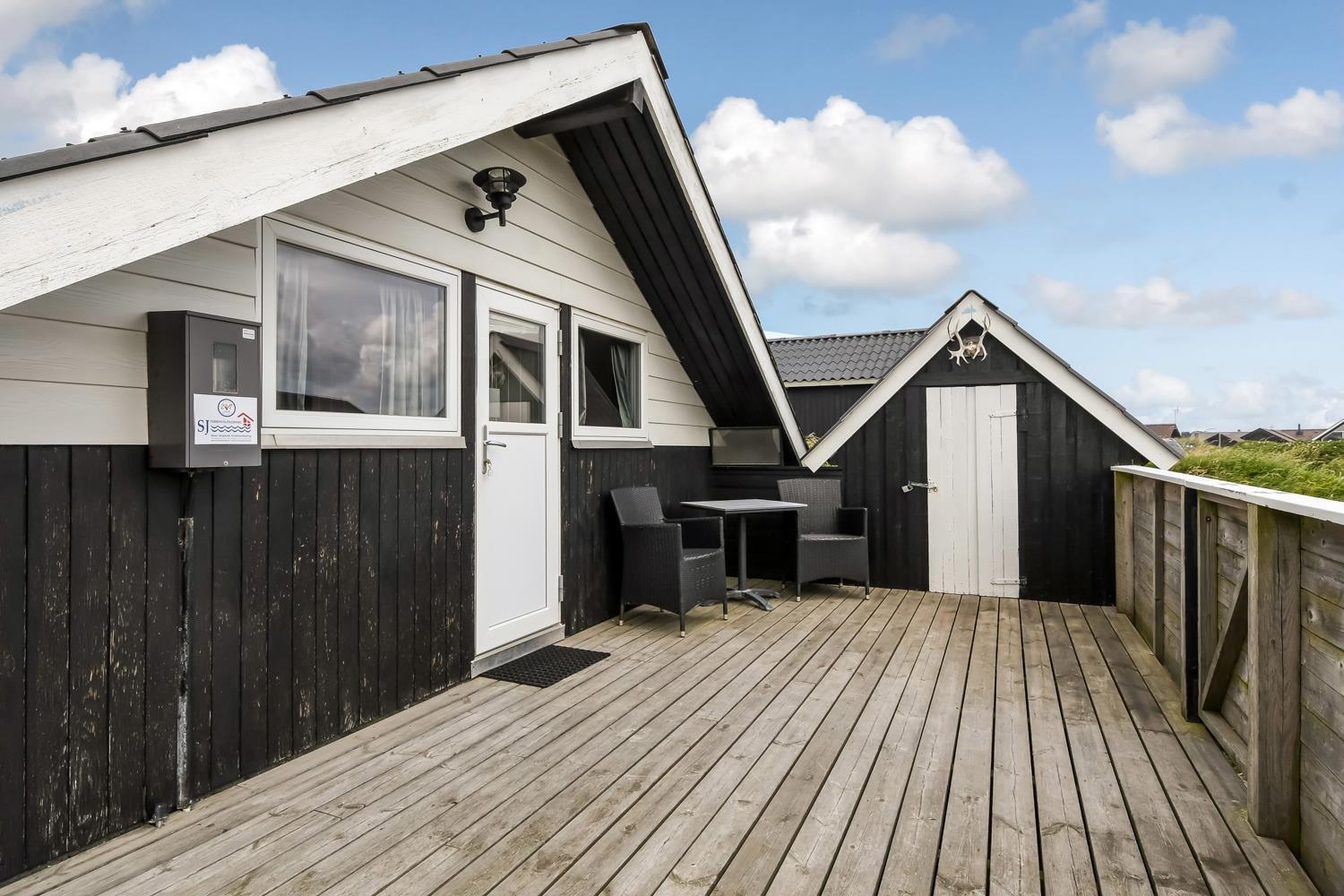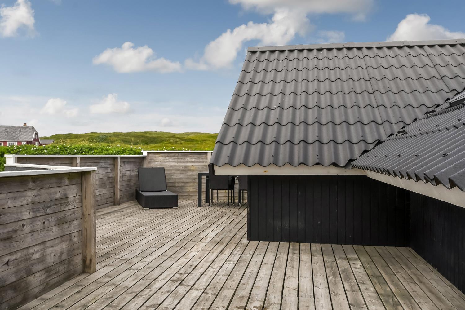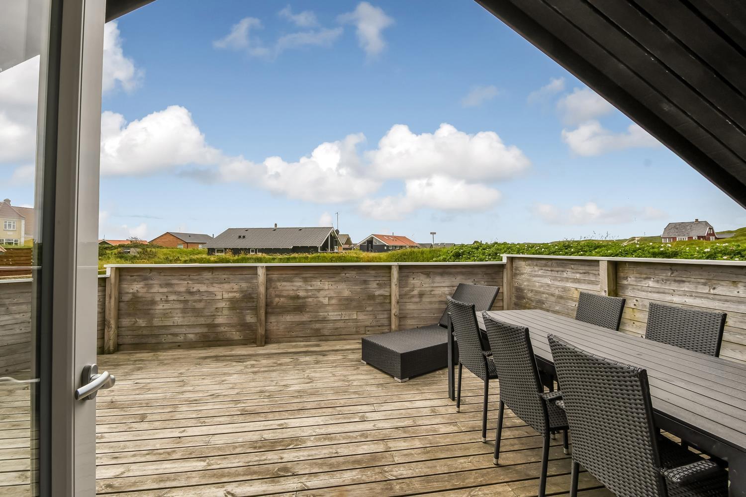 Huset ligger på en ca. 700 m2 stor grund. Den 60m2 store indhegnet terrasse er perfekt egnet til både hund og børn som kan løbe rundt uden man skal være bange for de løber væk. Der er flot panorama udsigt til klitterne ved Vesterhavet og både morgen- og aftensolen kan nydes i havemøblerne eller på en af de 2 solvogne. Grill er naturligvis også standard og børnene kan også underholde sig med gyngerne på grunden. Huset ligger godt i forhold til vandreture hvor der hverken er langt til Ferring Sø eller Vesterhavet. I sommerhalvåret fra påske til efterårsferie er der kun cirka 600 meter til nærmeste købmand ved Vejlby Torv hvor der også er en Cafe som har åbent i sæsonen. I vinterhalvåret må man tage de 6 km til Harboøre hvor der både er en Aldi og Brugsen. Der er kun 200 m til et friareal, hvor der er mulighed for diverse boldspil.