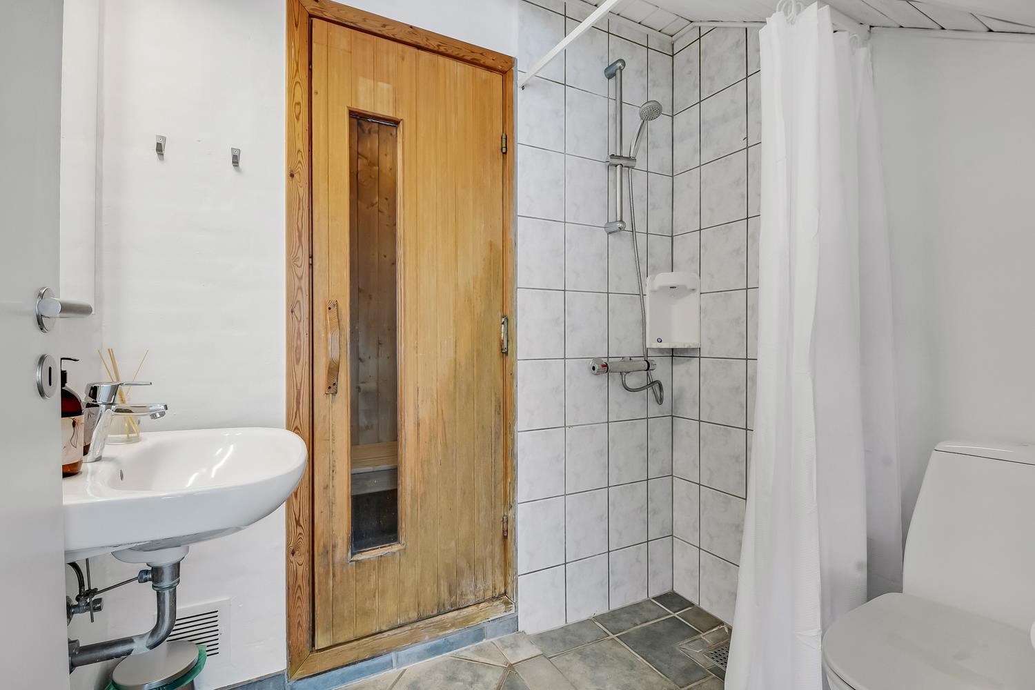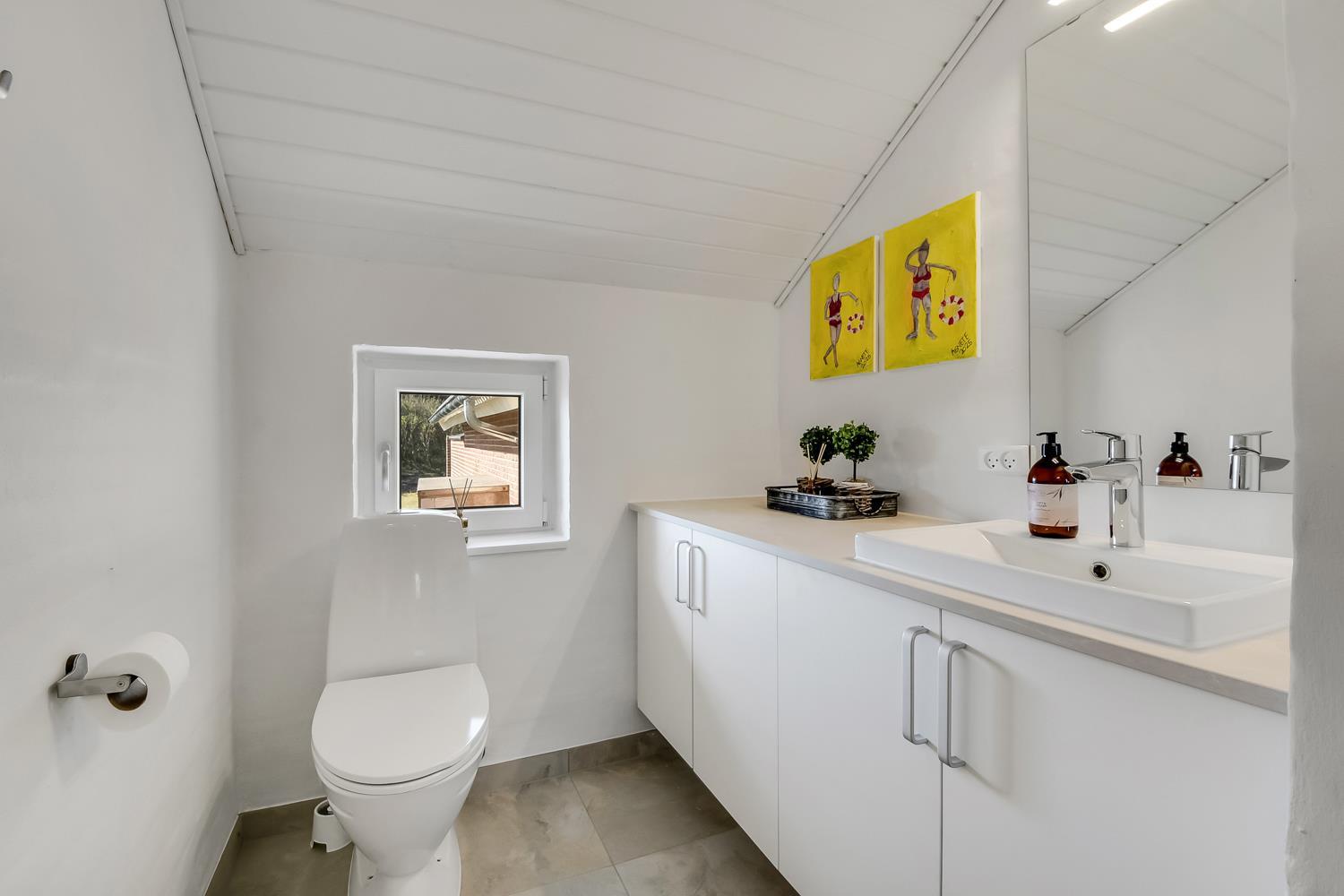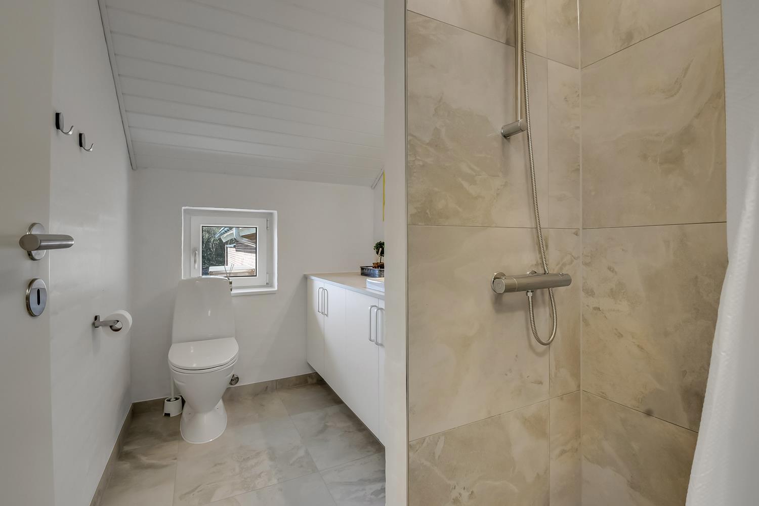Begge badeværelser har bruser, toilet, håndvask og gulvvarme, så komforten er i top – også når I er mange af sted.