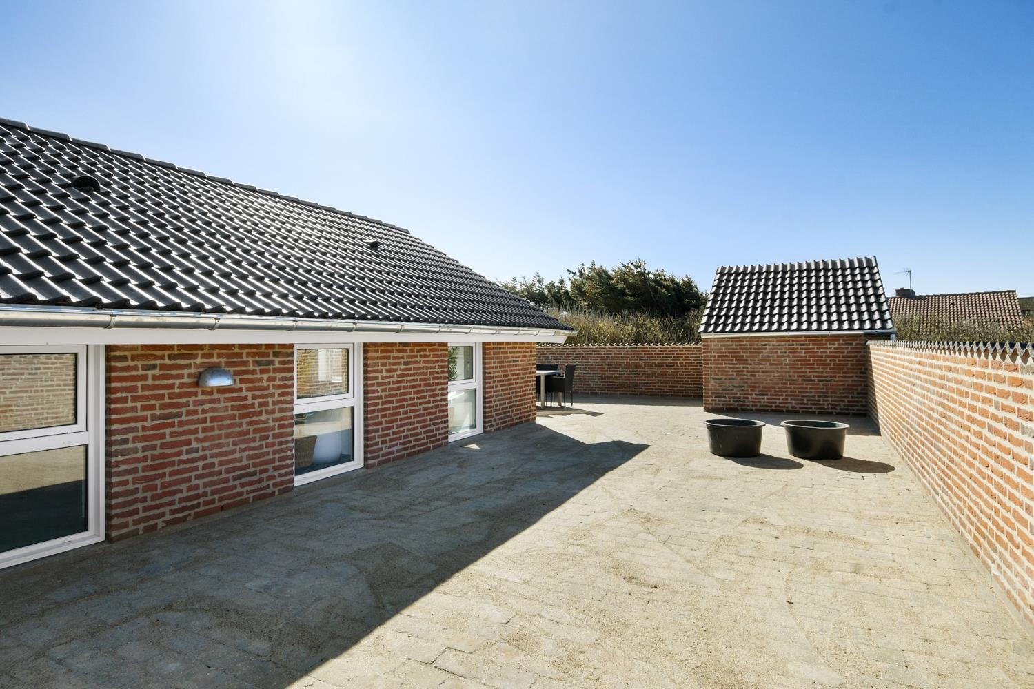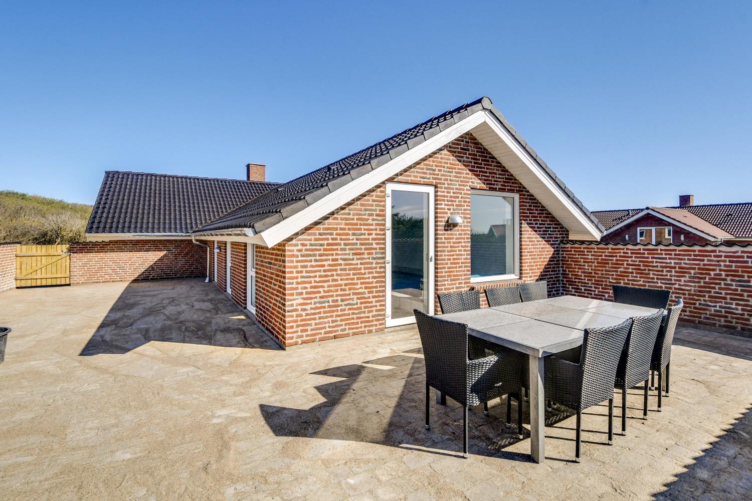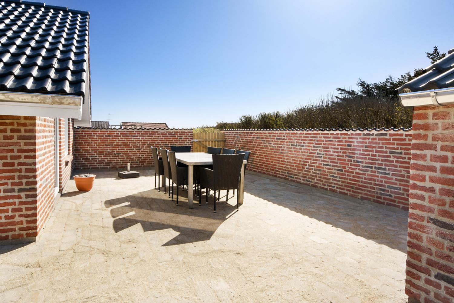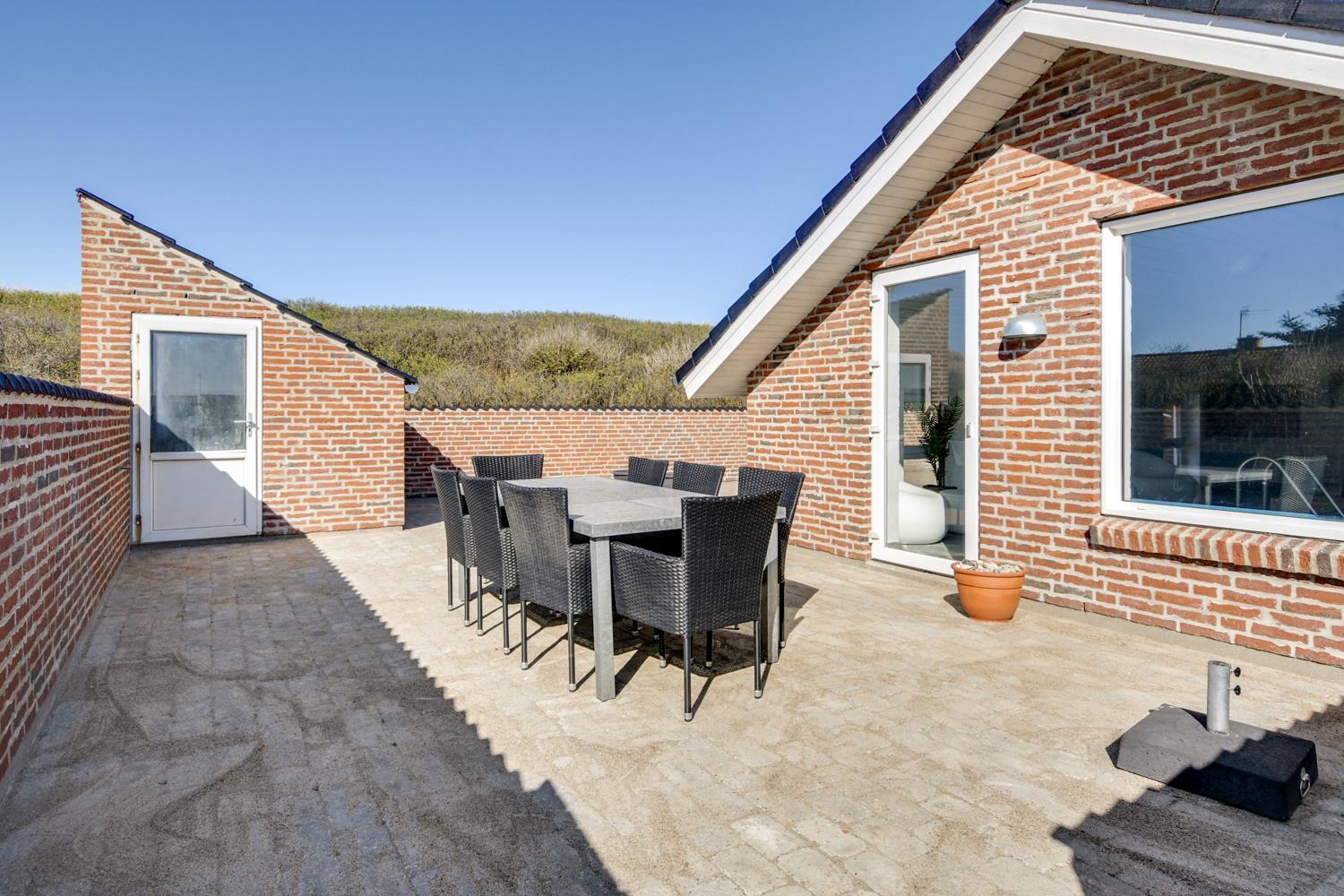 Huset ligger for enden af en vej, direkte op til diget på en 1.400 m² stor klitgrund med egen sti til stranden. Beliggenheden er helt ugenert, så du kan nyde ferien i fred og ro, omgivet af naturens skønhed. Den helt lukkede terrasse med havemøbler, liggestole og grill indbyder til afslapning og hyggelige aftener under åben himmel.