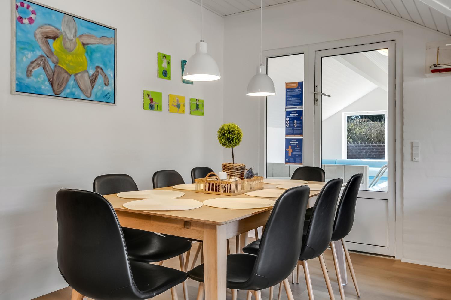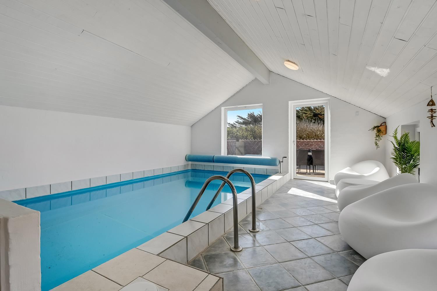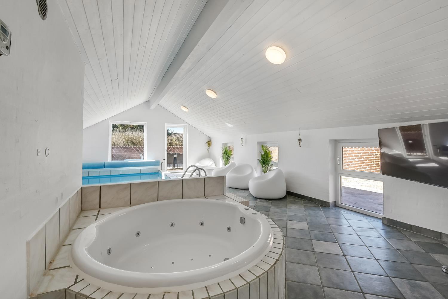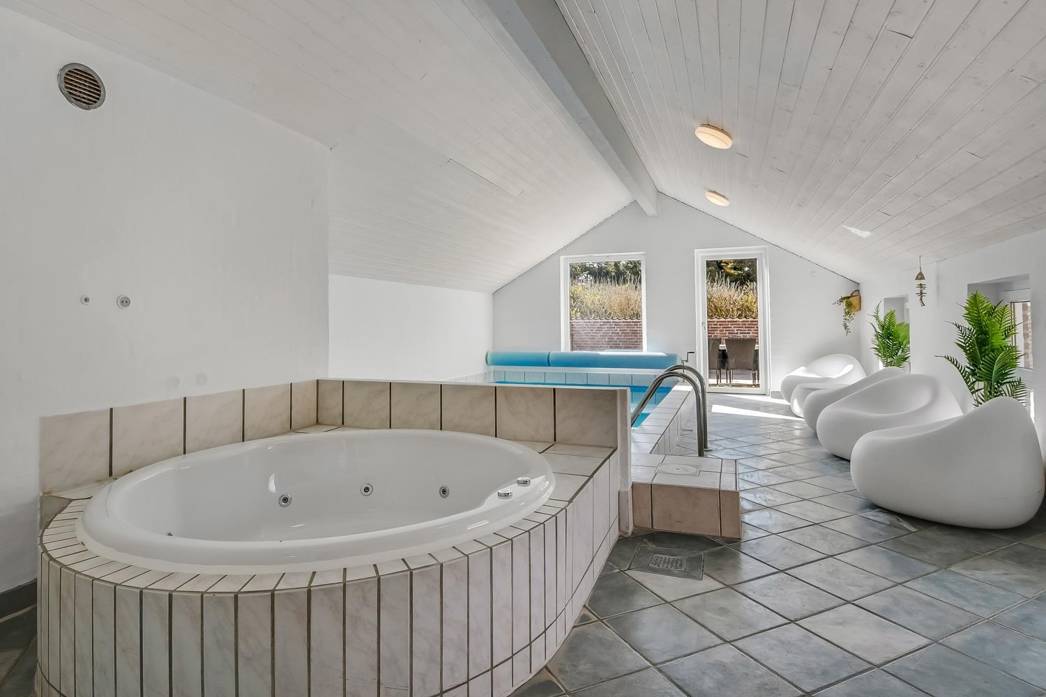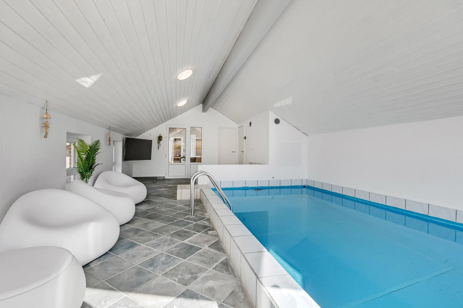Forkæl dig selv i den skønne poolafdeling med opvarmet pool, 4-personers spabad, sauna og badeværelse. Perfekt til hyggelige stunder, uanset vejret.