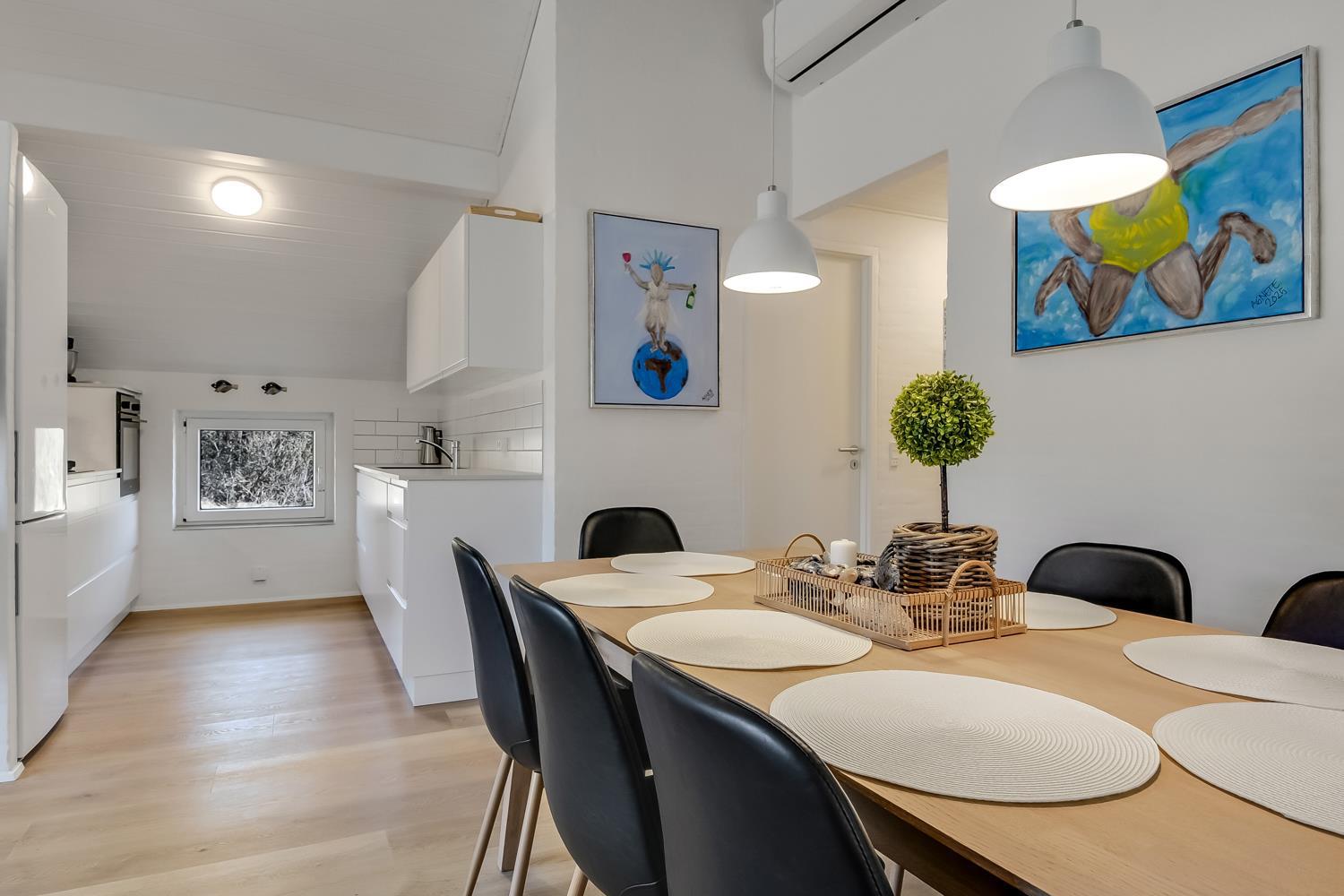 Huset er smagfuldt og personligt indrettet med varme farver og sans for detaljer, hvilket skaber en helt særlig atmosfære. Den kombinerede stue og køkken byder på lædermøbler, TV og energibesparende varmepumpe, der sikrer en behagelig temperatur og lavere energiforbrug. Her føler man sig straks hjemme.