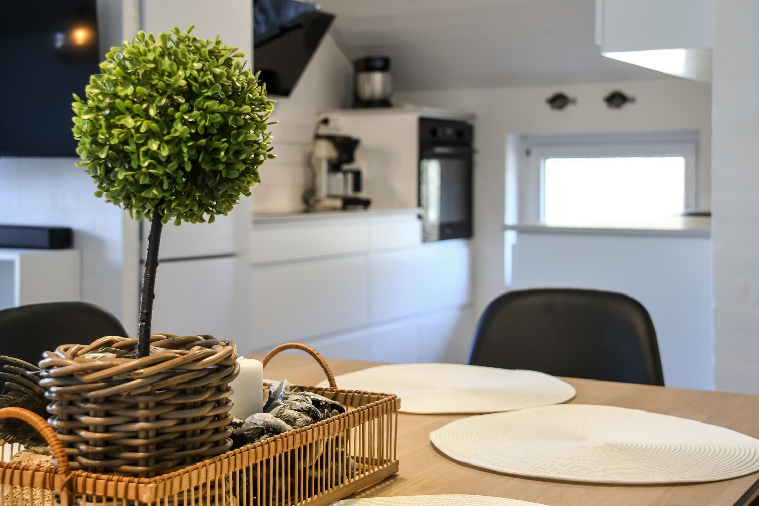 Køkkenet har alt, hvad du har brug for: keramisk kogeplade, indbygningsovn, mikroovn, køle-/fryseskab og opvaskemaskine.