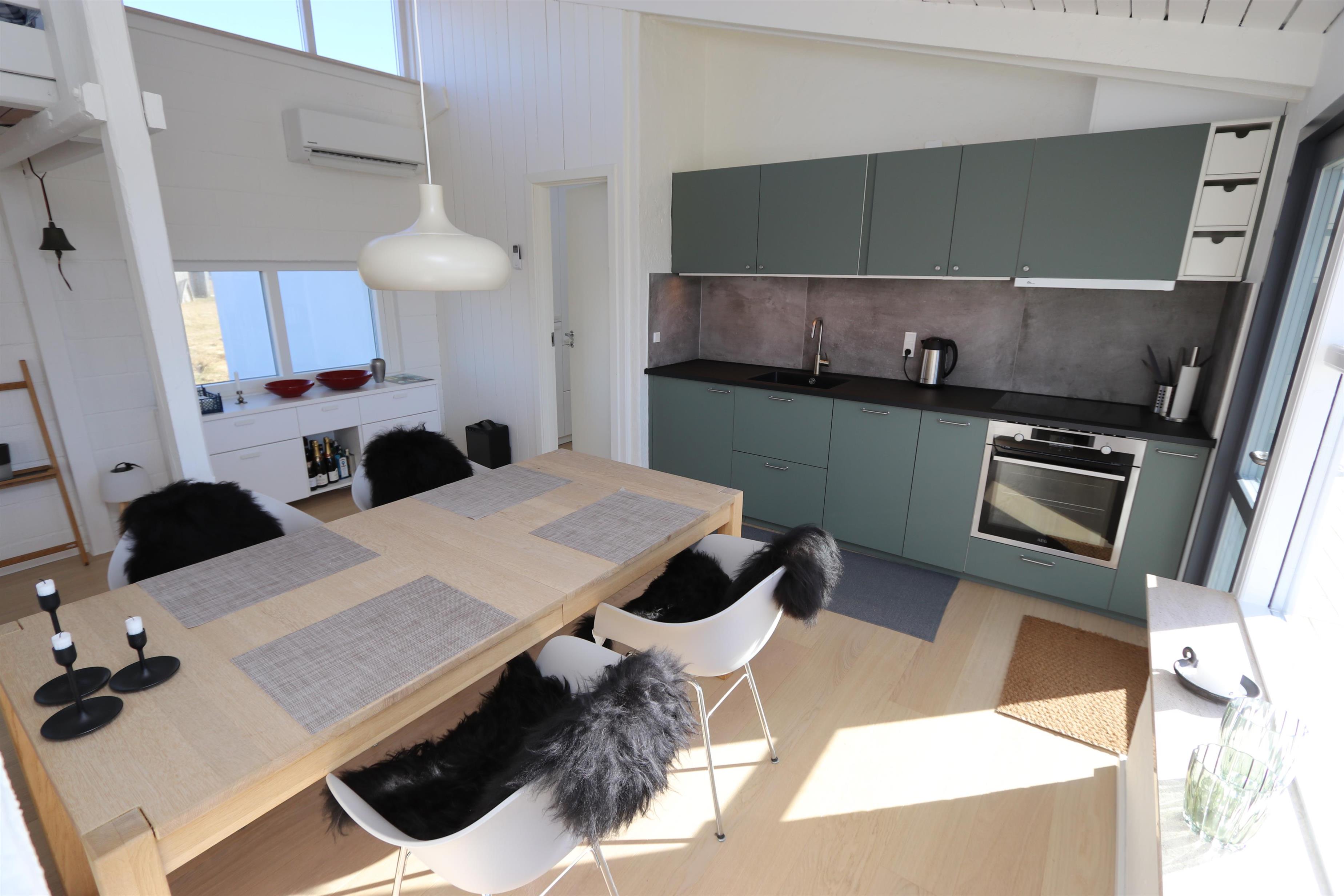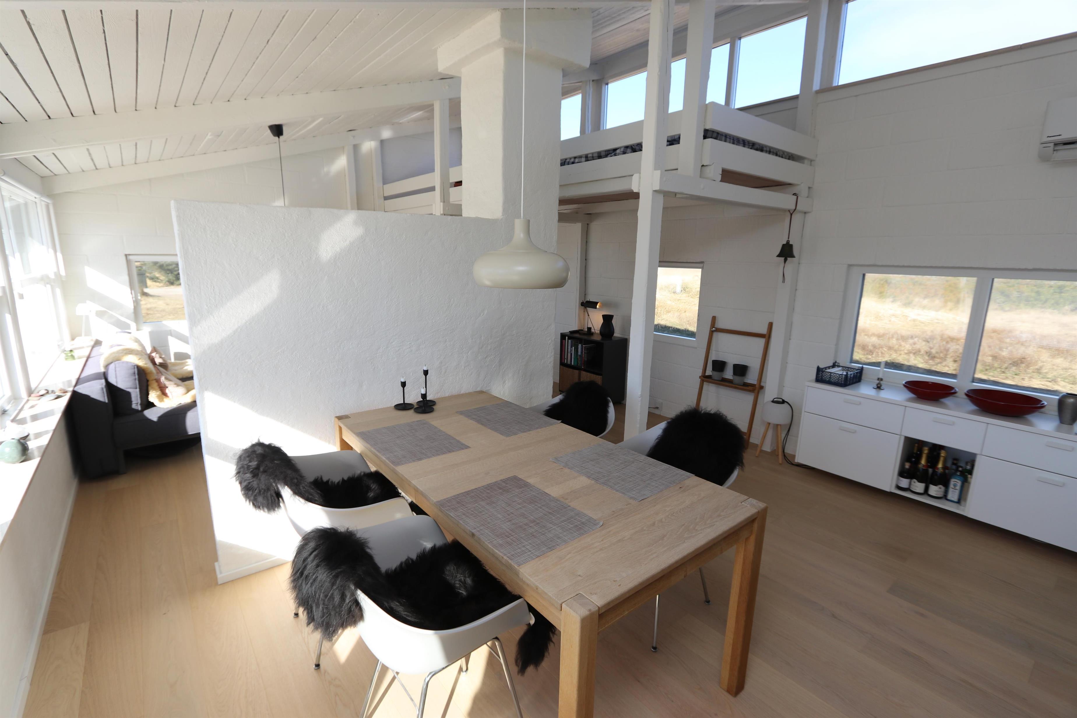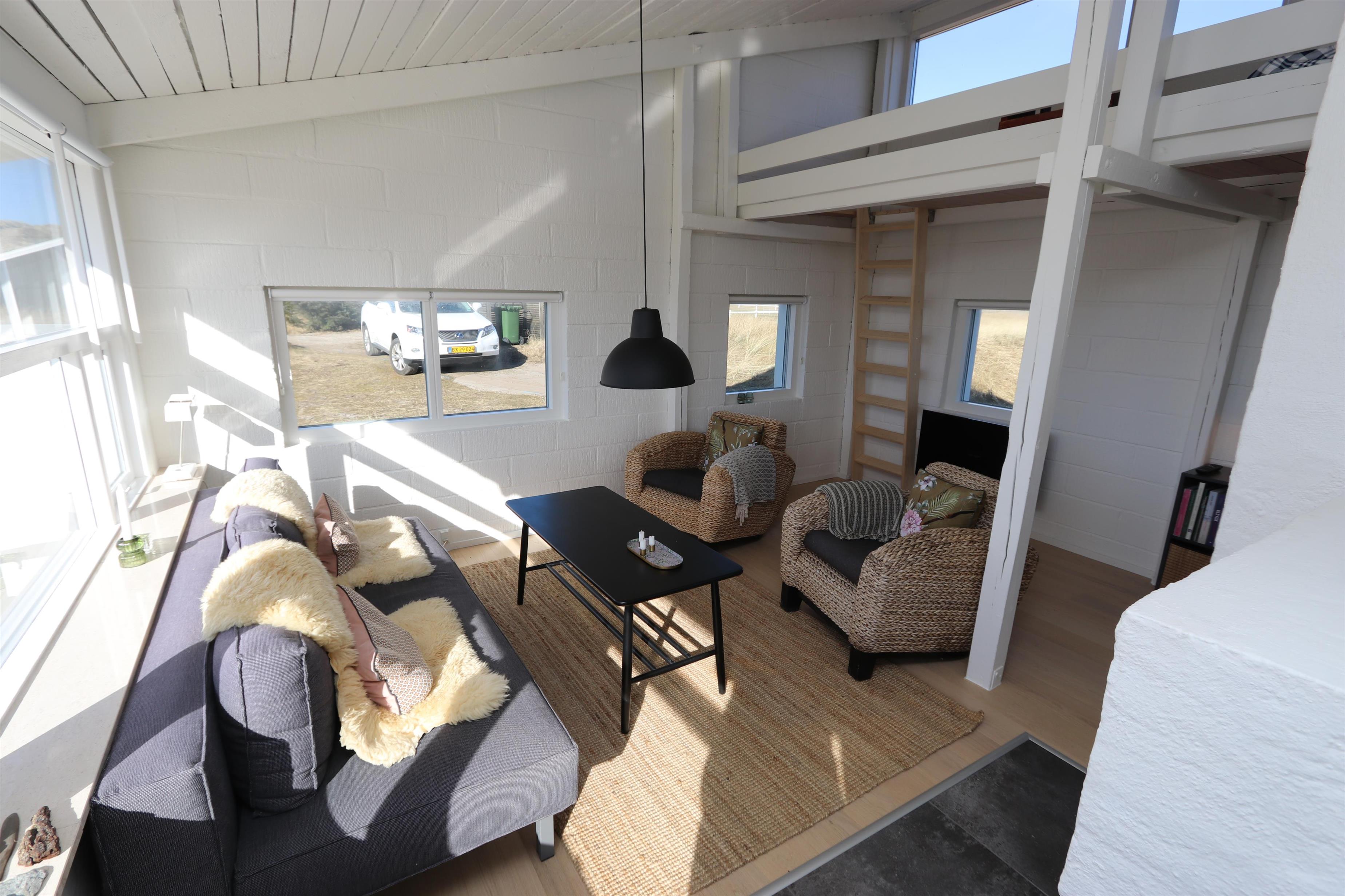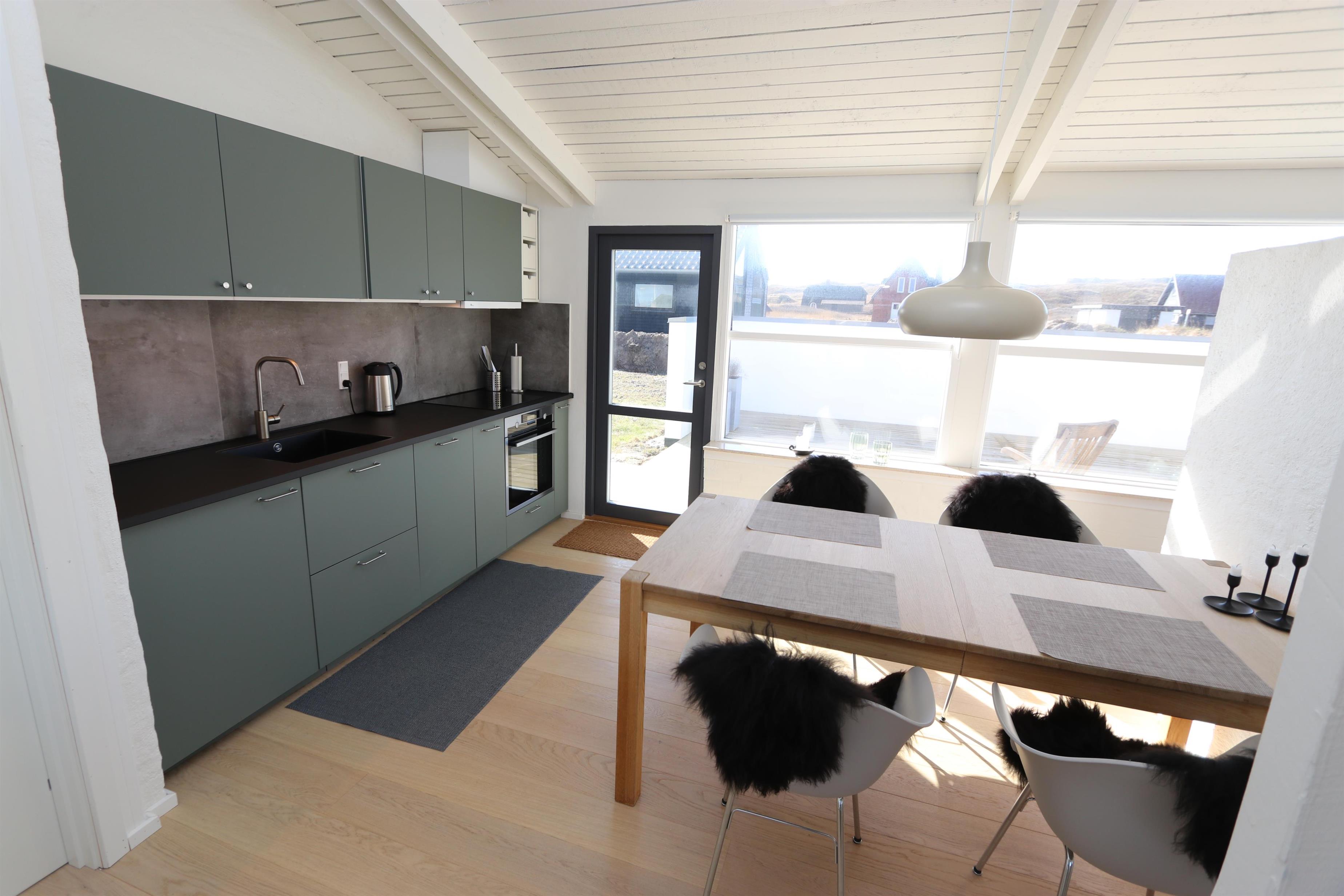 Fantastisk, lyst og venligt indrettet energisparehus på 105 m2 udført i gode materialer. Stuen og køkkenet er praktisk i samme rum. Atypisk for sommerhuse er der i selve køkkenet også spisebord til alle personer i huset. Dette gør det lettere at servere og giver en lidt anderledes stemning. 3 soveværelser (1DS, 1DS, 2ES). Fra det ene soveværelse er der direkte indgang fra morgenterassen samt dør til det det andet soveværelse. Køkkenhjørnet indeholder desuden et glaskeramisk – induktion - kogeplade, indbygningsovn, emhætte, 2 køleskabe hvoraf den ene har fryser, mikrobølgeovn og opvaskemaskine. Efter middagen kan man sætte sig i sofaen foran sofabordet og både nyde udsigten til klitterne og den åbne pejs som sammen med den opsatte varmepumpe sørger for varmen på de kølige aftener. Bluetooth højtaler som kan kobles til dine egne enheder. TV med tyske programmer og mulighed for streaming af radio og TV programmer via Chromecast. Har man el-bil eller en Plug-In hybrid, så er der Ladeboks ved huset til Type 2 ladestik, der kan lade op til 11 kWh.