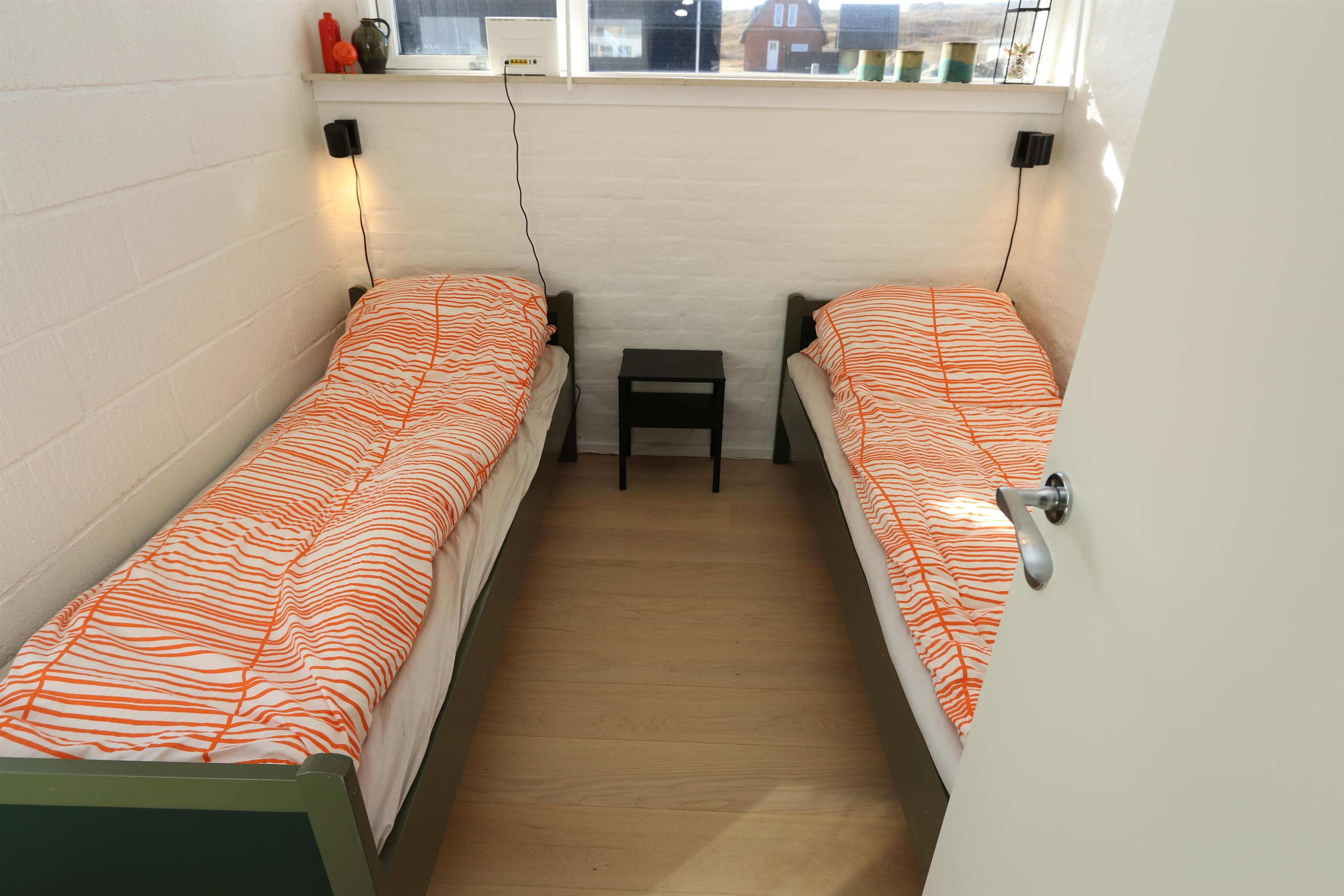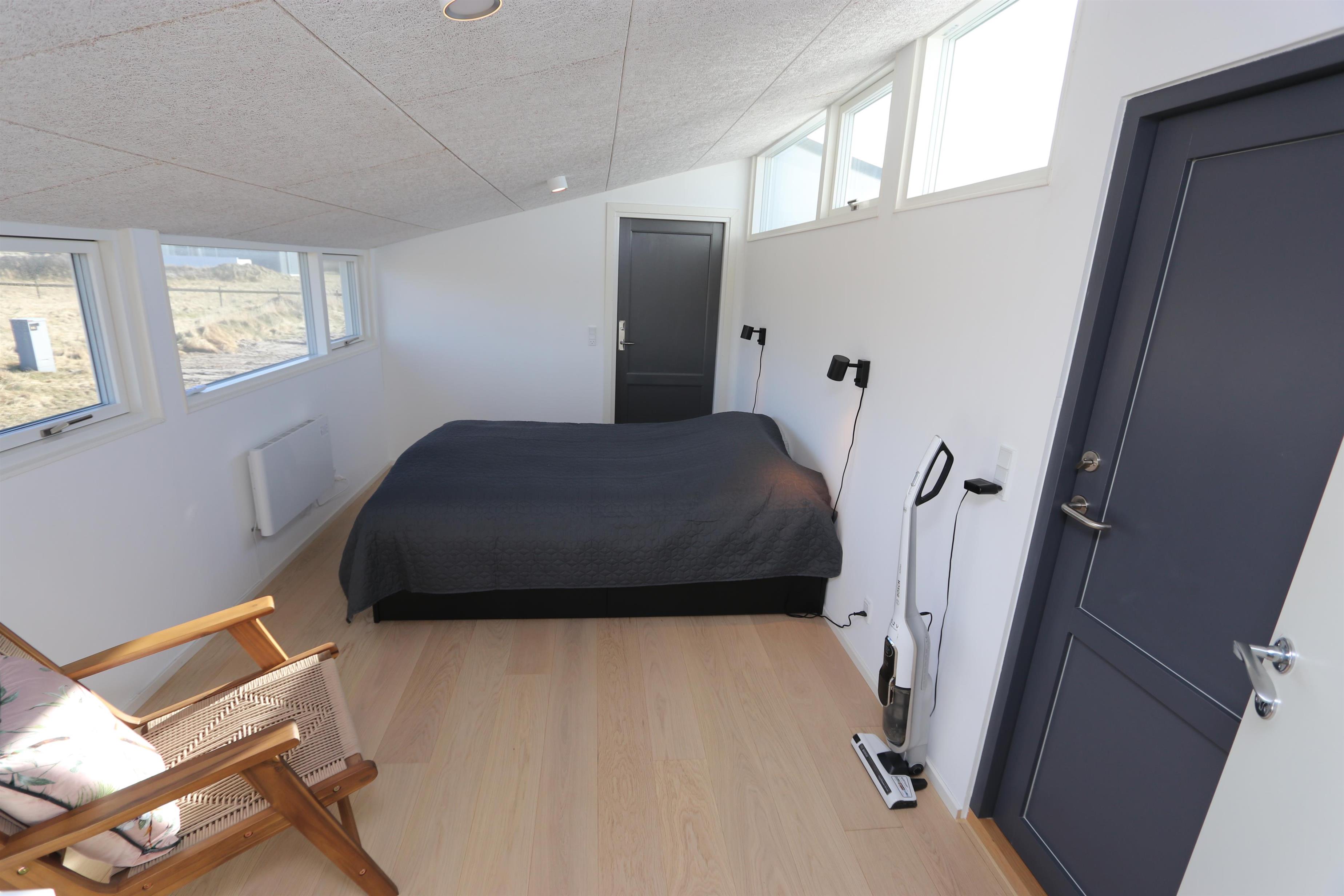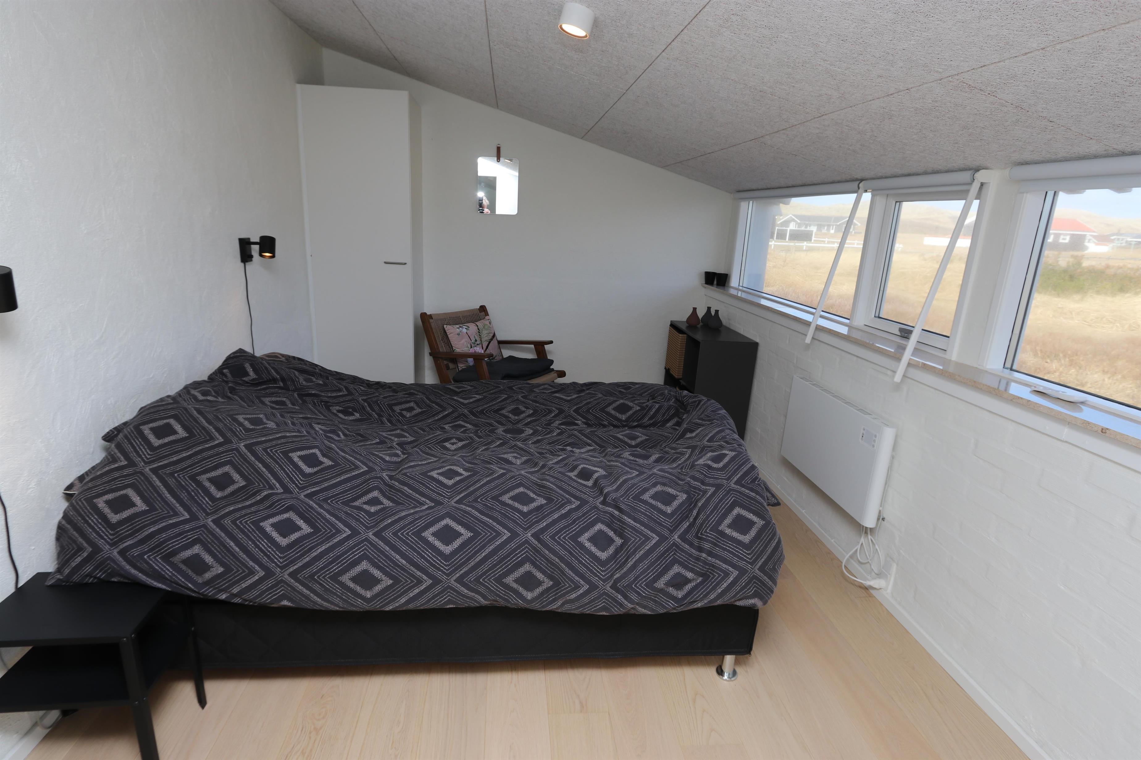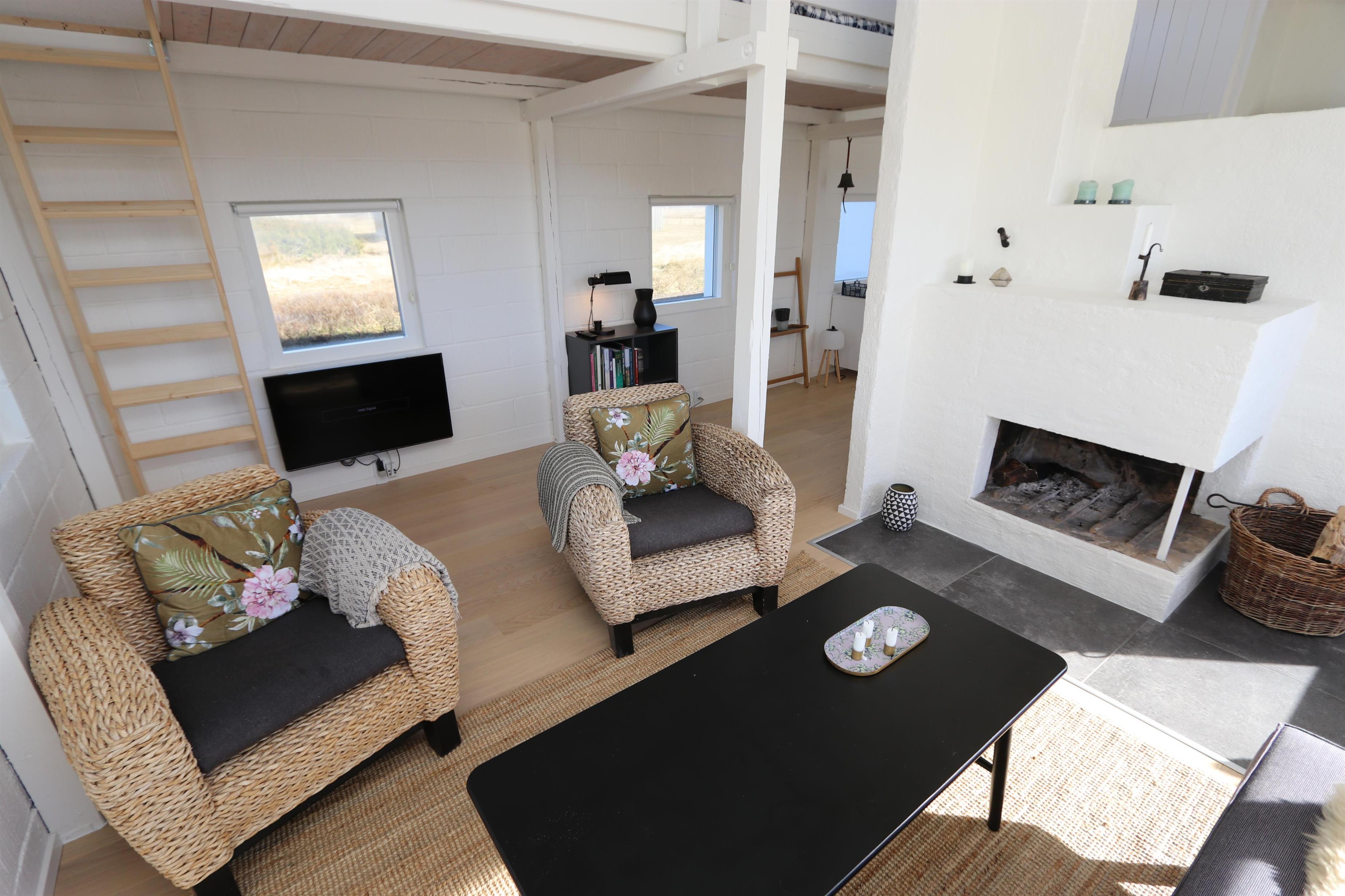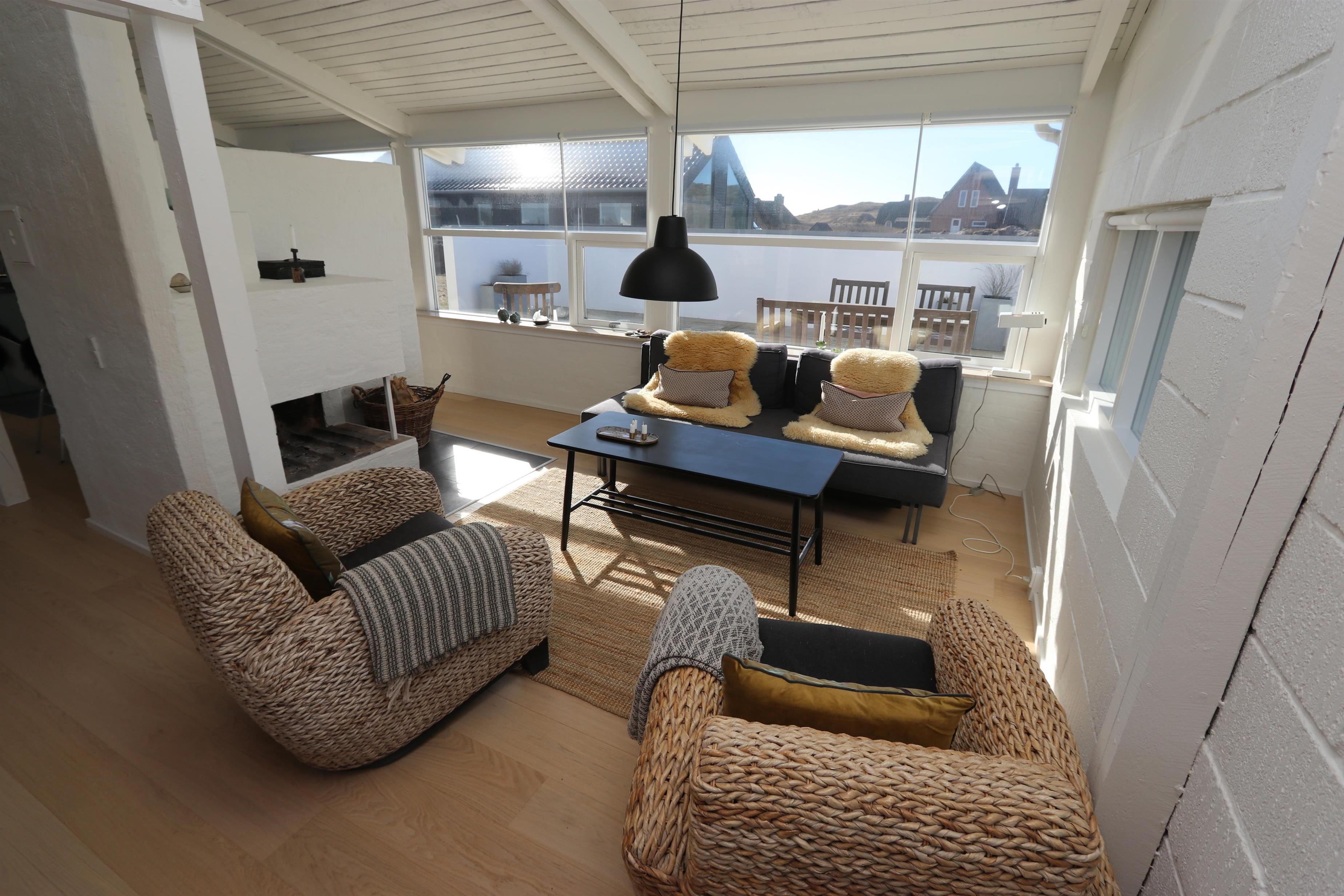 Fantastisk, lyst og venligt indrettet energisparehus på 105 m2 udført i gode materialer. Stuen og køkkenet er praktisk i samme rum. Atypisk for sommerhuse er der i selve køkkenet også spisebord til alle personer i huset. Dette gør det lettere at servere og giver en lidt anderledes stemning. 3 soveværelser (1DS, 1DS, 2ES). Fra det ene soveværelse er der direkte indgang fra morgenterassen samt dør til det det andet soveværelse. Køkkenhjørnet indeholder desuden et glaskeramisk – induktion - kogeplade, indbygningsovn, emhætte, 2 køleskabe hvoraf den ene har fryser, mikrobølgeovn og opvaskemaskine. Efter middagen kan man sætte sig i sofaen foran sofabordet og både nyde udsigten til klitterne og den åbne pejs som sammen med den opsatte varmepumpe sørger for varmen på de kølige aftener. Bluetooth højtaler som kan kobles til dine egne enheder. TV med tyske programmer og mulighed for streaming af radio og TV programmer via Chromecast. Har man el-bil eller en Plug-In hybrid, så er der Ladeboks ved huset til Type 2 ladestik, der kan lade op til 11 kWh.