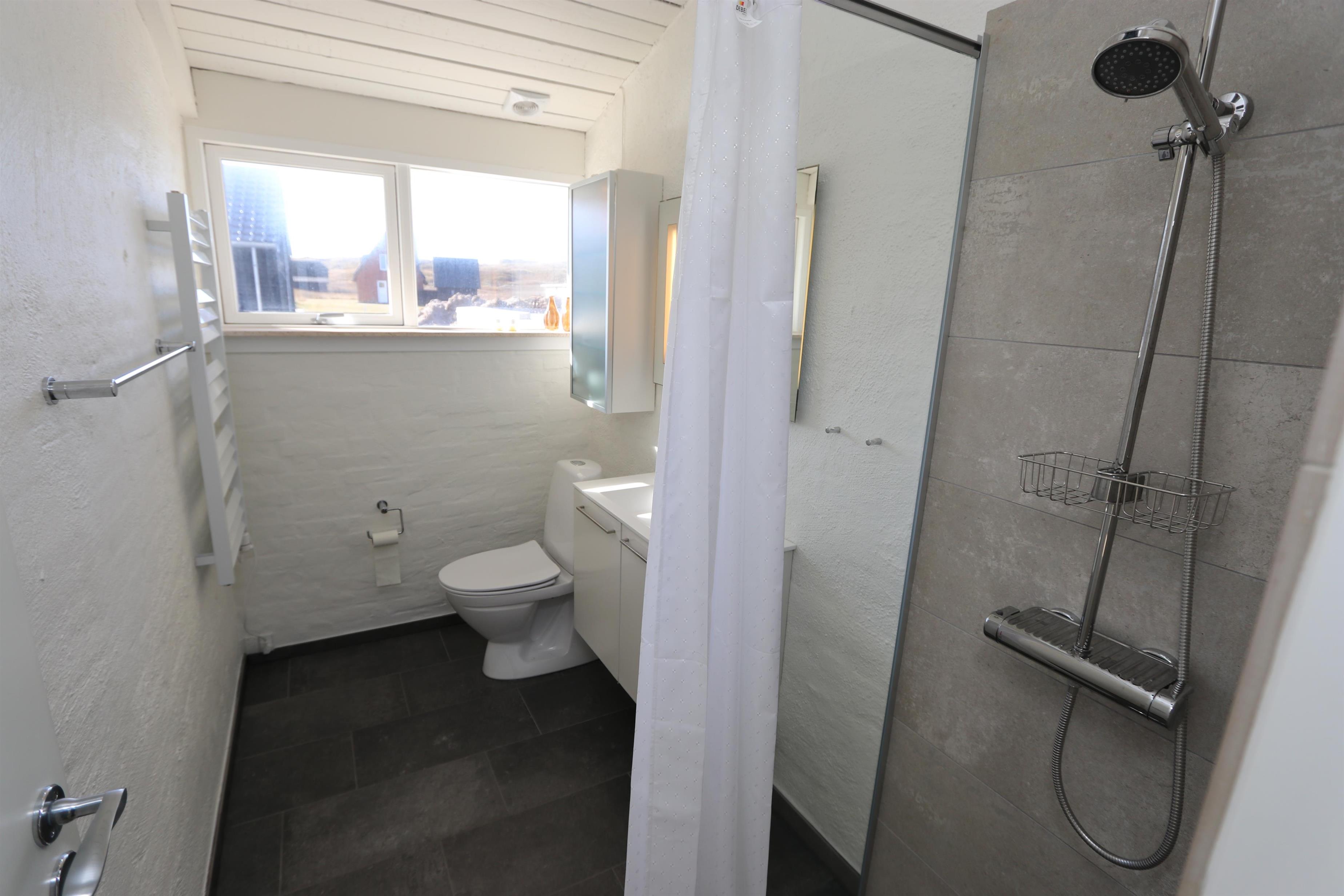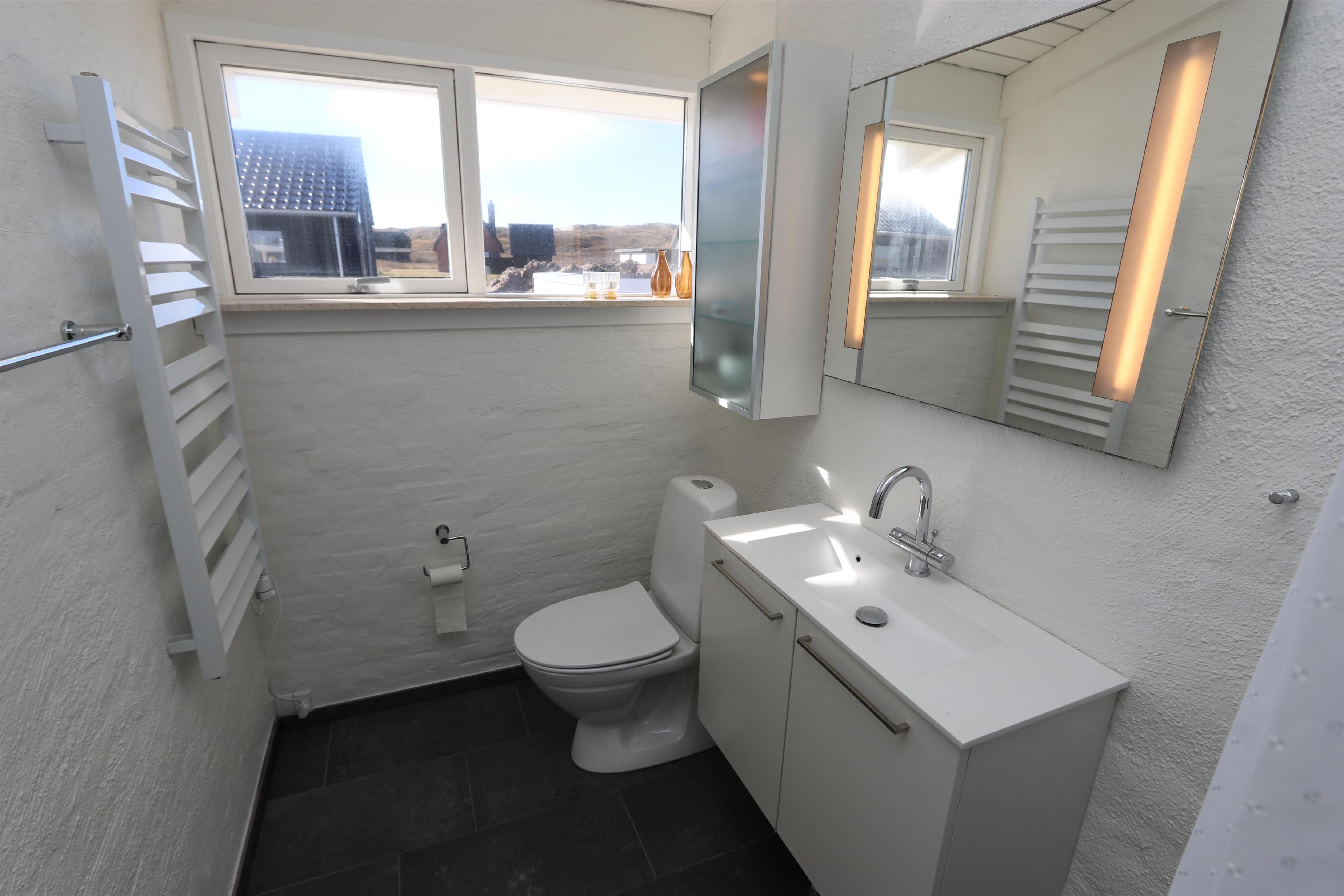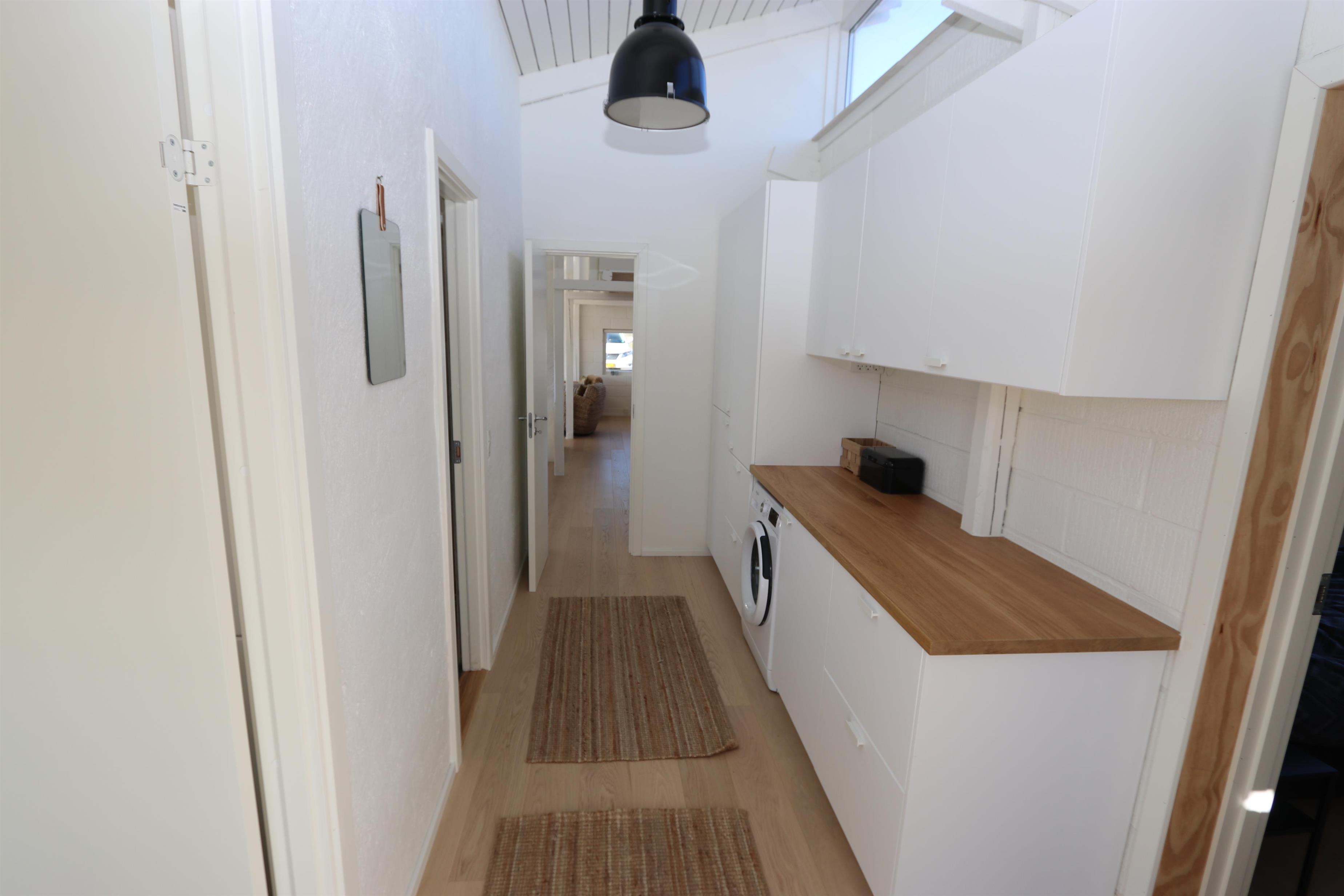 Lækkert, nyrenoveret feriehus med toilet, håndvask, bruser og lækre klinker med gulvvarme. Flot entré med ekstra aflægge plads, skabe og vaskemaskine.