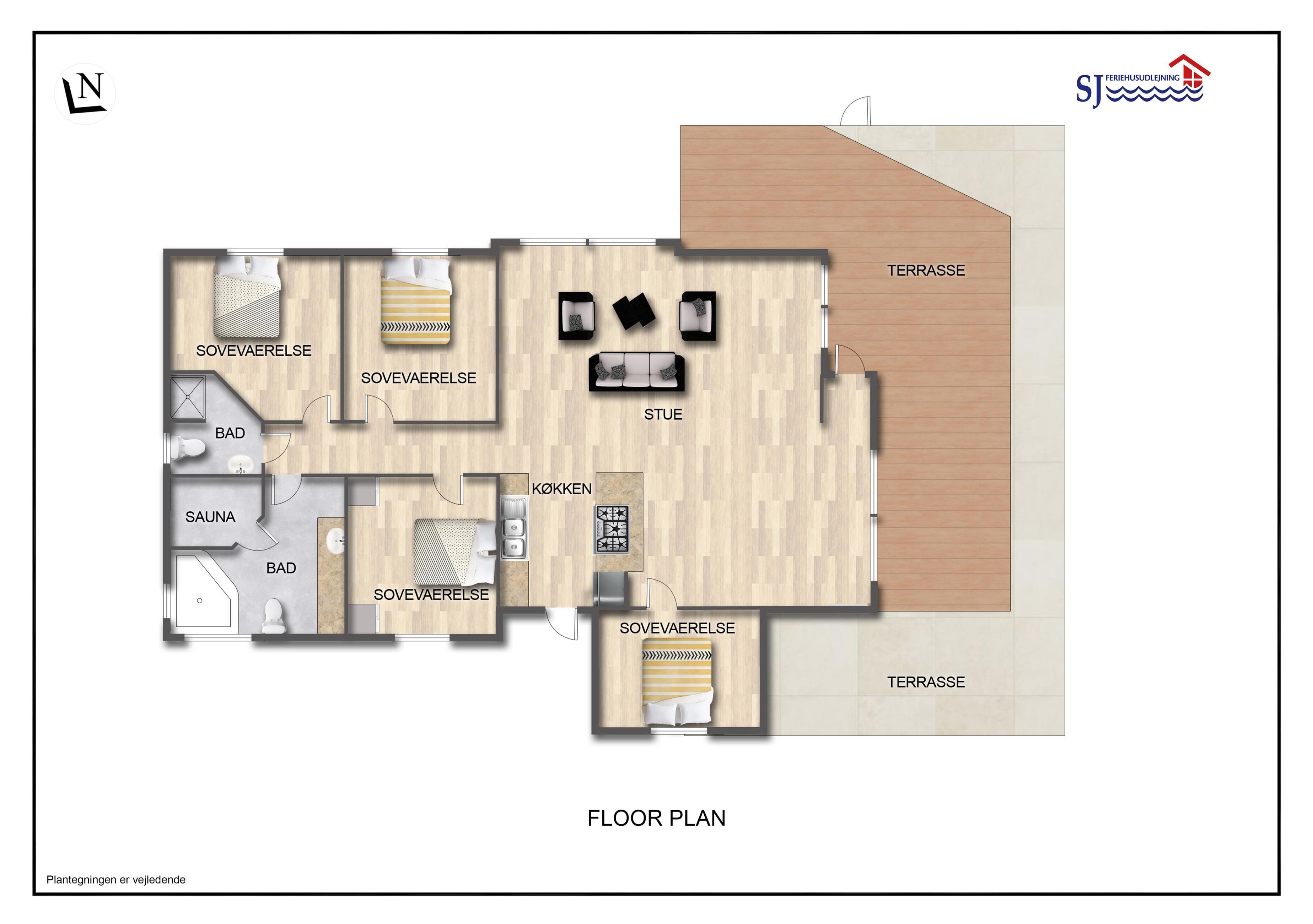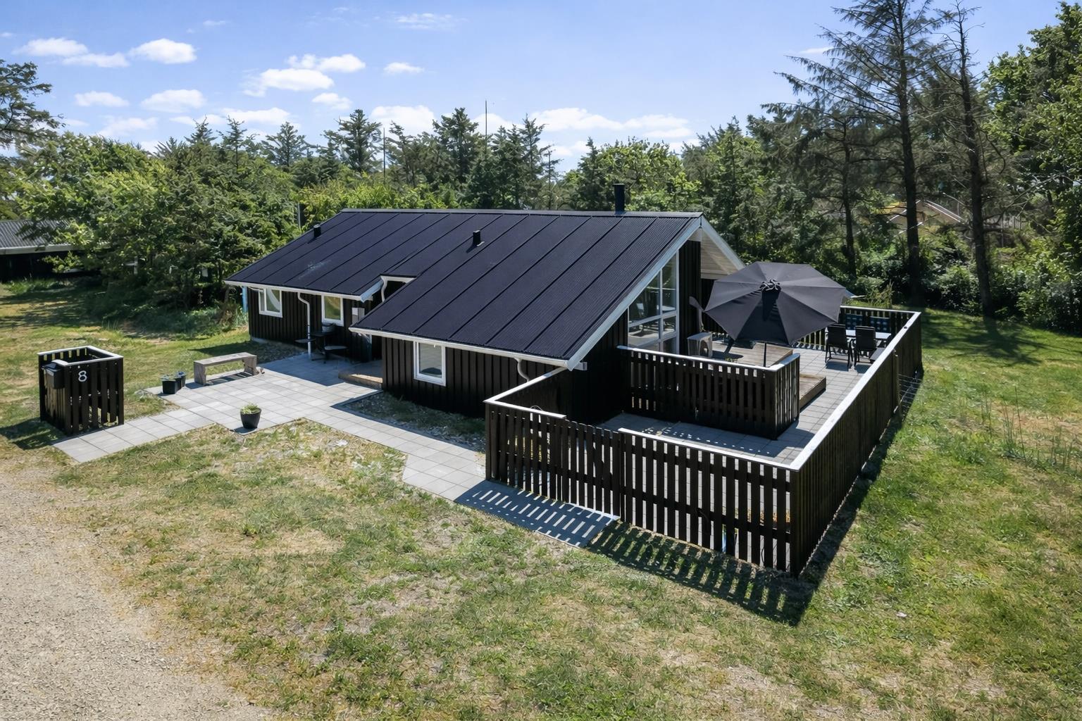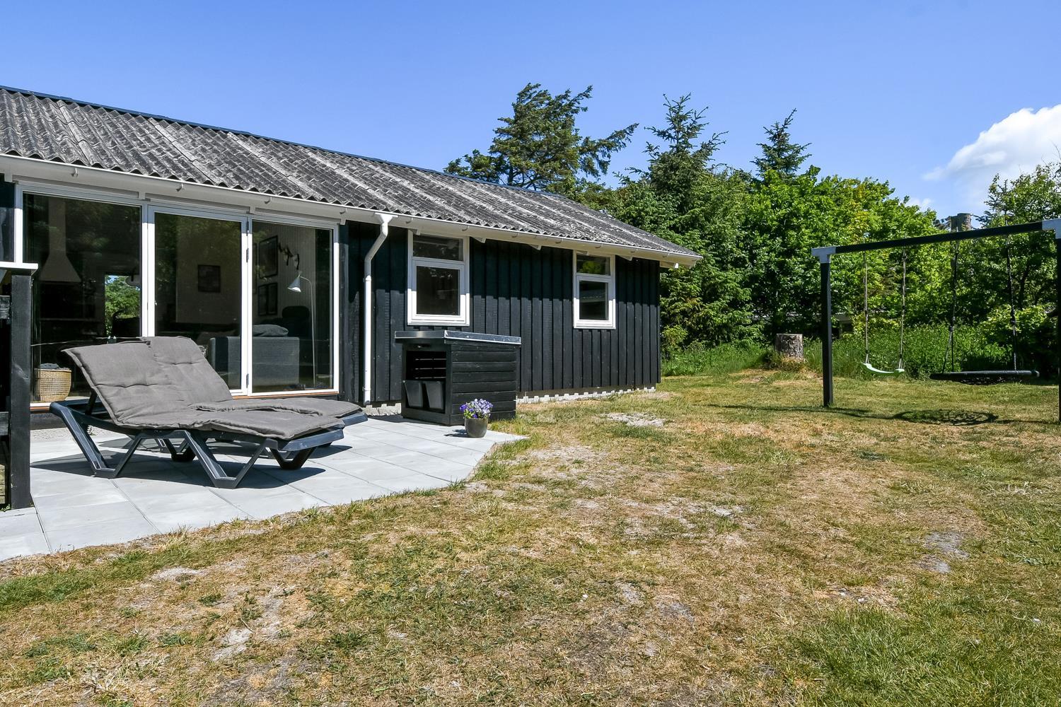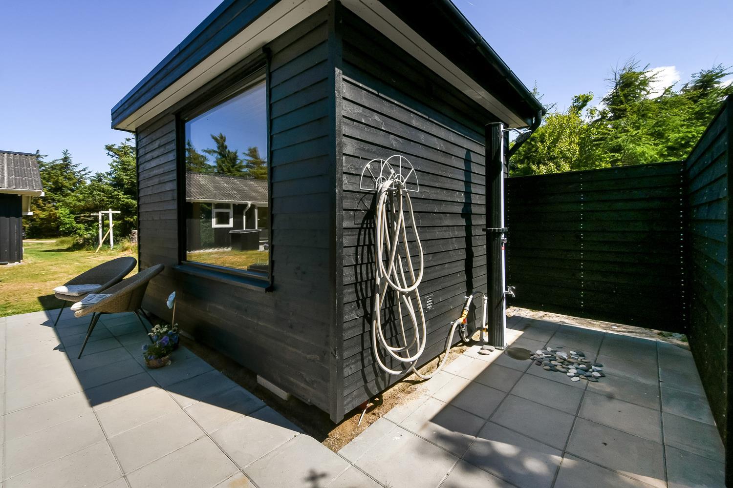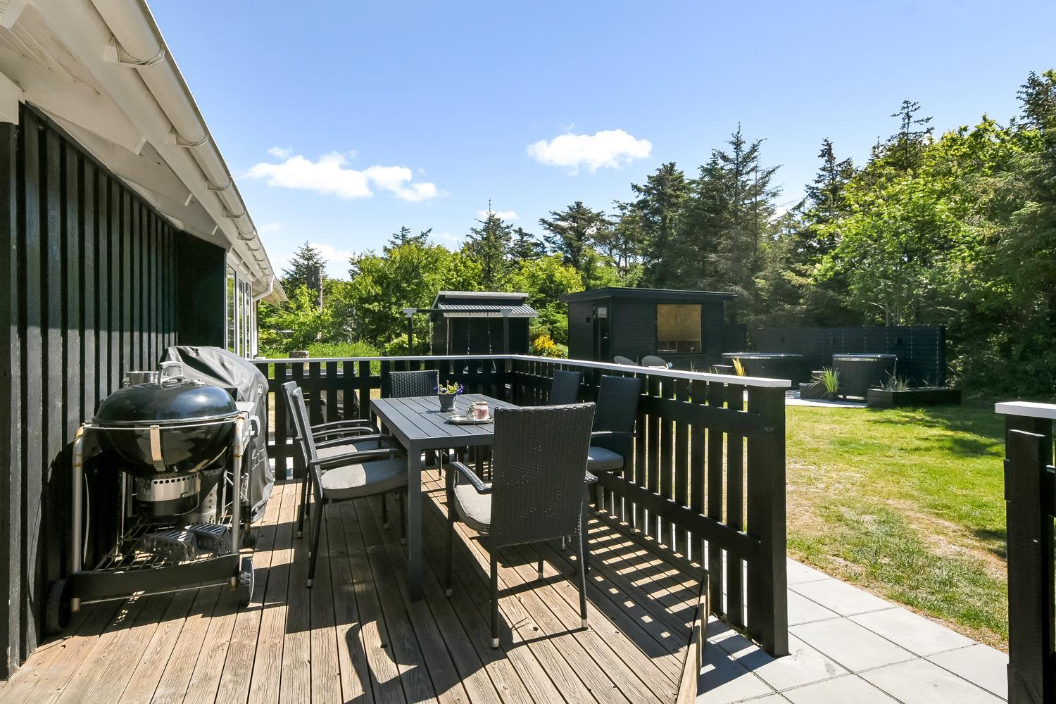 Dette skønne feriehus er beliggende på en fantastisk, sydvendt grund på ca. 1.212 m2 med mange solkroge, kun 250 meter fra Vesterhavet i det populære område Viktoriavej. Grunden er indhegnet - hvilket er perfekt for både børn og hunde. Der er også indhegnet terrasse med havemøbler, solvogne og grill så det er altid muligt at finde en plads i solen. Som noget ganske specielt er der på den private grund også en wellnesafdeling udendørs: en udendørs sauna, udendørs bruser og et koldt vands kar, udendørs vildmarksbad som opvarmes automatisk med varmepumpe i sommerhalvåret (apr-okt) og i vintermånederne (nov-mar) med brænde. Alt sammen med til at understrege at der er tænkt på det meste. Vesterhavets vandkant ligger blot 250 meter fra huset ligesom der kun er 400 meter til Vejlby Torv med købmand og restaurant Cafe John Wayne. Vejlby Klit er omgivet af vand på begge sider med Vesterhavet mod vest som altid er et besøg værd. Her kan man bade, lave sandslotte, fiske, flyve med drage, gå en lang tur og nyde ensomheden eller familiens nærvær eller blot sidde i en klit og nyde havets brusen og den afslappende ro. Det samme gælder i øvrigt den tætte beliggenhed til Ferring Sø, hvor der går en vandrerute rundt om. Herudover ligger huset tæt på en af Vestjyllands smukkeste cykel- / vandre ruter der bl.a. byder på mulighed for at se både sø og hav på samme tid. Vil man ud på tur, kan man GRATIS tage det lokale VLTJ tog, som kører fra Lemvig til Thyborøn, hvilket giver mulighed for at besøge både havnebyen Thyborøn og handelsbyen Lemvig uden at skulle bruge bilen. Inden for 25-30 minutters togtur kan flere aktiviteter samt shopping muligheder nås.