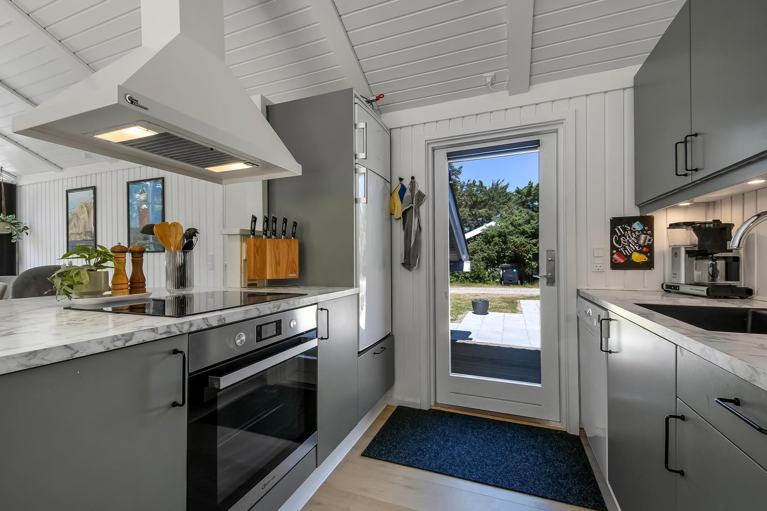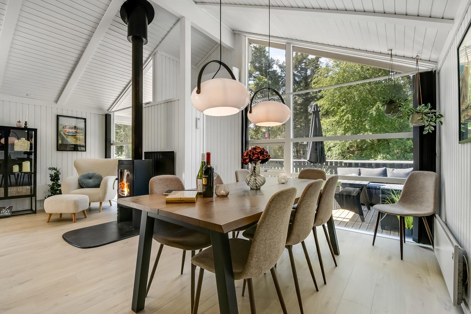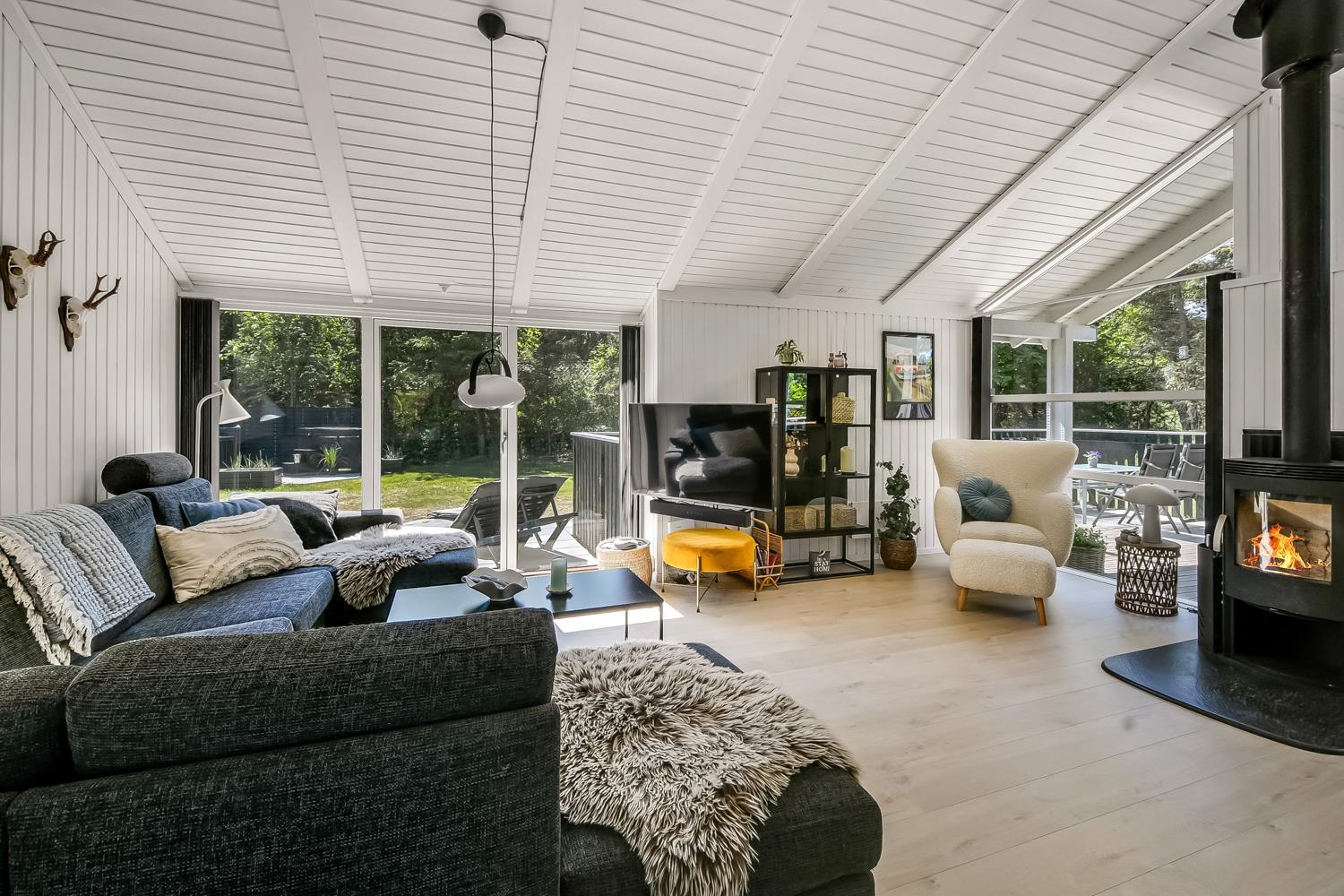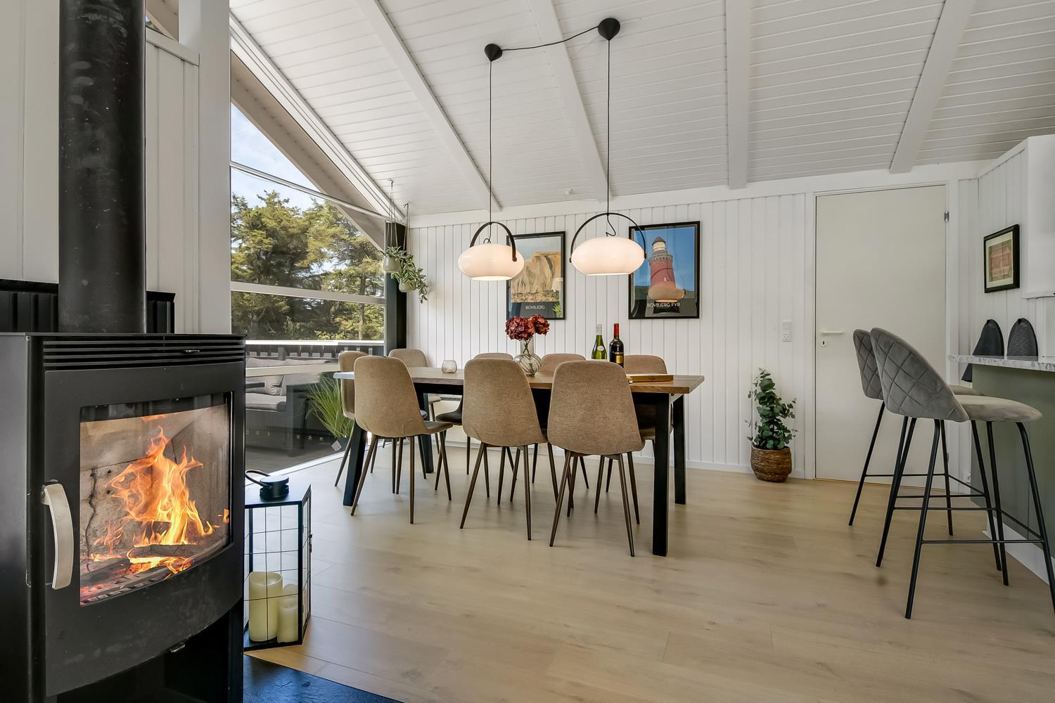 Træd ind i dette skønne og rummelige feriehus på 92 m2, hvor komfort og hygge mødes. Med fire godt indrettede soveværelser (1DS, 1DS, 1DS, 2KS). Herudover er der også hyggelig hems med plads til yderligere to personer. En rigtig lille hule som børnene vil elske. Der rigeligt med plads til hele familien eller gruppen af venner – dog må huset beboes af max. 8 personer. Den åbne opholdsstue, flot indrette i lyse og venlige farver. Inviterer til afslapning i den hyggelig hjørnesofa, foran den knitrende brændeovn, mens I kan nyde jeres yndlingsfilm på det moderne TV med danske og tyske kanaler. Den opsatte varmepumpe søger for fantastisk indeklima året rundt og bidrager til en energisparende opvarmning af huset. Køkkenhjørnet er en sand kulinarisk oase, udstyret med alt hvad I behøver for at tilberede lækre måltider. Samtalekøkkenet har alt i service, køkkengrej. Opvaskemaskine, mikroovn, airfryer, keramiske kogeplader, indbygningsovn, køle-/fryseskab og emhætte. Spisearrangementet er praktisk placeret lige ved køkkenet og giver jer mulighed for at dele uforglemmelige øjeblikke sammen.