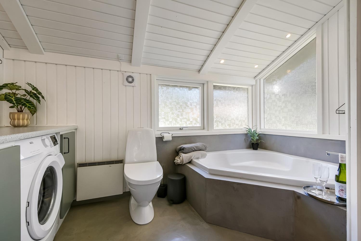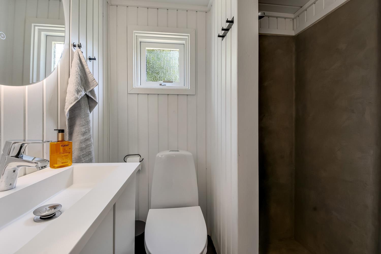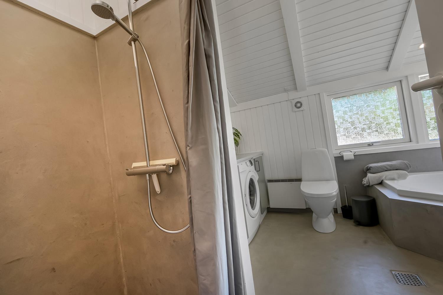 Husets 2 badeværelser er helt unikke. De er begge udført i mikrocement som giver en helt speciel oplevelse. Begge har med toilet, håndvask, bruser og gulvvarme, men på det største badeværelse er der også spabad og direkte adgang til sauna. Puslepude, babubadekar, barneseng og højstol til de små medrejsende. I hele huset er det praktiske og rengøringsvenlige gulve. Der er tænkt på alt, og ejer af huset passer og plejer huset, så det altid præsenteres fra den bedste side.