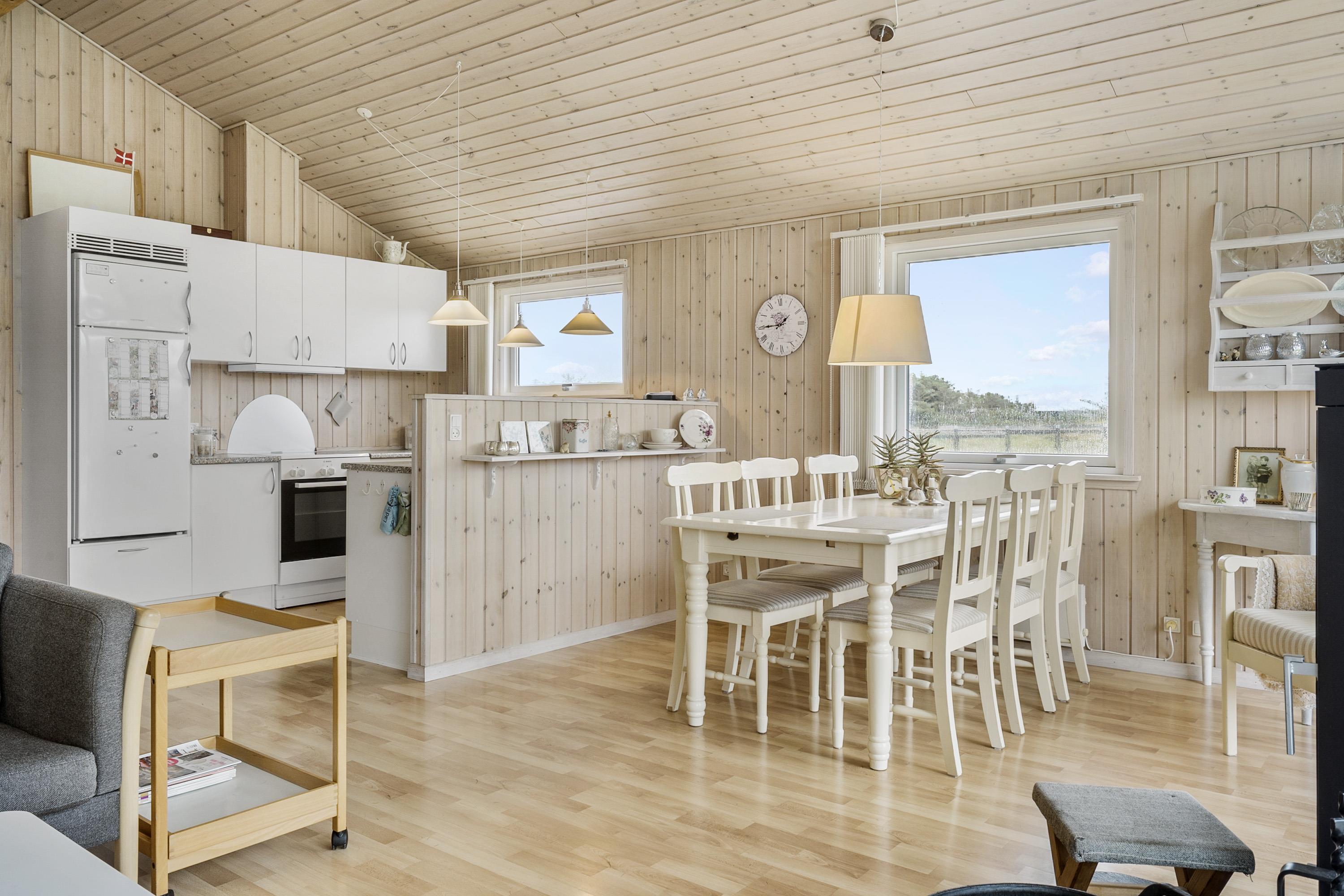 Hyggeligt feriehus til 6 personer i Vejlby Klit med dejlig åbent og lyst kombineret køkken og opholdsstue. På den anden side af vejen, fører der en sti direkte til stranden gennem klitterne. Gratis internettilgang. Husdyr ikke tilladt.