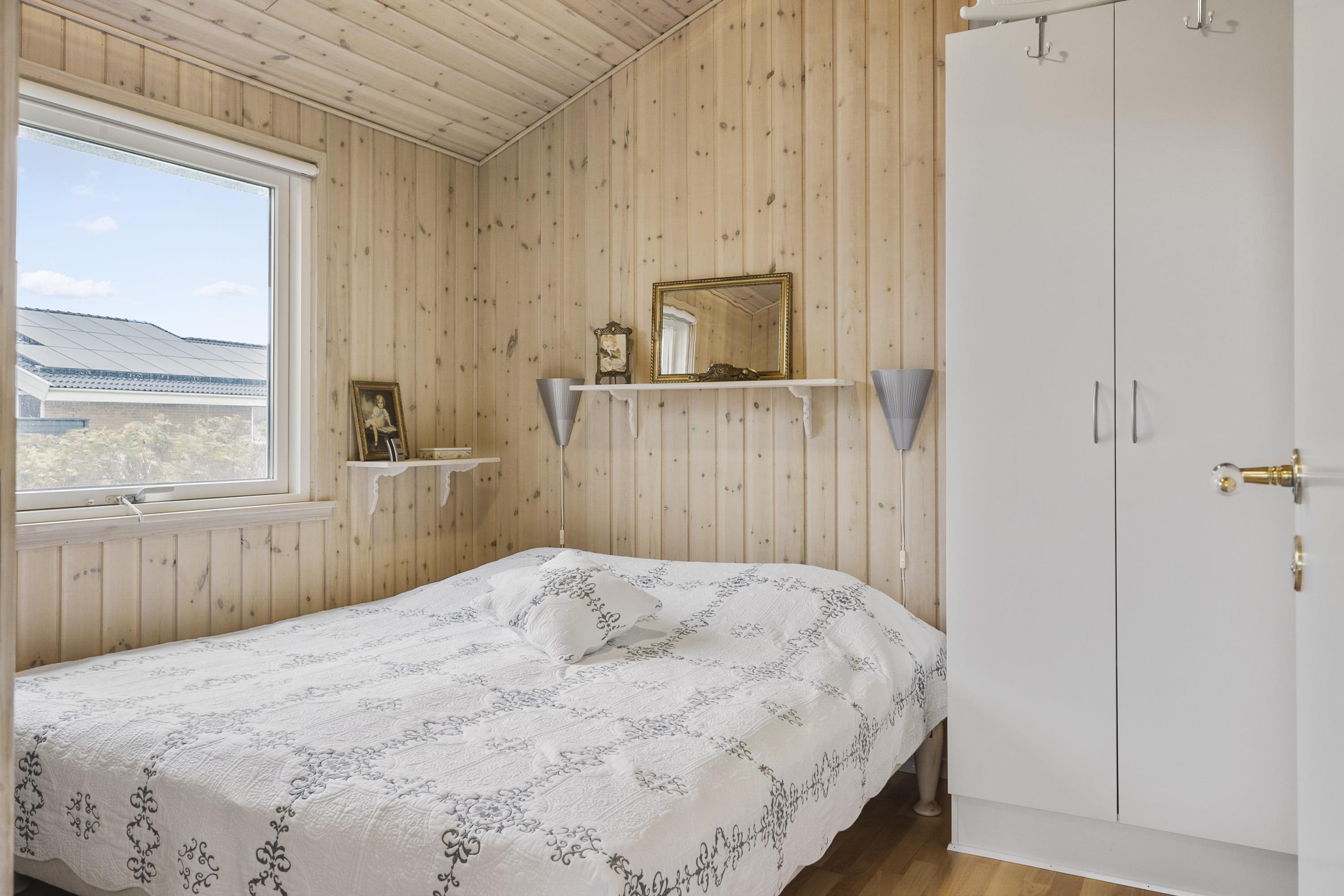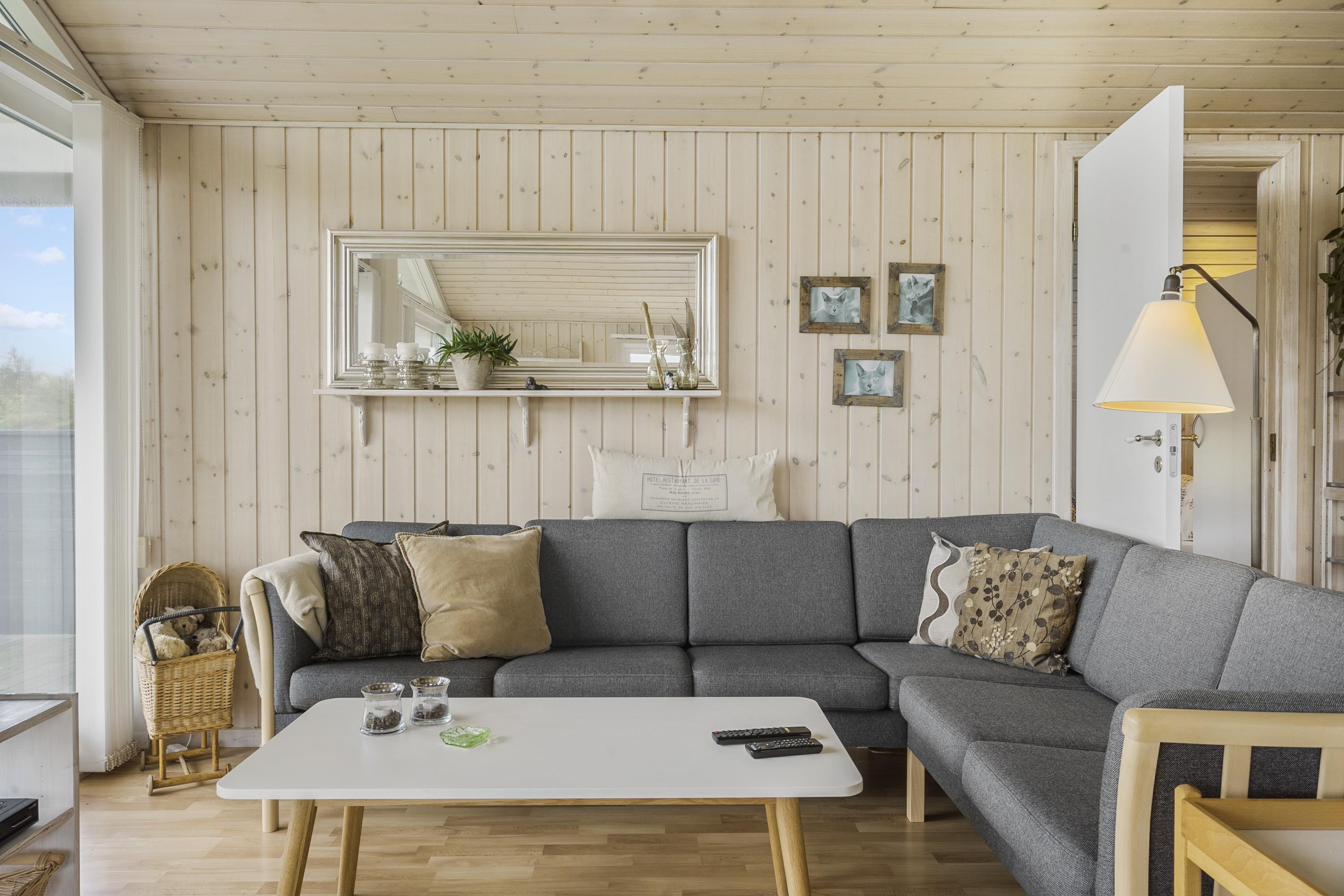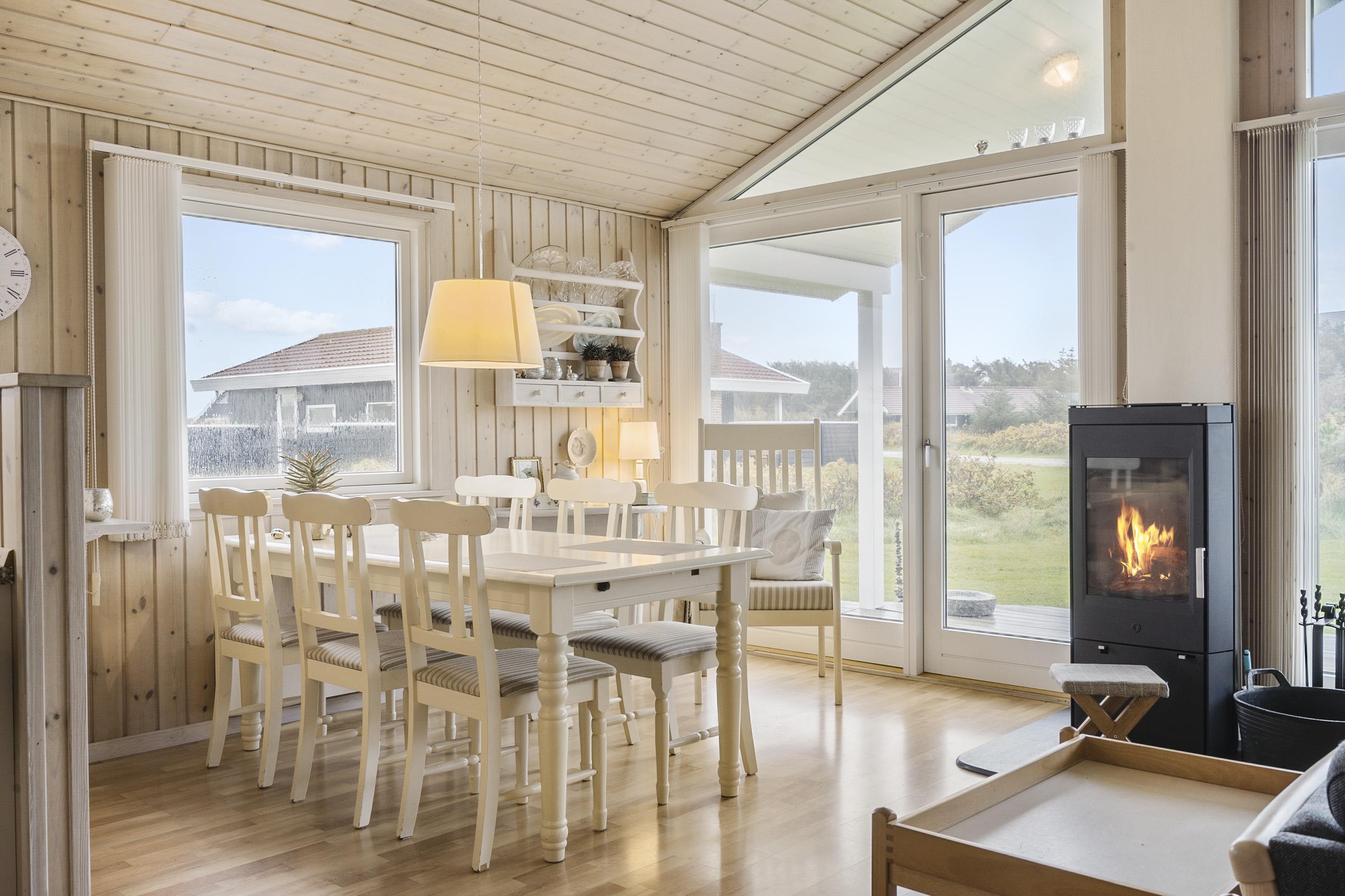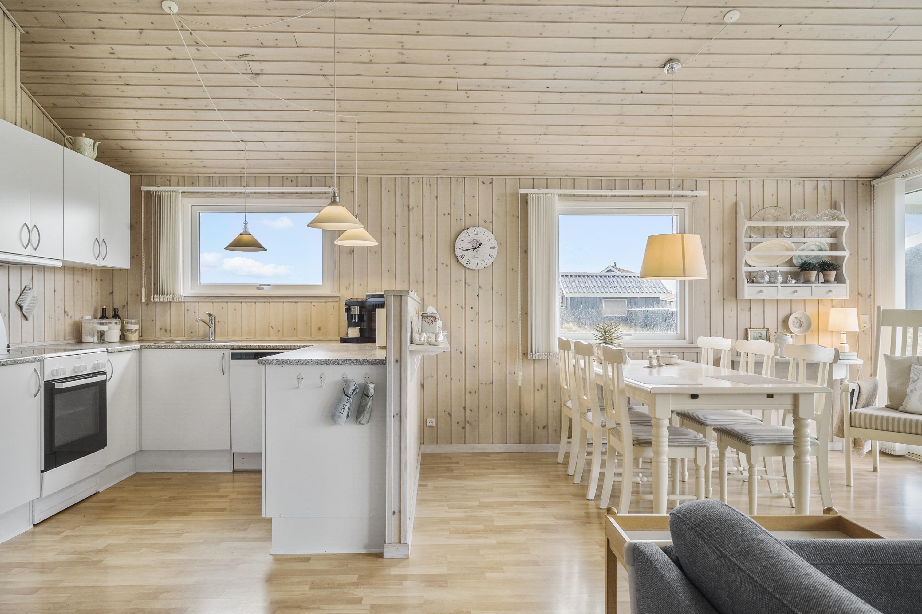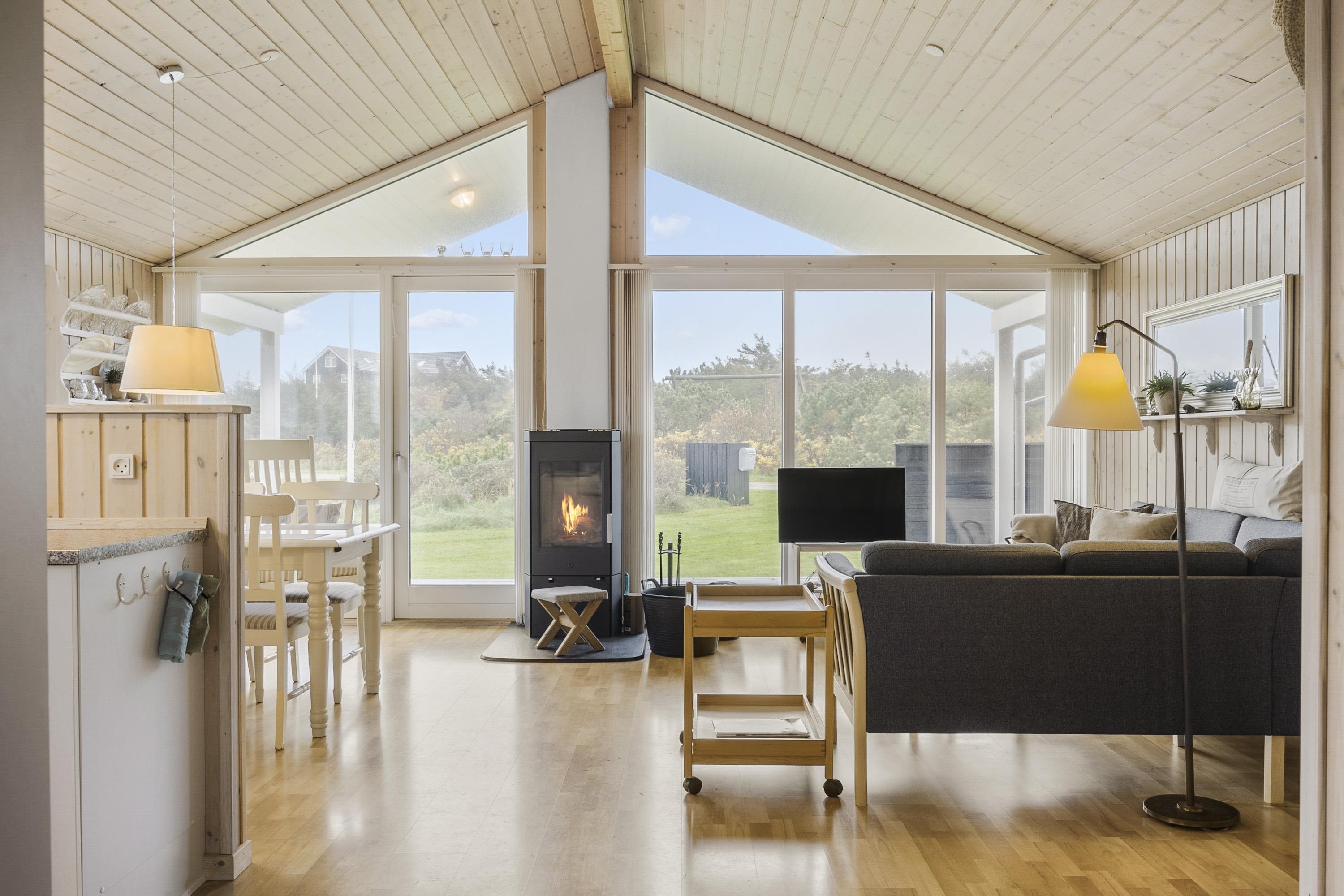 Feriehuset er indbydende, lyst og hyggeligt indrettet. Stuen og køkkenet er lyst med store vinduespartier, som giver et godt lysindfald, loft åben til kip. Opholdsstuen er indrettet med polstermøbler, TV med danske og tyske programmer. I stuen kan man nyde varmen fra brændeovnen eller varmepumpen, som er med til at mindske forbrugsomkostningerne. Spiseafdeling er placeret tæt på køkkenet. Åbent og lyst køkken. Køkkenet er veludstyret og indeholder bl.a. glaskeramisk komfur, mikroovn, køle-fryseskab og opvaskemaskine. 3 gode soverum: 1DS + 1DS + 1S. Laminatgulve i hele huset som er meget rengøringsvenlige. Badeværelse med toilet, håndvask, bruser, vaskemaskine, spa og adgang til sauna, klinkegulv. Ikke rygerhus. Husdyr ikke tilladt.