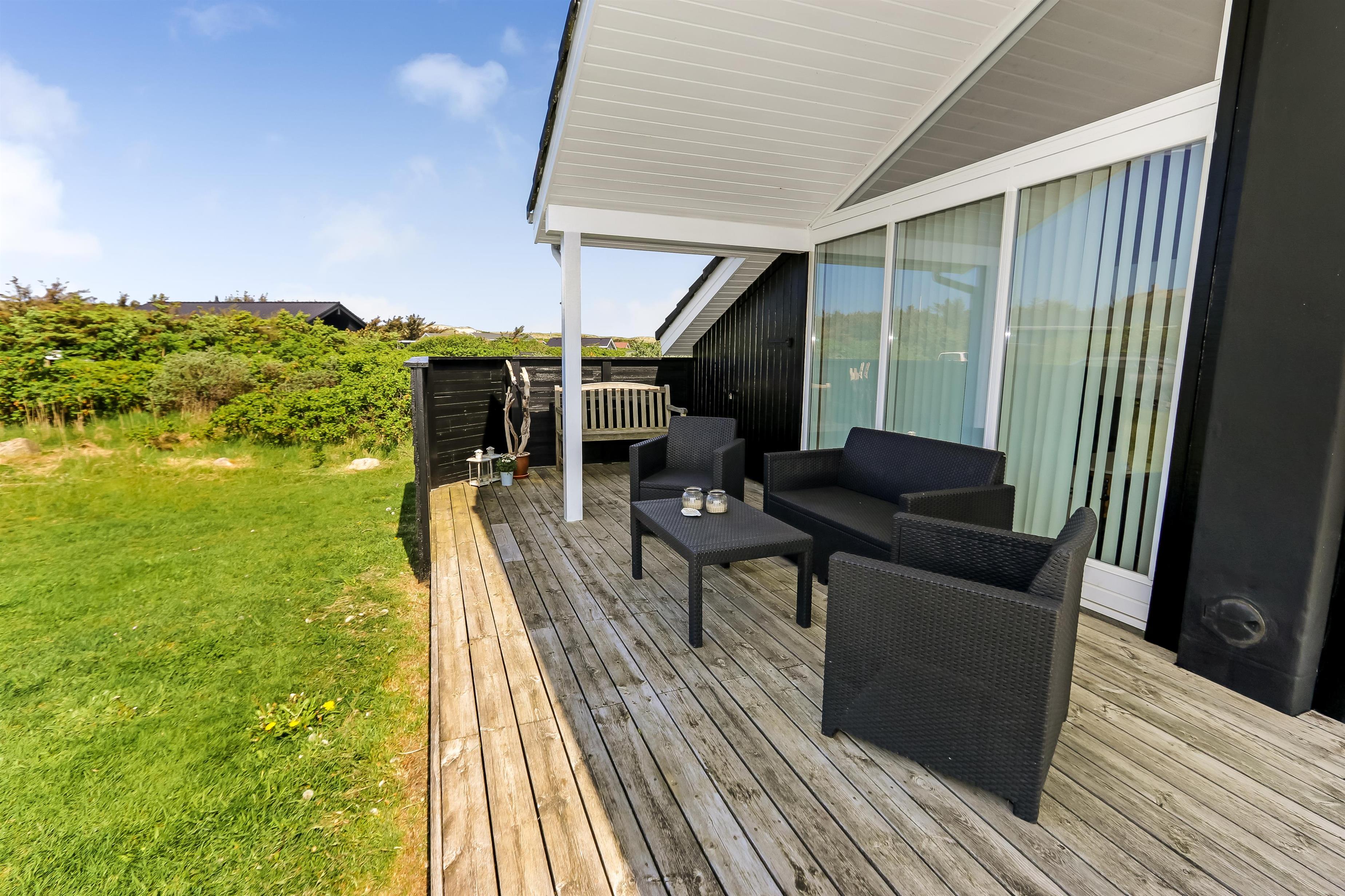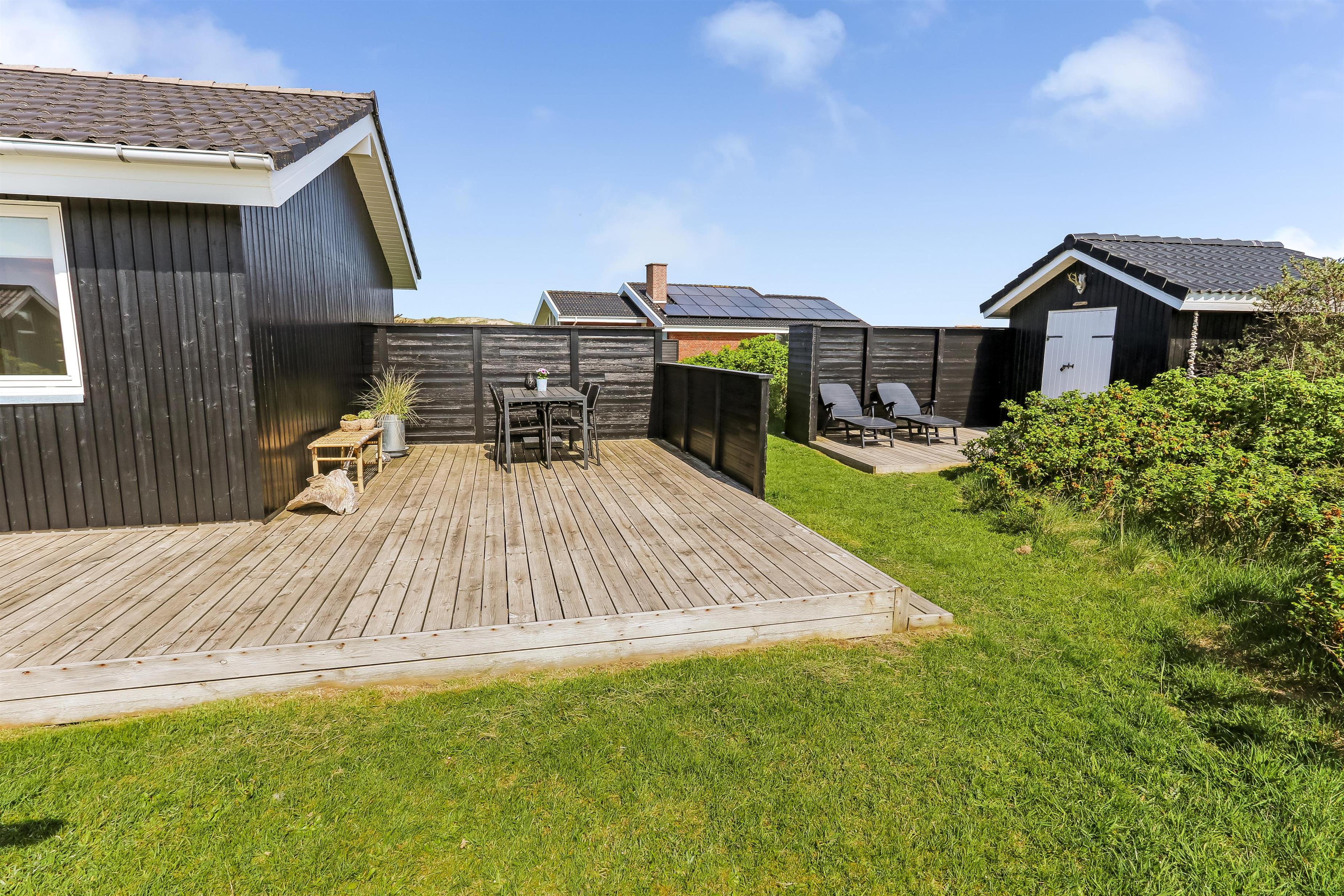 Huset er beliggende på en 1200 m2 velplejet grund. Fra huset er der udgang til en åben/delvis overdækket terrasse, hvor der er havemøbler og grill. Havemøblerne kan rykkes rundt på terrassen, så man kan sidde i læ for vinden eller i solen.