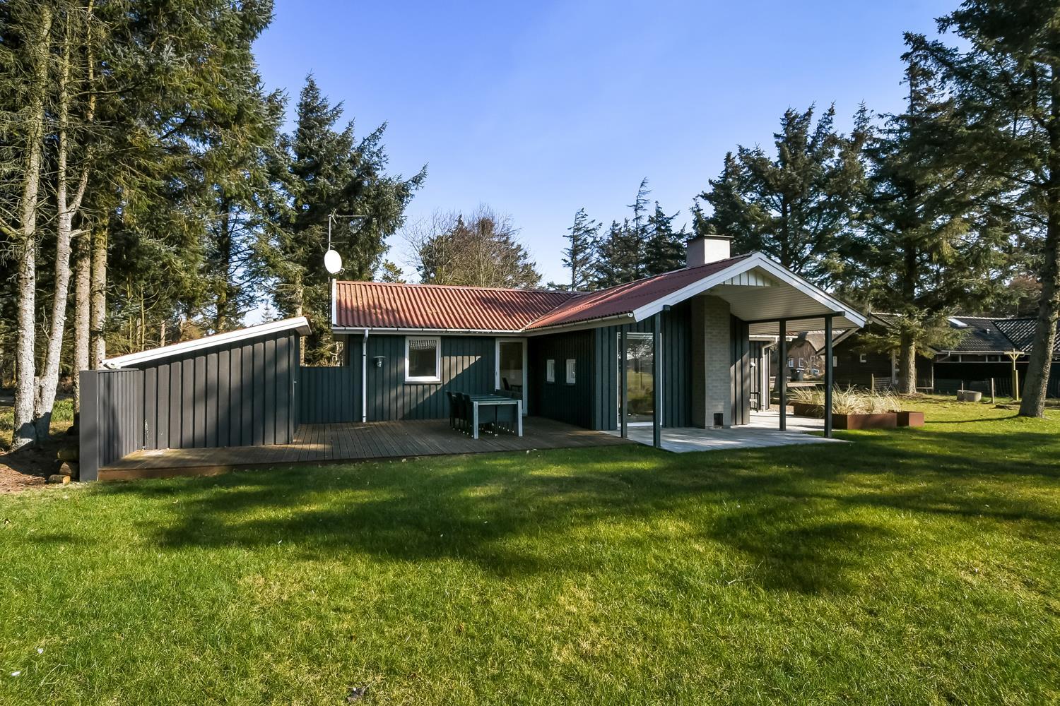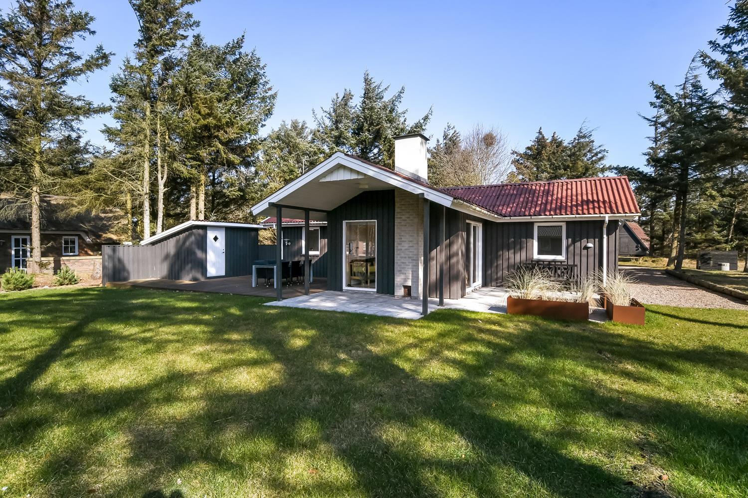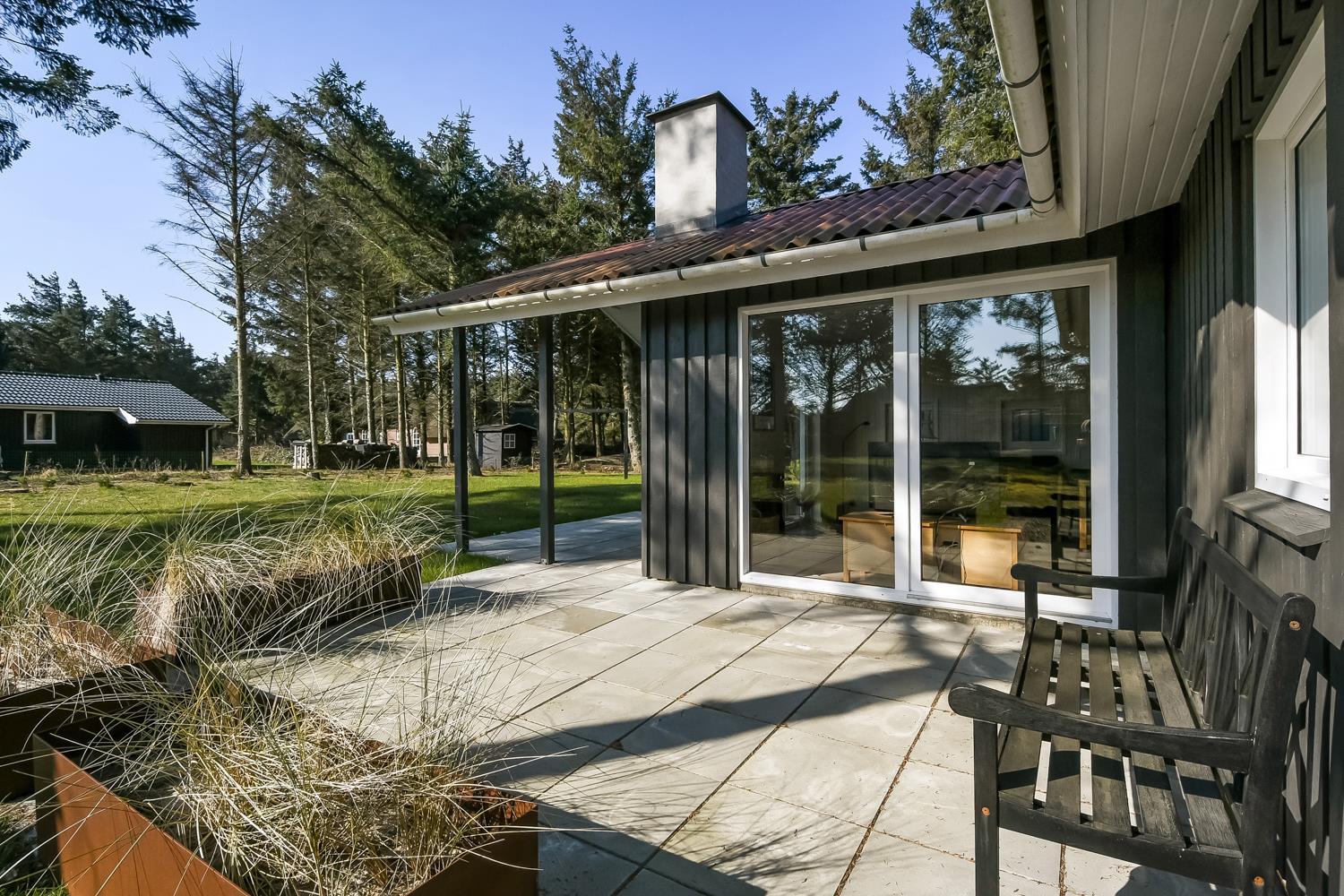 Huset ligger på en ca. 1.200m2 dejlig skovgrund med mange solkroge. Terasseanlægget byder på gode havemøbler, liggestole, hynder, parasol og grill. Tæt ved terrassen er der opstillet en ny gynge, så det er muligt at holde øje med de små direkte fra terrassen, som også er perfekt til den hyggelige grillaften. Den velholdte naturgrund er omkranset af høje træer som giver dejlig læ, så solen kan nydes både morgen og aften. Kun ca. 300m fra huset ligger det brusende Vesterhav som hver dag byder på nye maleriske oplevelse. I sæsonen kan du hente morgenbrød, købmandsvarer eller måske invitere familien ud at spise kun ca. 5 min på gåben fra huset. Så hvad enten du er til aktiv ferie eller total afslapning danner dette dejlige feriehus den perfekte ramme både hvad angår hus, beliggenhed og omgivelser.