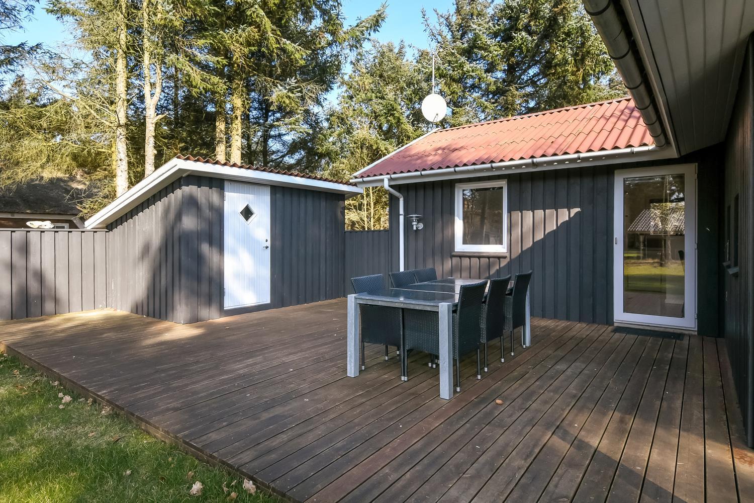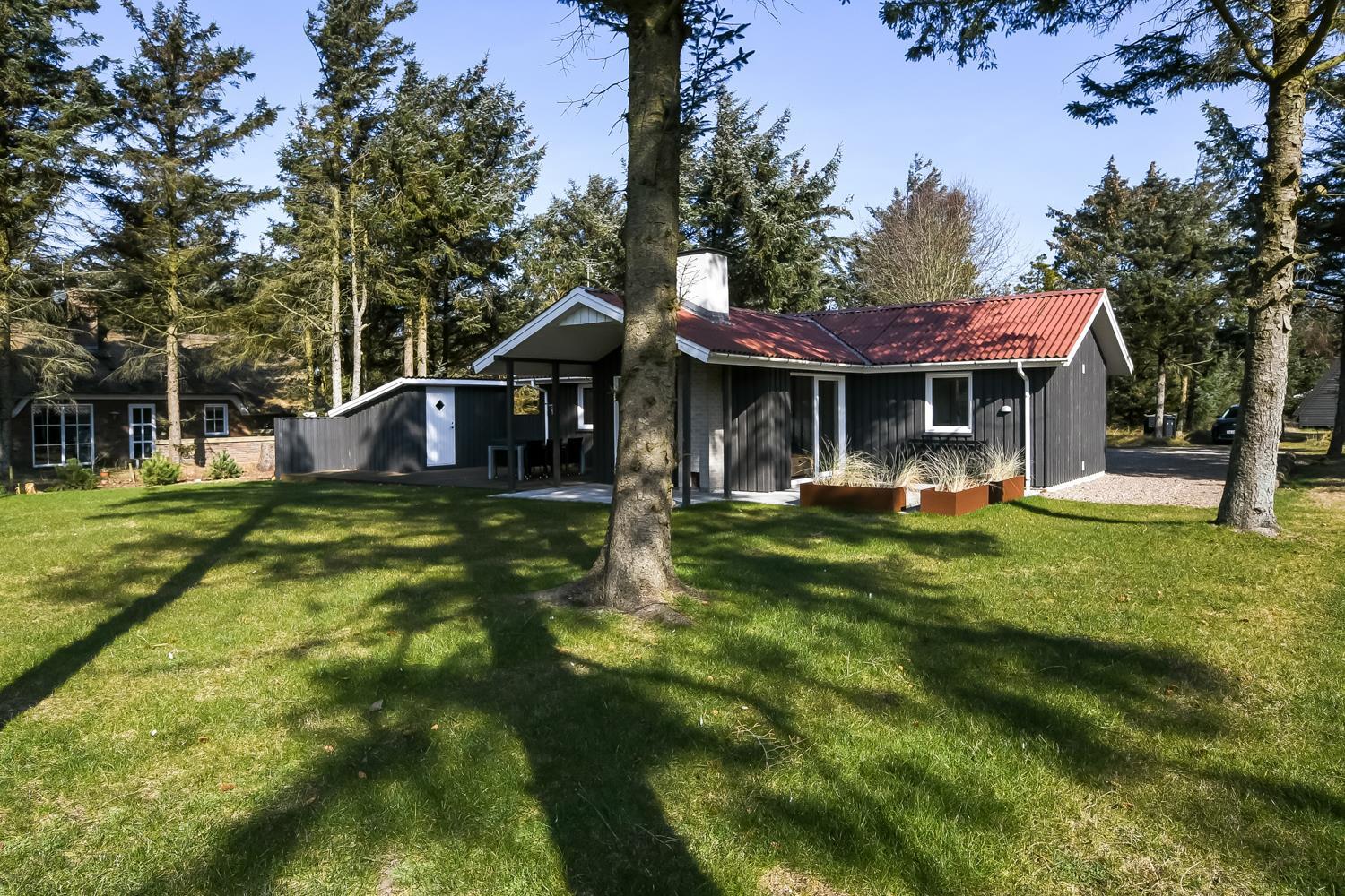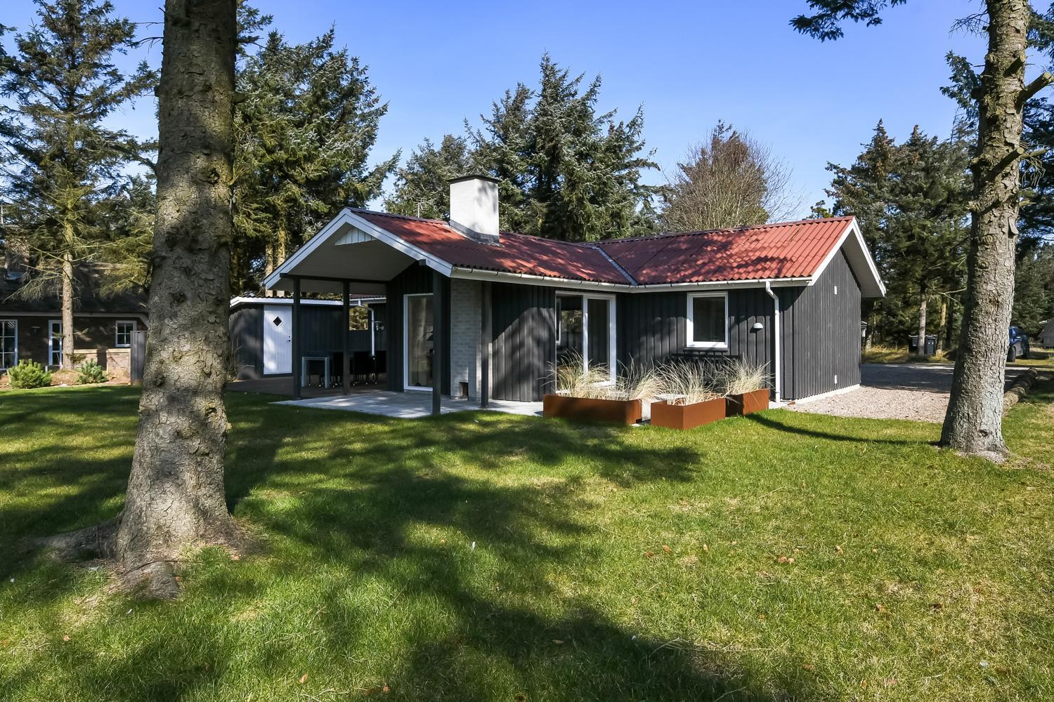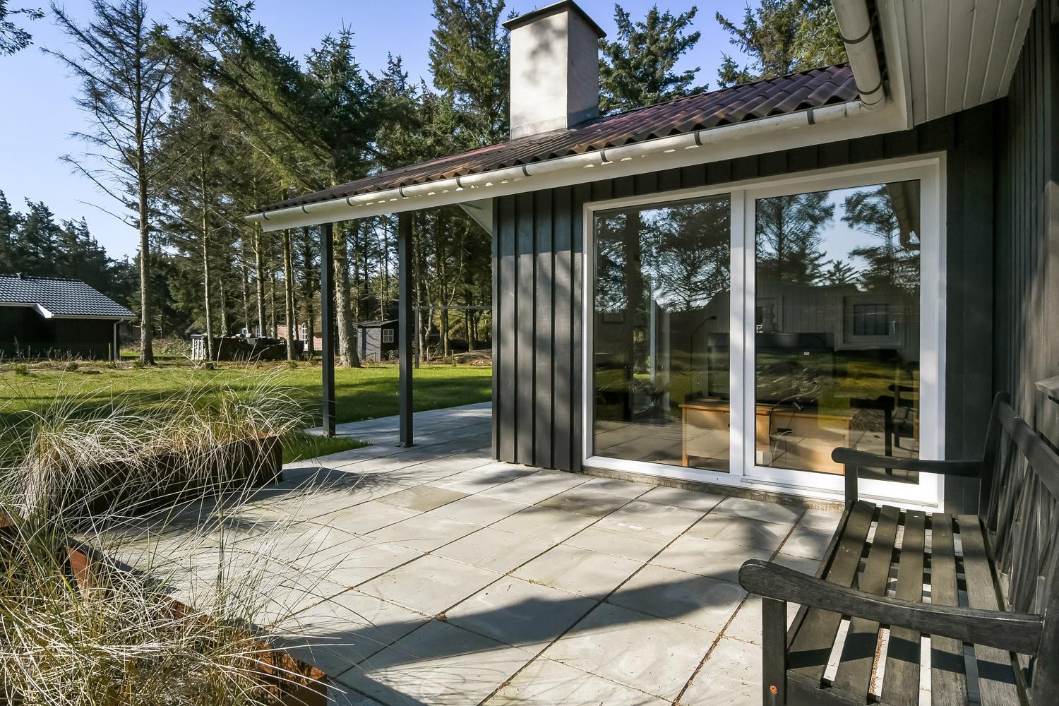 Huset ligger på en ca. 1.200m2 dejlig skovgrund med mange solkroge. Terasseanlægget byder på gode havemøbler, liggestole, hynder, parasol og grill. Tæt ved terrassen er der opstillet en ny gynge, så det er muligt at holde øje med de små direkte fra terrassen, som også er perfekt til den hyggelige grillaften. Den velholdte naturgrund er omkranset af høje træer som giver dejlig læ, så solen kan nydes både morgen og aften. Kun ca. 300m fra huset ligger det brusende Vesterhav som hver dag byder på nye maleriske oplevelse. I sæsonen kan du hente morgenbrød, købmandsvarer eller måske invitere familien ud at spise kun ca. 5 min på gåben fra huset. Så hvad enten du er til aktiv ferie eller total afslapning danner dette dejlige feriehus den perfekte ramme både hvad angår hus, beliggenhed og omgivelser.