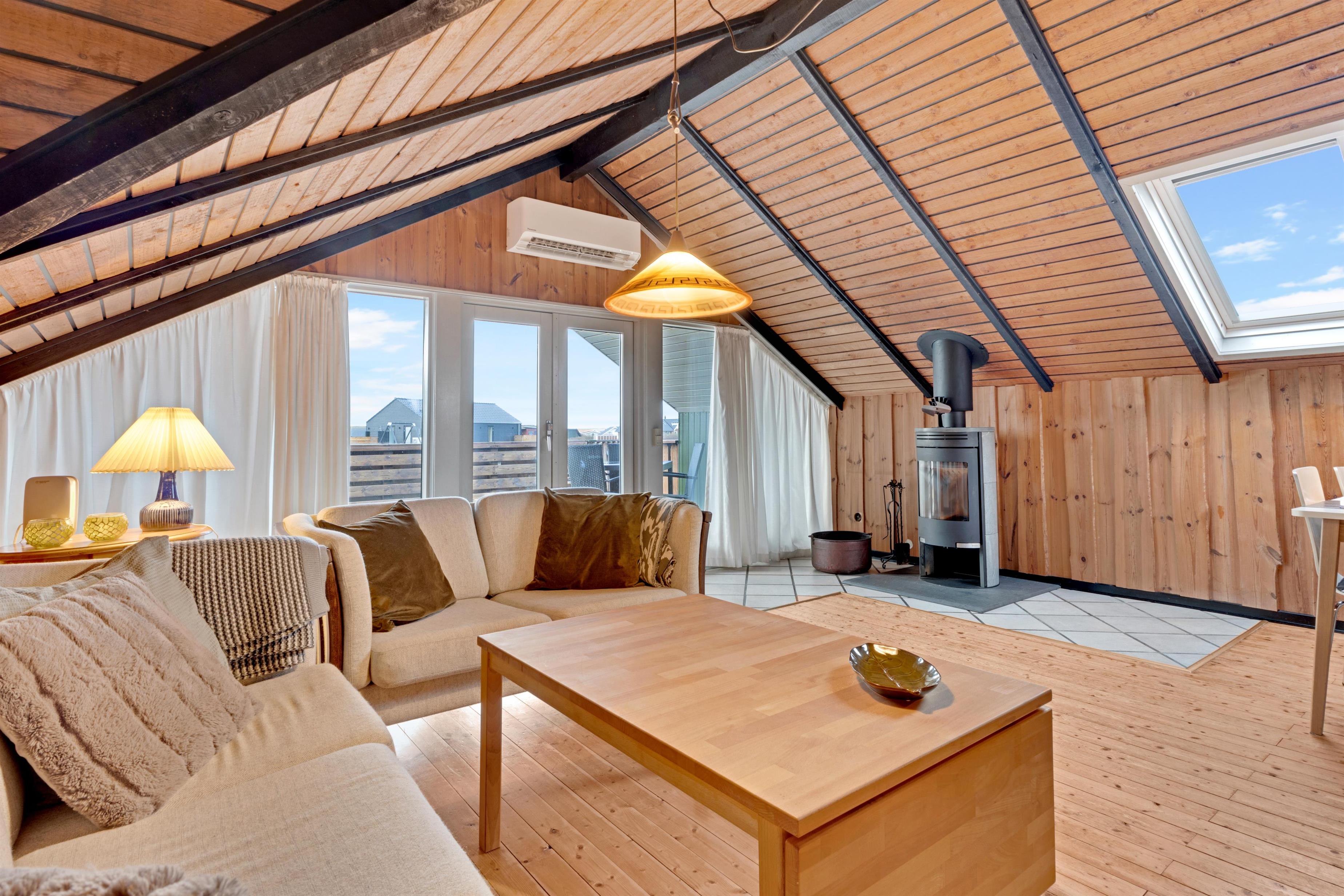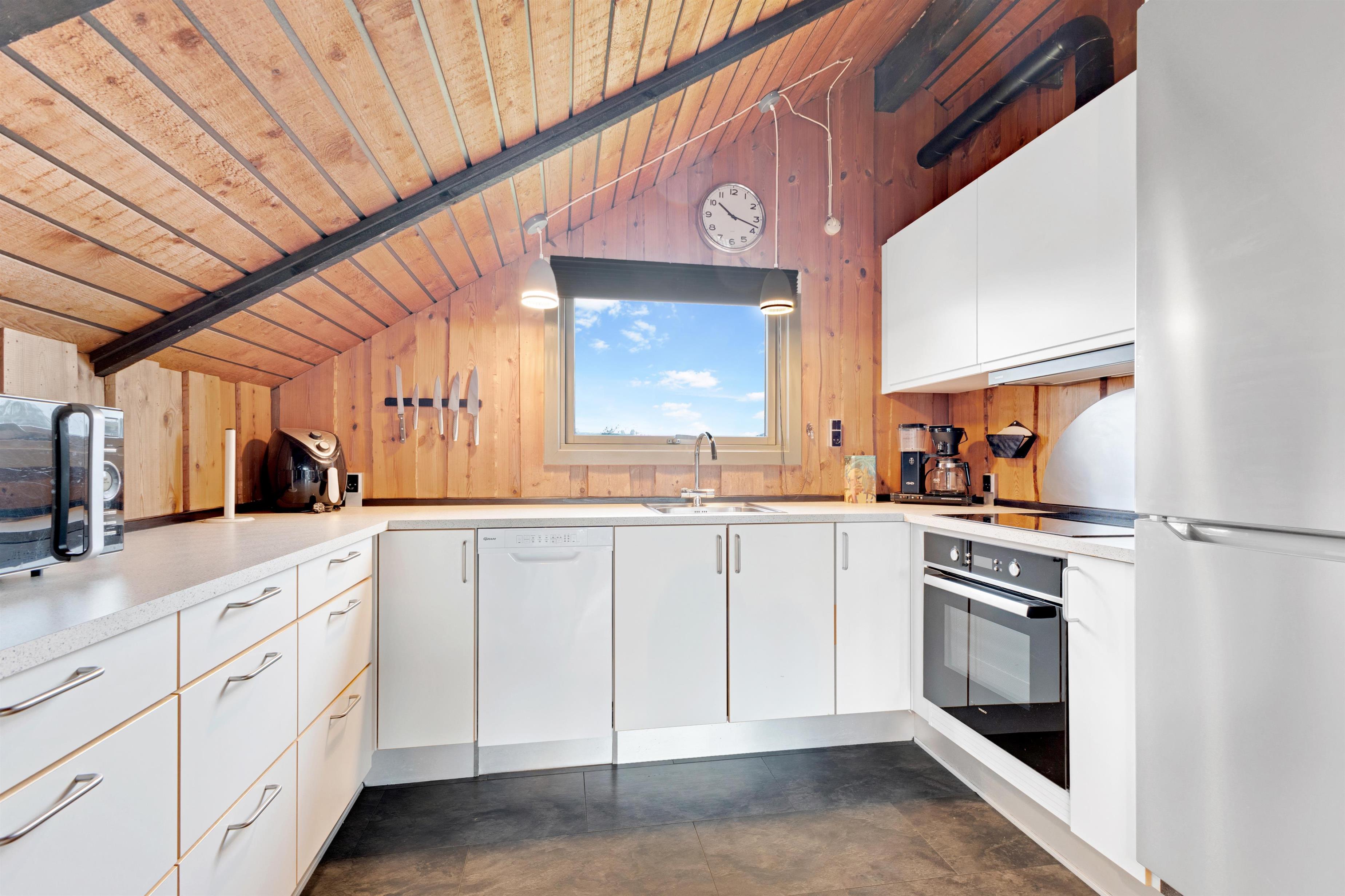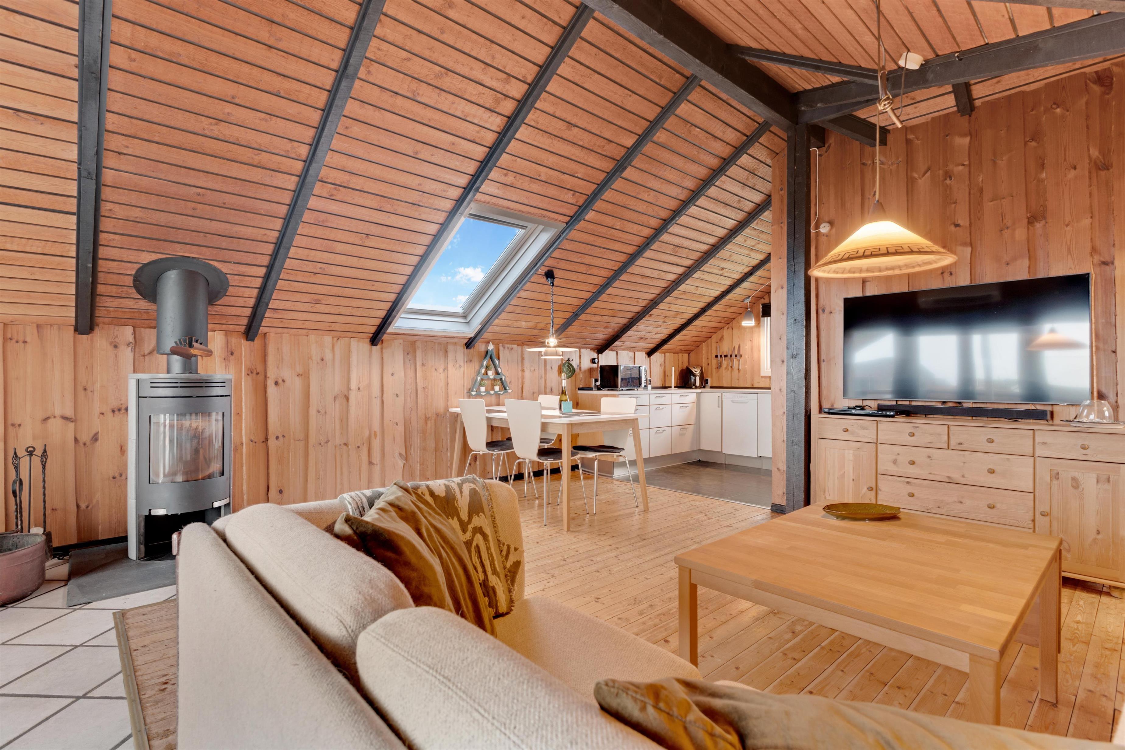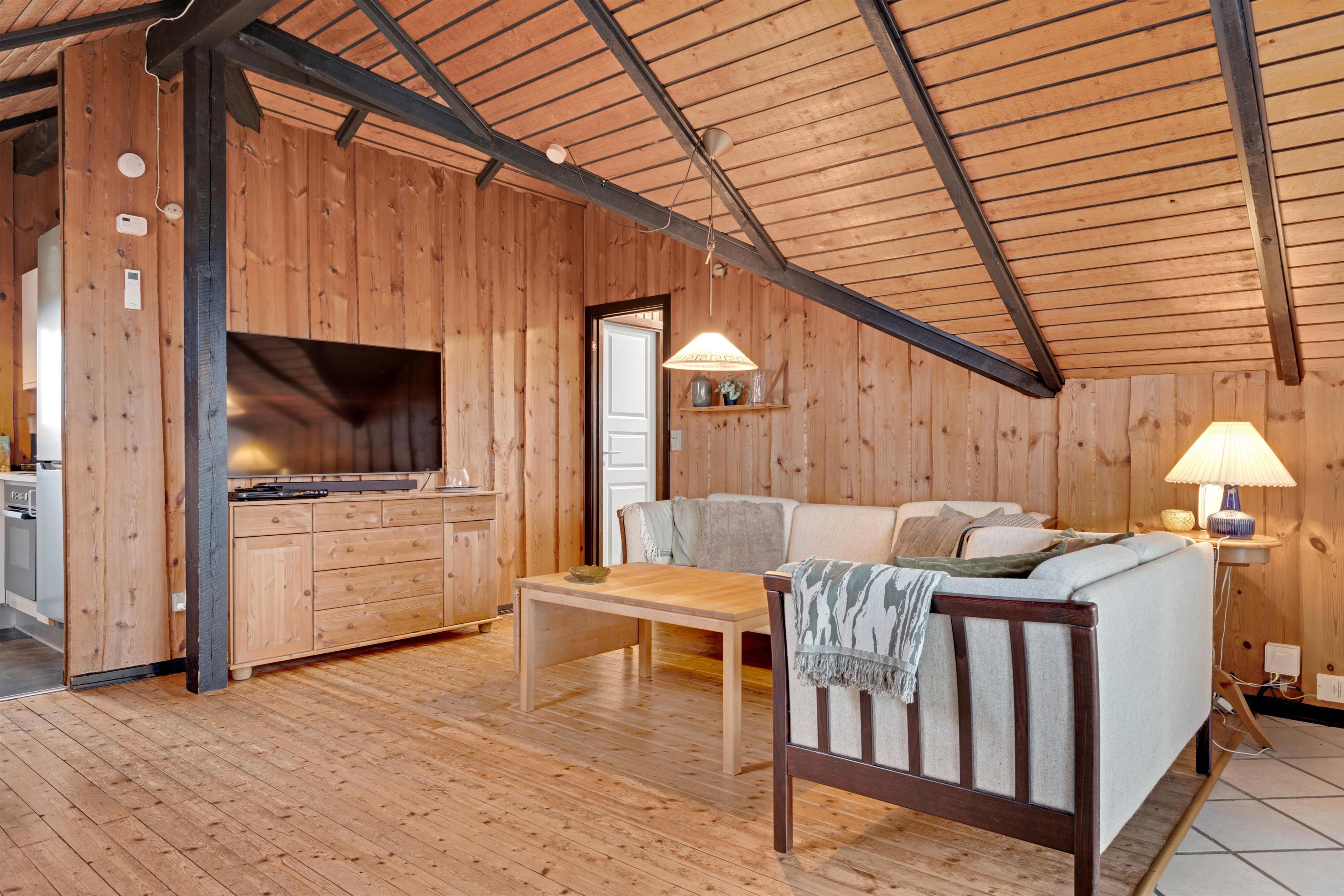 Huset består af et stort køkken-stue-alrum og så er der sove- og badeværelsesafdelingen. Fra begge afdelinger er der direkte adgang til det store, indhegnet terrasseanlæg. Nyt køkken med glaskeramisk komfur, mikrobølgeovn, køle-/fryseskab, opvaskemaskine og miniovn. Herfra er der kort vej til den store sofagruppe med sofabord i stuen hvortil der hører et smart-tv med sound bar, danske og tyske programmer samt mulighed for streaming af TV / radio / Apps via Chromecast. Så har du en mobiltelefon eller en anden devise med kan du streame hvad du nu har abonnement. Har man lyst til radio eller musik kan i høre det fra TV, PlayStation 3 eller fra højtaler med mulighed for at tilslutte IPhone. Til stuen hører også en brændeovn, så man får den helt rigtige sommerhusstemning under knasterne på loftet og der er desuden installeret varmepumpe som hjælper med et lavere forbrug. Mindre badeværelset består af et toilet, håndvask og bruser samt en lille vaskemaskine, tørretumbler og i samme afdeling af huset er der 2 soveværelser. Et soverum med dobbeltseng (140 x 200), og det andet soverum er med 2 enkelt senge. Der er også et anneks med 2 senge.