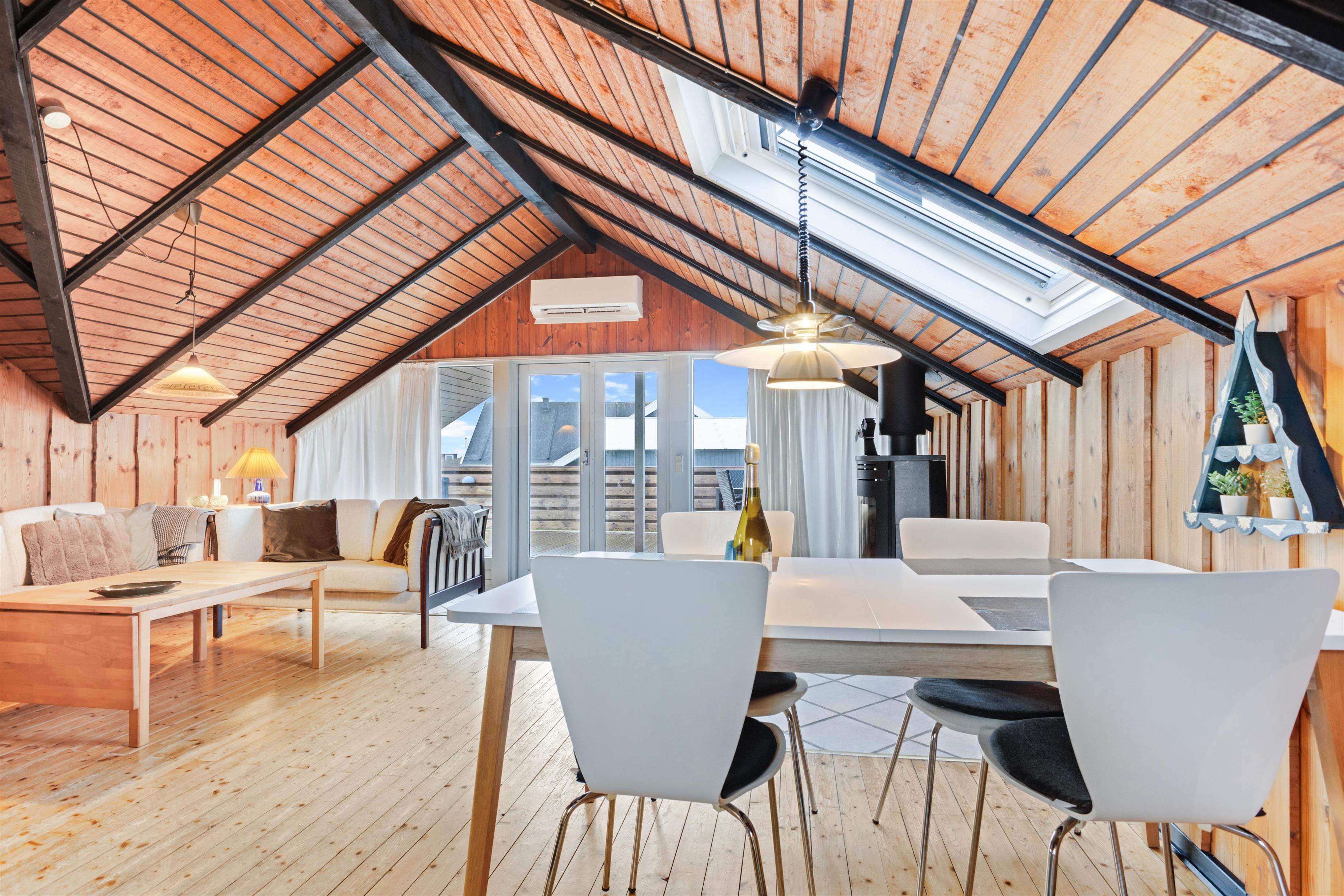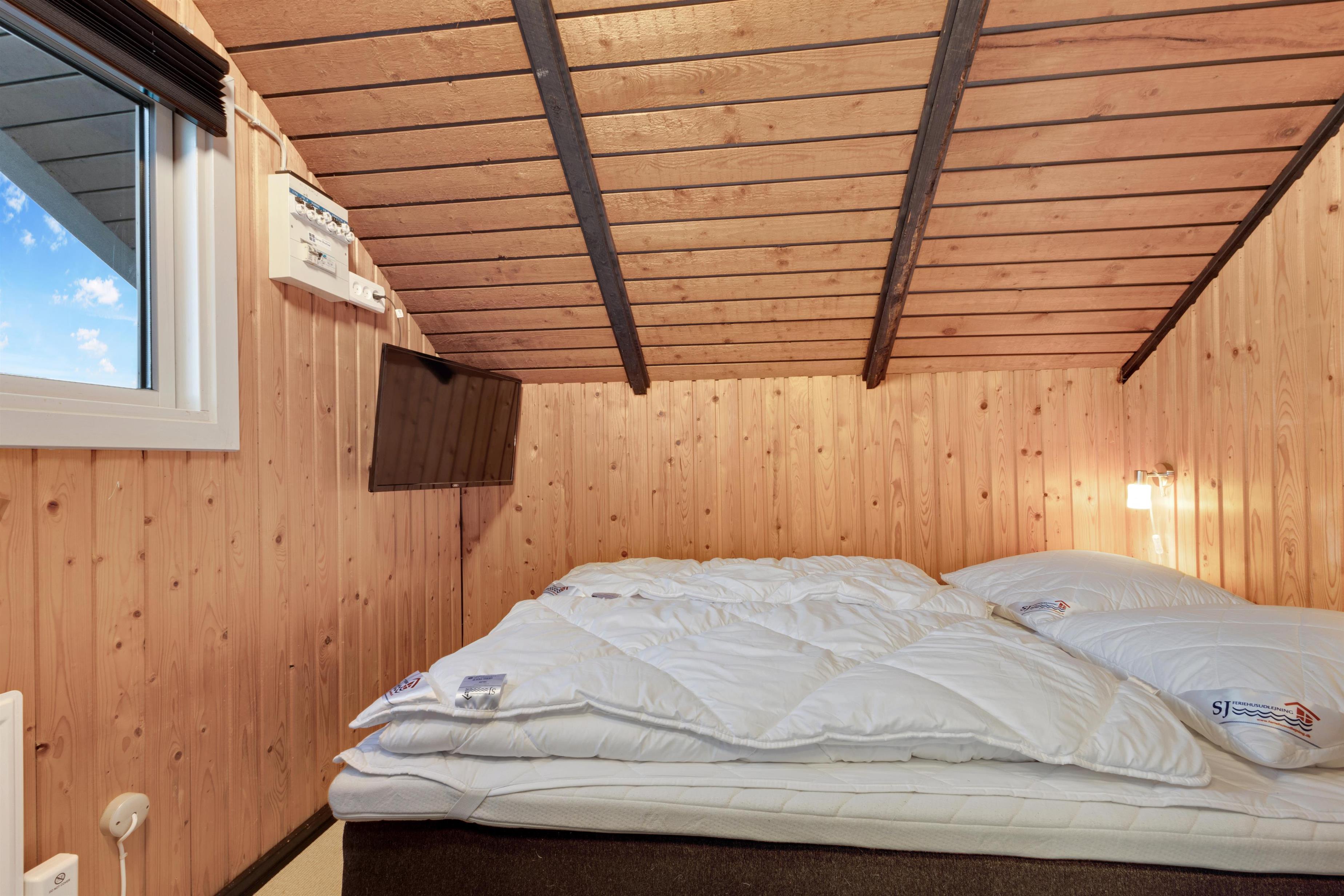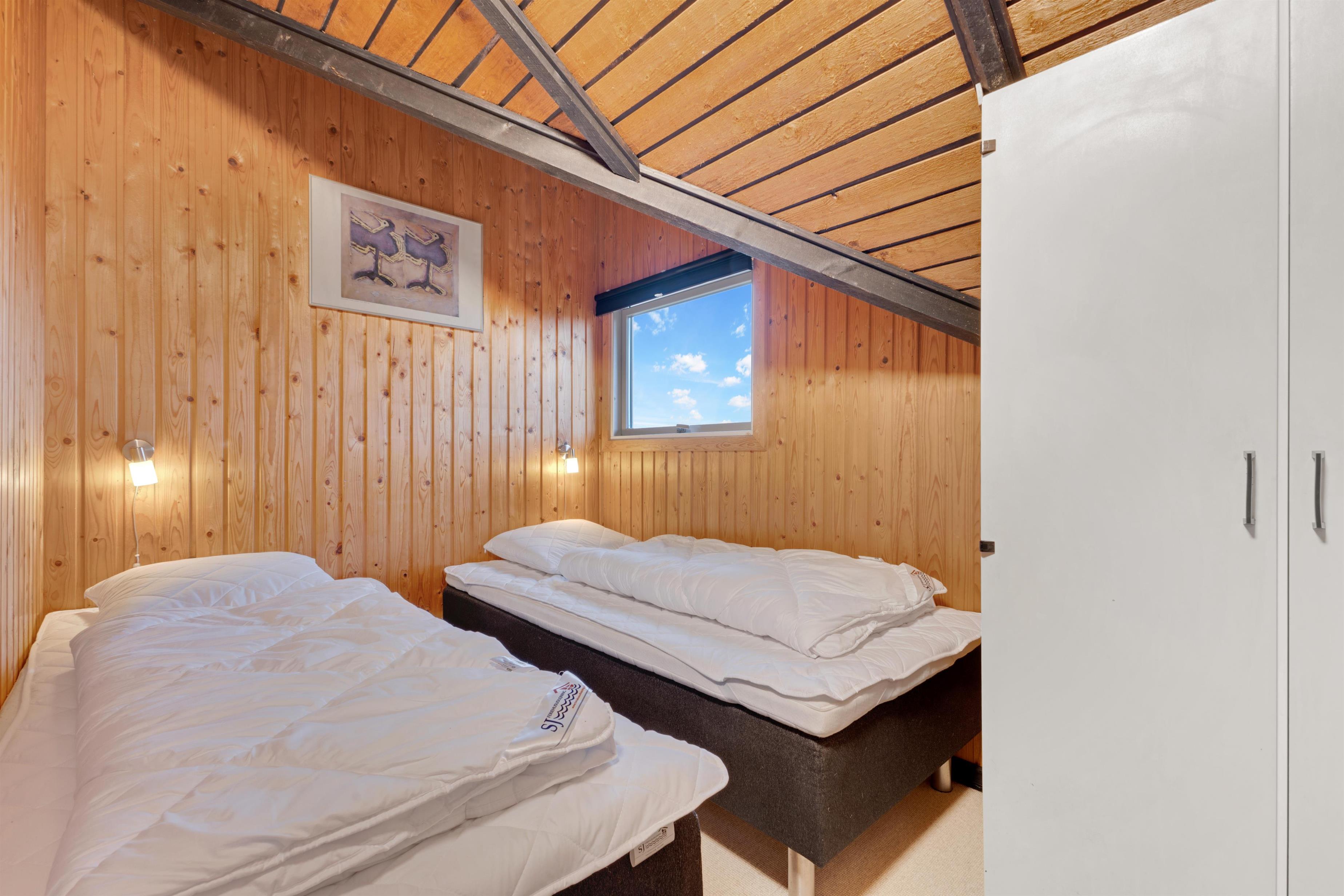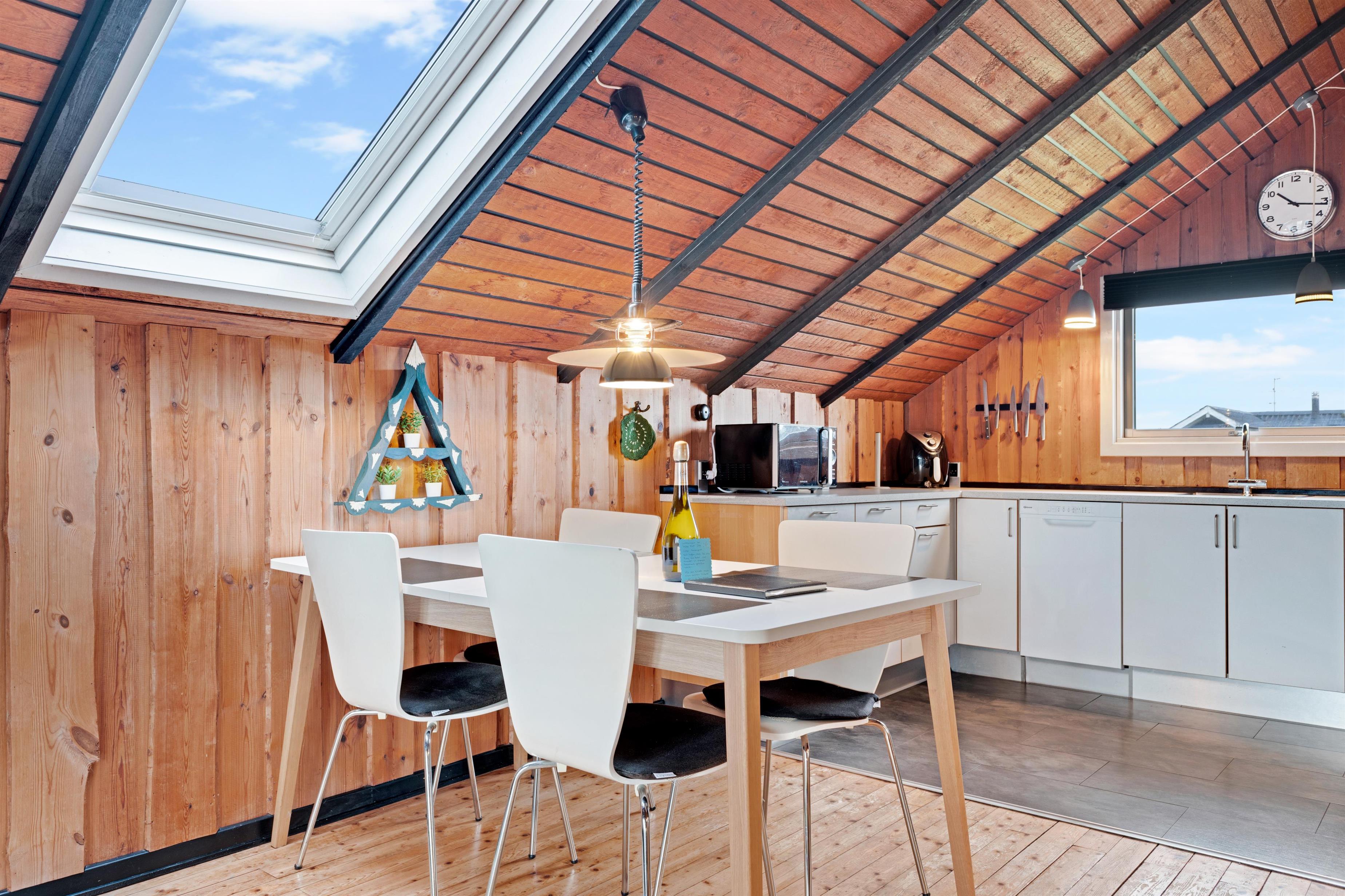 Huset består af et stort køkken-stue-alrum og så er der sove- og badeværelsesafdelingen. Fra begge afdelinger er der direkte adgang til det store, indhegnet terrasseanlæg. Nyt køkken med glaskeramisk komfur, mikrobølgeovn, køle-/fryseskab, opvaskemaskine og miniovn. Herfra er der kort vej til den store sofagruppe med sofabord i stuen hvortil der hører et smart-tv med sound bar, danske og tyske programmer samt mulighed for streaming af TV / radio / Apps via Chromecast. Så har du en mobiltelefon eller en anden devise med kan du streame hvad du nu har abonnement. Har man lyst til radio eller musik kan i høre det fra TV, PlayStation 3 eller fra højtaler med mulighed for at tilslutte IPhone. Til stuen hører også en brændeovn, så man får den helt rigtige sommerhusstemning under knasterne på loftet og der er desuden installeret varmepumpe som hjælper med et lavere forbrug. Mindre badeværelset består af et toilet, håndvask og bruser samt en lille vaskemaskine, tørretumbler og i samme afdeling af huset er der 2 soveværelser. Et soverum med dobbeltseng (140 x 200), og det andet soverum er med 2 enkelt senge. Der er også et anneks med 2 senge.