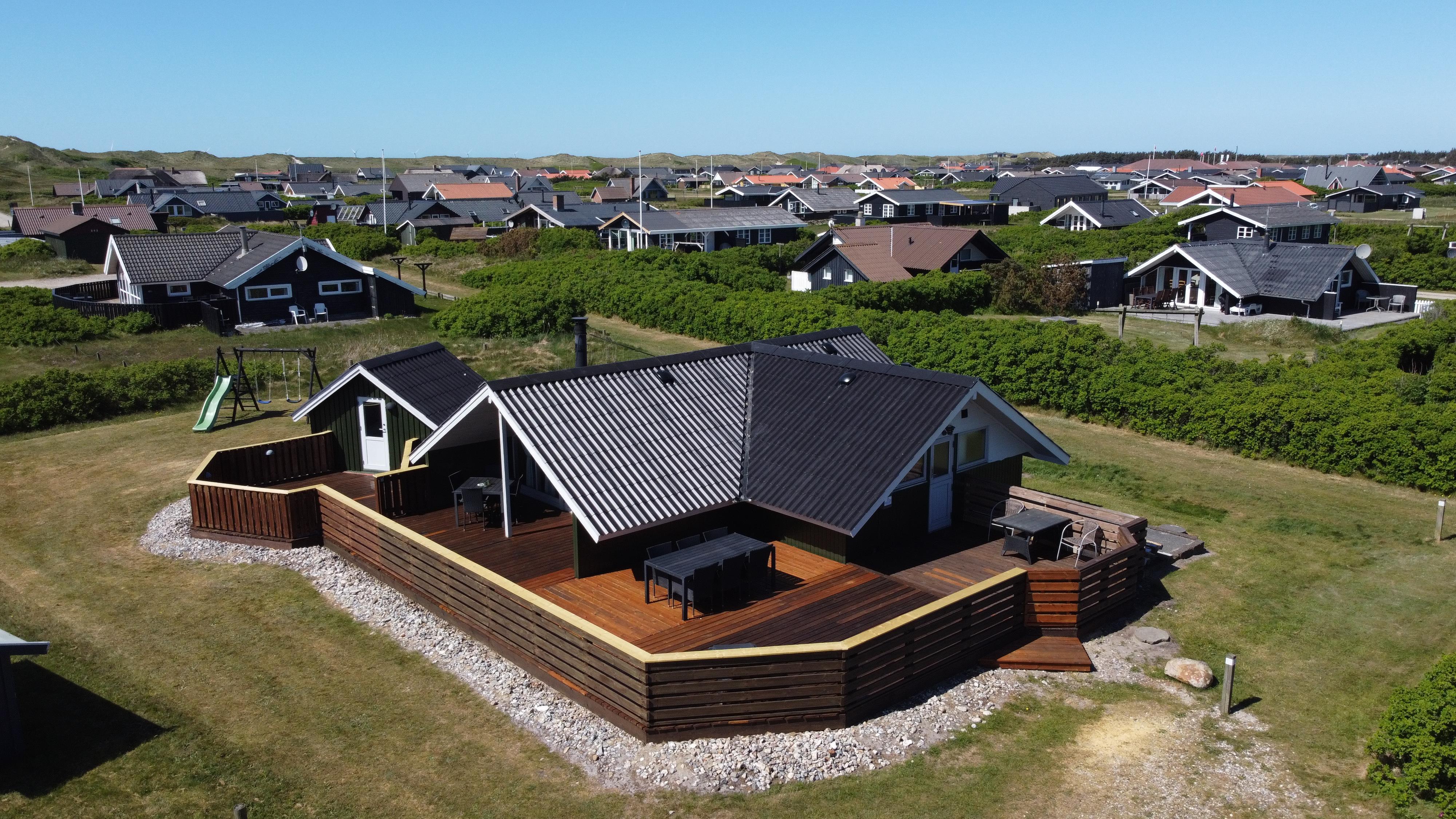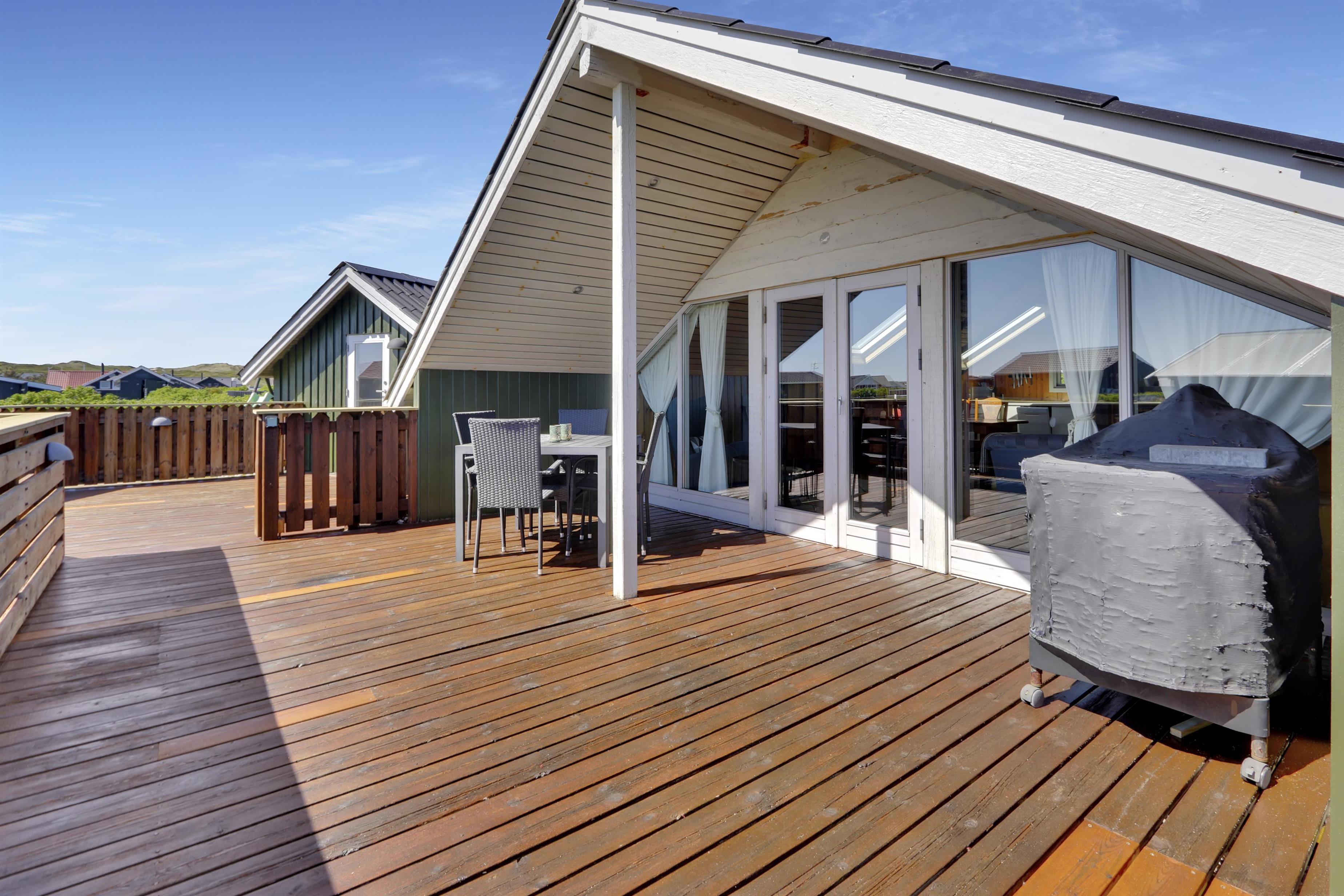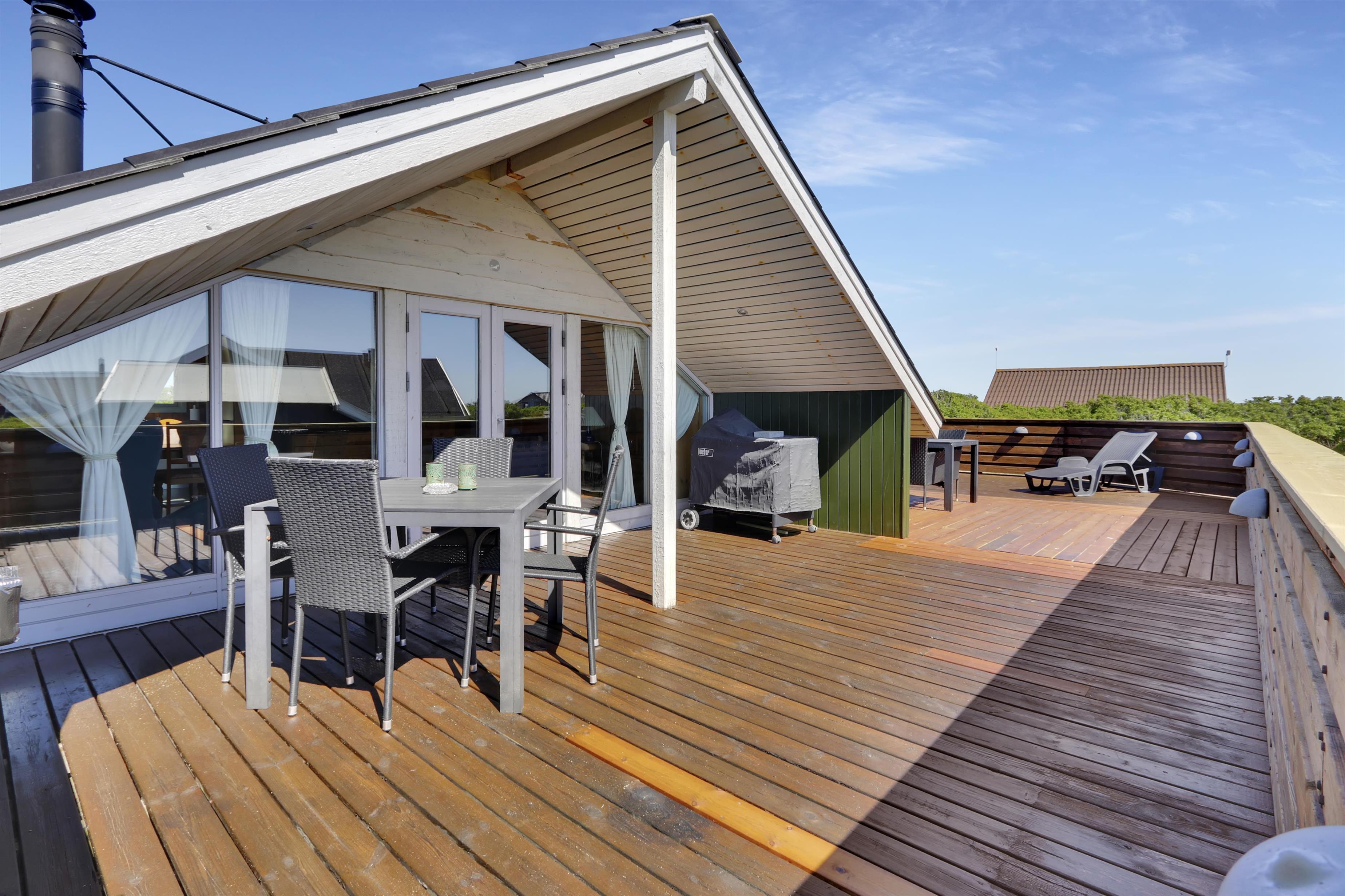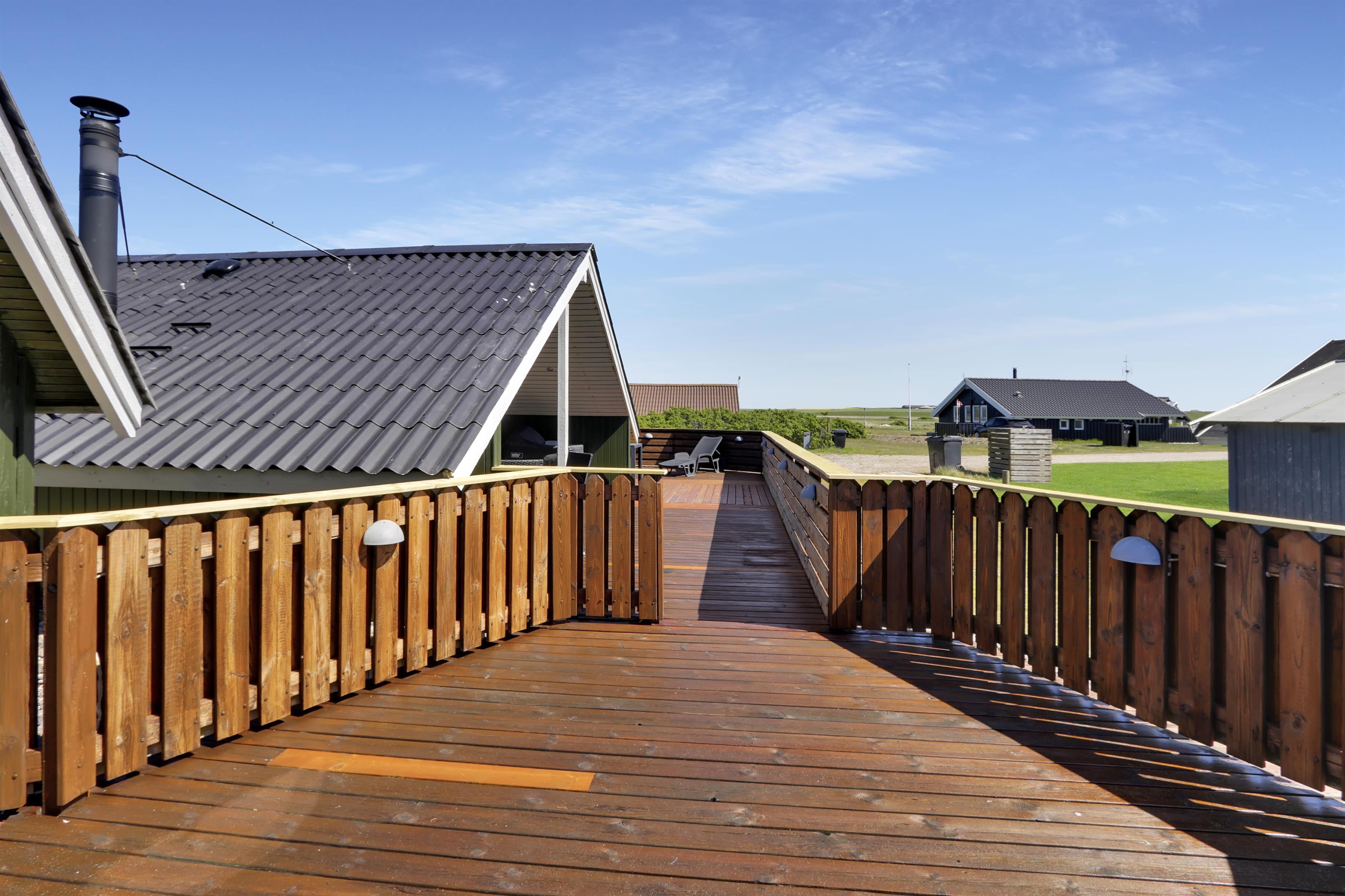 Fra stue er der udgang til et stort og lukket terrasseanlæg. Terrassen er delvis overdækket og omkranset af et stakit så børn og hunde roligt kan færdes på terrassen uden at løbe væk. Flere sæt havemøbler, liggestole og grill. Nyd her både morgen- og aftensolen i havemøblerne eller på en af de 2 solvogne. Grill er naturligvis også standard og børnene kan underholde sig med sandkassen på grunden umiddelbart lige uden for terrassen, der er desuden også et bål sted hvor man kan sidde og nyde de dejlige aftener. Huset ligger godt i forhold til vandreture hvor der hverken er langt til Ferring Sø eller Vesterhavet. I sommerhalvåret fra påske til efterårsferie er der kun cirka 600 meter til nærmeste købmand ved Vejlby Torv hvor der også er en Cafe som har åbent i sæsonen. I vinterhalvåret må man tage de 6 km til Harboøre hvor der både er en Rema1000 og en Brugs.