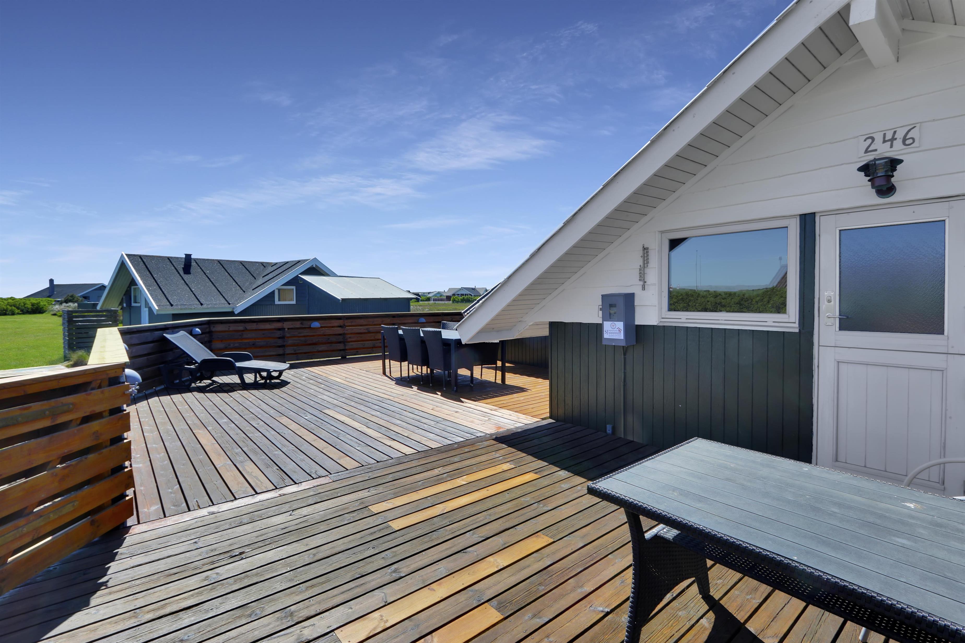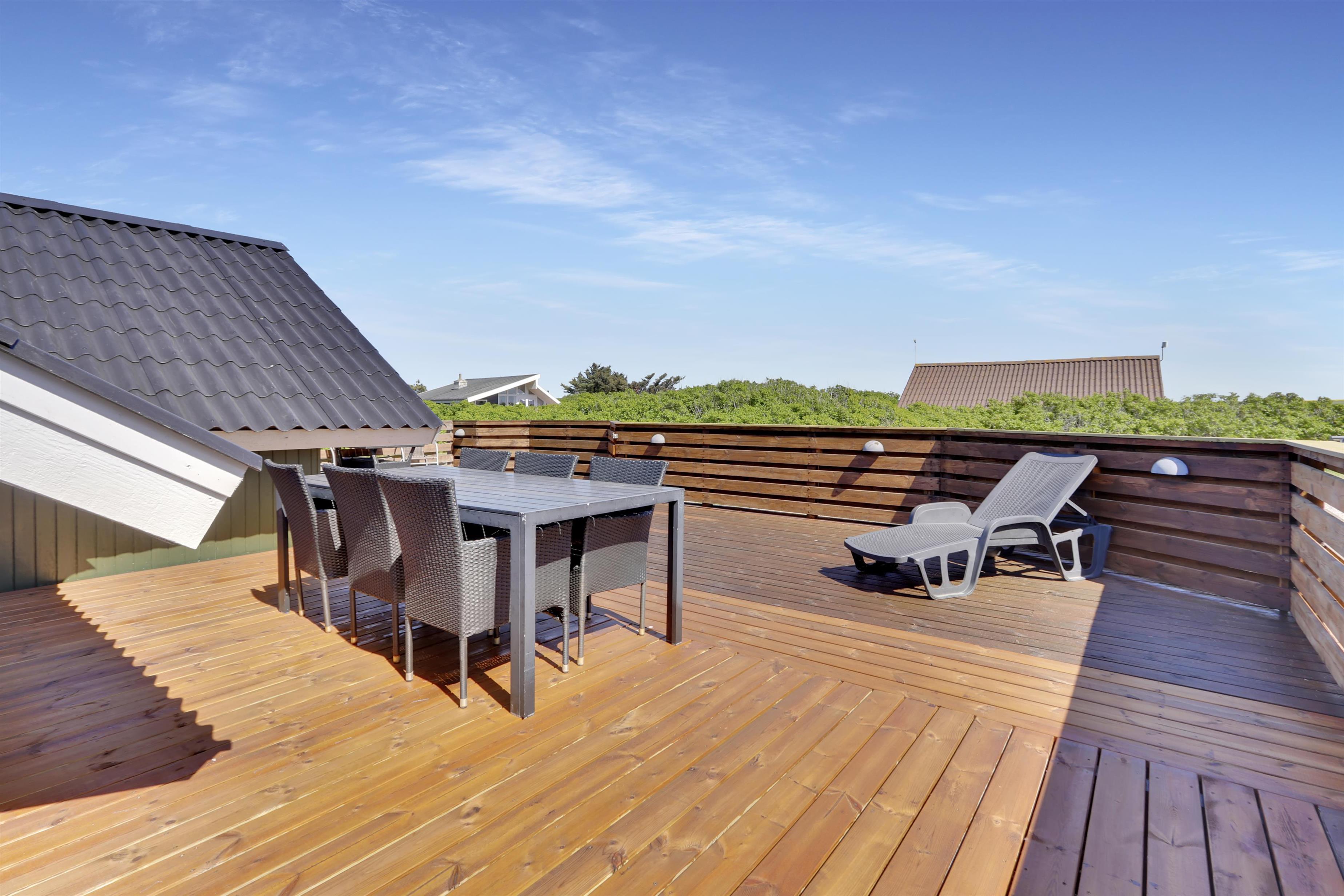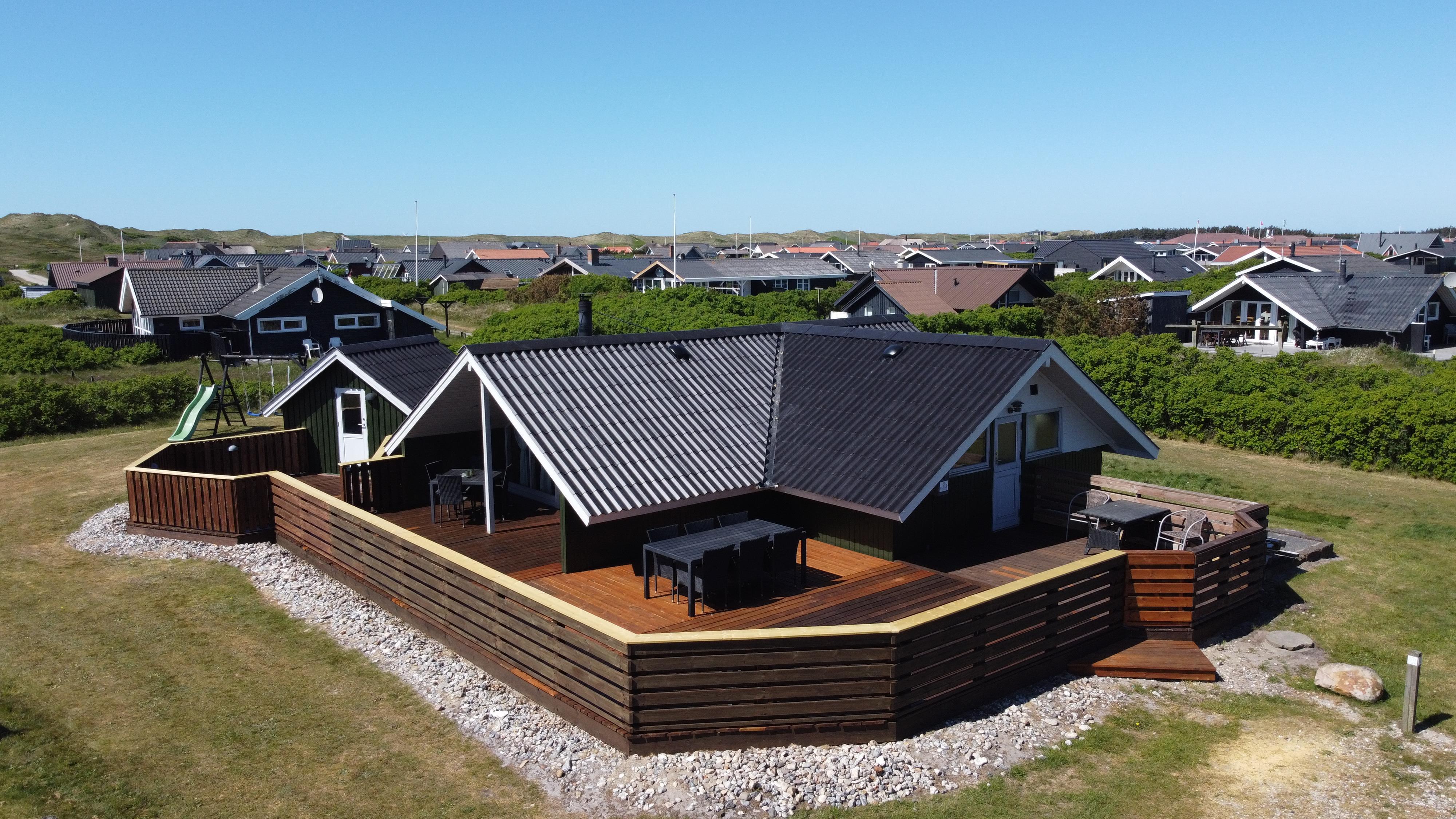 Fra stue er der udgang til et stort og lukket terrasseanlæg. Terrassen er delvis overdækket og omkranset af et stakit så børn og hunde roligt kan færdes på terrassen uden at løbe væk. Flere sæt havemøbler, liggestole og grill. Nyd her både morgen- og aftensolen i havemøblerne eller på en af de 2 solvogne. Grill er naturligvis også standard og børnene kan underholde sig med sandkassen på grunden umiddelbart lige uden for terrassen, der er desuden også et bål sted hvor man kan sidde og nyde de dejlige aftener. Huset ligger godt i forhold til vandreture hvor der hverken er langt til Ferring Sø eller Vesterhavet. I sommerhalvåret fra påske til efterårsferie er der kun cirka 600 meter til nærmeste købmand ved Vejlby Torv hvor der også er en Cafe som har åbent i sæsonen. I vinterhalvåret må man tage de 6 km til Harboøre hvor der både er en Rema1000 og en Brugs.