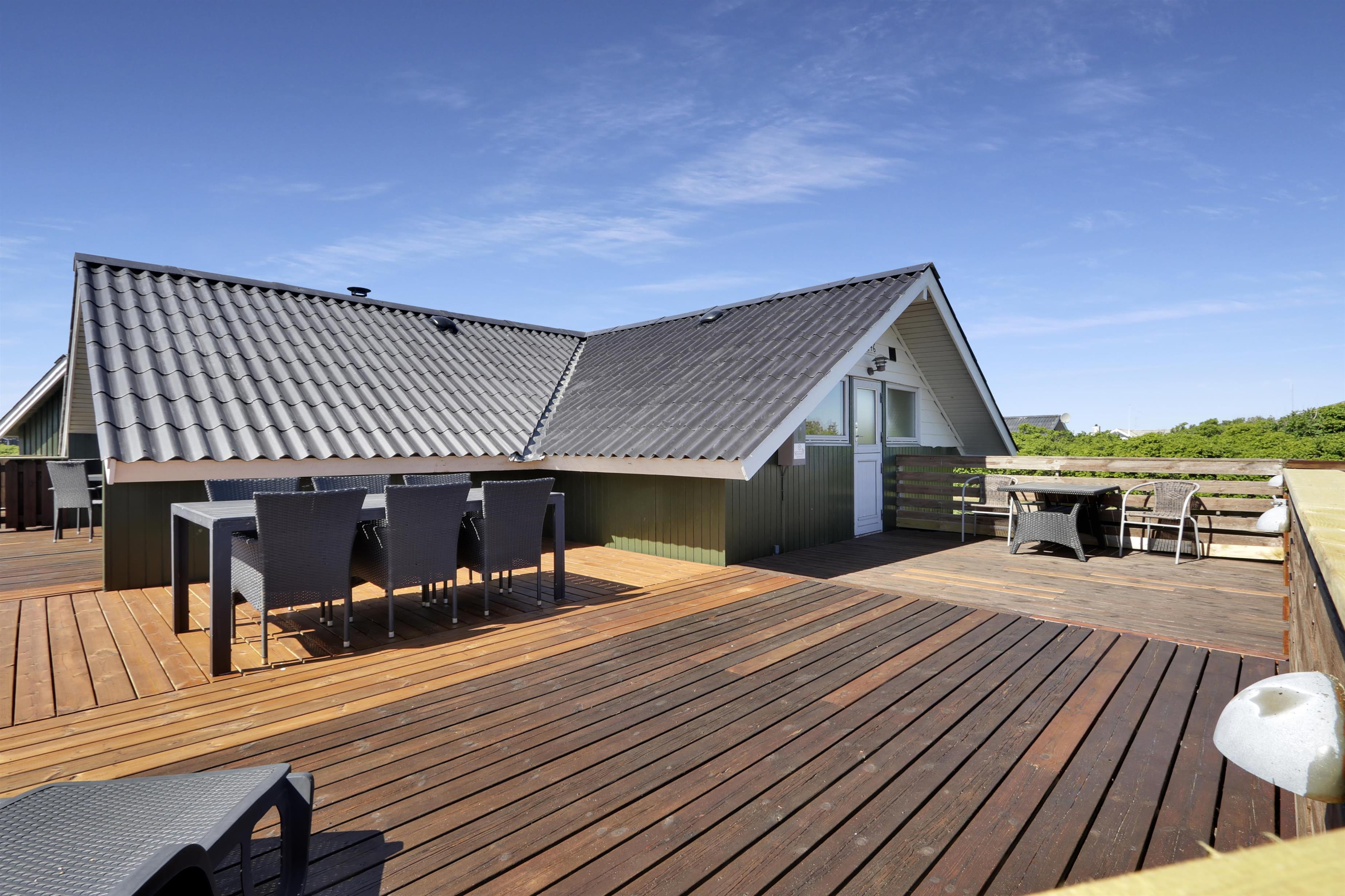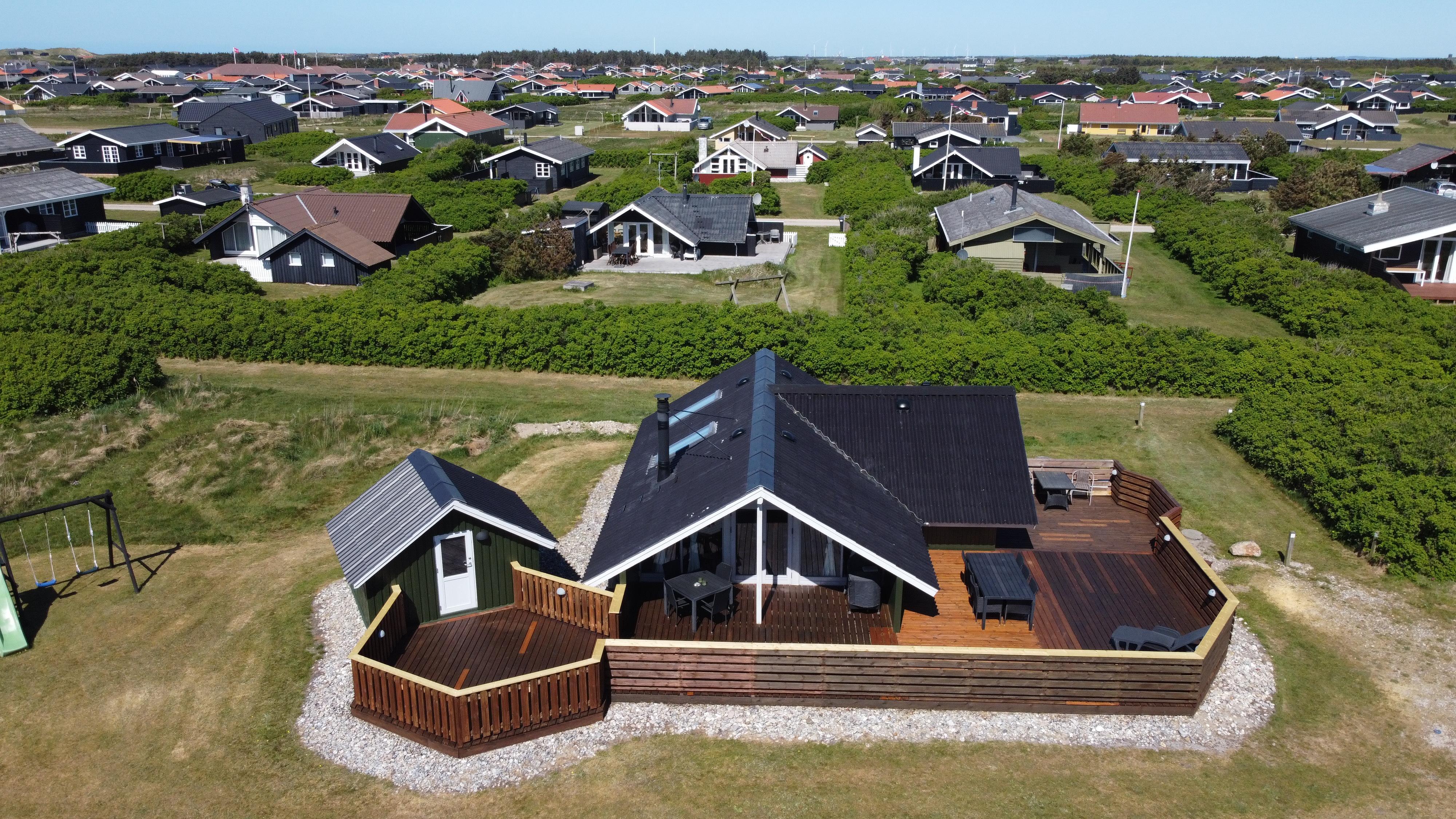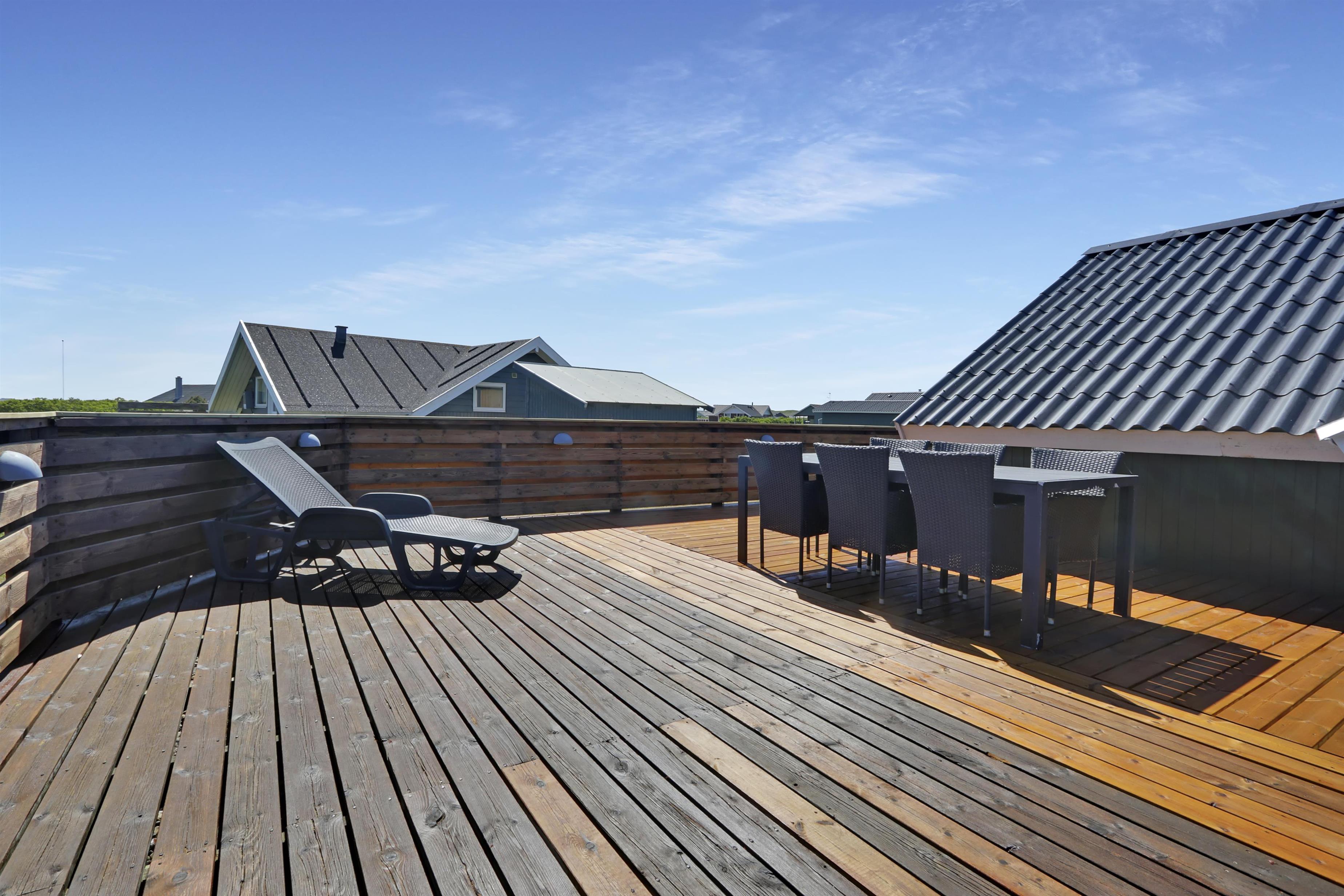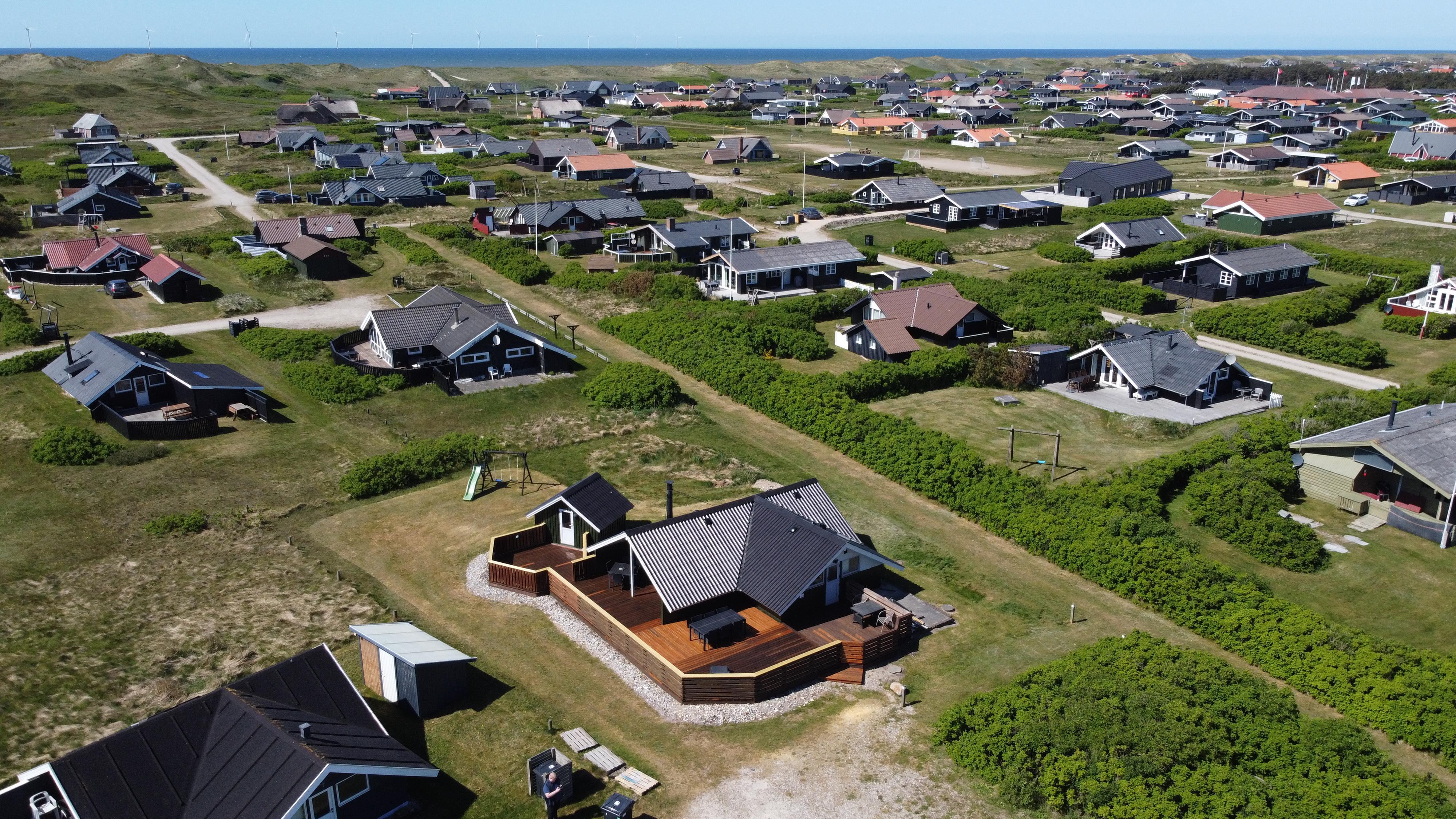 Fra stue er der udgang til et stort og lukket terrasseanlæg. Terrassen er delvis overdækket og omkranset af et stakit så børn og hunde roligt kan færdes på terrassen uden at løbe væk. Flere sæt havemøbler, liggestole og grill. Nyd her både morgen- og aftensolen i havemøblerne eller på en af de 2 solvogne. Grill er naturligvis også standard og børnene kan underholde sig med sandkassen på grunden umiddelbart lige uden for terrassen, der er desuden også et bål sted hvor man kan sidde og nyde de dejlige aftener. Huset ligger godt i forhold til vandreture hvor der hverken er langt til Ferring Sø eller Vesterhavet. I sommerhalvåret fra påske til efterårsferie er der kun cirka 600 meter til nærmeste købmand ved Vejlby Torv hvor der også er en Cafe som har åbent i sæsonen. I vinterhalvåret må man tage de 6 km til Harboøre hvor der både er en Rema1000 og en Brugs.