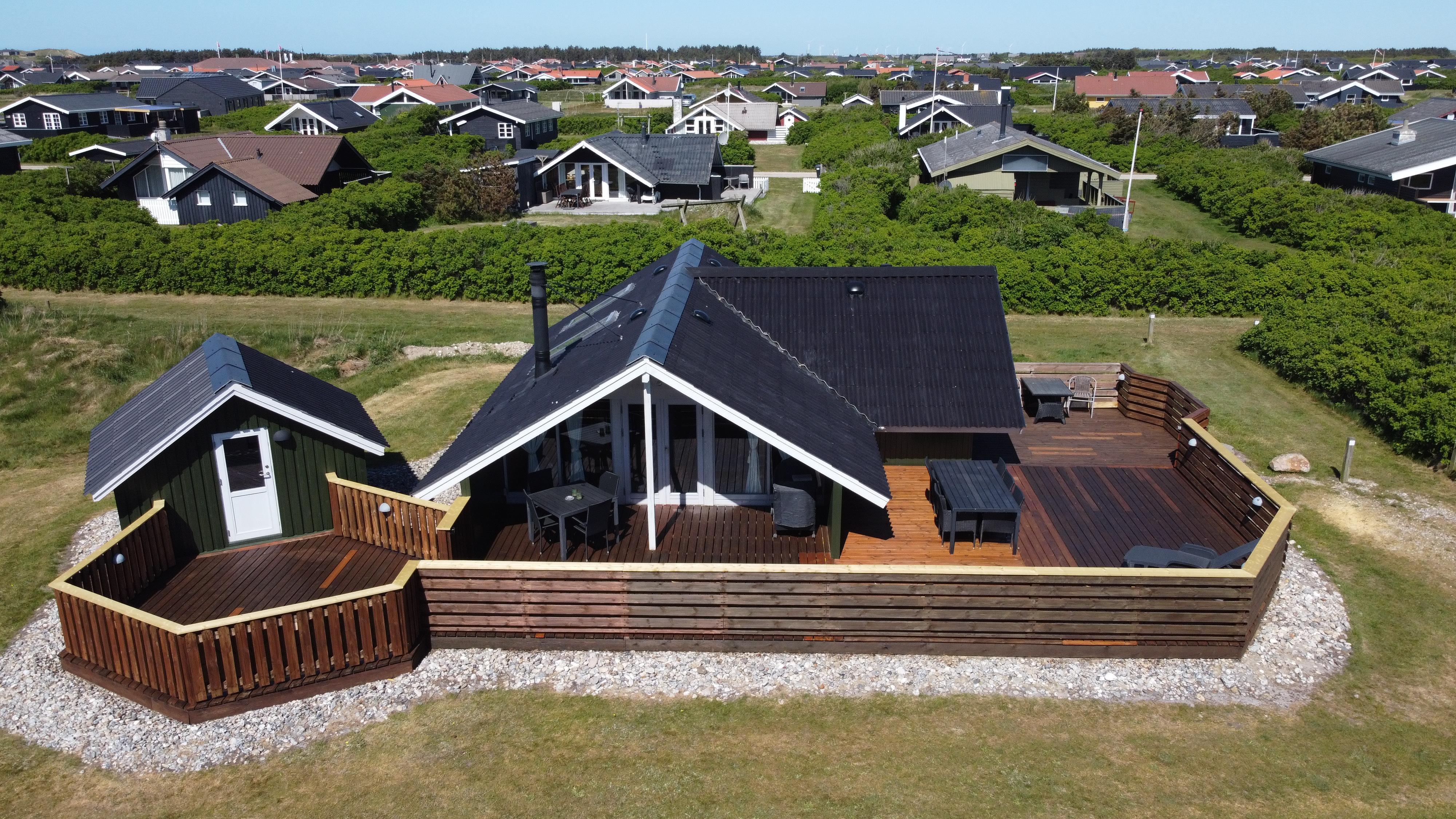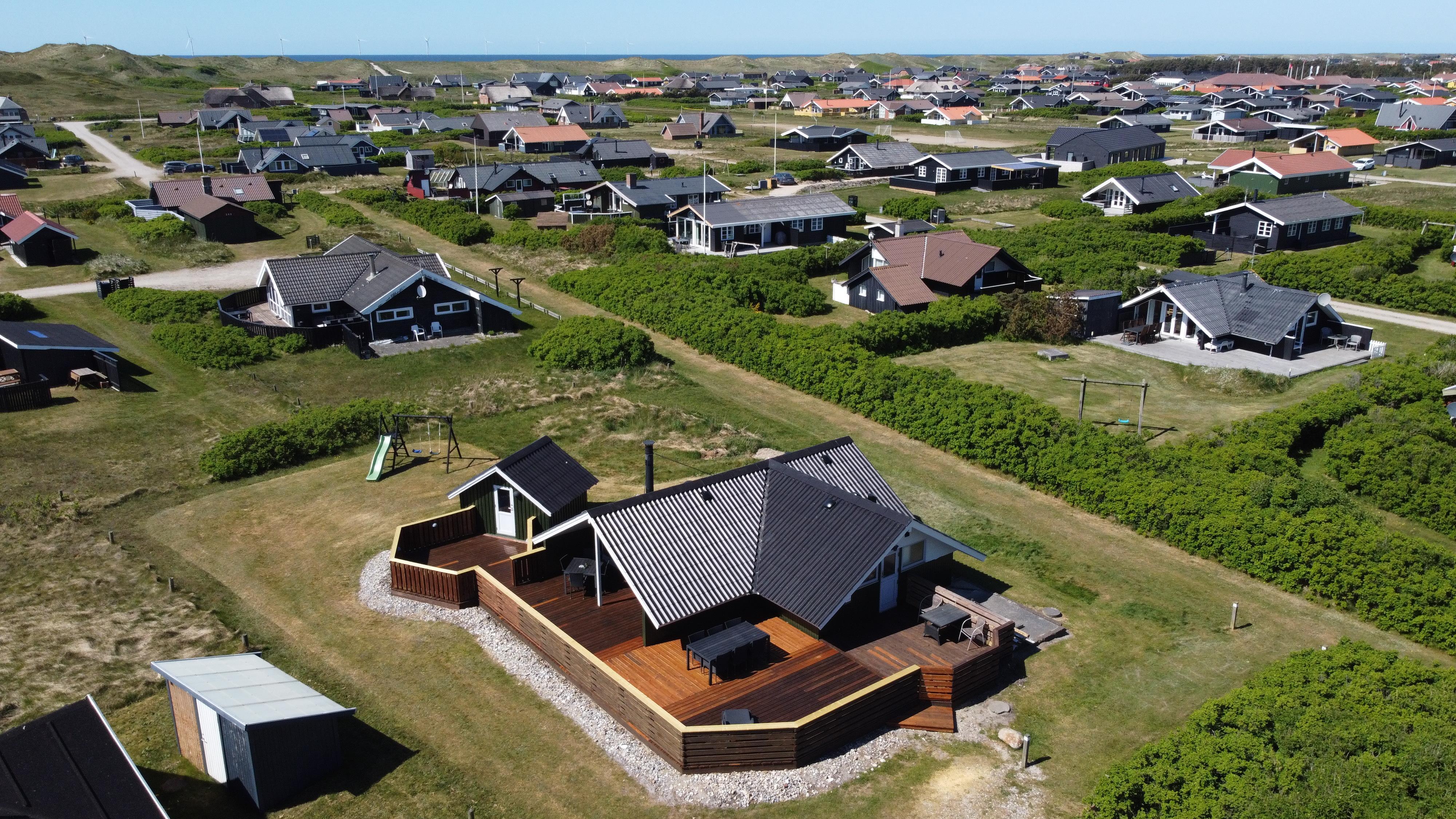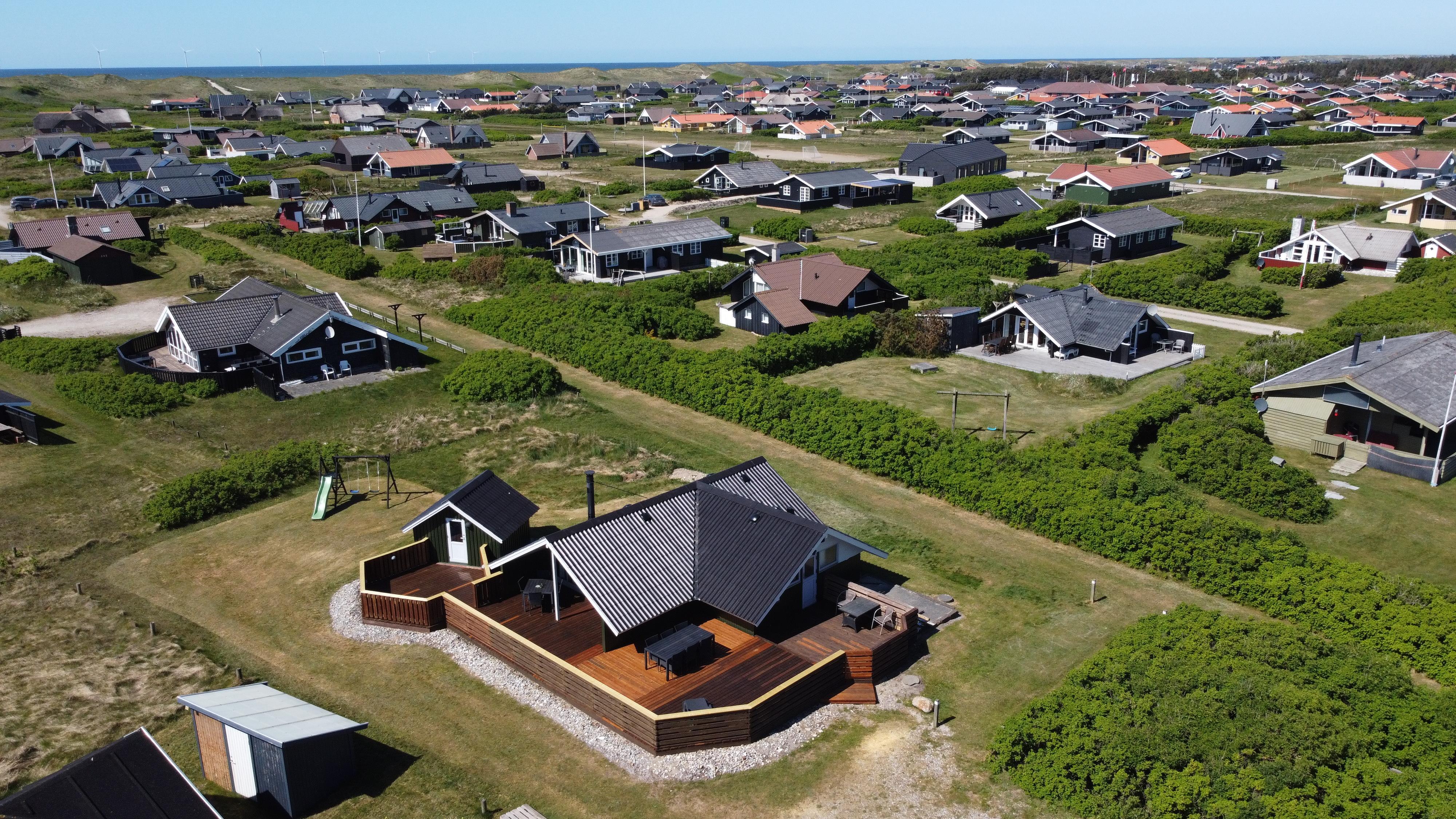 Renoveret, hyggeligt indrettet feriehus i træ med stor, lukket og delvis overdækket terrasse. Beliggende på naturgrund kun 400 meter fra Vesterhavet. Terrassen er indhegnet og dermed egnet til at man kan have sin hund gående løs rundt. Her er desuden gratis trådløs internetadgang (fiberforbindelse). Fra huset er der udsigt over området og huset er ideelt til parret eller den lille familie.