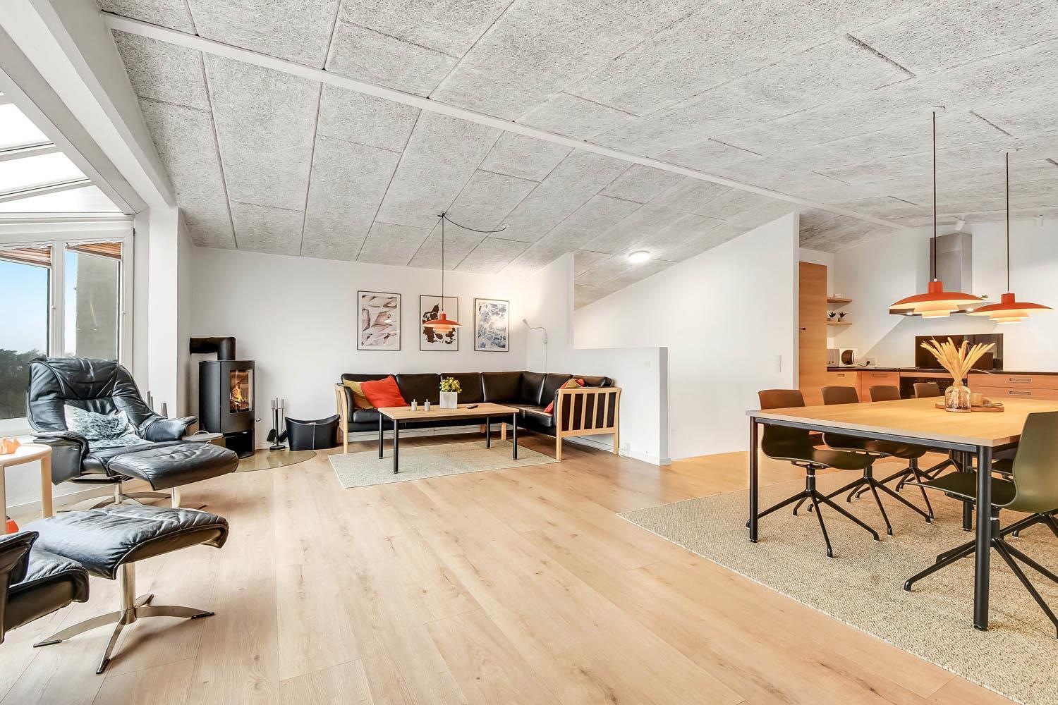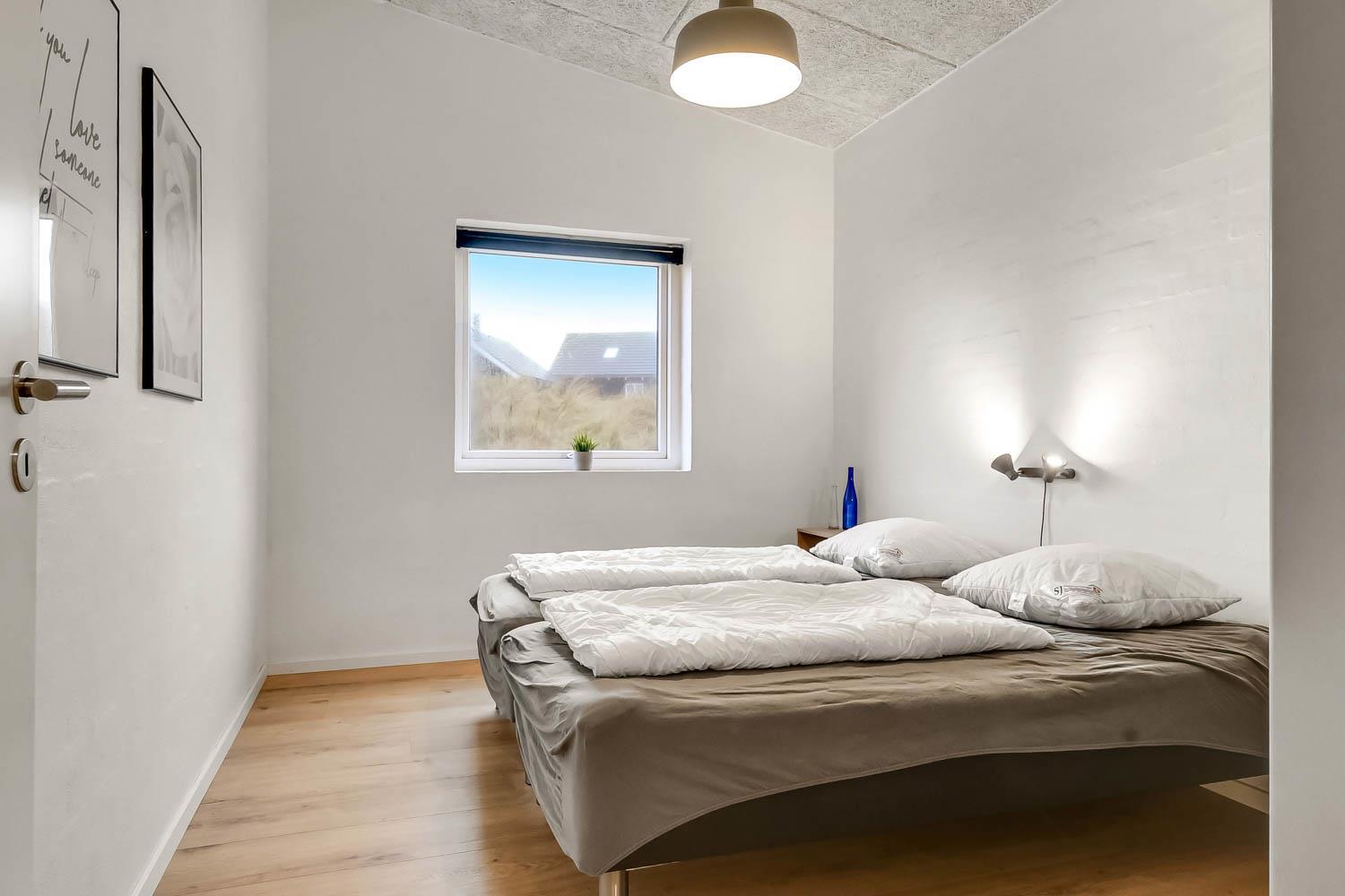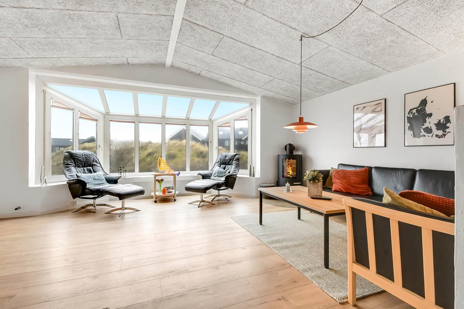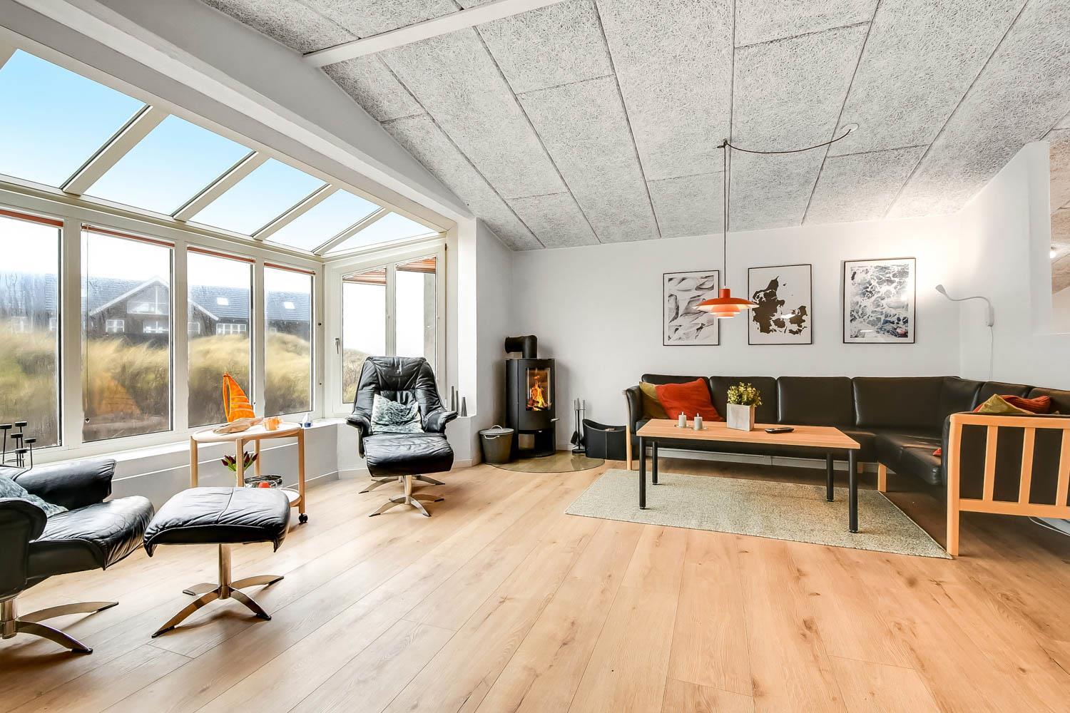 Dette pragtfulde hus er ca. 210 m2 stort og ligger kun 200 m til Vesterhavet. Huset er moderne og minimalistisk i sit udtryk og praktisk indrettet. En stor entrè / Værelsesgang byder velkommen. Huset har 4 store soverum (1DS + 1DS + 2ES + 2ES). Der er barnestol og barneseng til de små gæster. Kombineret køkkenhjørne og opholdsstue. Fra opholdsstuen er der udsigt til klitterne ved Vesterhavet og er indrettet med smart-TV, med danske og tyske programmer samt mulighed for streaming af TV / radio / Apps, nye lædermøbler, og spisebord. Slap af foran den knitrende brændeovn som hjælper med at reducere udgiften til varmeregningen i det, i forvejen, energioptimerede hus. Stilfuldt køkkenhjørne med alt i service og køkkengrej. Der er opvaskemaskine, kogeplade, indbygningsovn, emhætte, køleskab med fryseboks og mikroovn. Stort, lækkert badeværelse med bruseniche, håndvask, toilet og klinkegulv med gulvvarme og vaskesøjle med vaskemaskine og tørretumbler. I Poolrummet er der en stor pool, som er 8 x 4 x 1,45m. herfra er der indgang til et ekstra badeværelse med toilet, bruser og direkte adgang til husets sauna og gulvvarme. Nyt luft til vand anlæg gør huset særdeles energivenligt og bevirker også et billigere forbrug Max. 2 husdyr er tilladt. Huset lejes ikke ud til ungdomsgrupper. Depositum i vintersæson kr. 4.500 og sommersæson kr. 2.200. Rygning er ikke tilladt. .