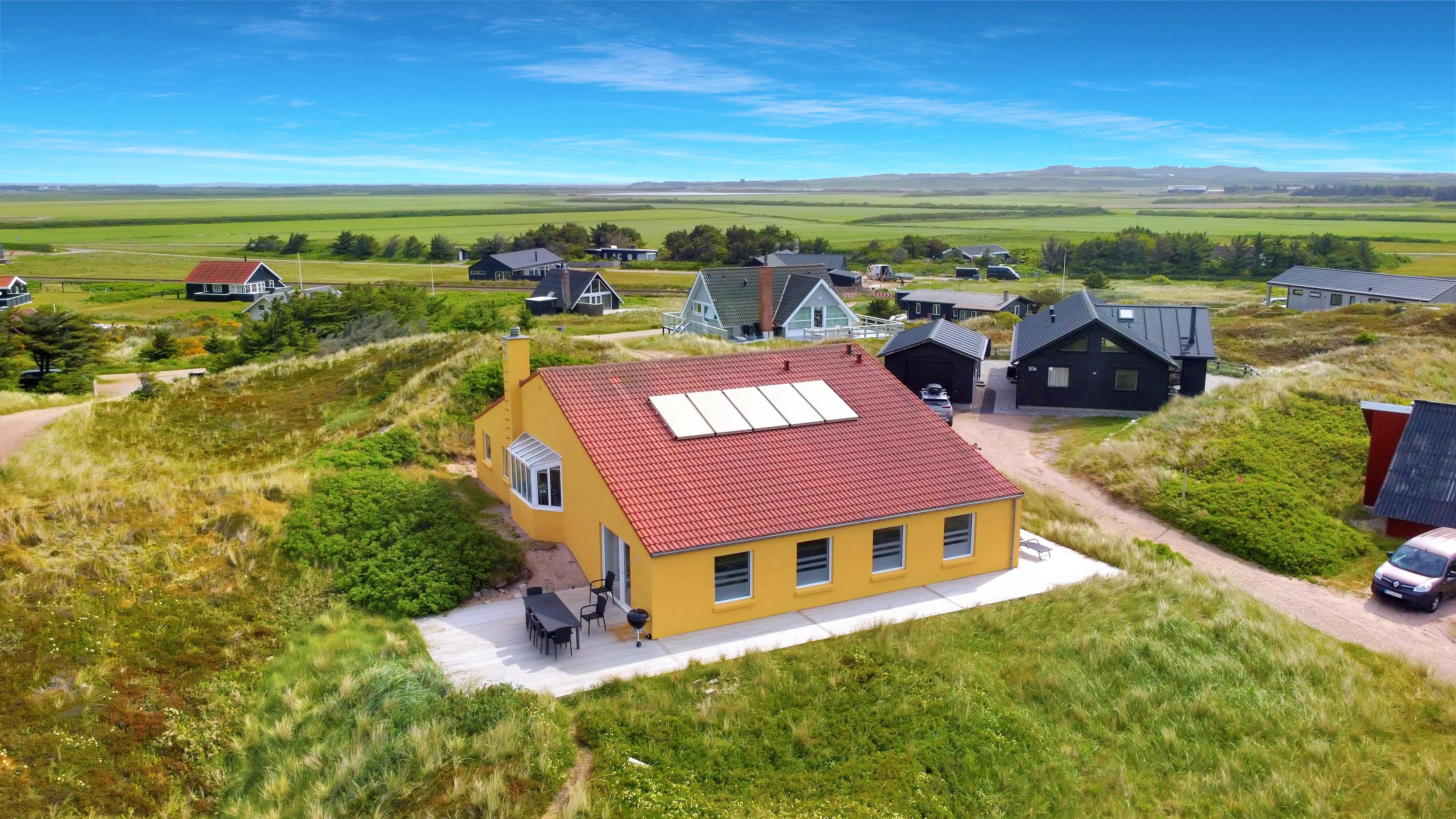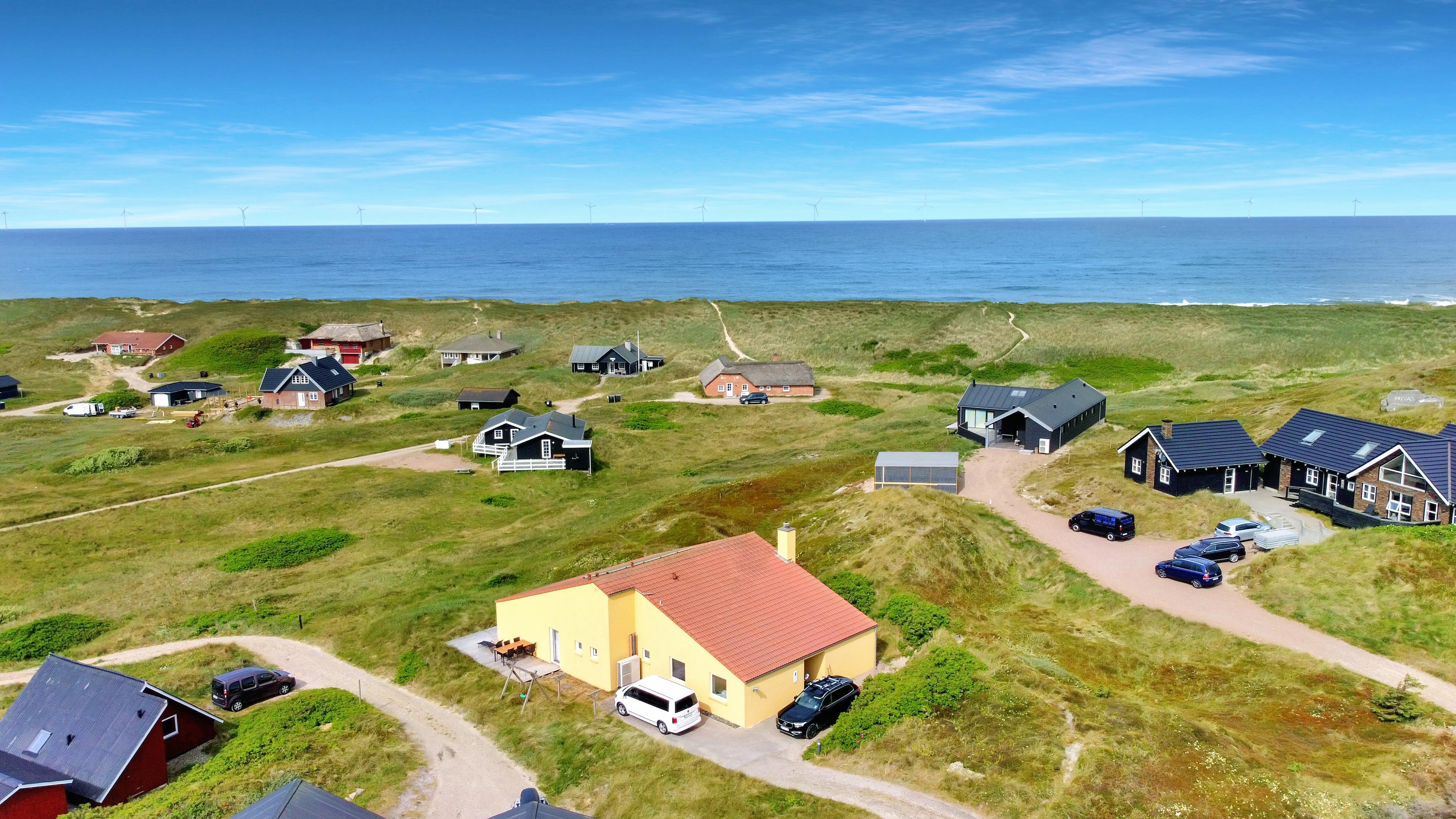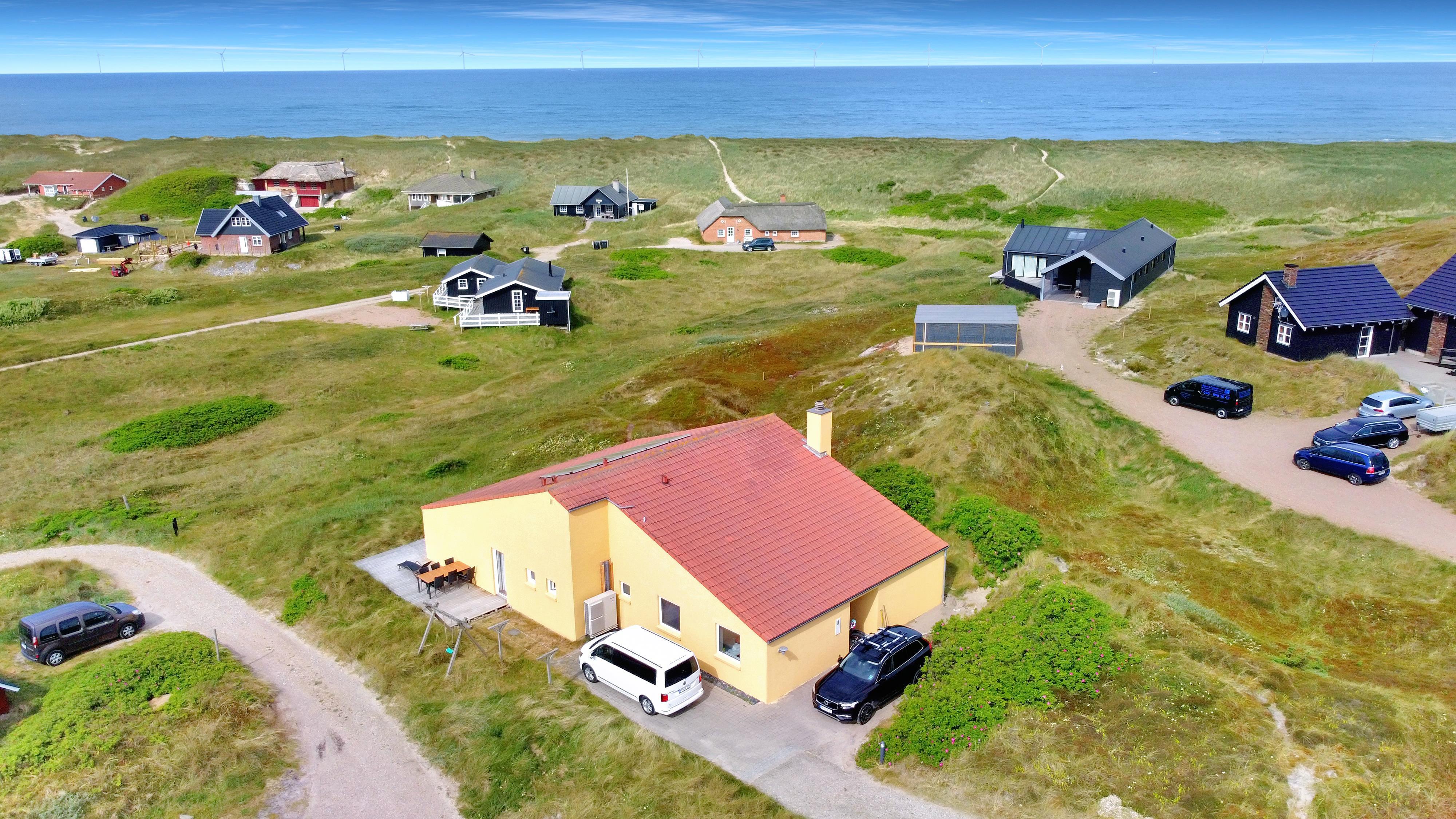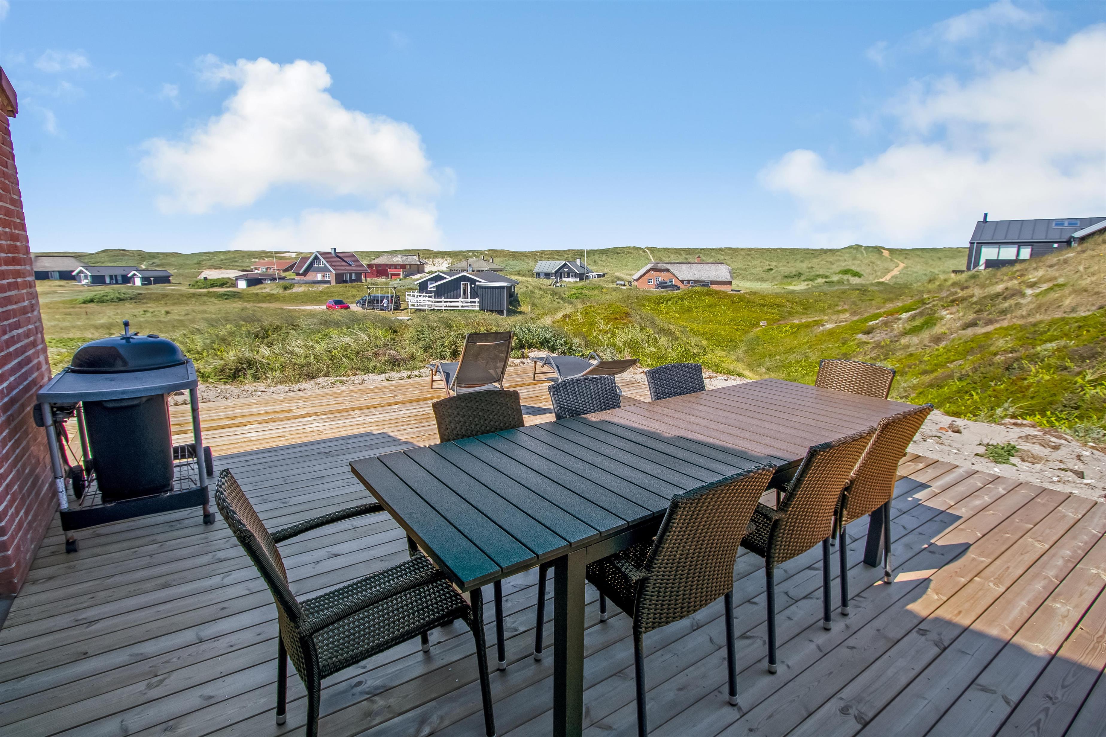 Huset er beliggende på en ca. 3.300 m2 stor kuperet, naturgrund kun 200 m fra Vesterhavet. Der er udgang til et dejligt nyanlagt terrasseanlæg. Havemøbler, solvogne og gasgrill som kan flyttes rundt efter behag. Der masser af muligheder for at nyde den fantastiske udsigt samt få en plads i solen. Gynger til børnene. Et utrolig dejligt hus, hvor der er tænkt på det meste og med masser af muligheder. Den flotte og praktiske modernisering gør huset ganske unikt. 5 - 10 min fra huset ligger Vesterhavet, der altid inviterer til en frisk gå- eller løbetur. Områdets købmand har sæsonåbent og ligger ca. 1.500 m fra huset og som i sæsonen byder på frisk morgenbrød. Her kan de daglige indkøb også klares. Også området madsted ligger ca. 1.500 fra huset. Indenfor 25-30 minutter kan flere aktiviteter og shoppingmuligheder nås. Så hvad enten I er til aktiv ferie eller total afslapning, danner dette flotte, moderniseret feriehus en perfekt ramme både hvad angår hus, beliggenhed og omgivelser.