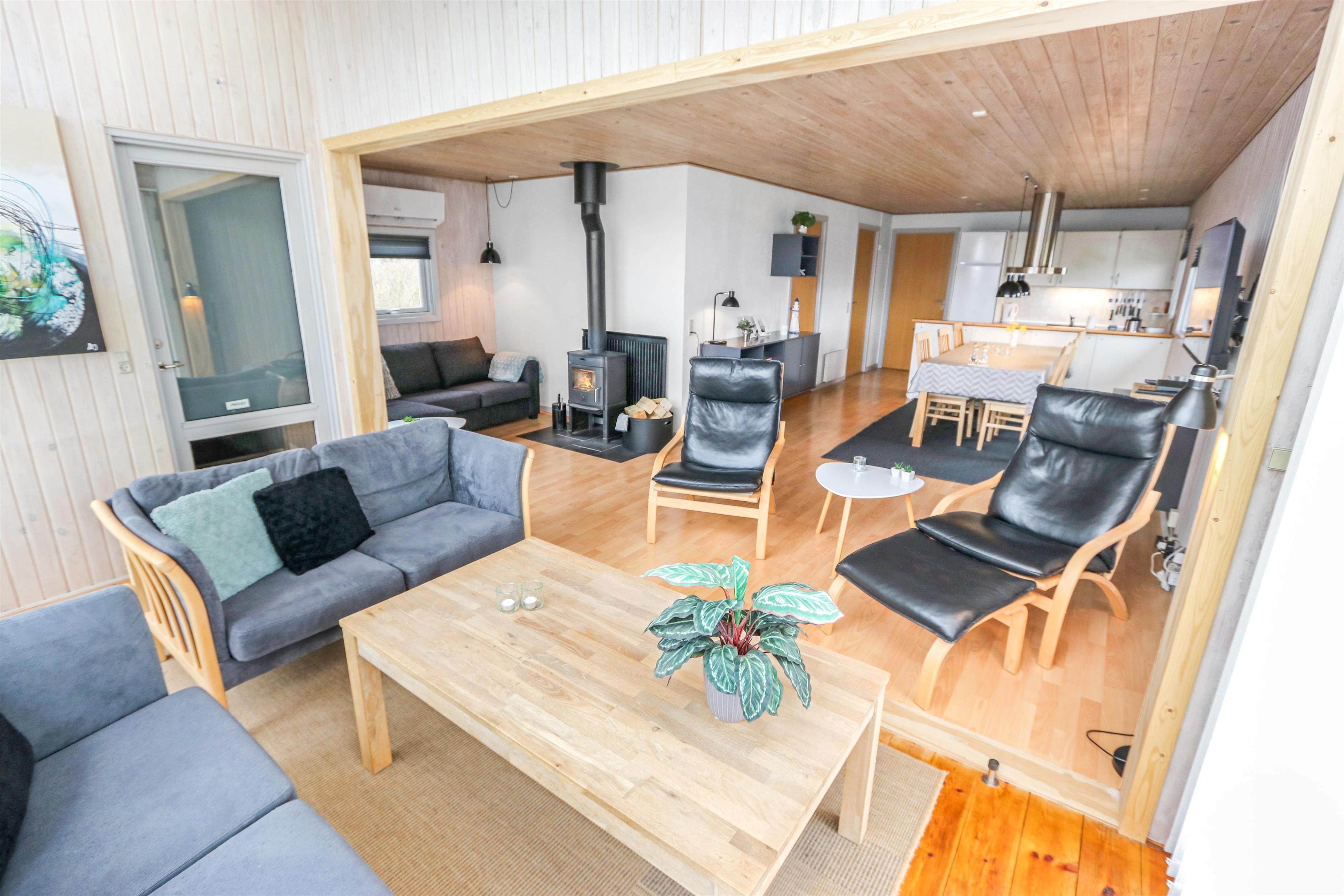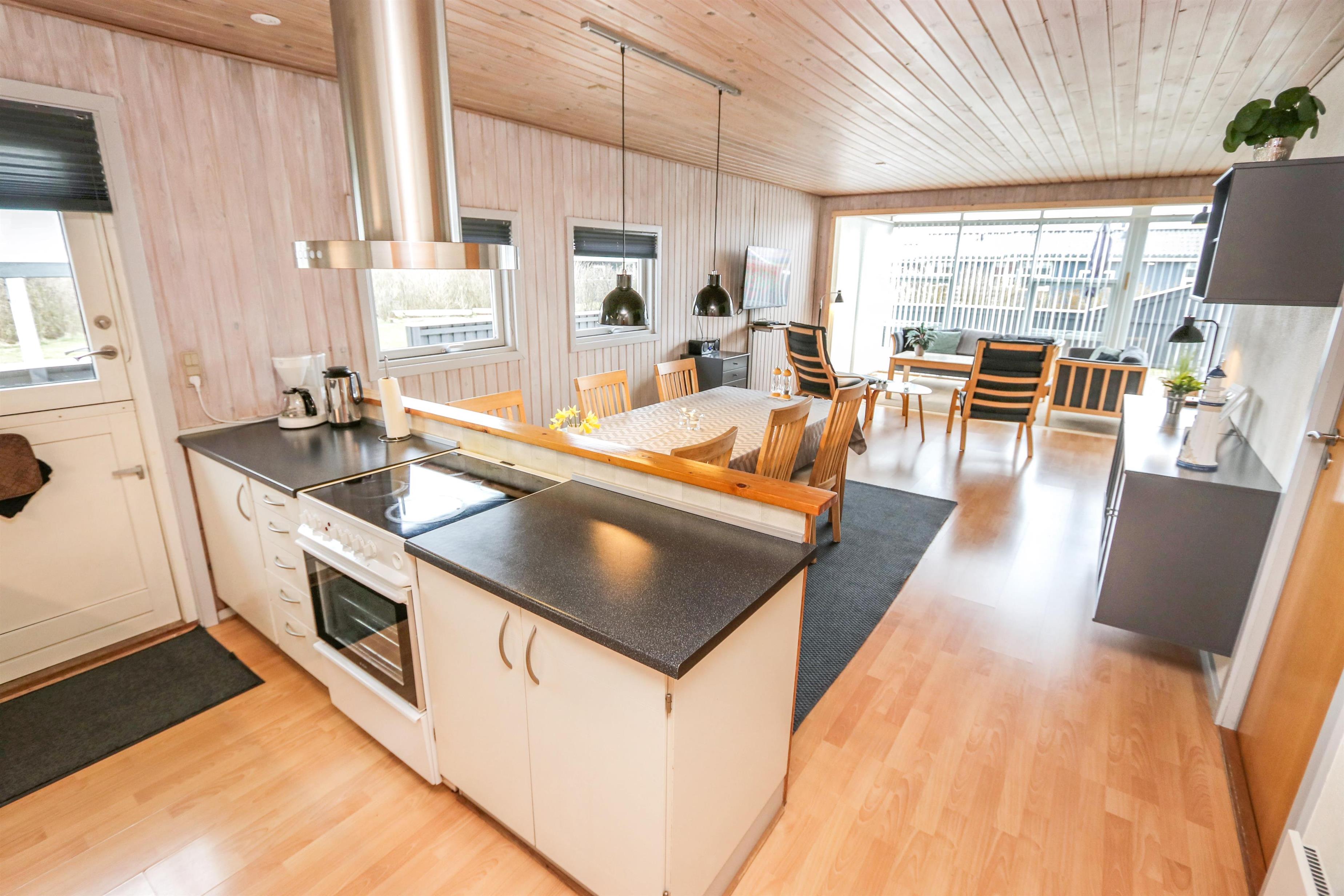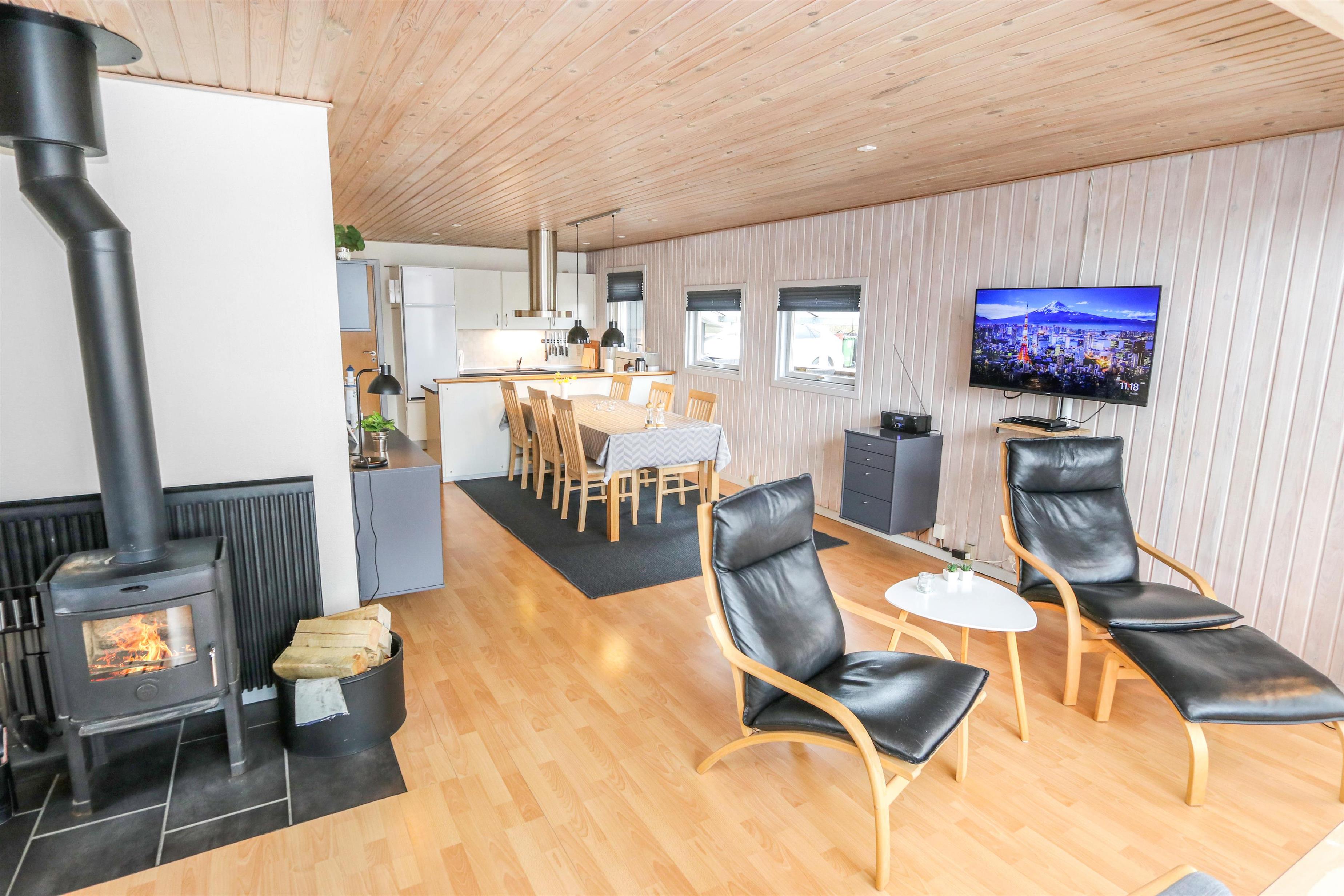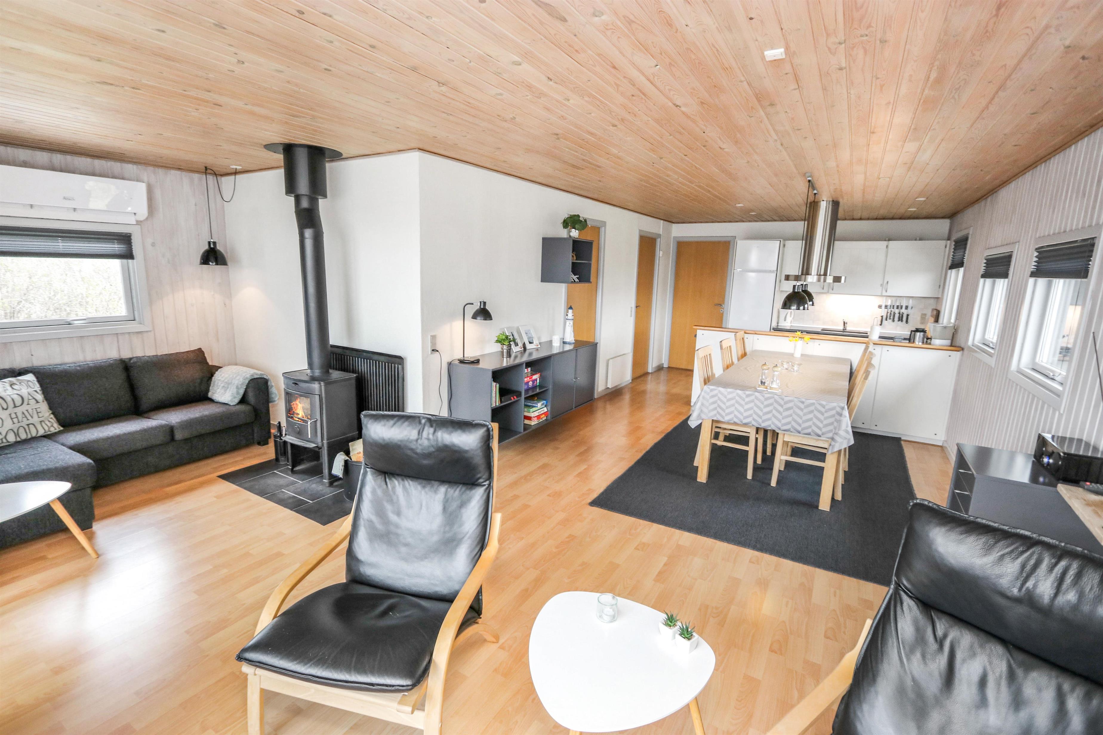 Sæt bilen i carporten og en flot fordelergang byder jer velkommen. Huset er til 6 personer og har 3 værelser (1DS, 1DS, 2ES). Flot badeværelse med bruseniche, toilet, håndvask, klinkegulv gulvvarme, vaskemaskine og direkte adgang til saunaen. Veludstyret køkkenhjørne med opvaskemaskine, mikroovn, komfur med glaskeramiske kogeplader, emhætte, køleskab med fryseboks, alt i service og køkkengrej samt udgang til en dejlig delvis overdækket terrasse, hvor grillen er placeret lige til højre for døren som et ekstra supplement til køkkenet. Pænt møbleret opholdsstue med polstermøbler, TV med tyske kanaler, chromecast, , DAB-radio, Stereoanlæg med bluetooth og en dejlig hyggekrog med brændeovn som er perfekt til hygge med spil eller en god bog. Spiseplads lige ved køkkenhjørnet og adgang til en dejlig udestue for enden af stuen med endnu et spisebord og flere bløde møbler. Vaskerum med ekstra afliggeplads og vaskemaskine. Der er trægulve i alle opholdsrum og gulvtæpper i soverummene. Til børnene er der børneseng og højstol. Ikke ryger hus. Husdyr ikke tilladt