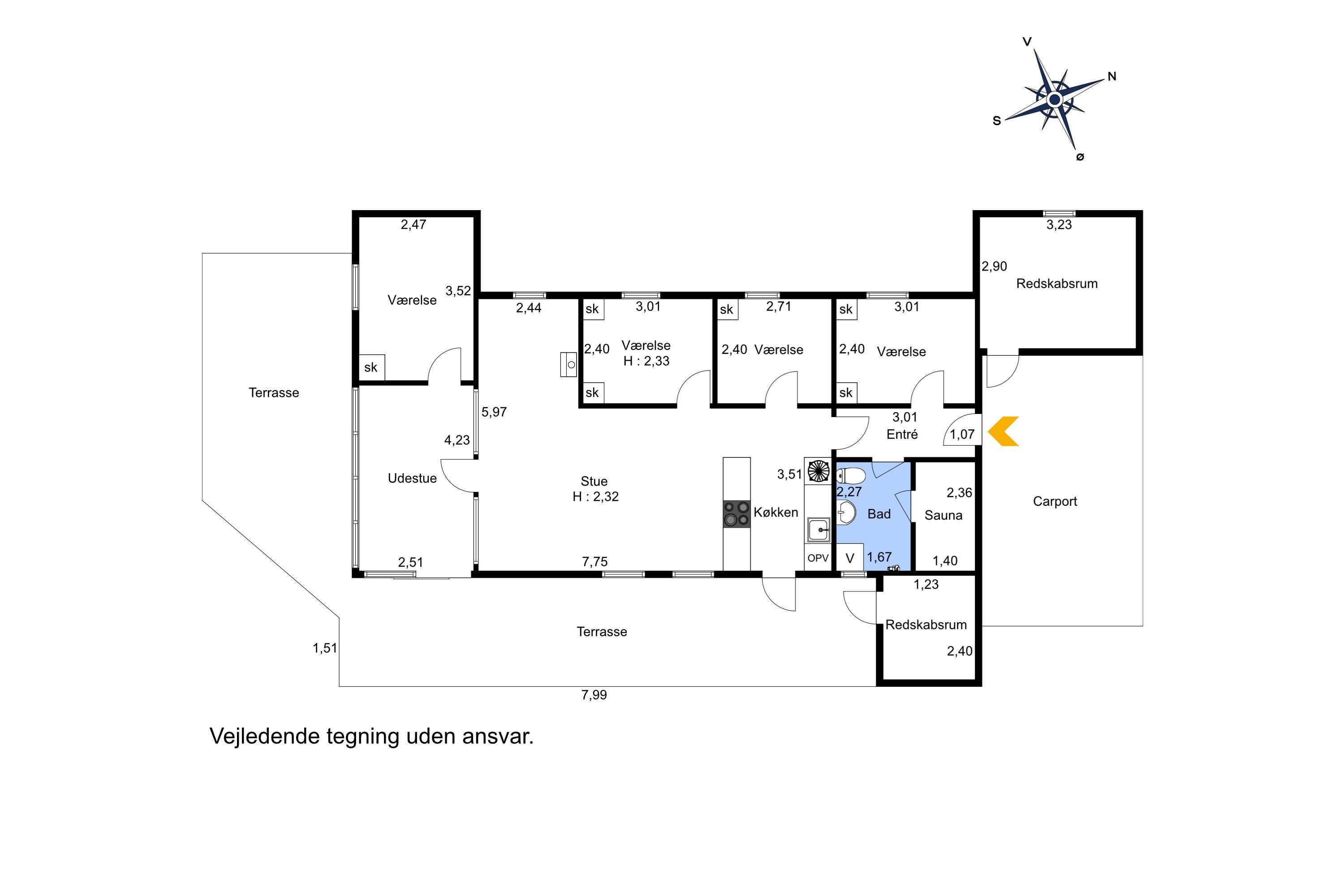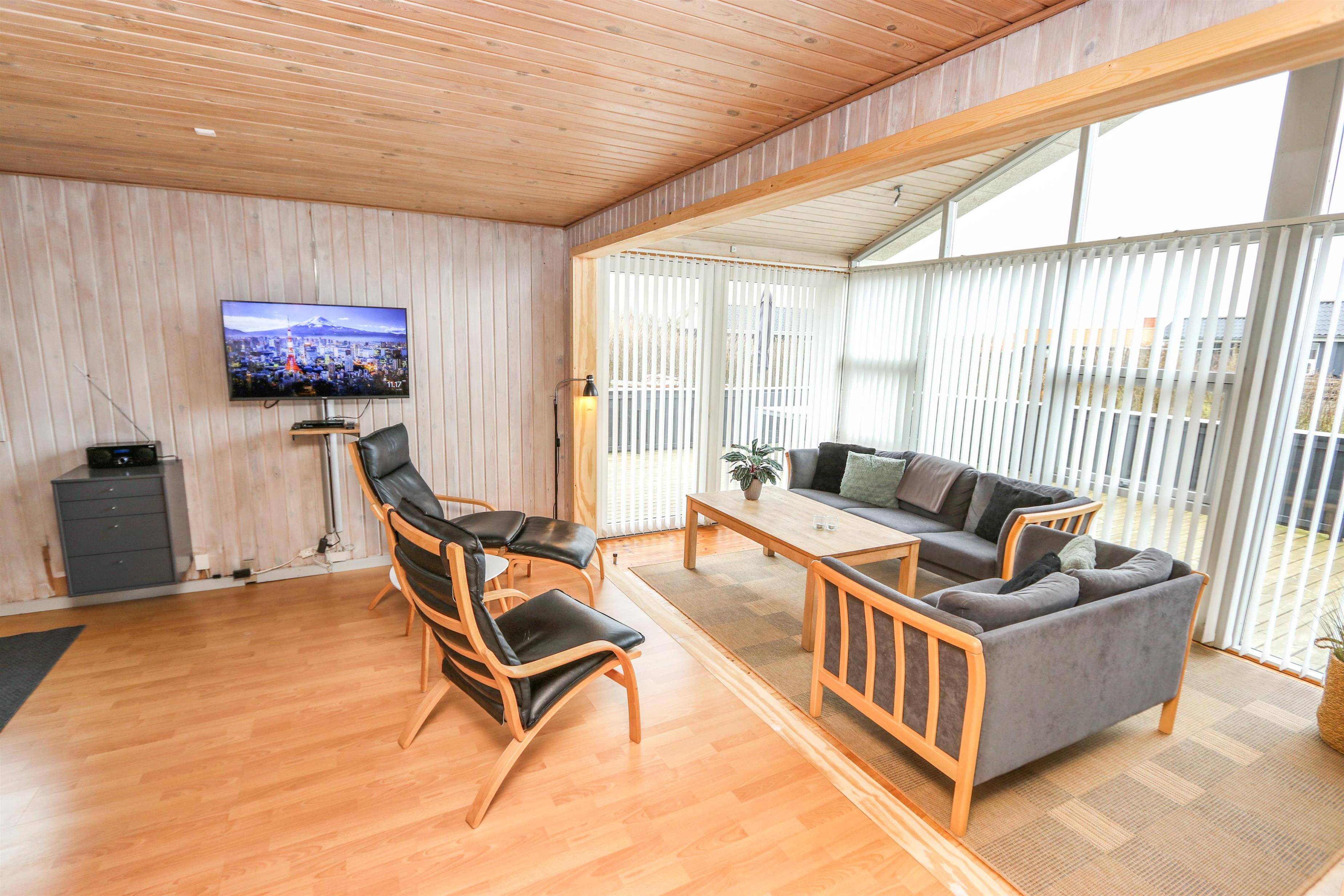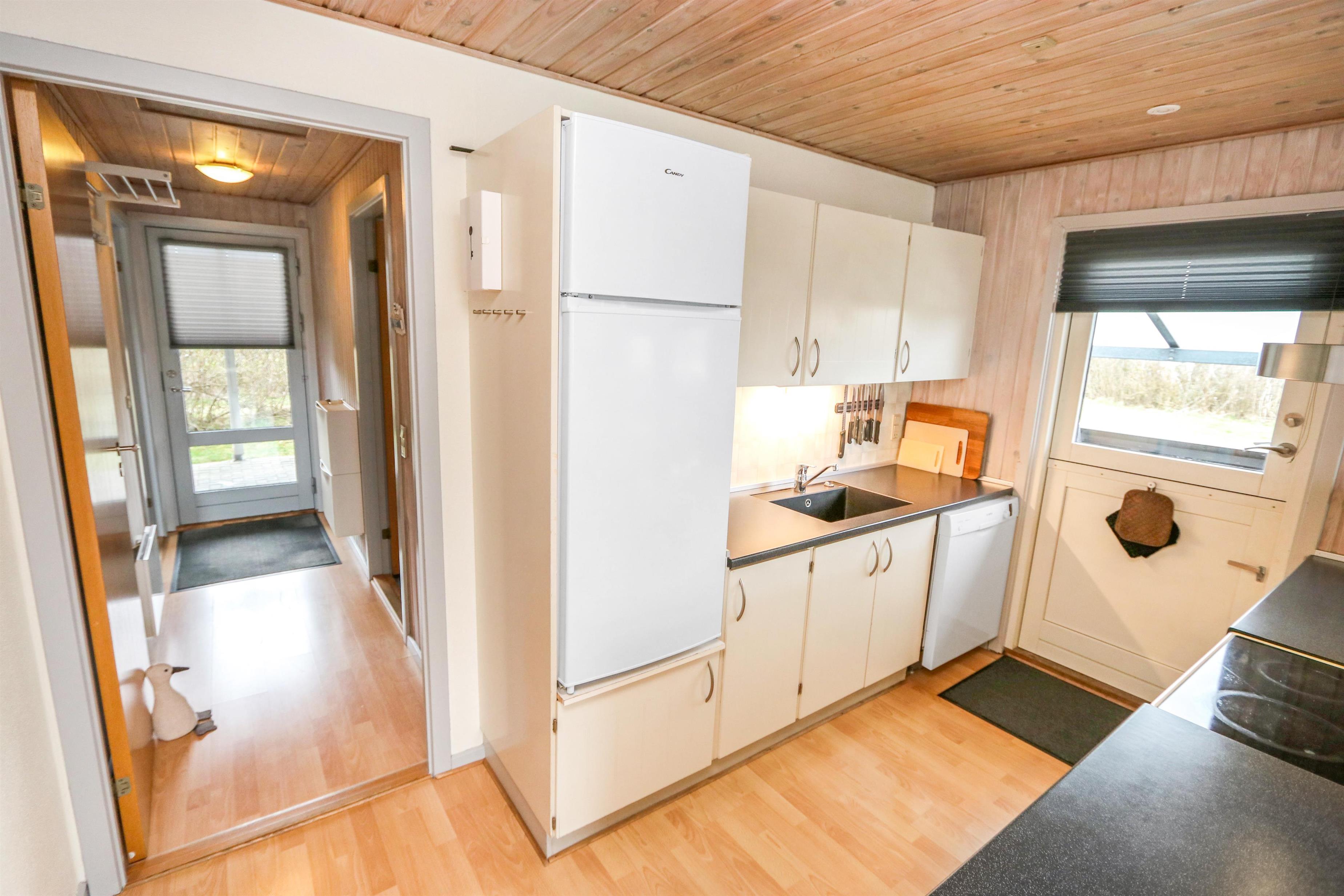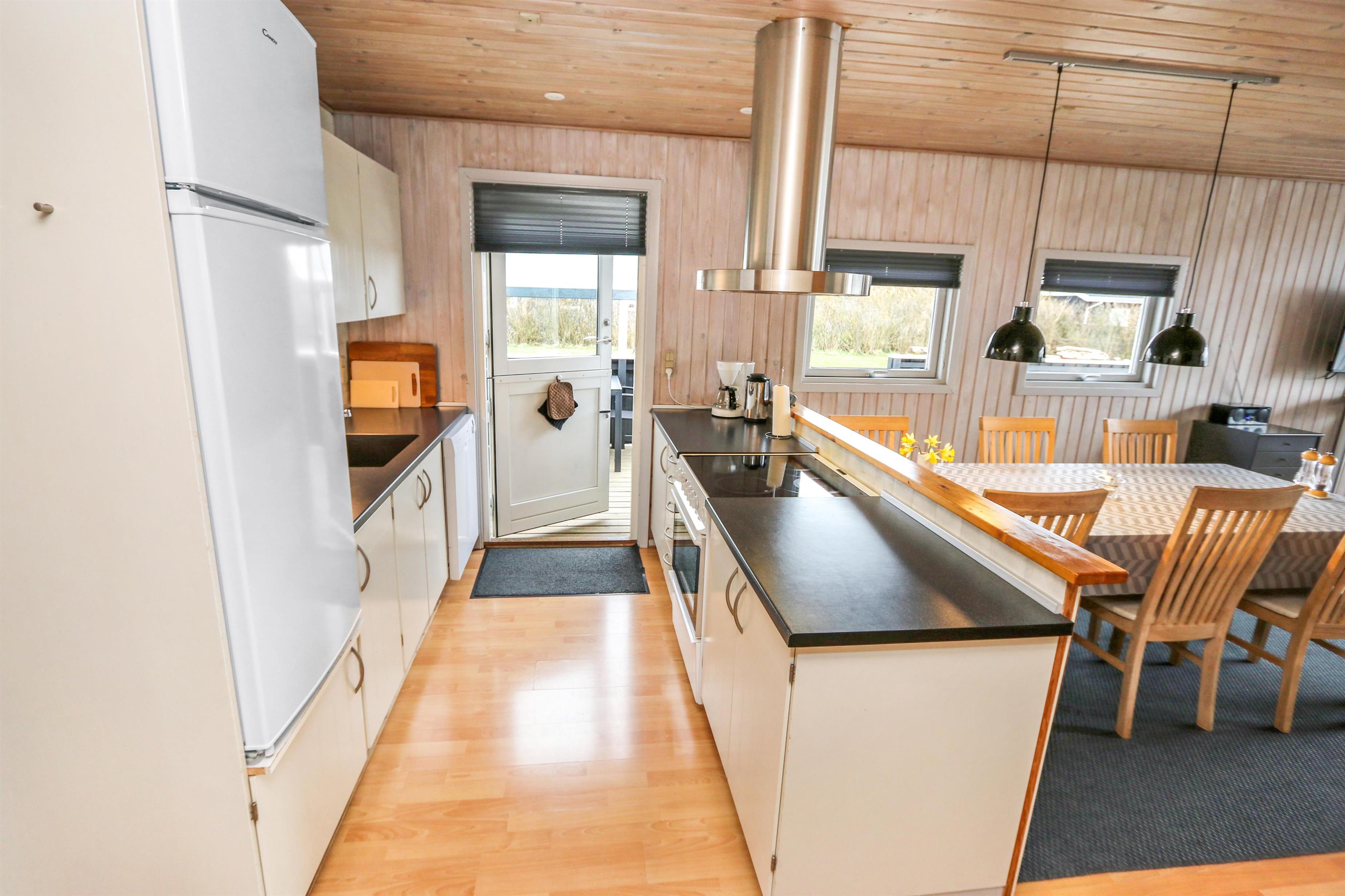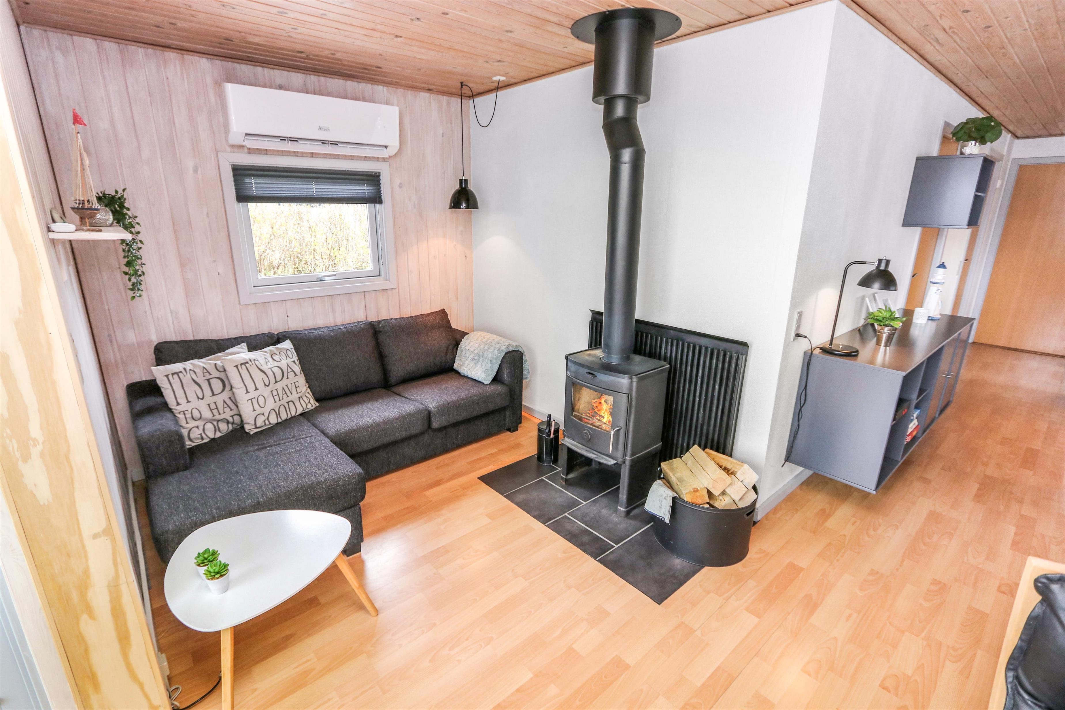 Sæt bilen i carporten og en flot fordelergang byder jer velkommen. Huset er til 6 personer og har 3 værelser (1DS, 1DS, 2ES). Flot badeværelse med bruseniche, toilet, håndvask, klinkegulv gulvvarme, vaskemaskine og direkte adgang til saunaen. Veludstyret køkkenhjørne med opvaskemaskine, mikroovn, komfur med glaskeramiske kogeplader, emhætte, køleskab med fryseboks, alt i service og køkkengrej samt udgang til en dejlig delvis overdækket terrasse, hvor grillen er placeret lige til højre for døren som et ekstra supplement til køkkenet. Pænt møbleret opholdsstue med polstermøbler, TV med tyske kanaler, chromecast, , DAB-radio, Stereoanlæg med bluetooth og en dejlig hyggekrog med brændeovn som er perfekt til hygge med spil eller en god bog. Spiseplads lige ved køkkenhjørnet og adgang til en dejlig udestue for enden af stuen med endnu et spisebord og flere bløde møbler. Vaskerum med ekstra afliggeplads og vaskemaskine. Der er trægulve i alle opholdsrum og gulvtæpper i soverummene. Til børnene er der børneseng og højstol. Ikke ryger hus. Husdyr ikke tilladt